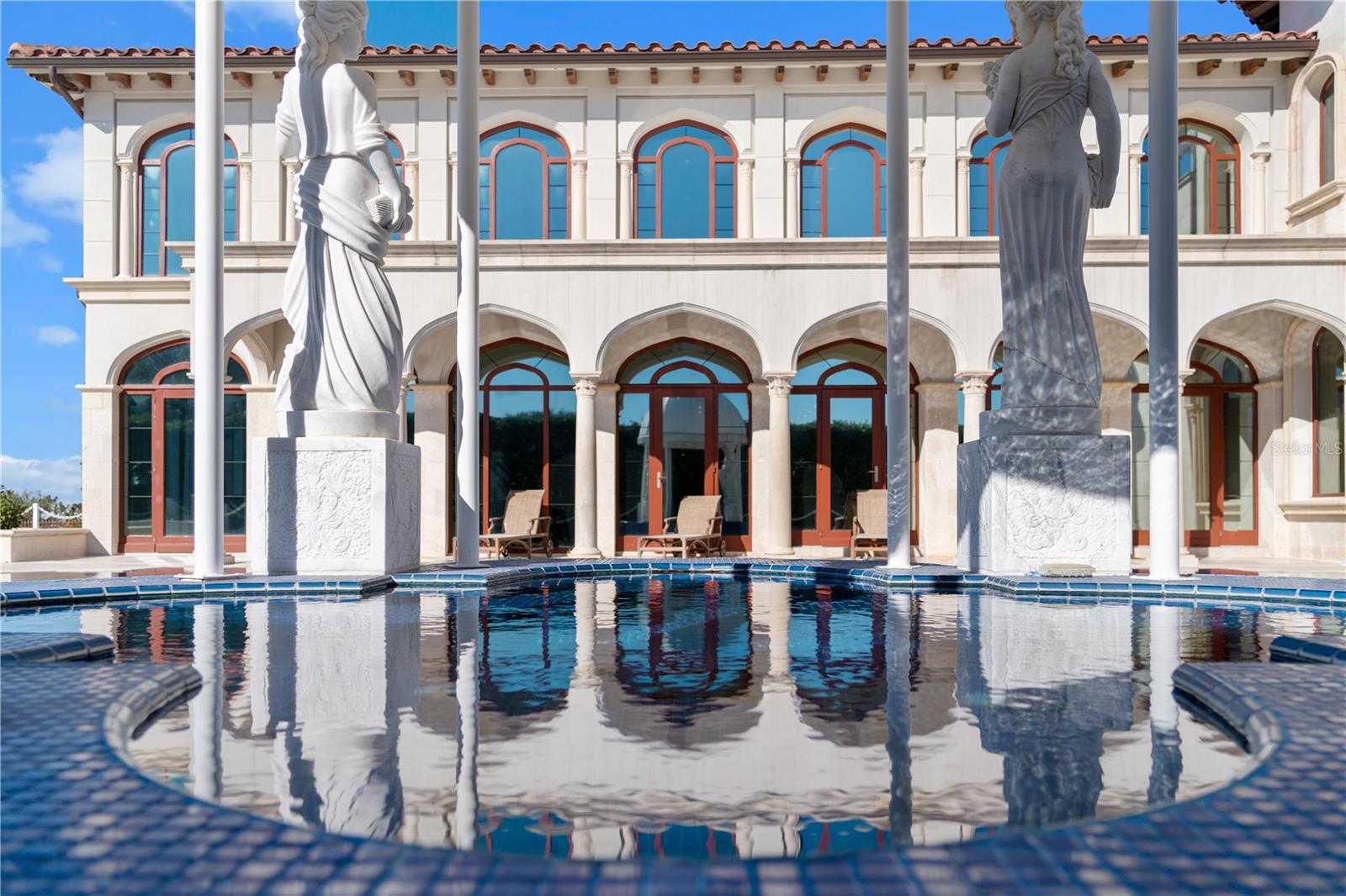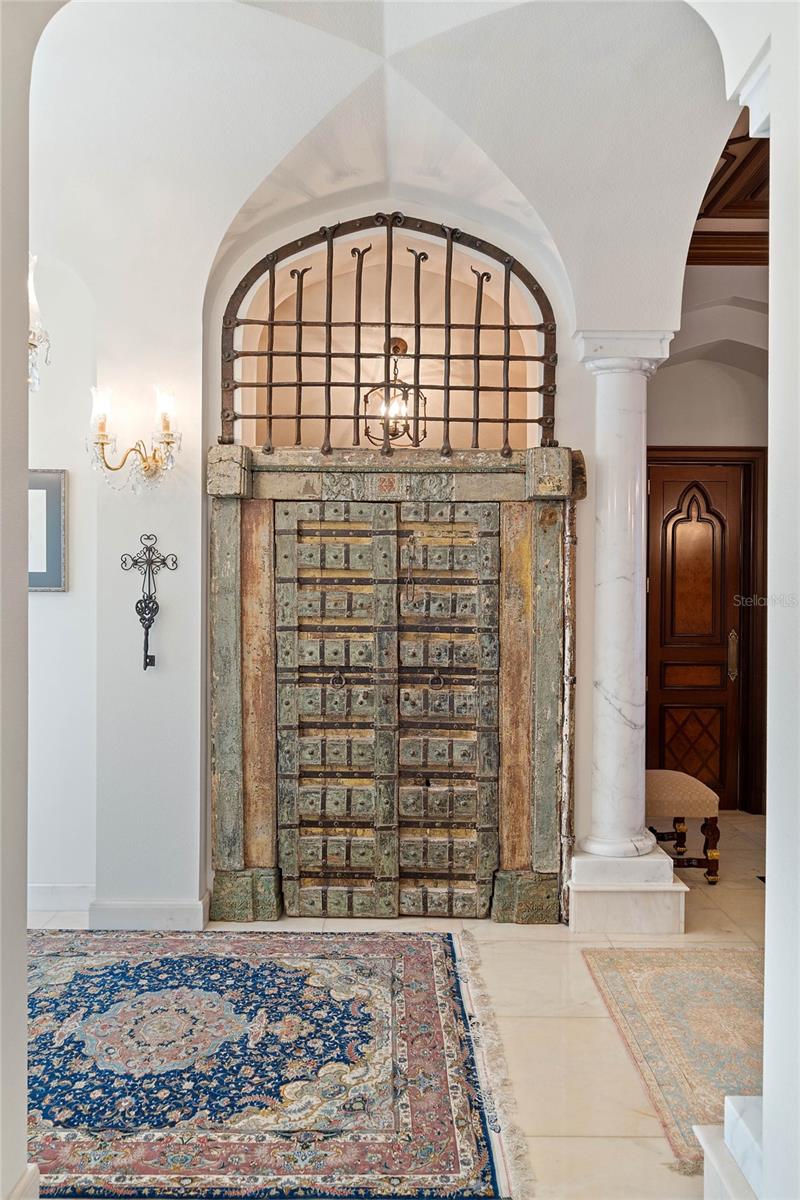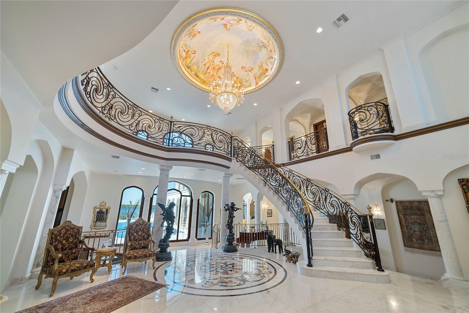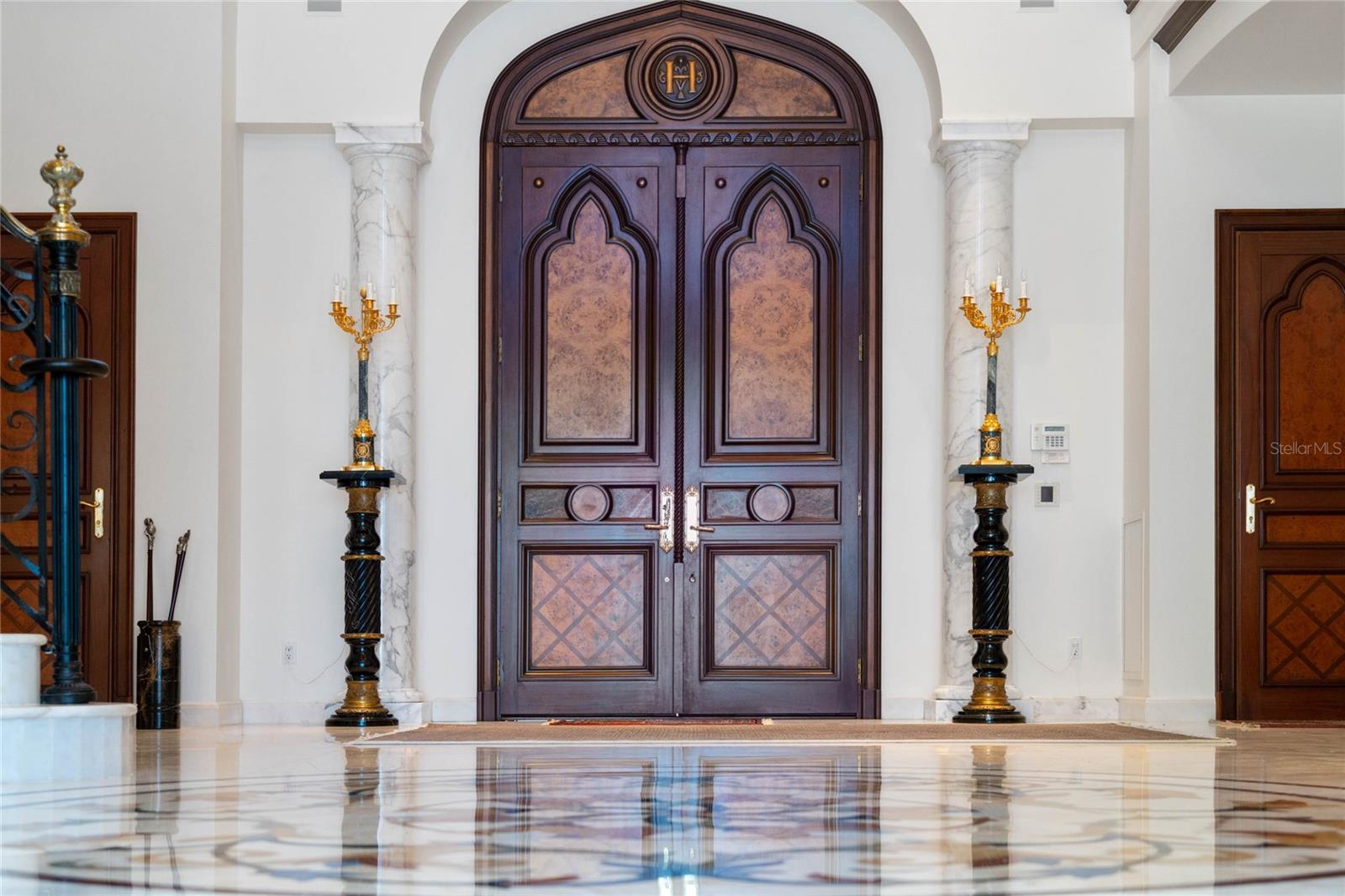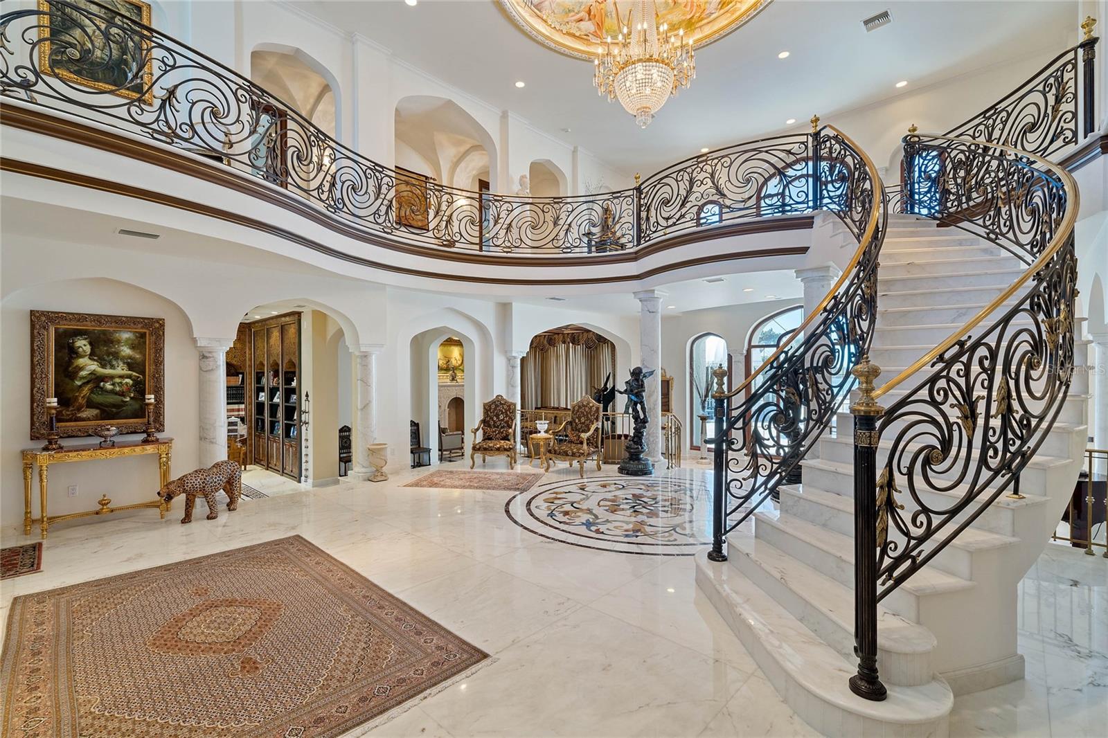 A Masterpiece of Unparalleled Elegance on the Intracoastal A rare opportunity to own an architectural triumph—this 12,000-square-foot gated estate is the epitome of European craftsmanship, set on three private acres with 130 feet of direct Intracoastal waterfront. Designed over five years at a cost exceeding $11 million, this palatial masterpiece would require nearly $20 million to replicate today. A grand stone-paved drive, flanked by imported sculptures, leads to a majestic motor court centered by a custom marble fountain. The travertine-clad exterior, French mahogany windows, and handcrafted mahogany doors with African wood inlays and 24-karat gold fixtures set the tone for the opulence within. Step into the stunning foyer, where a dome ceiling imported from Italy and painted by Poli Verona crowns a grand staircase by Luis Beltran. The home is adorned with solid Carrara marble columns, open book marble flooring, and an entryway inlaid with a now-extinct marble—a true collector’s rarity. Crystal chandeliers from Milan illuminate each space, complementing the meticulously curated ceiling and floor designs. Designed for grand-scale entertaining, the home boasts a great room with soaring 24-foot ceilings, a lavish bar with intricate mosaic tile artwork, and a private movie theater featuring a Rolls-Royce-inspired Starlite ceiling and hand-painted Hollywood portraits. The expansive atrium, lined with panoramic water views, seamlessly blends indoor and outdoor living. The main kitchen showcases Italian walnut cabinetry by Aster Cucine, while a separate chef’s kitchen with commercial-grade appliances ensures seamless catering via the butler’s pantry. The primary suite is an oasis of grandeur, featuring rosewood flooring and ceiling beams, a private balcony, a sitting room, office/gym, and two opulent walk-in closets. The spa-like master bath boasts dual private water closets with bidets, a steam shower, and heated towel bars. Each guest suite offers a private balcony and en suite bath, providing five-star accommodations. Outdoors, the estate continues to impress with a 20’ x 60’ floating-edge pool and spa, framed by a custom-designed marble pergola. The veranda and sprawling outdoor entertaining spaces offer breathtaking water views, perfect for hosting unforgettable gatherings. A well-appointed guesthouse with a kitchen, living area, and two en suite bedrooms ensures privacy for visitors. A residence of this caliber is not merely a home—it is an unparalleled statement of prestige, craftsmanship, and timeless luxury.
