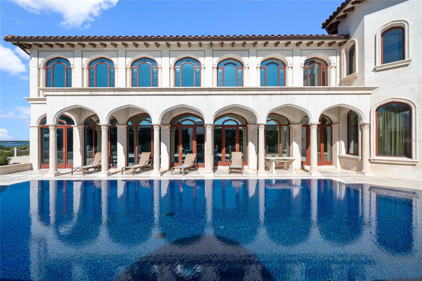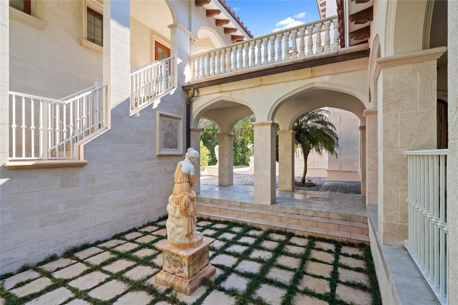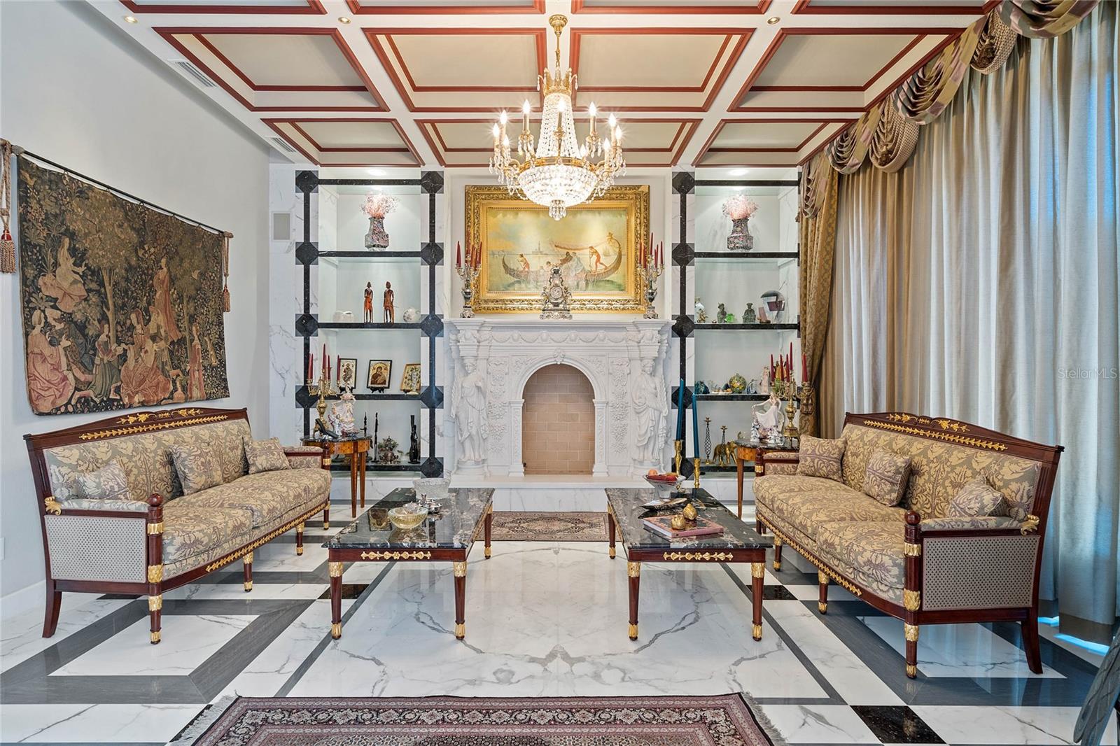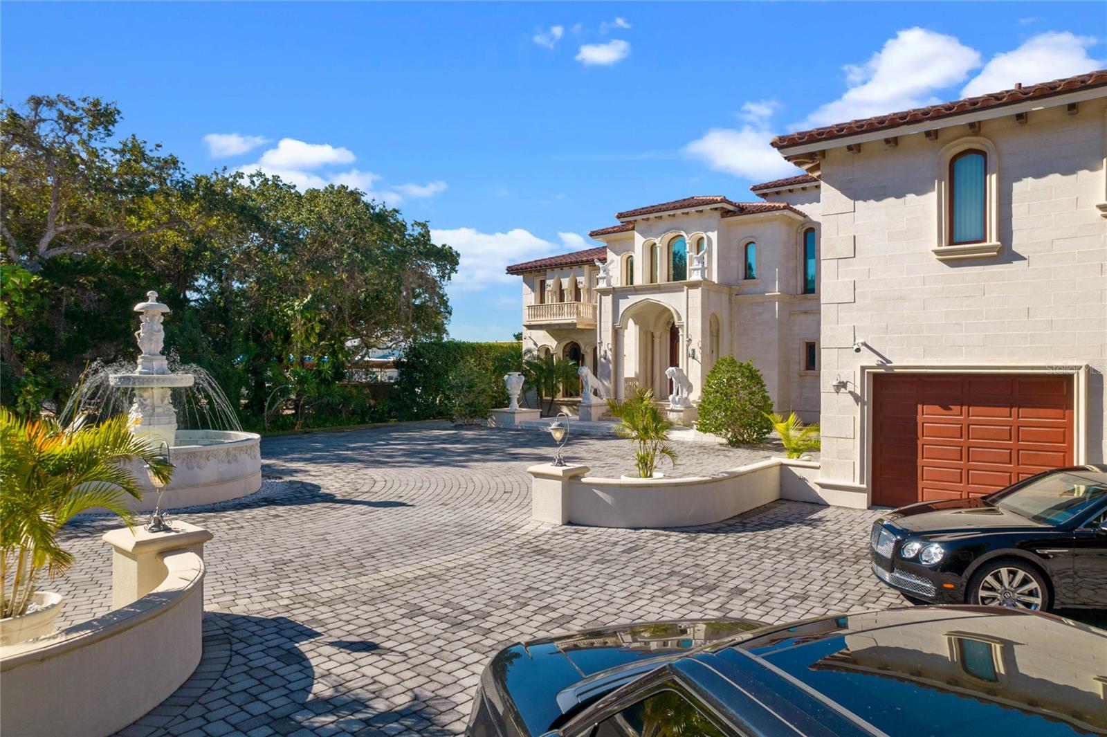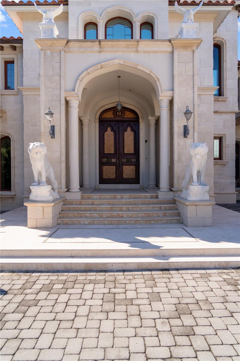 A Masterpiece of Unparalleled Elegance on the Intracoastal A rare opportunity to own an architectural triumph—this 12,000-square-foot gated estate is the epitome of European craftsmanship, set on three private acres with 130 feet of direct Intracoastal waterfront. Designed over five years at a cost exceeding $11 million, this palatial masterpiece would require nearly $20 million to replicate today. A grand stone-paved drive, flanked by imported sculptures, leads to a majestic motor court centered by a custom marble fountain. The travertine-clad exterior, French mahogany windows, and handcrafted mahogany doors with African wood inlays and 24-karat gold fixtures set the tone for the opulence within. Step into the stunning foyer, where a dome ceiling imported from Italy and painted by Poli Verona crowns a grand staircase by Luis Beltran. The home is adorned with solid Carrara marble columns, open book marble flooring, and an entryway inlaid with a now-extinct marble—a true collector’s rarity. Crystal chandeliers from Milan illuminate each space, complementing the meticulously curated ceiling and floor designs. Designed for grand-scale entertaining, the home boasts a great room with soaring 24-foot ceilings, a lavish bar with intricate mosaic tile artwork, and a private movie theater featuring a Rolls-Royce-inspired Starlite ceiling and hand-painted Hollywood portraits. The expansive atrium, lined with panoramic water views, seamlessly blends indoor and outdoor living. The main kitchen showcases Italian walnut cabinetry by Aster Cucine, while a separate chef’s kitchen with commercial-grade appliances ensures seamless catering via the butler’s pantry. The primary suite is an oasis of grandeur, featuring rosewood flooring and ceiling beams, a private balcony, a sitting room, office/gym, and two opulent walk-in closets. The spa-like master bath boasts dual private water closets with bidets, a steam shower, and heated towel bars. Each guest suite offers a private balcony and en suite bath, providing five-star accommodations. Outdoors, the estate continues to impress with a 20’ x 60’ floating-edge pool and spa, framed by a custom-designed marble pergola. The veranda and sprawling outdoor entertaining spaces offer breathtaking water views, perfect for hosting unforgettable gatherings. A well-appointed guesthouse with a kitchen, living area, and two en suite bedrooms ensures privacy for visitors. A residence of this caliber is not merely a home—it is an unparalleled statement of prestige, craftsmanship, and timeless luxury.