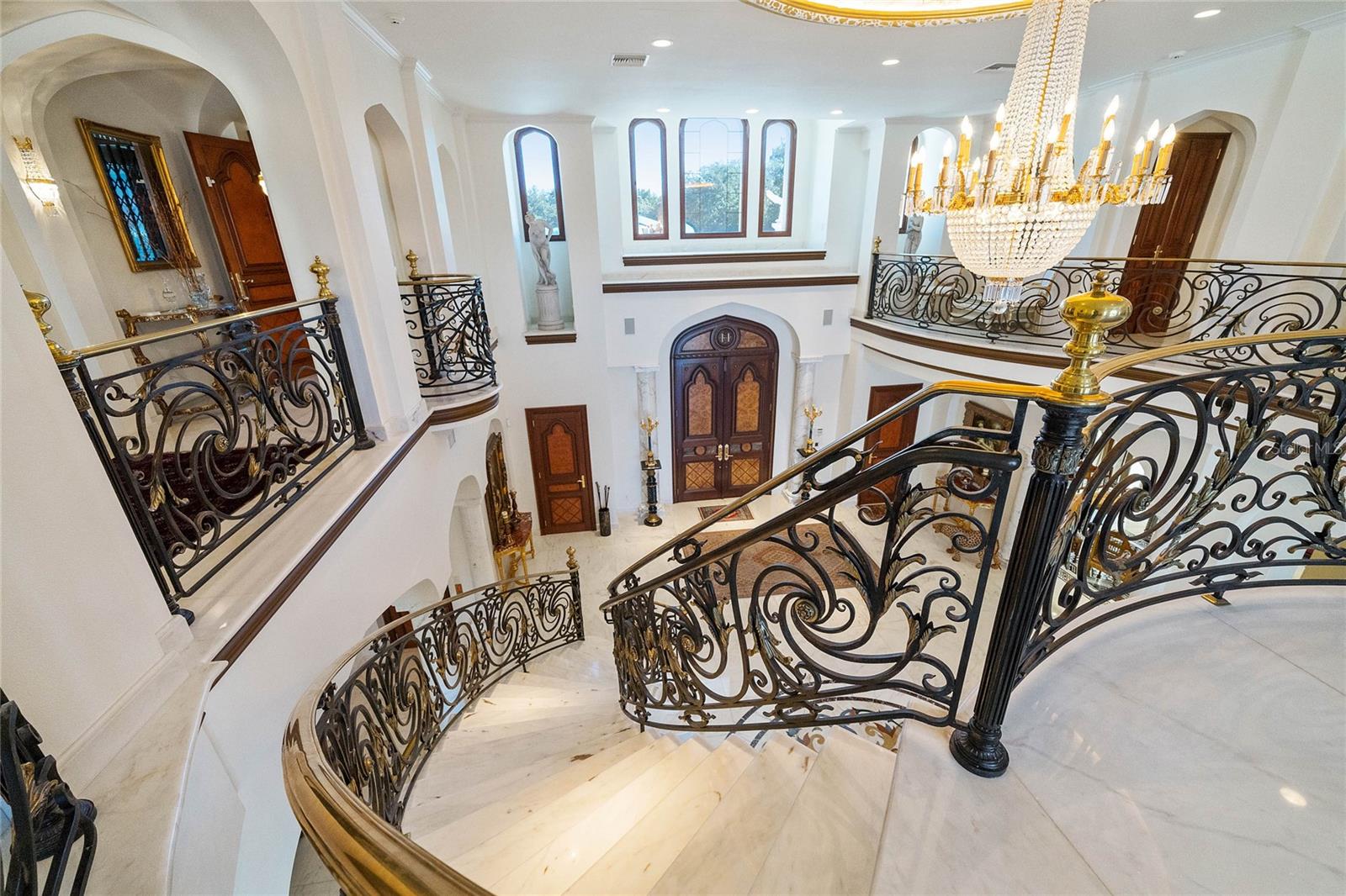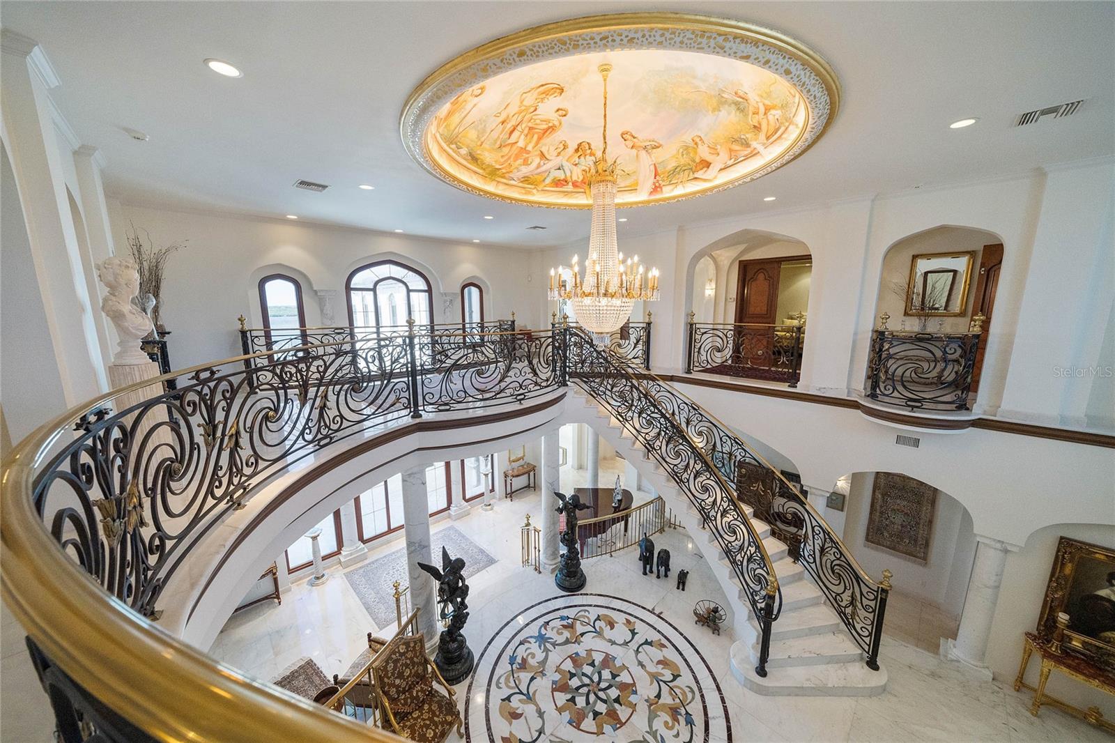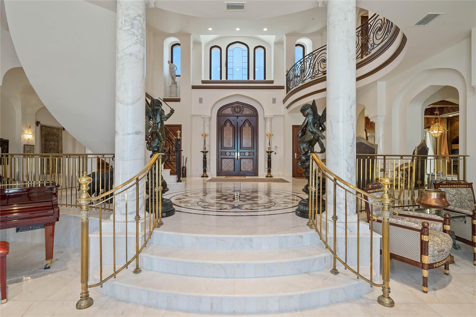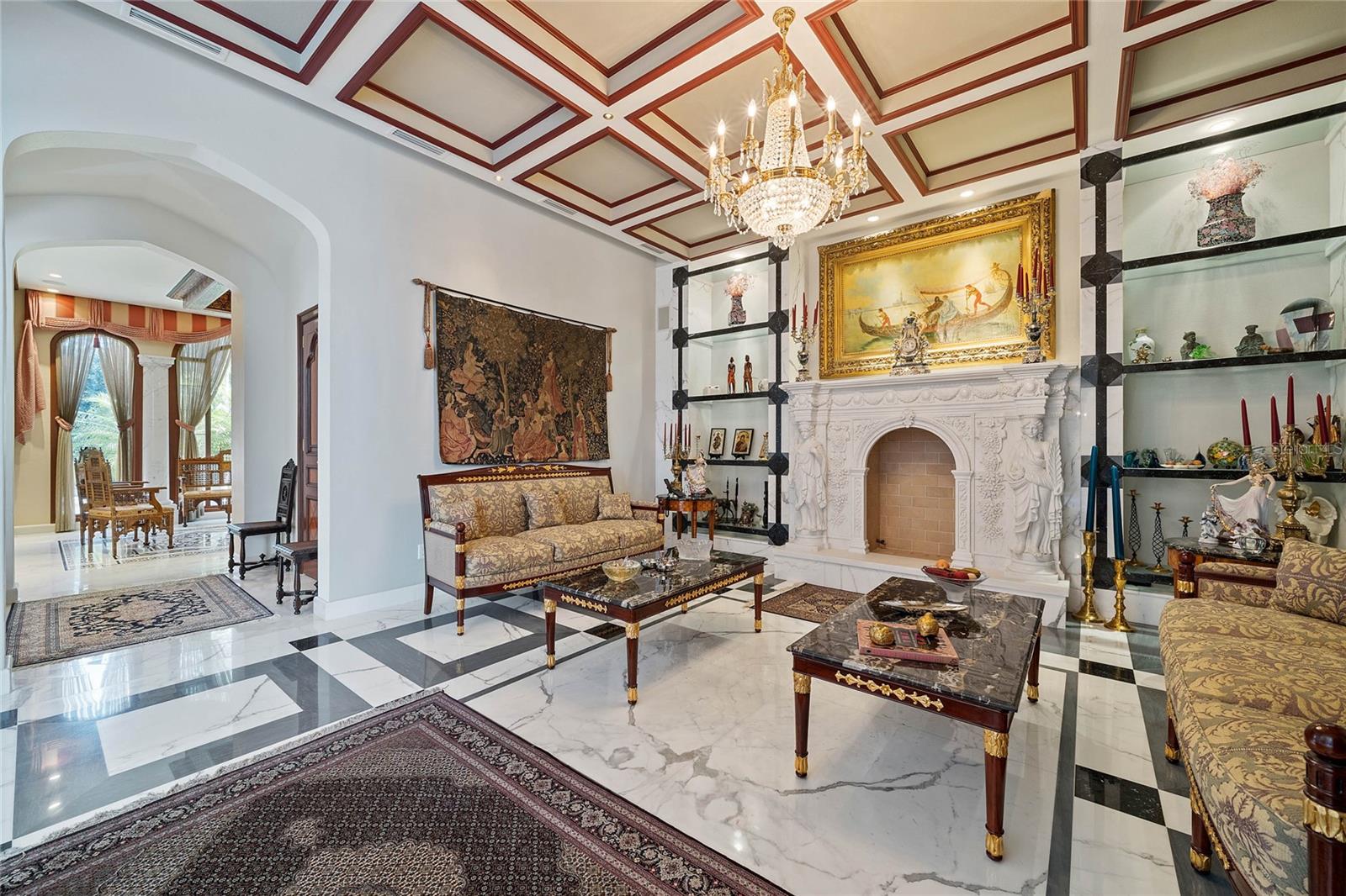 A Masterpiece of Unparalleled Elegance on the Intracoastal A rare opportunity to own an architectural triumph—this 12,000-square-foot gated estate is the epitome of European craftsmanship, set on three private acres with 130 feet of direct Intracoastal waterfront. Designed over five years at a cost exceeding $11 million, this palatial masterpiece would require nearly $20 million to replicate today. A grand stone-paved drive, flanked by imported sculptures, leads to a majestic motor court centered by a custom marble fountain. The travertine-clad exterior, French mahogany windows, and handcrafted mahogany doors with African wood inlays and 24-karat gold fixtures set the tone for the opulence within. Step into the stunning foyer, where a dome ceiling imported from Italy and painted by Poli Verona crowns a grand staircase by Luis Beltran. The home is adorned with solid Carrara marble columns, open book marble flooring, and an entryway inlaid with a now-extinct marble—a true collector’s rarity. Crystal chandeliers from Milan illuminate each space, complementing the meticulously curated ceiling and floor designs. Designed for grand-scale entertaining, the home boasts a great room with soaring 24-foot ceilings, a lavish bar with intricate mosaic tile artwork, and a private movie theater featuring a Rolls-Royce-inspired Starlite ceiling and hand-painted Hollywood portraits. The expansive atrium, lined with panoramic water views, seamlessly blends indoor and outdoor living. The main kitchen showcases Italian walnut cabinetry by Aster Cucine, while a separate chef’s kitchen with commercial-grade appliances ensures seamless catering via the butler’s pantry. The primary suite is an oasis of grandeur, featuring rosewood flooring and ceiling beams, a private balcony, a sitting room, office/gym, and two opulent walk-in closets. The spa-like master bath boasts dual private water closets with bidets, a steam shower, and heated towel bars. Each guest suite offers a private balcony and en suite bath, providing five-star accommodations. Outdoors, the estate continues to impress with a 20’ x 60’ floating-edge pool and spa, framed by a custom-designed marble pergola. The veranda and sprawling outdoor entertaining spaces offer breathtaking water views, perfect for hosting unforgettable gatherings. A well-appointed guesthouse with a kitchen, living area, and two en suite bedrooms ensures privacy for visitors. A residence of this caliber is not merely a home—it is an unparalleled statement of prestige, craftsmanship, and timeless luxury.