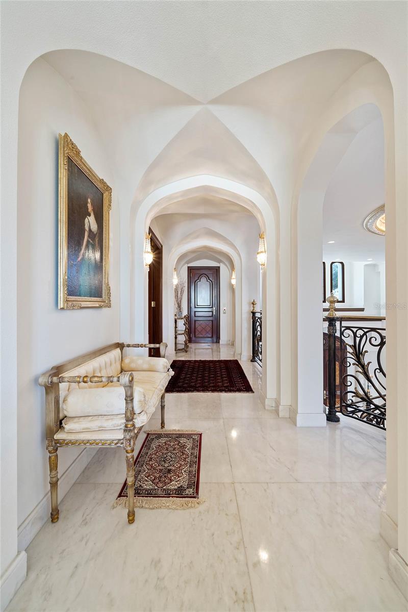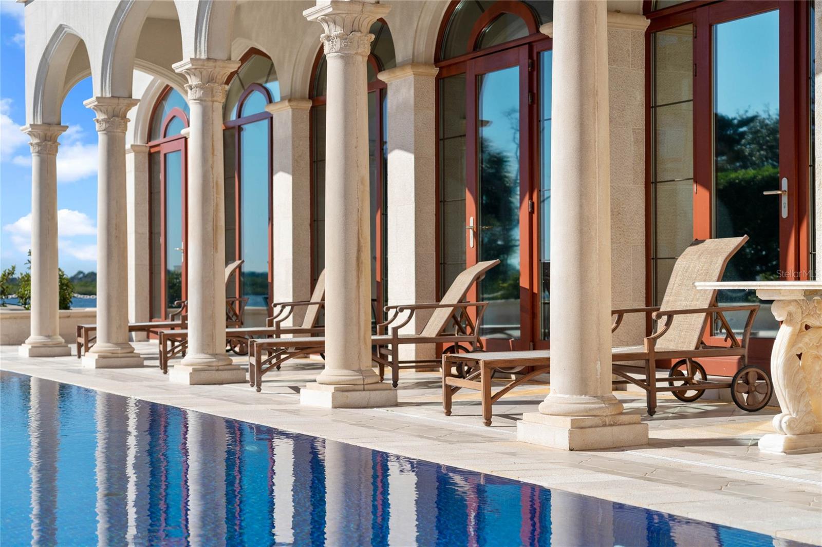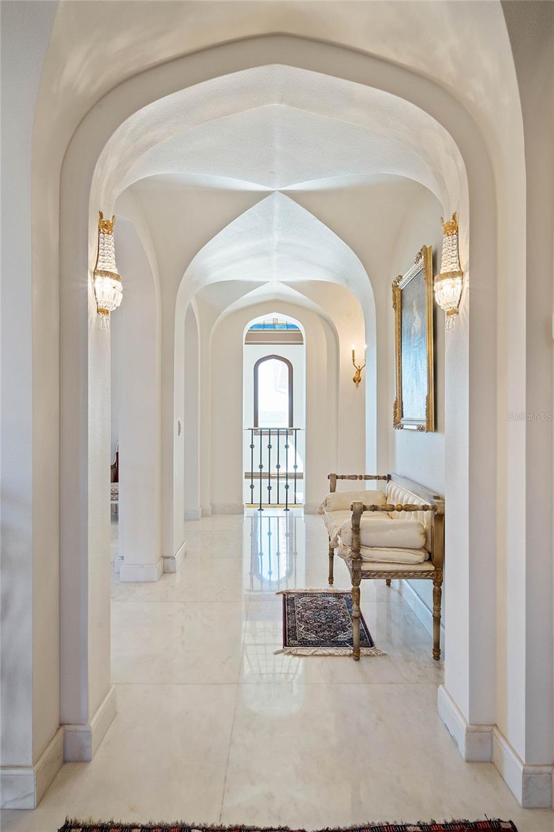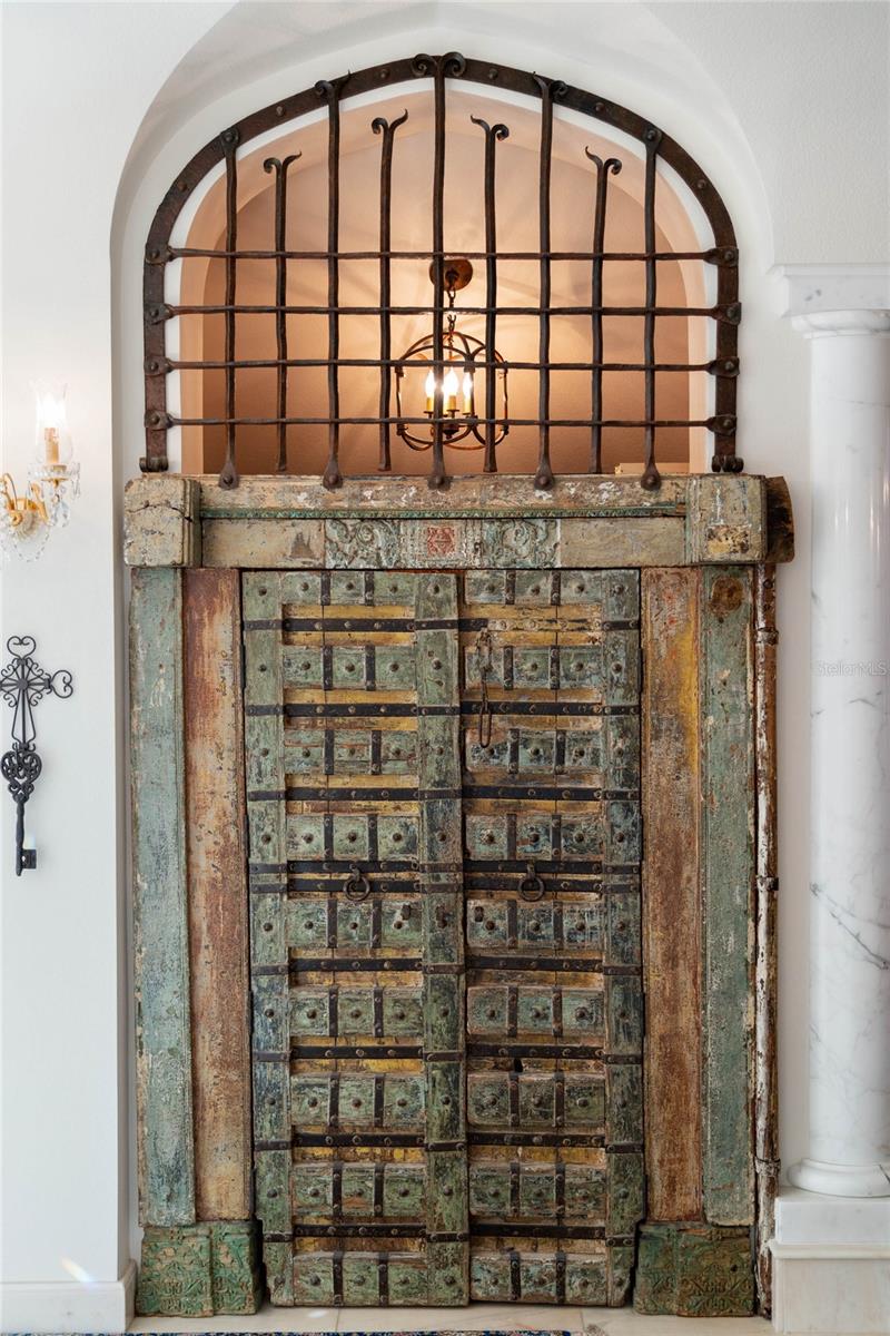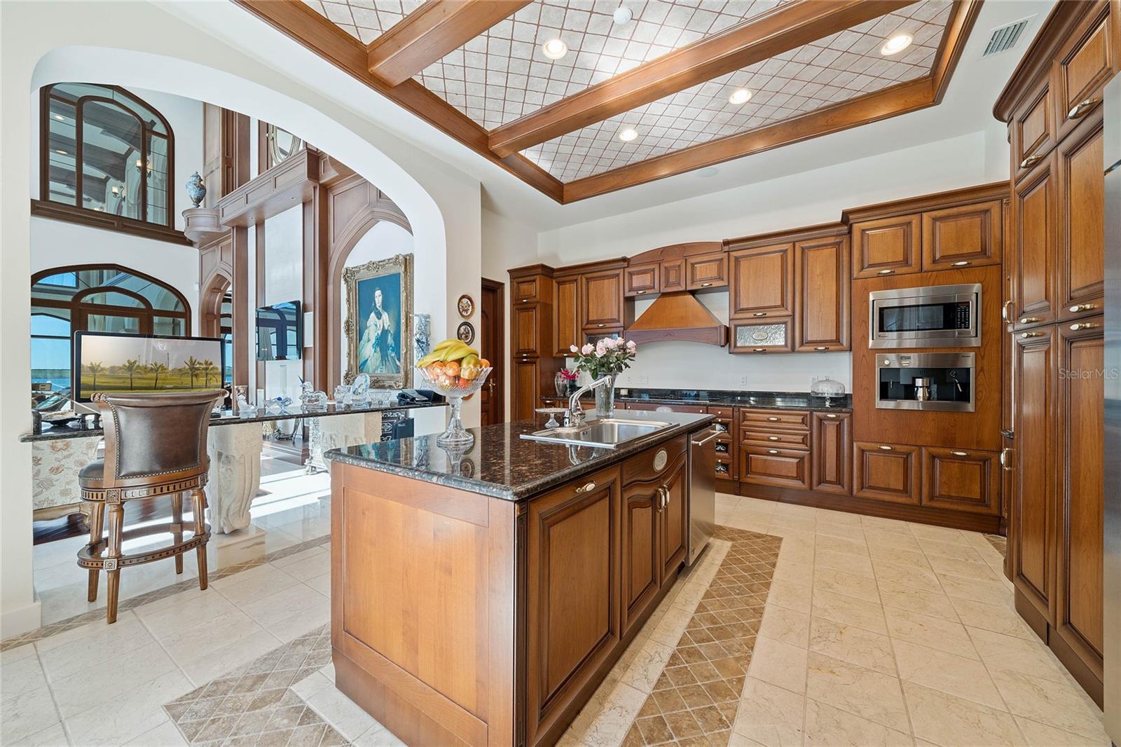 A Masterpiece of Unparalleled Elegance on the Intracoastal A rare opportunity to own an architectural triumph—this 12,000-square-foot gated estate is the epitome of European craftsmanship, set on three private acres with 130 feet of direct Intracoastal waterfront. Designed over five years at a cost exceeding $11 million, this palatial masterpiece would require nearly $20 million to replicate today. A grand stone-paved drive, flanked by imported sculptures, leads to a majestic motor court centered by a custom marble fountain. The travertine-clad exterior, French mahogany windows, and handcrafted mahogany doors with African wood inlays and 24-karat gold fixtures set the tone for the opulence within. Step into the stunning foyer, where a dome ceiling imported from Italy and painted by Poli Verona crowns a grand staircase by Luis Beltran. The home is adorned with solid Carrara marble columns, open book marble flooring, and an entryway inlaid with a now-extinct marble—a true collector’s rarity. Crystal chandeliers from Milan illuminate each space, complementing the meticulously curated ceiling and floor designs. Designed for grand-scale entertaining, the home boasts a great room with soaring 24-foot ceilings, a lavish bar with intricate mosaic tile artwork, and a private movie theater featuring a Rolls-Royce-inspired Starlite ceiling and hand-painted Hollywood portraits. The expansive atrium, lined with panoramic water views, seamlessly blends indoor and outdoor living. The main kitchen showcases Italian walnut cabinetry by Aster Cucine, while a separate chef’s kitchen with commercial-grade appliances ensures seamless catering via the butler’s pantry. The primary suite is an oasis of grandeur, featuring rosewood flooring and ceiling beams, a private balcony, a sitting room, office/gym, and two opulent walk-in closets. The spa-like master bath boasts dual private water closets with bidets, a steam shower, and heated towel bars. Each guest suite offers a private balcony and en suite bath, providing five-star accommodations. Outdoors, the estate continues to impress with a 20’ x 60’ floating-edge pool and spa, framed by a custom-designed marble pergola. The veranda and sprawling outdoor entertaining spaces offer breathtaking water views, perfect for hosting unforgettable gatherings. A well-appointed guesthouse with a kitchen, living area, and two en suite bedrooms ensures privacy for visitors. A residence of this caliber is not merely a home—it is an unparalleled statement of prestige, craftsmanship, and timeless luxury.