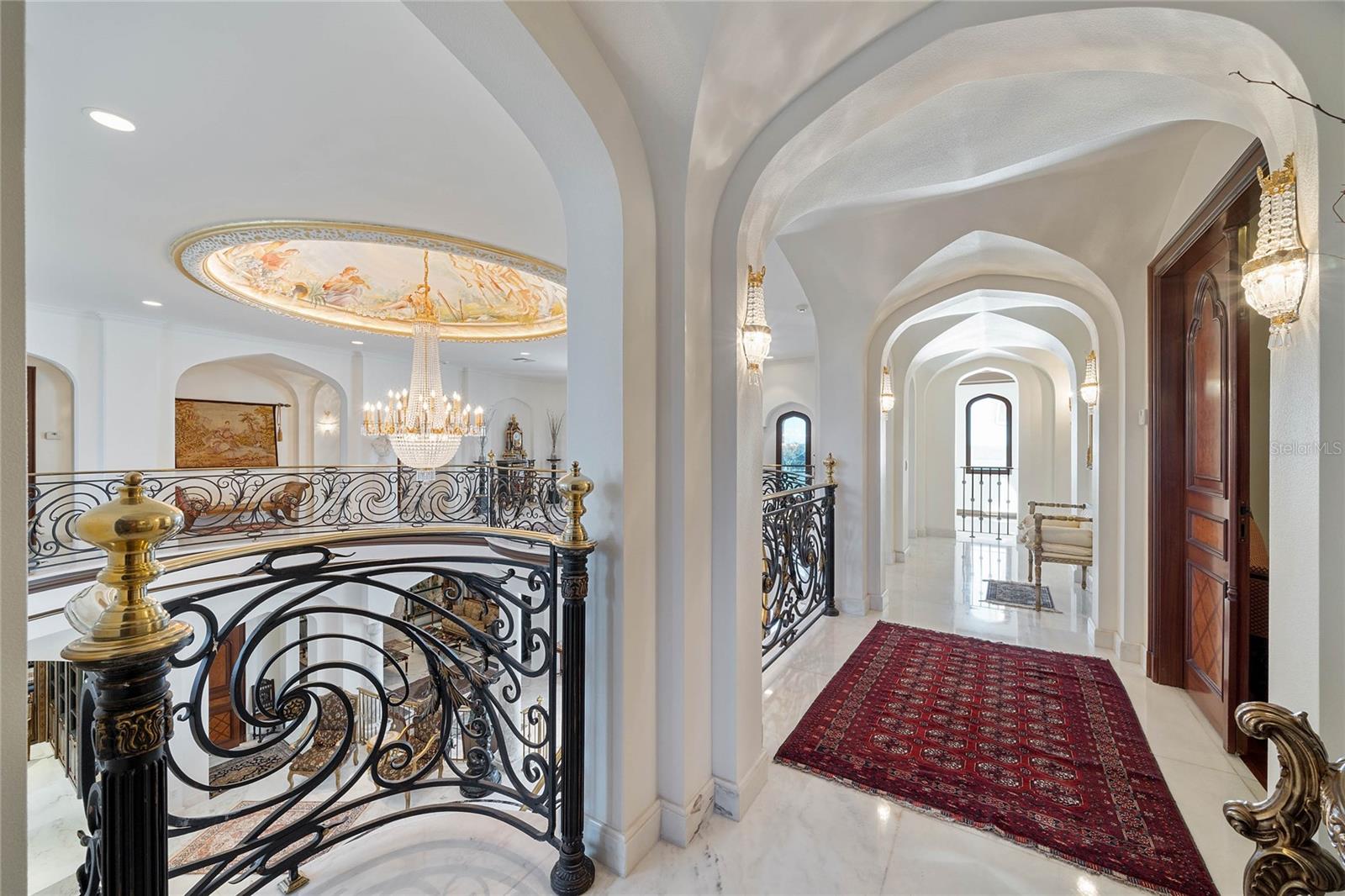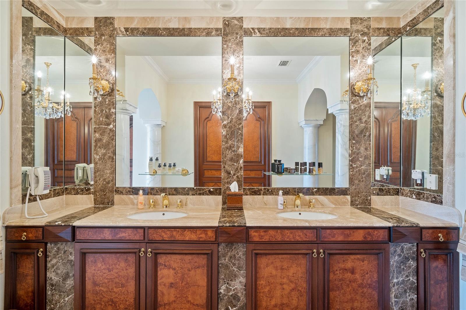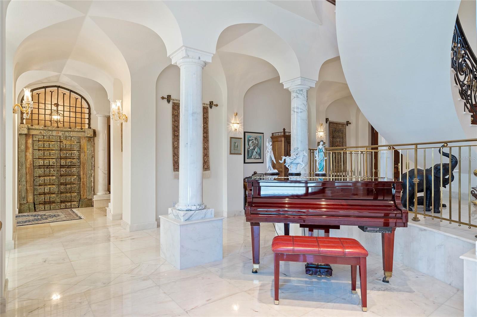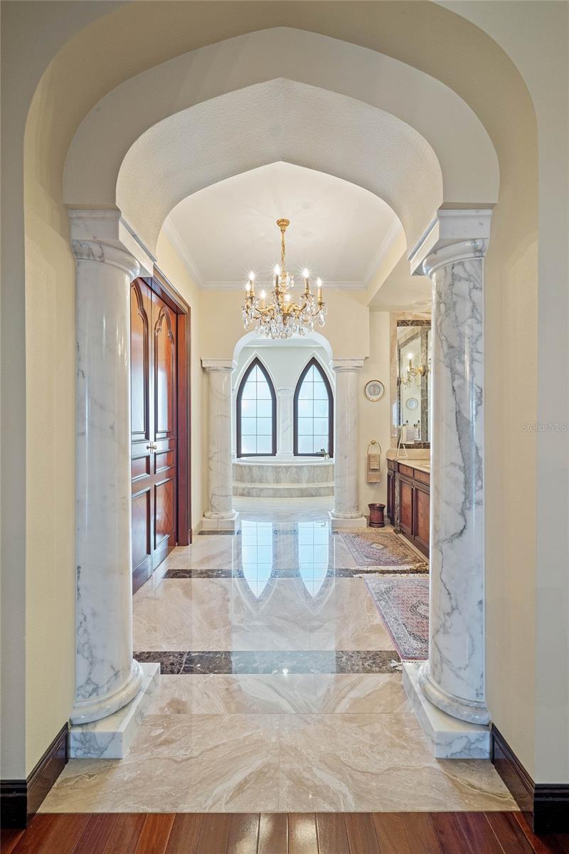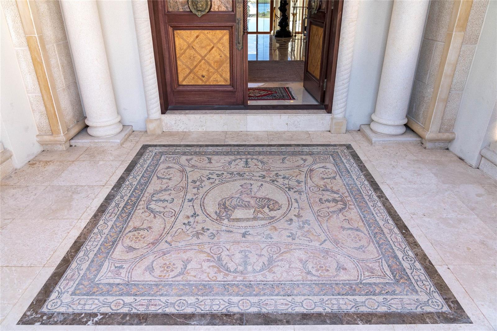 A Masterpiece of Unparalleled Elegance on the Intracoastal A rare opportunity to own an architectural triumph—this 12,000-square-foot gated estate is the epitome of European craftsmanship, set on three private acres with 130 feet of direct Intracoastal waterfront. Designed over five years at a cost exceeding $11 million, this palatial masterpiece would require nearly $20 million to replicate today. A grand stone-paved drive, flanked by imported sculptures, leads to a majestic motor court centered by a custom marble fountain. The travertine-clad exterior, French mahogany windows, and handcrafted mahogany doors with African wood inlays and 24-karat gold fixtures set the tone for the opulence within. Step into the stunning foyer, where a dome ceiling imported from Italy and painted by Poli Verona crowns a grand staircase by Luis Beltran. The home is adorned with solid Carrara marble columns, open book marble flooring, and an entryway inlaid with a now-extinct marble—a true collector’s rarity. Crystal chandeliers from Milan illuminate each space, complementing the meticulously curated ceiling and floor designs. Designed for grand-scale entertaining, the home boasts a great room with soaring 24-foot ceilings, a lavish bar with intricate mosaic tile artwork, and a private movie theater featuring a Rolls-Royce-inspired Starlite ceiling and hand-painted Hollywood portraits. The expansive atrium, lined with panoramic water views, seamlessly blends indoor and outdoor living. The main kitchen showcases Italian walnut cabinetry by Aster Cucine, while a separate chef’s kitchen with commercial-grade appliances ensures seamless catering via the butler’s pantry. The primary suite is an oasis of grandeur, featuring rosewood flooring and ceiling beams, a private balcony, a sitting room, office/gym, and two opulent walk-in closets. The spa-like master bath boasts dual private water closets with bidets, a steam shower, and heated towel bars. Each guest suite offers a private balcony and en suite bath, providing five-star accommodations. Outdoors, the estate continues to impress with a 20’ x 60’ floating-edge pool and spa, framed by a custom-designed marble pergola. The veranda and sprawling outdoor entertaining spaces offer breathtaking water views, perfect for hosting unforgettable gatherings. A well-appointed guesthouse with a kitchen, living area, and two en suite bedrooms ensures privacy for visitors. A residence of this caliber is not merely a home—it is an unparalleled statement of prestige, craftsmanship, and timeless luxury.
