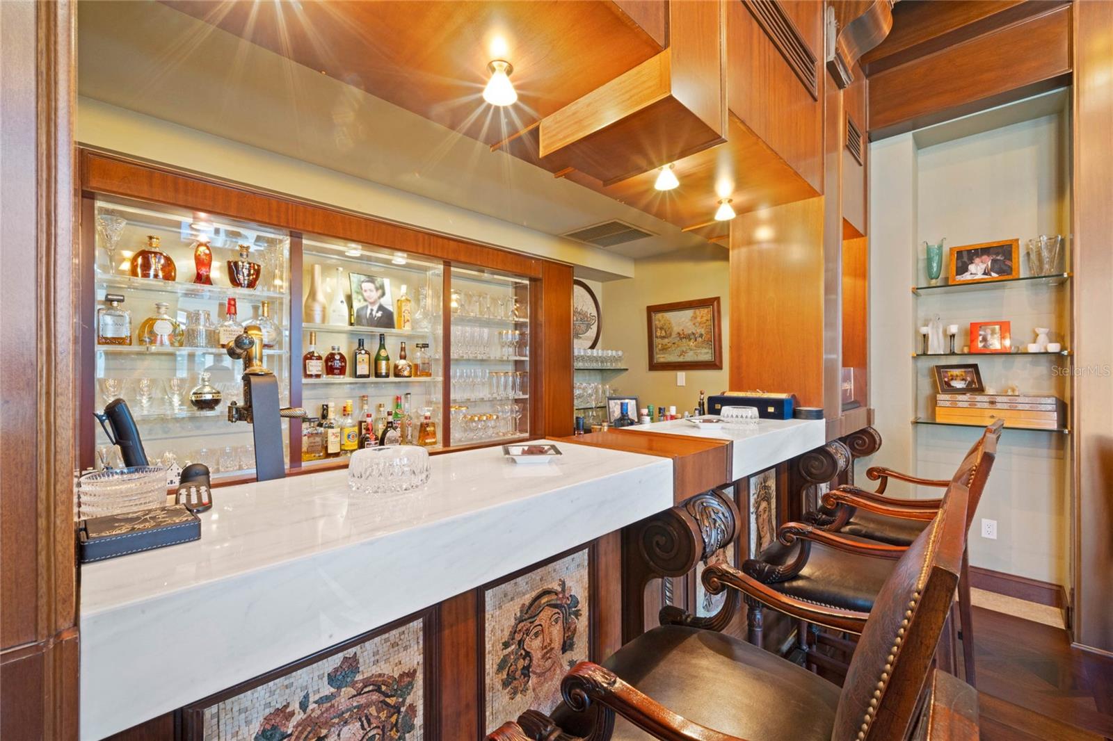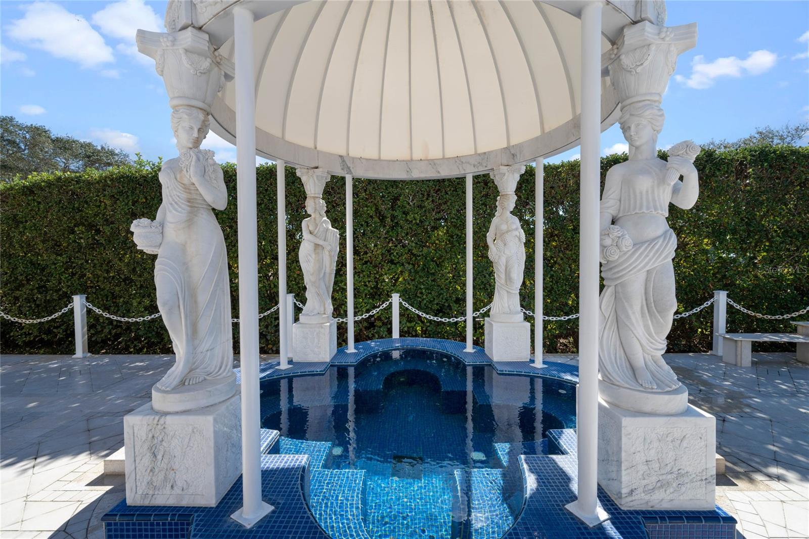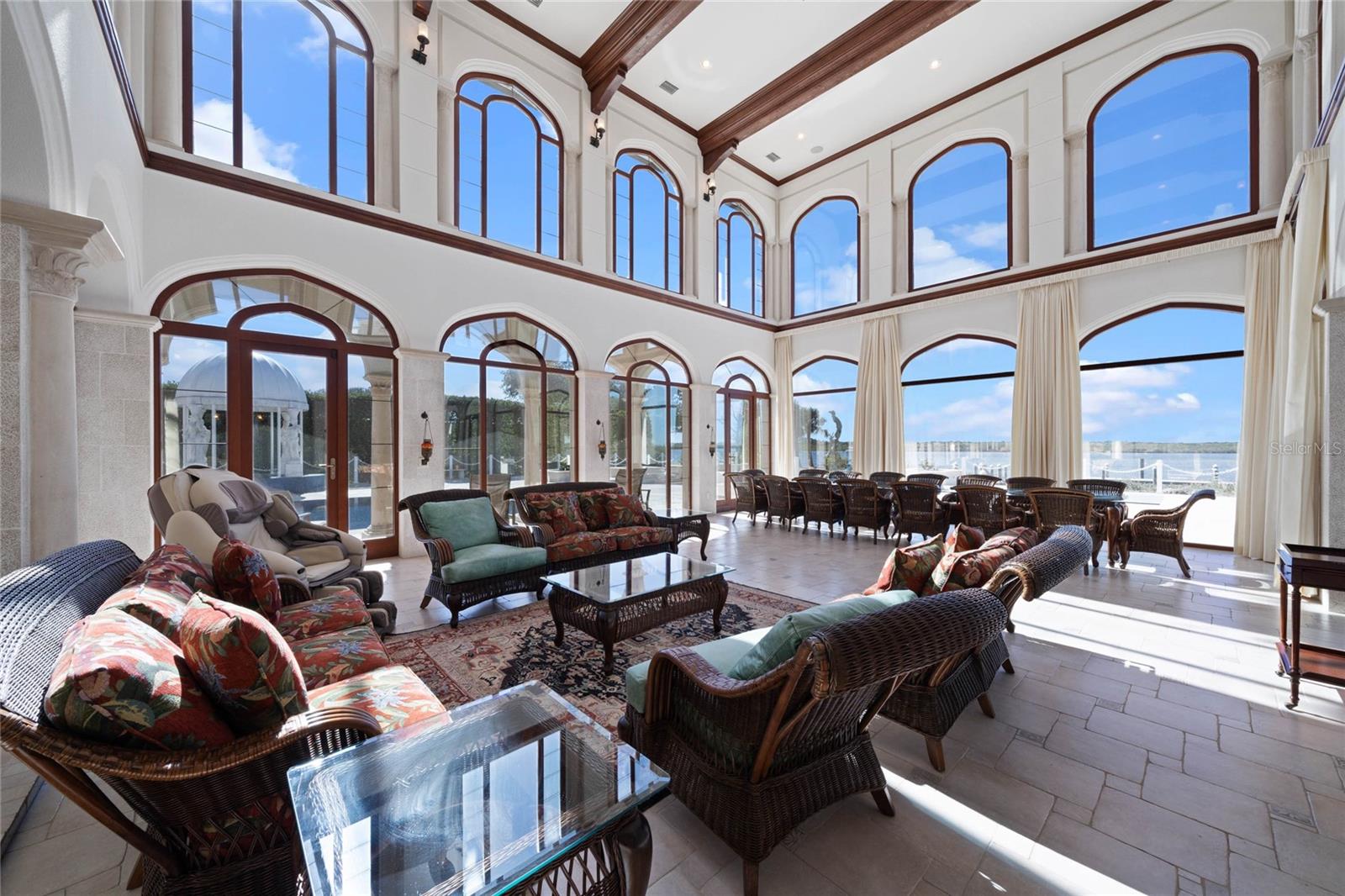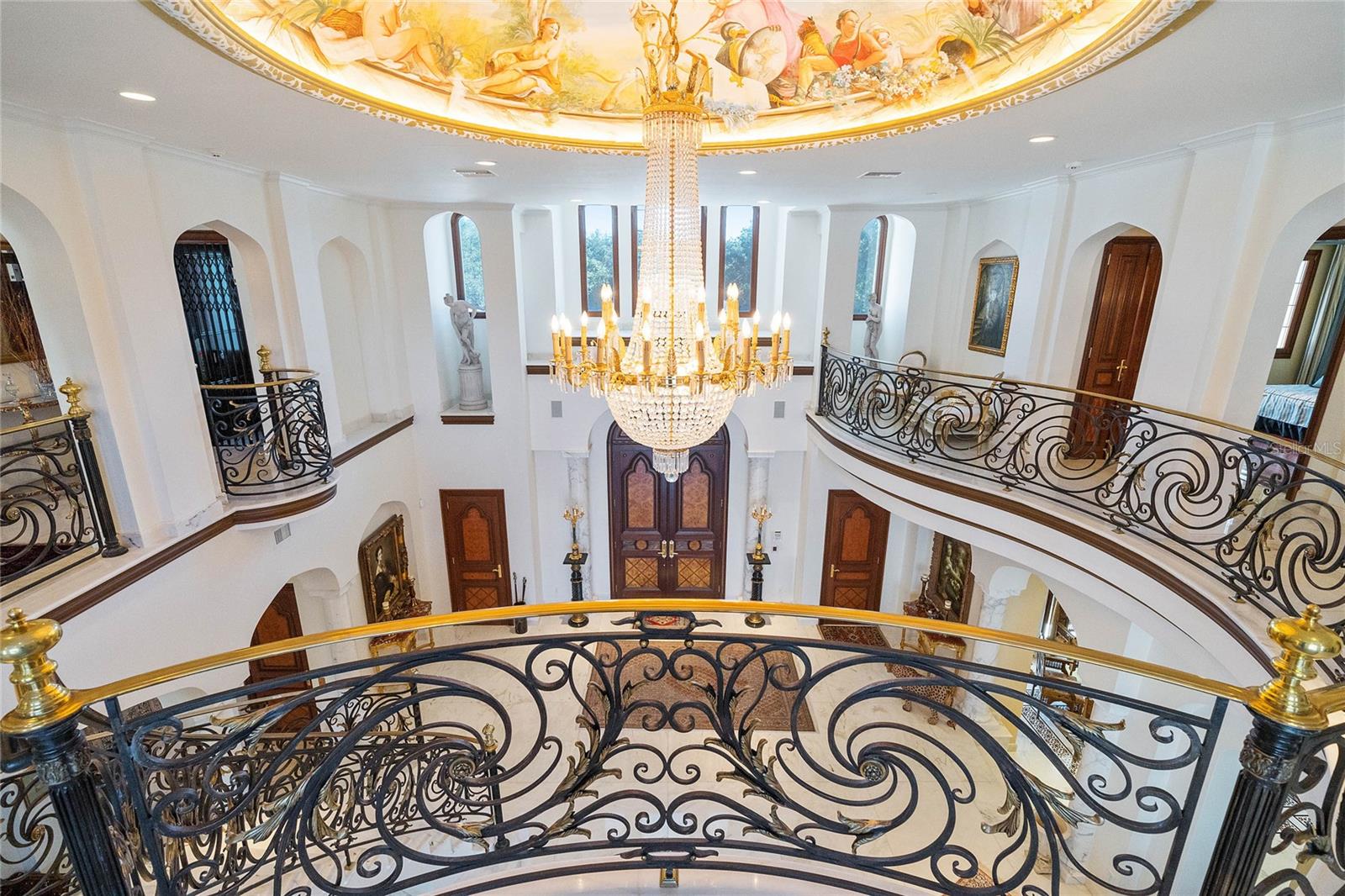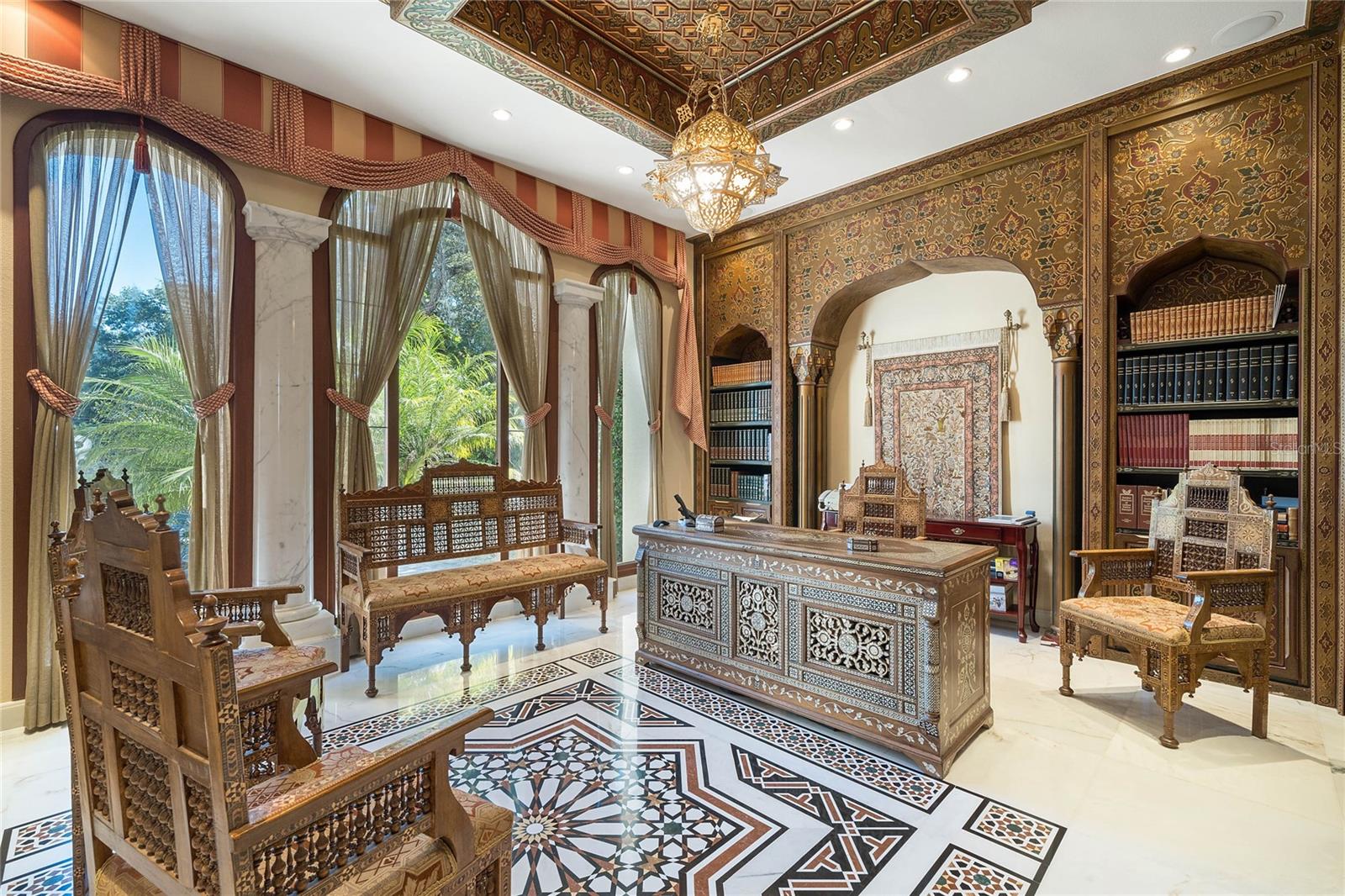 A Masterpiece of Unparalleled Elegance on the Intracoastal A rare opportunity to own an architectural triumph—this 12,000-square-foot gated estate is the epitome of European craftsmanship, set on three private acres with 130 feet of direct Intracoastal waterfront. Designed over five years at a cost exceeding $11 million, this palatial masterpiece would require nearly $20 million to replicate today. A grand stone-paved drive, flanked by imported sculptures, leads to a majestic motor court centered by a custom marble fountain. The travertine-clad exterior, French mahogany windows, and handcrafted mahogany doors with African wood inlays and 24-karat gold fixtures set the tone for the opulence within. Step into the stunning foyer, where a dome ceiling imported from Italy and painted by Poli Verona crowns a grand staircase by Luis Beltran. The home is adorned with solid Carrara marble columns, open book marble flooring, and an entryway inlaid with a now-extinct marble—a true collector’s rarity. Crystal chandeliers from Milan illuminate each space, complementing the meticulously curated ceiling and floor designs. Designed for grand-scale entertaining, the home boasts a great room with soaring 24-foot ceilings, a lavish bar with intricate mosaic tile artwork, and a private movie theater featuring a Rolls-Royce-inspired Starlite ceiling and hand-painted Hollywood portraits. The expansive atrium, lined with panoramic water views, seamlessly blends indoor and outdoor living. The main kitchen showcases Italian walnut cabinetry by Aster Cucine, while a separate chef’s kitchen with commercial-grade appliances ensures seamless catering via the butler’s pantry. The primary suite is an oasis of grandeur, featuring rosewood flooring and ceiling beams, a private balcony, a sitting room, office/gym, and two opulent walk-in closets. The spa-like master bath boasts dual private water closets with bidets, a steam shower, and heated towel bars. Each guest suite offers a private balcony and en suite bath, providing five-star accommodations. Outdoors, the estate continues to impress with a 20’ x 60’ floating-edge pool and spa, framed by a custom-designed marble pergola. The veranda and sprawling outdoor entertaining spaces offer breathtaking water views, perfect for hosting unforgettable gatherings. A well-appointed guesthouse with a kitchen, living area, and two en suite bedrooms ensures privacy for visitors. A residence of this caliber is not merely a home—it is an unparalleled statement of prestige, craftsmanship, and timeless luxury.