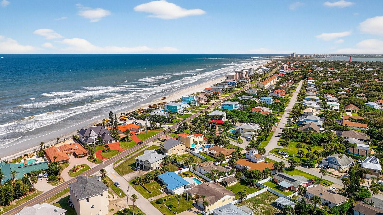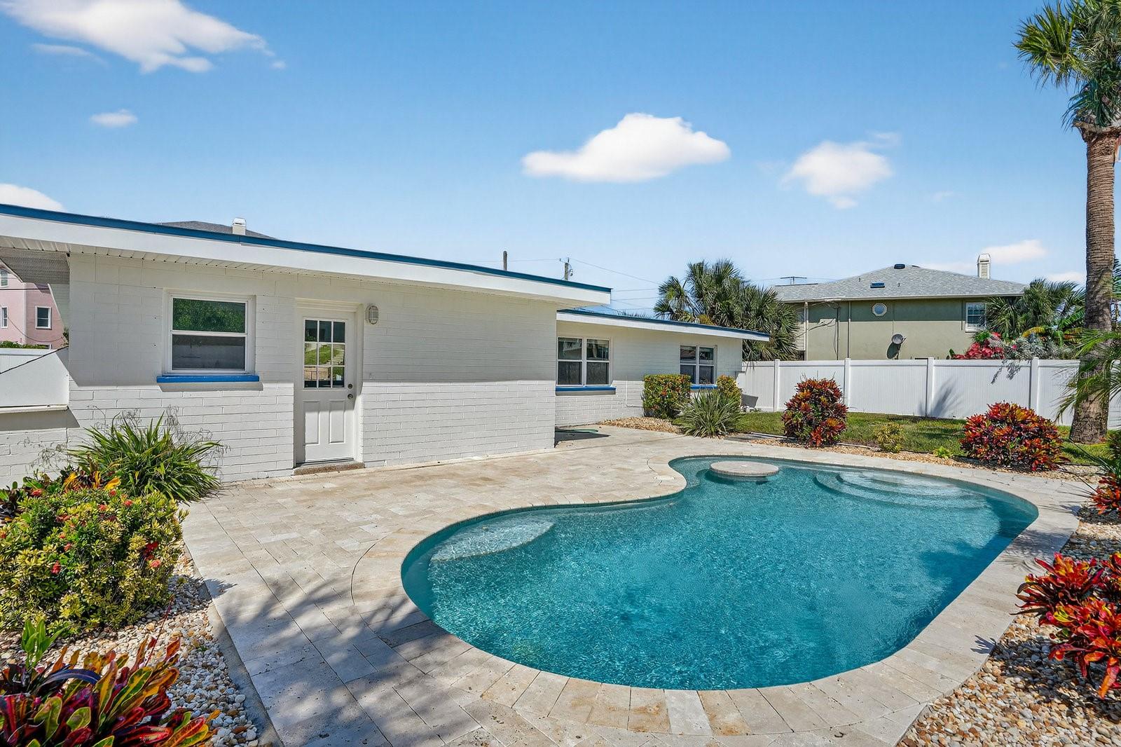 Just one block from the beach and close enough to glimpse the ocean from your front door, this 3-bedroom, 2-bath coastal charmer is all about living the dream! Featuring a brand-new 2023 insulated metal roof, updated HVAC, and fresh paint inside and out, this home blends classic Florida vibes with modern peace of mind. Step inside to find gleaming terrazzo floors, soaring ceilings, and a light, airy layout that flows seamlessly to the backyard. Outside, your own private oasis awaits - a sparkling saltwater pool with newer equipment and an electric heater, surrounded by a full vinyl privacy fence, perfect for entertaining or quiet morning coffees. Most of the windows and sliding glass doors have been upgraded to impact-rated, plus there are see-through storm shutters, giving you both safety and style. The retro-chic bathrooms are a nod to mid-century character, bringing a splash of vintage charm. This home delivers the ultimate beachside lifestyle - turnkey, stylish, and just steps from the sand. Pack your flip-flops, because your beachside paradise is ready when you are!