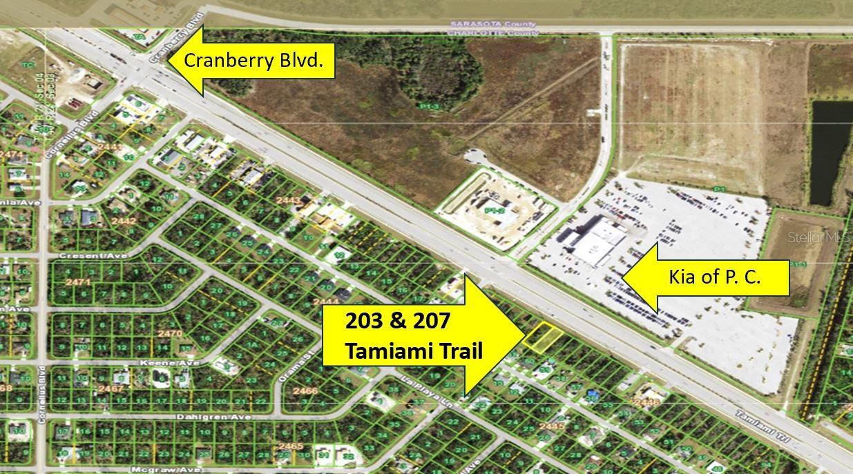 Two parcels (15,000 square feet) with a total of 100' frontage on Tamiami Trail directly across from Port Charlotte Kia. Property has potable water and a sewer force main and is zoned Commercial General. This location has great potential so don't miss your opportunity to be a part of the growing number of businesses on Tamiami Trail!