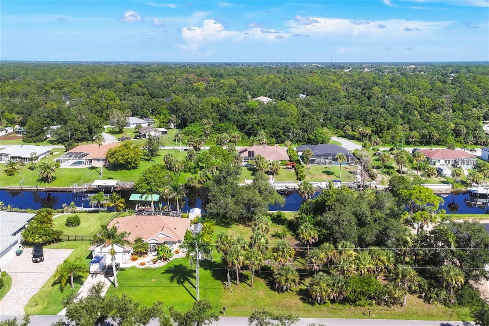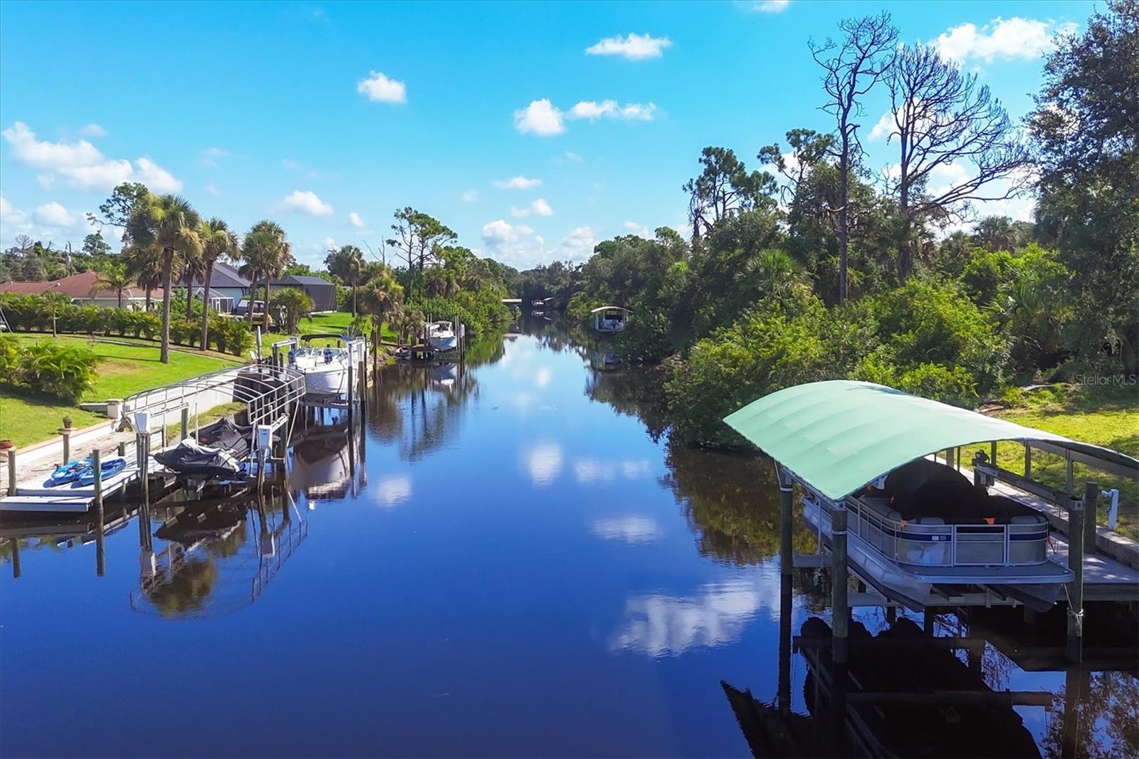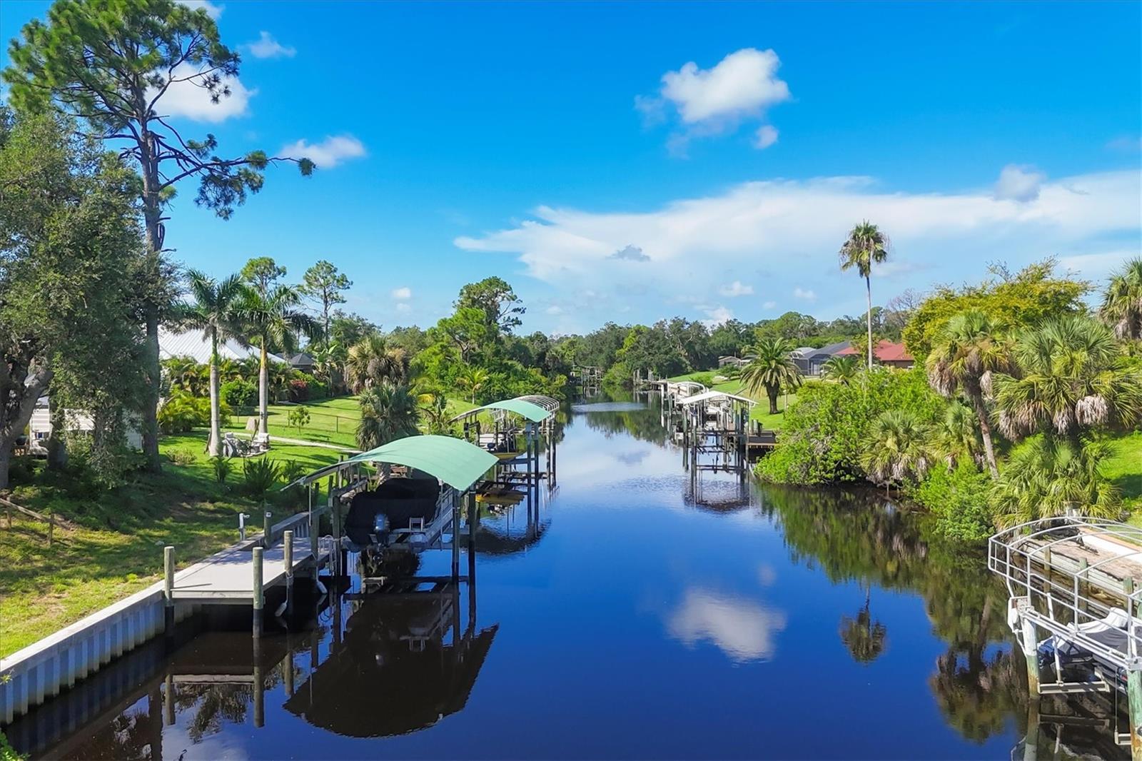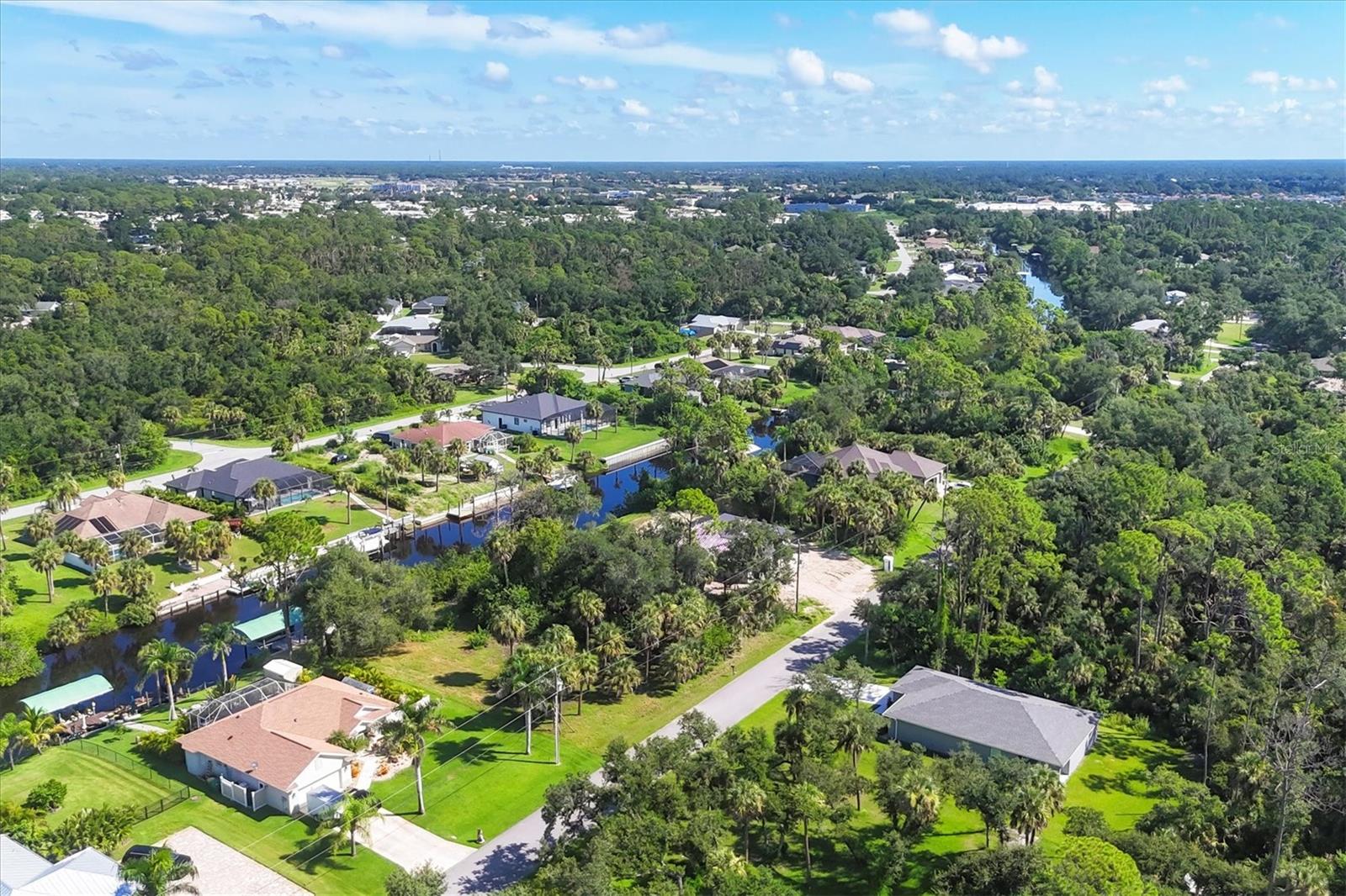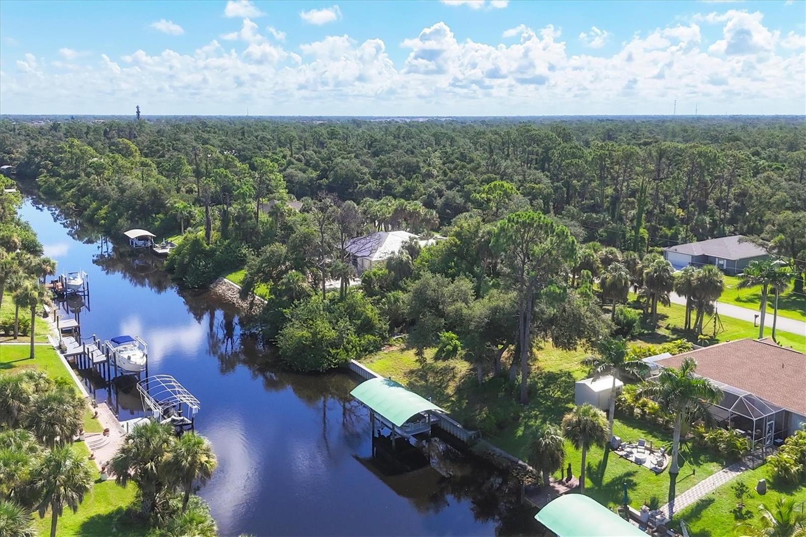Boater’s Paradise with GULF ACCESS is only waiting for your imagination for the perfect Florida dream home. The Gulf, Charlotte Harbor and Myakka River are all within a short boat ride along the Apollo Waterway. This lot has been cleared, leaving beautiful oaks and palms and spectacular sunsets to decorate your new home, all without being located in a flood zone! Concrete seawall (80’), composite dock, and boat lift installed in 2021; lift canopy added in 2024. A temporary power pole has been installed for the boat lift and RV-hookup while building your custom slice of paradise. An additional 160 SqFt have been released from the canal easement to provide a seamless transition for a pool to connect to the boat dock. Spend your days fishing, boating or sipping your favorite beverage on the dock, watching the incredible sunsets. This property offers the perfect blend of tranquility and serenity, while being so convenient to excellent beaches, restaurants, shops, golf courses and endless outdoor adventures, in between North Port and Port Charlotte.