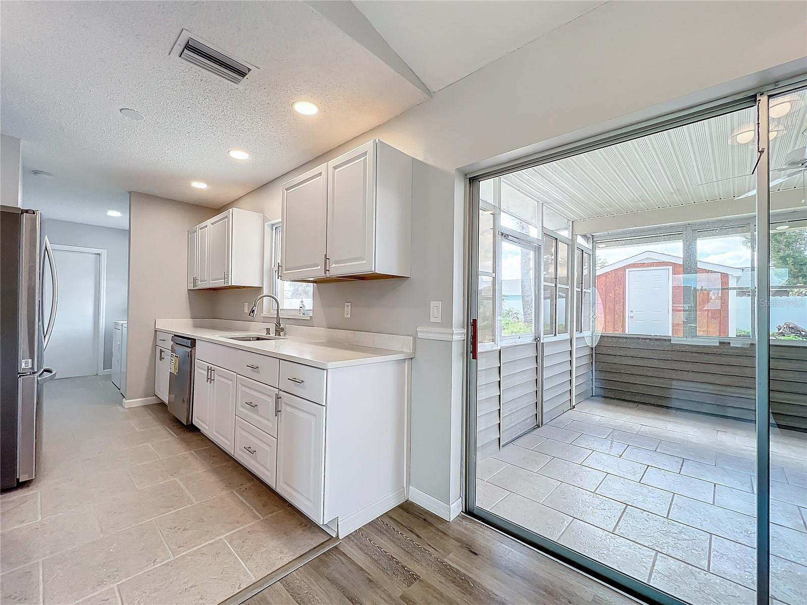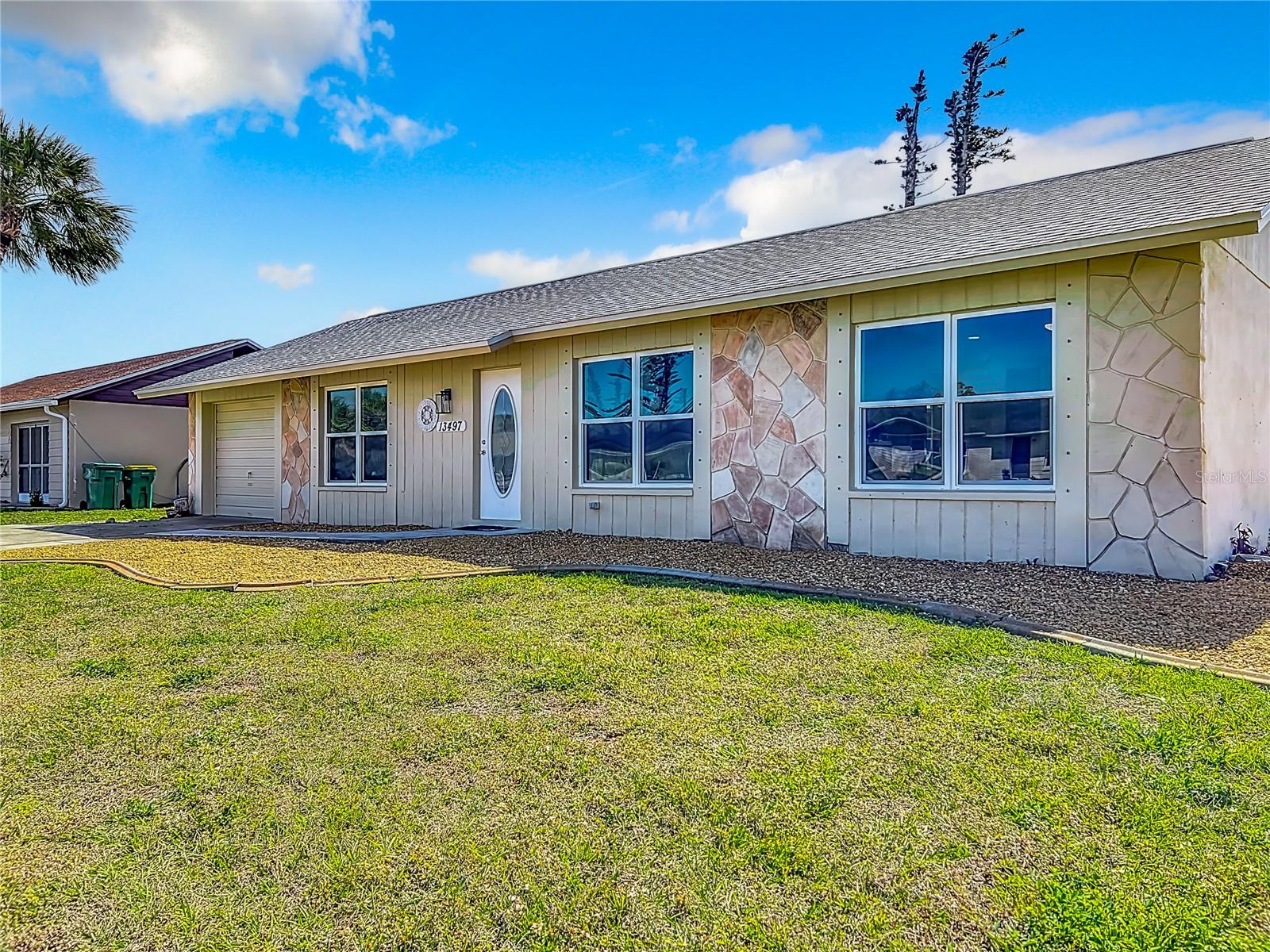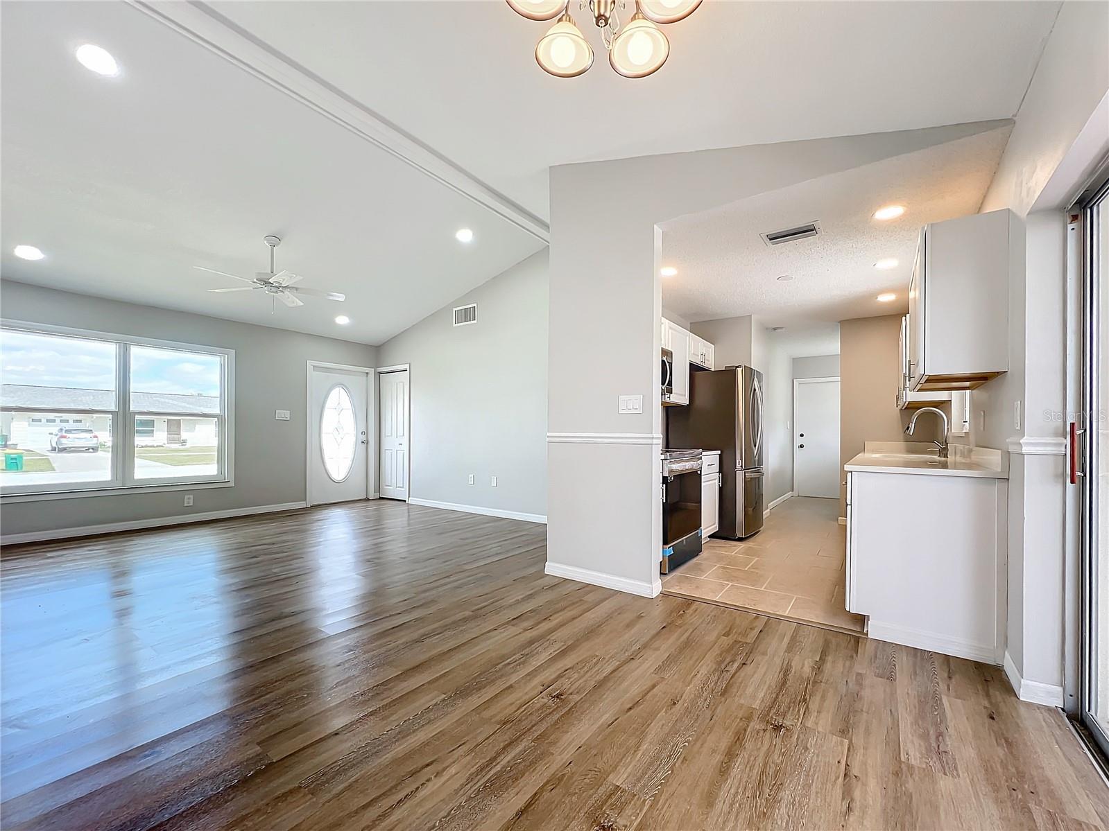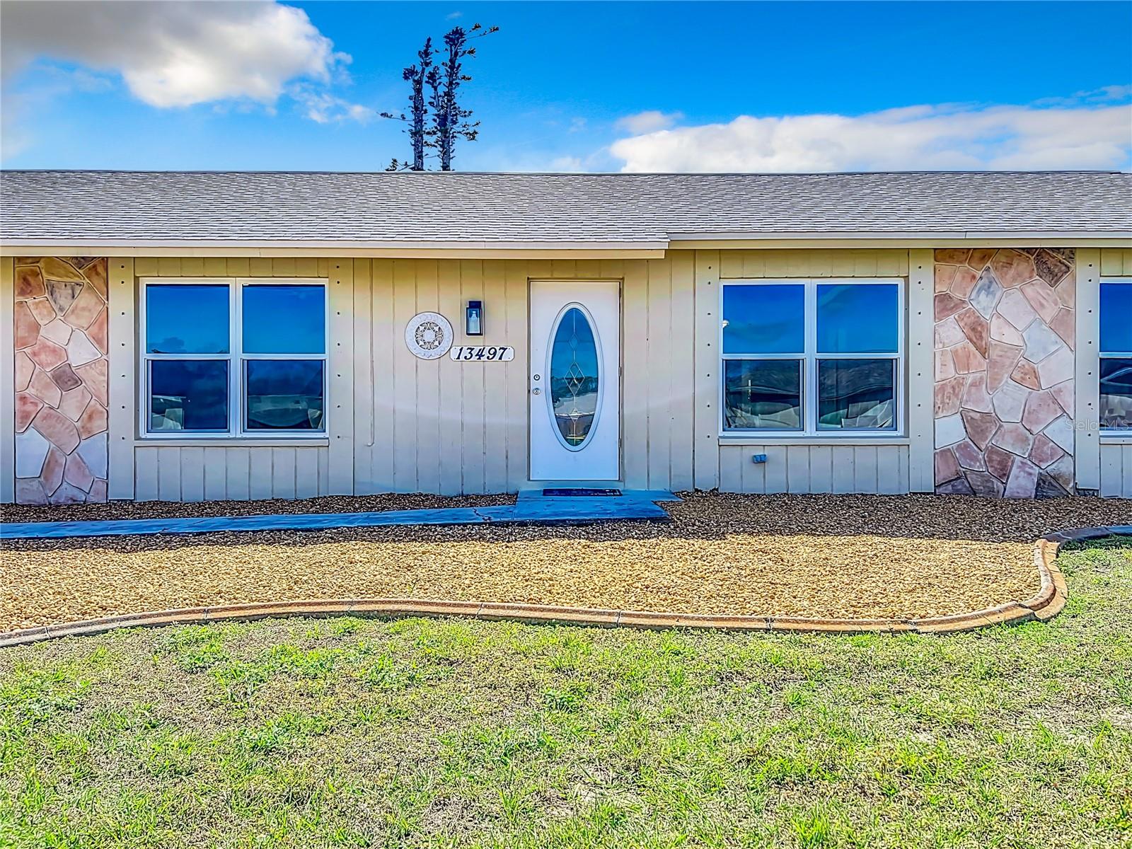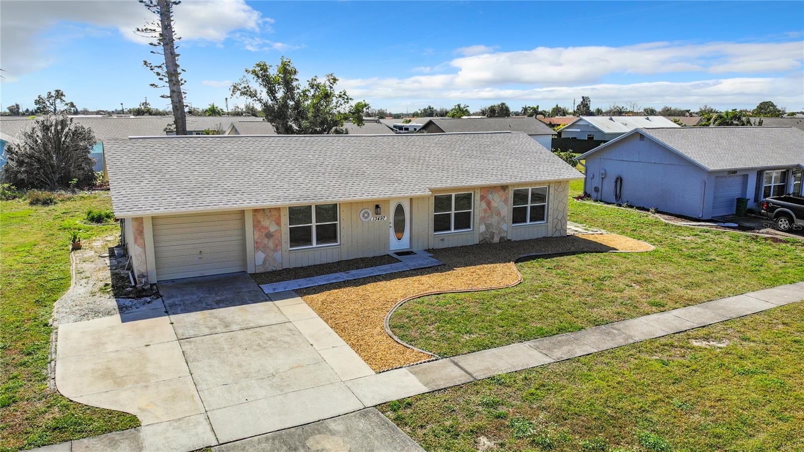 Newly Renovated home that offers 2 large Bedrooms, beautiful master bath with walk-in shower plus another full bath for your guest. large bright living room/Dining room combo with cathedral ceilings. Brand new kitchen with all new appliances, breakfast bar and tile floors. From the kitchen you enter the laundry room and 1 car garage. All new paint on the interior. Large Lanai off the Dining area with tile floors that leads to a big back yard with shed. New Roof in 2023.