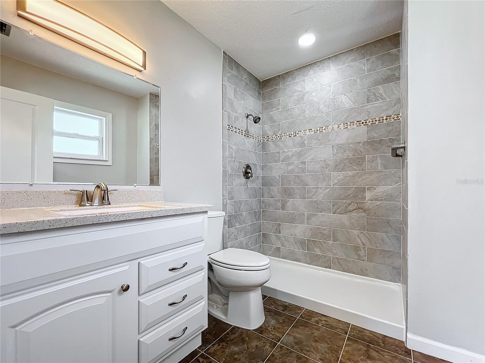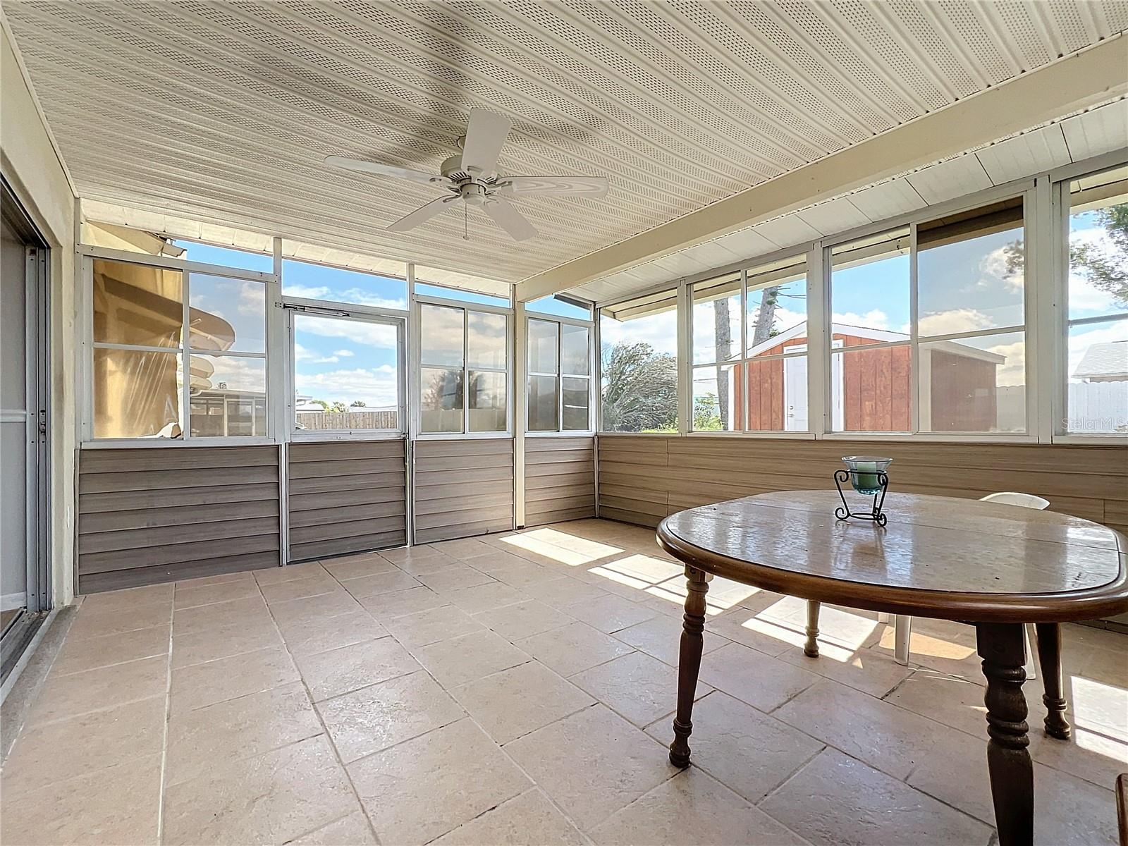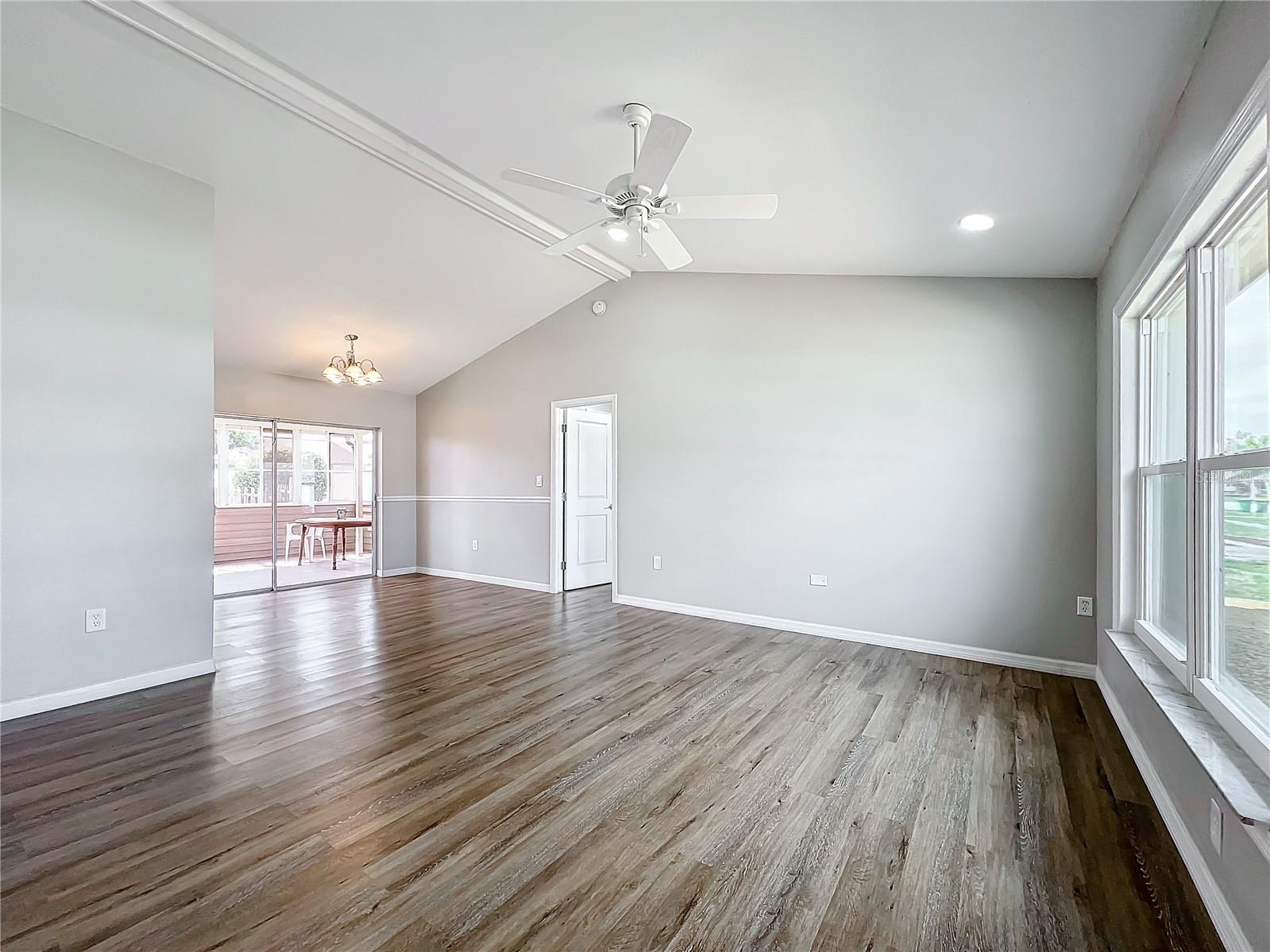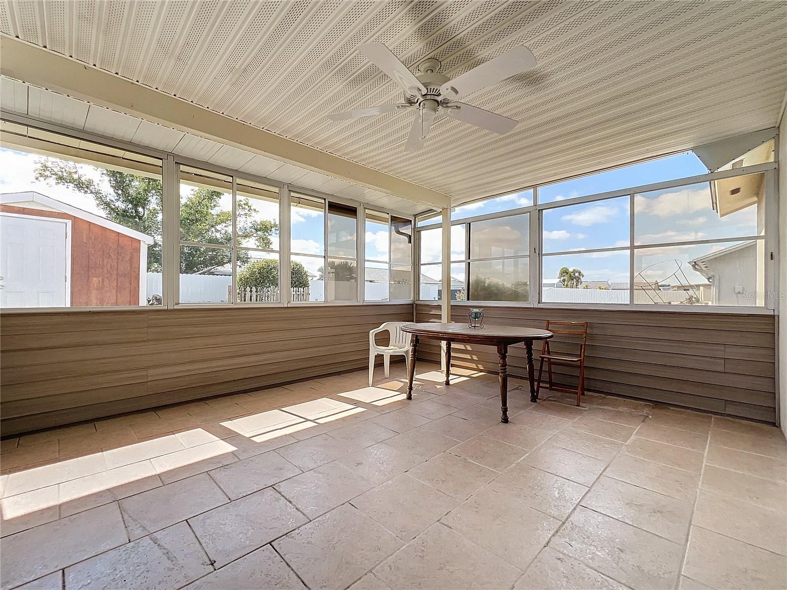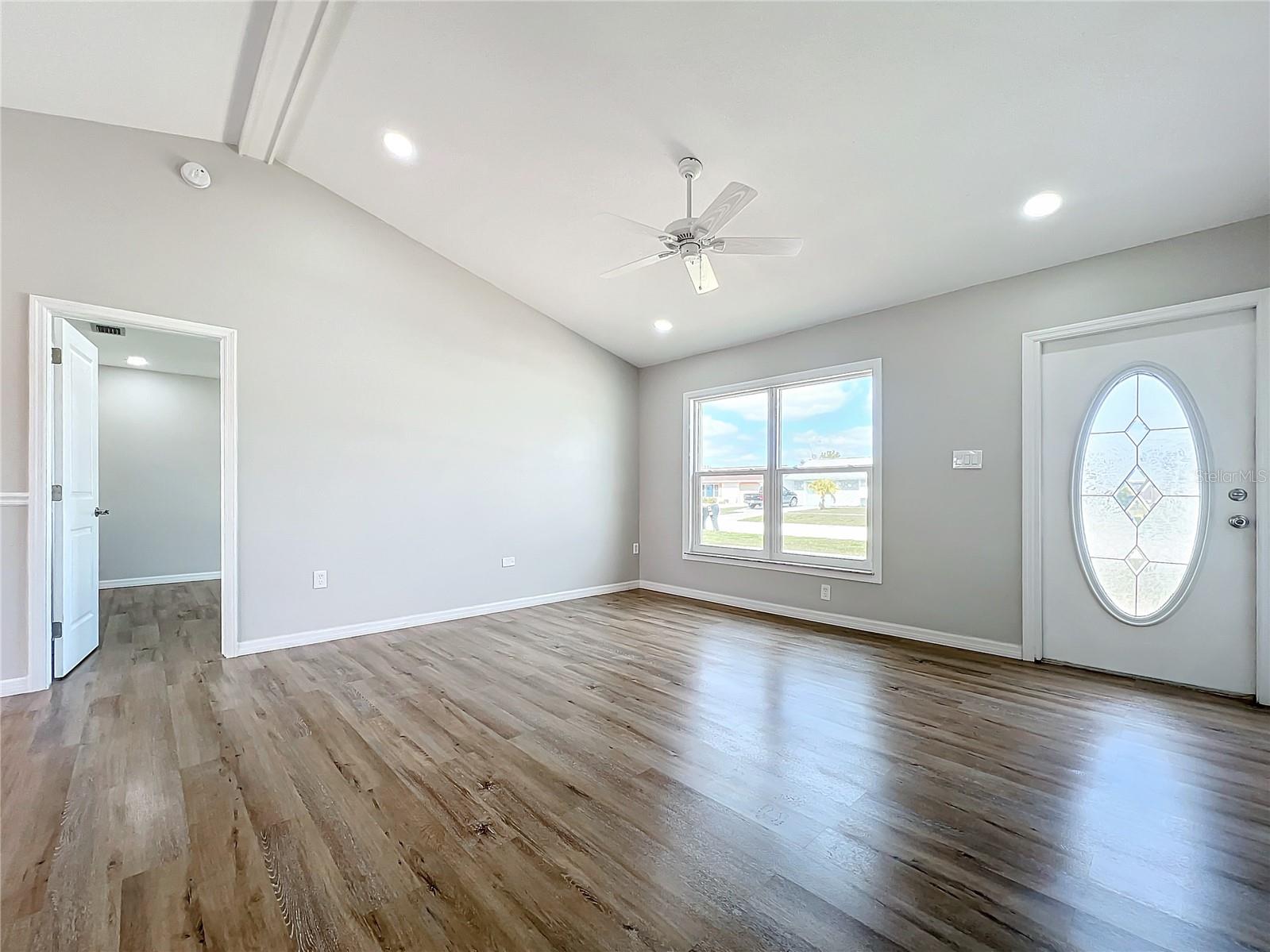 Newly Renovated home that offers 2 large Bedrooms, beautiful master bath with walk-in shower plus another full bath for your guest. large bright living room/Dining room combo with cathedral ceilings. Brand new kitchen with all new appliances, breakfast bar and tile floors. From the kitchen you enter the laundry room and 1 car garage. All new paint on the interior. Large Lanai off the Dining area with tile floors that leads to a big back yard with shed. New Roof in 2023.