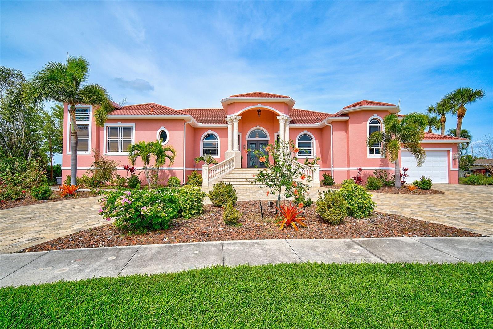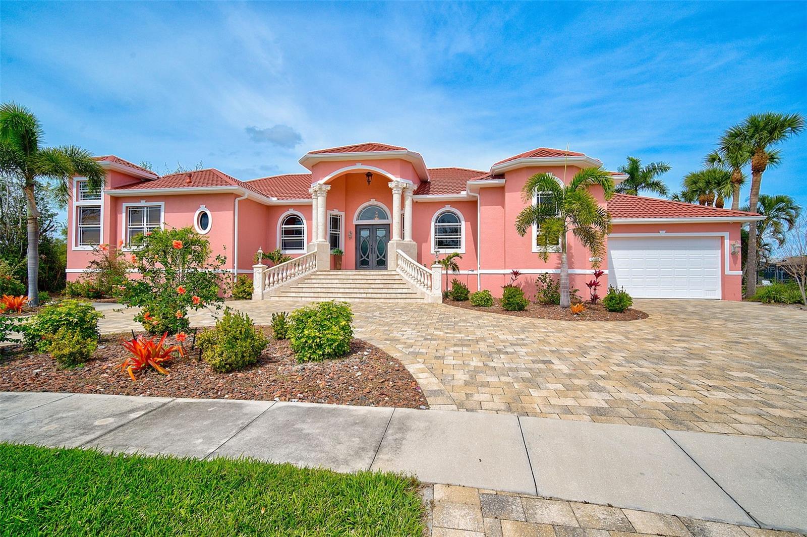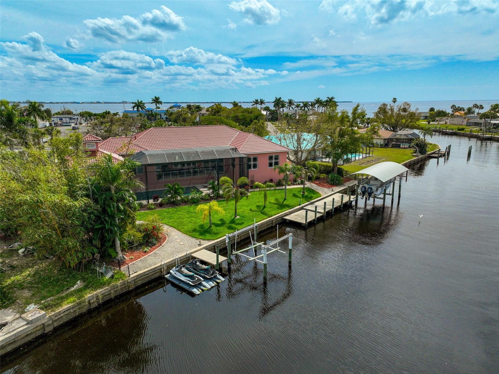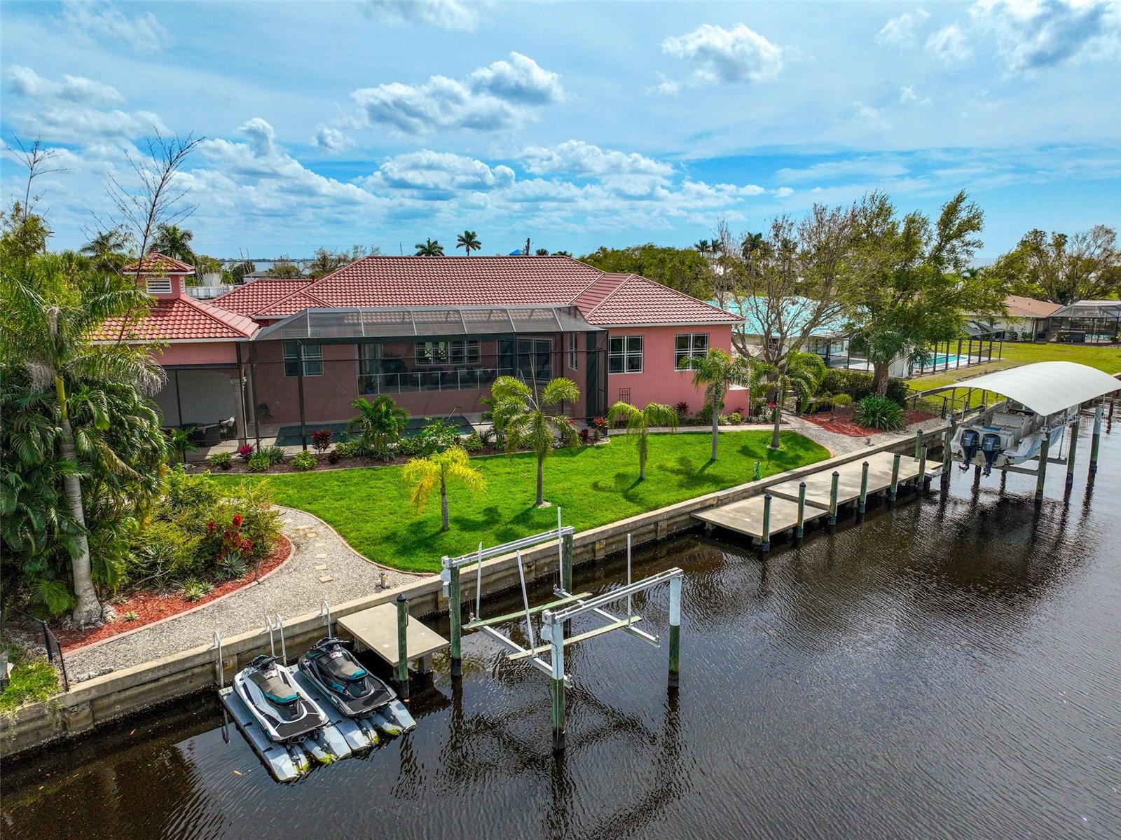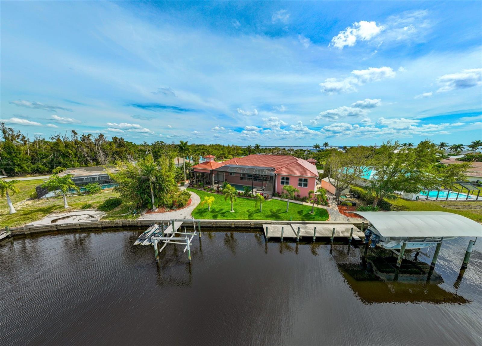 Are you looking for a waterfront home with sailboat water that is high and dry? Look no further! This beautiful home is what you're looking for: no flood damage here! Enjoy breathtaking water views from your massive screened lanai. With 1,961 sf of outdoor space, a custom-built outdoor kitchen, and an oversized saltwater pool entertaining is a joy. This meticulously crafted custom-designed waterfront home is designed for the buyer that appreciates luxury, convenience, and quick access to Charlotte Harbor (only 650' away without any bridges) and out to the ICW and Gulf of Mexico. The home offers two docks and two lift slips with water and electricity, as well as two floating jet ski ports. Imagine casting off for a day of fishing, cruising to multiple waterfront restaurants, islands and resorts, dolphin and wildlife spotting, or simply soaking up the sun at your private pool and dock. Step inside the grand residence and be greeted by an open floor plan, soaring 12-foot ceilings, and an abundance of natural light that showcases the captivating water views. High-end finishes abound, from the exquisite tile and travertine flooring to the natural stone countertops and solid wood doors. Prepare gourmet meals in the chef's kitchen, featuring new appliances, including a top-of-the-line Wolf gas range. Unwind in the luxurious primary suite, complete with a spa-like bathroom and a professionally designed closet system. The home has a new metal roof (2023) far exceeding Florida's hurricane standards, solid block construction with hurricane impact windows and doors for ultimate peace of mind, and a cooled/heated four-car garage with premium flooring. Recent renovations ensure the utmost comfort and convenience, with two newer HVAC systems (2021 & 2022), two tankless hot water heaters (2020 & 2023), a 500-gallon underground propane tank, salt water pool with fountain, large boat slip cover, a water softener, a reverse osmosis water filtration system, professional landscaping with privacy hedges, and top-of-the-line appliances throughout are only some of the many upgrades. Beyond your private retreat, a world of possibilities awaits. Explore the diverse culinary scene at the nearby Sunseeker Resort, Fisherman's Village, or the countless waterfront destinations accessible by boat. Enjoy the convenience of shopping, entertainment, and sporting events, all within easy reach. This extraordinary waterfront estate presents a rare opportunity to own a piece of paradise. If you seek a life of unparalleled luxury, convenience, and connection to the magic of the Florida coast, look no further.