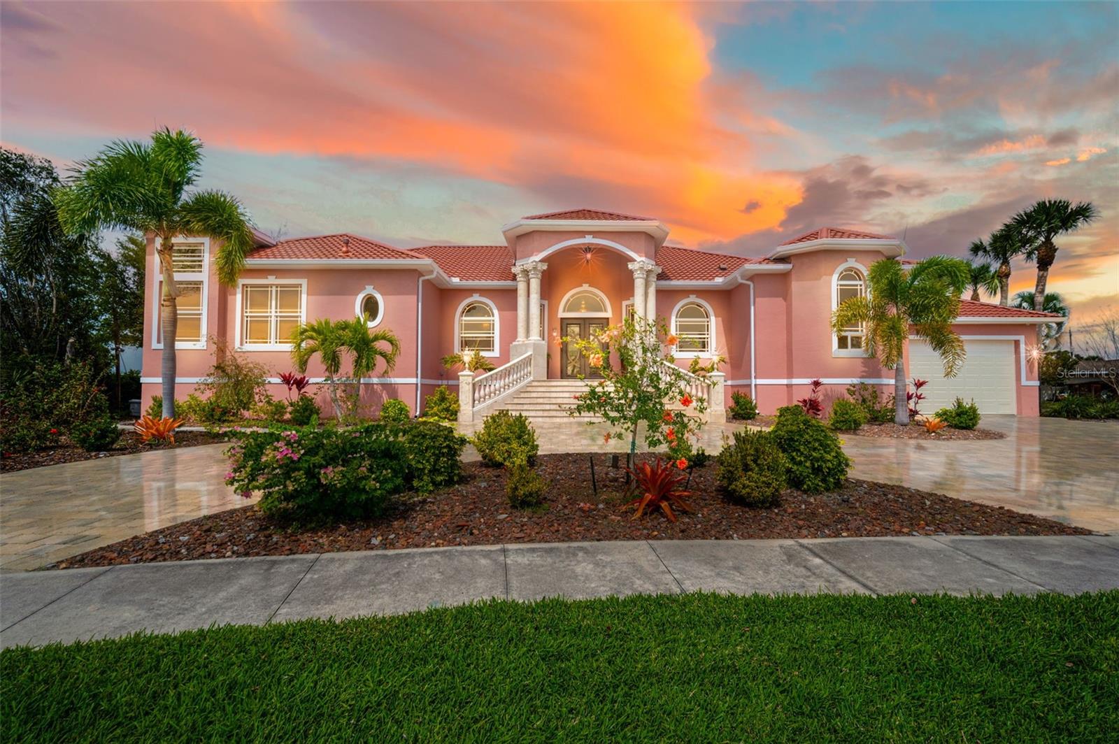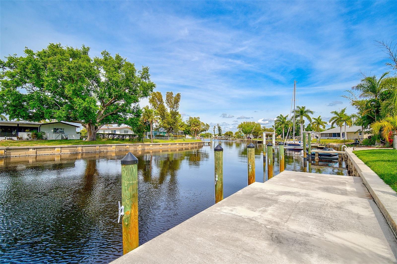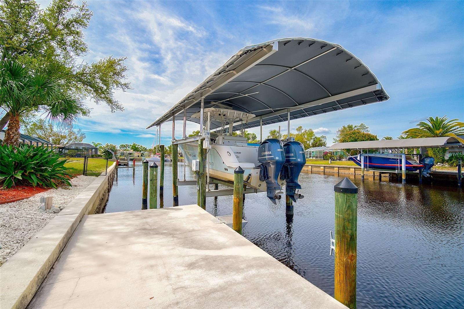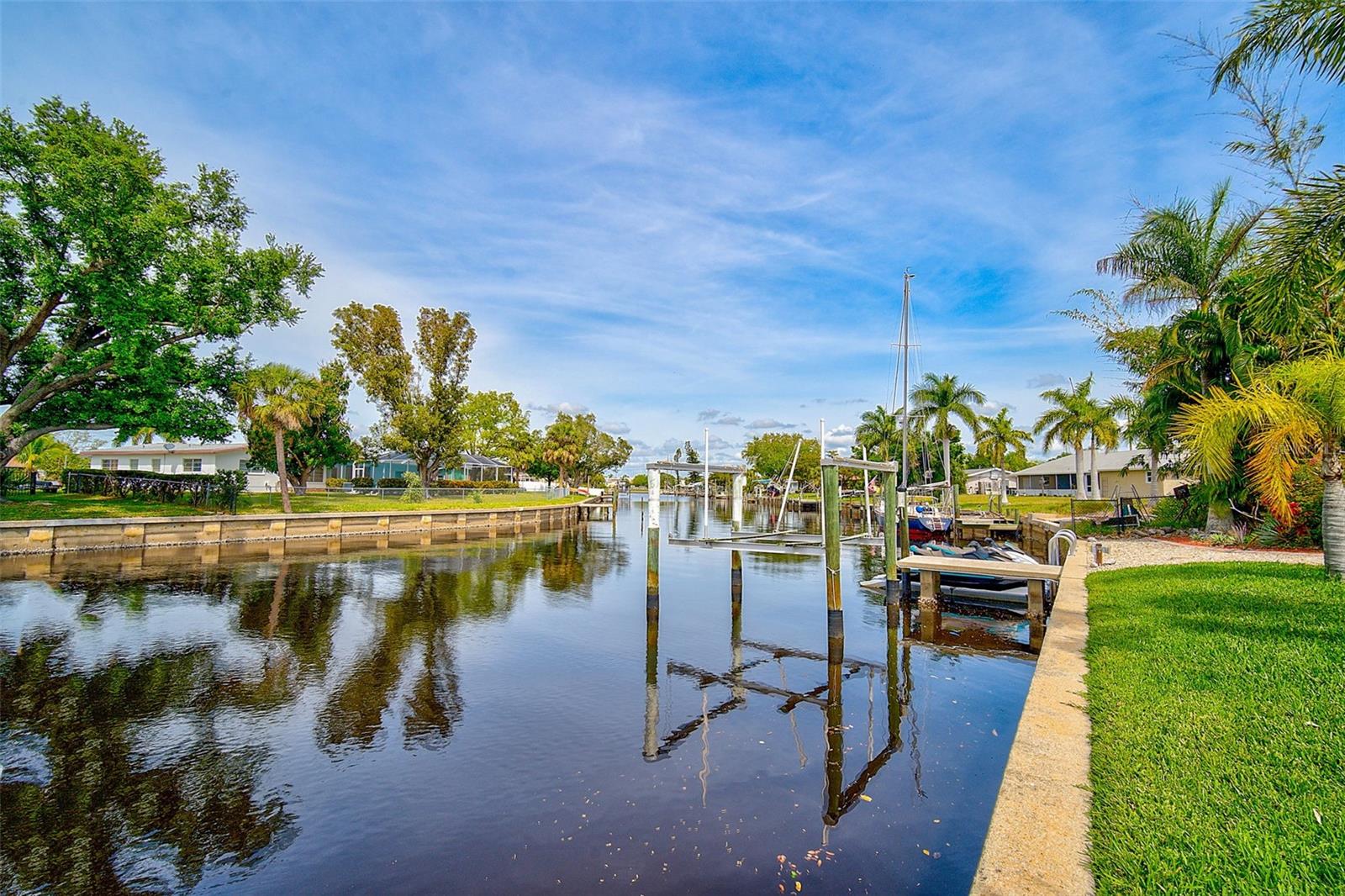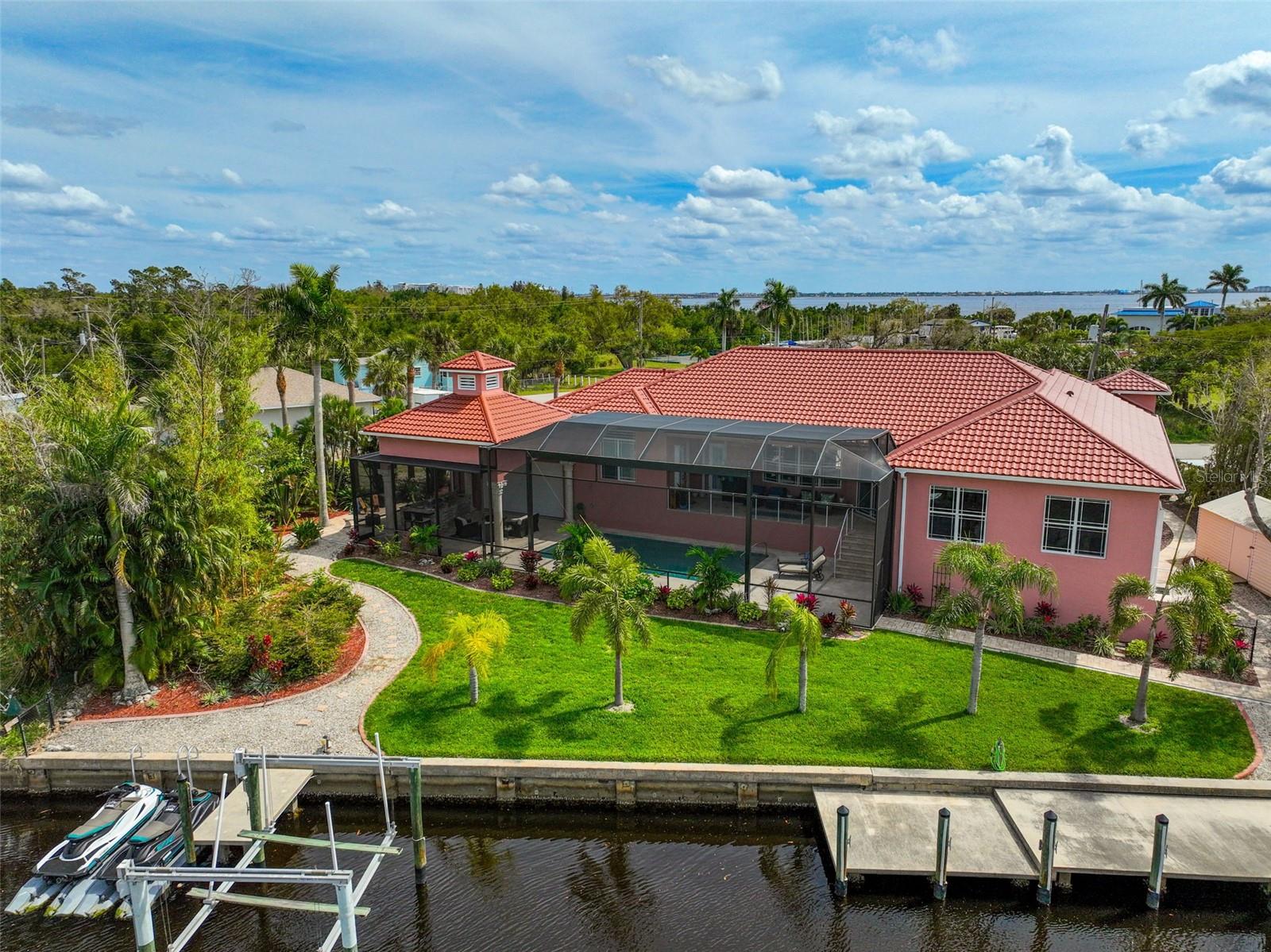 Are you looking for a waterfront home with sailboat water that is high and dry? Look no further! This beautiful home is what you're looking for: no flood damage here! Enjoy breathtaking water views from your massive screened lanai. With 1,961 sf of outdoor space, a custom-built outdoor kitchen, and an oversized saltwater pool entertaining is a joy. This meticulously crafted custom-designed waterfront home is designed for the buyer that appreciates luxury, convenience, and quick access to Charlotte Harbor (only 650' away without any bridges) and out to the ICW and Gulf of Mexico. The home offers two docks and two lift slips with water and electricity, as well as two floating jet ski ports. Imagine casting off for a day of fishing, cruising to multiple waterfront restaurants, islands and resorts, dolphin and wildlife spotting, or simply soaking up the sun at your private pool and dock. Step inside the grand residence and be greeted by an open floor plan, soaring 12-foot ceilings, and an abundance of natural light that showcases the captivating water views. High-end finishes abound, from the exquisite tile and travertine flooring to the natural stone countertops and solid wood doors. Prepare gourmet meals in the chef's kitchen, featuring new appliances, including a top-of-the-line Wolf gas range. Unwind in the luxurious primary suite, complete with a spa-like bathroom and a professionally designed closet system. The home has a new metal roof (2023) far exceeding Florida's hurricane standards, solid block construction with hurricane impact windows and doors for ultimate peace of mind, and a cooled/heated four-car garage with premium flooring. Recent renovations ensure the utmost comfort and convenience, with two newer HVAC systems (2021 & 2022), two tankless hot water heaters (2020 & 2023), a 500-gallon underground propane tank, salt water pool with fountain, large boat slip cover, a water softener, a reverse osmosis water filtration system, professional landscaping with privacy hedges, and top-of-the-line appliances throughout are only some of the many upgrades. Beyond your private retreat, a world of possibilities awaits. Explore the diverse culinary scene at the nearby Sunseeker Resort, Fisherman's Village, or the countless waterfront destinations accessible by boat. Enjoy the convenience of shopping, entertainment, and sporting events, all within easy reach. This extraordinary waterfront estate presents a rare opportunity to own a piece of paradise. If you seek a life of unparalleled luxury, convenience, and connection to the magic of the Florida coast, look no further.
