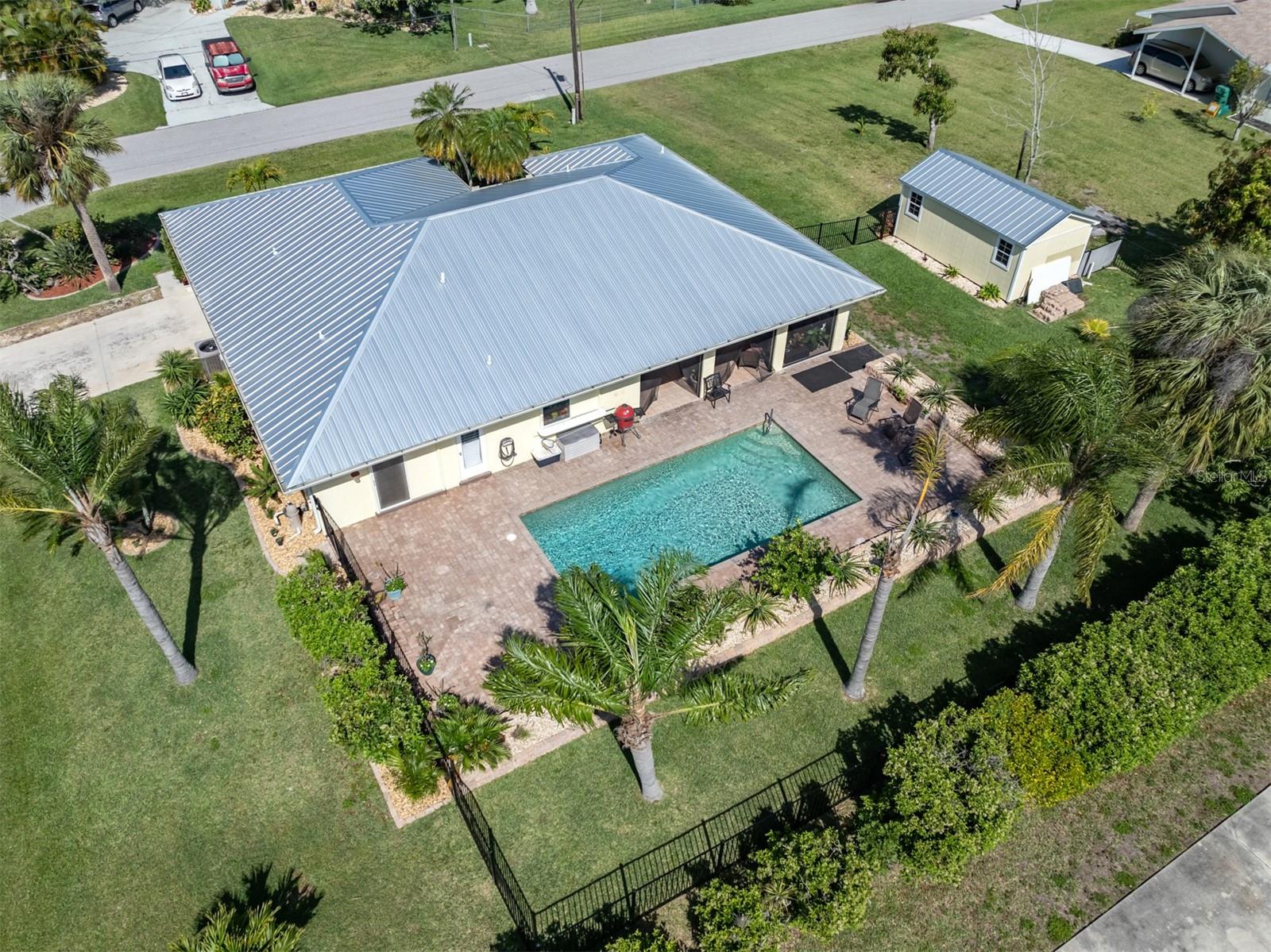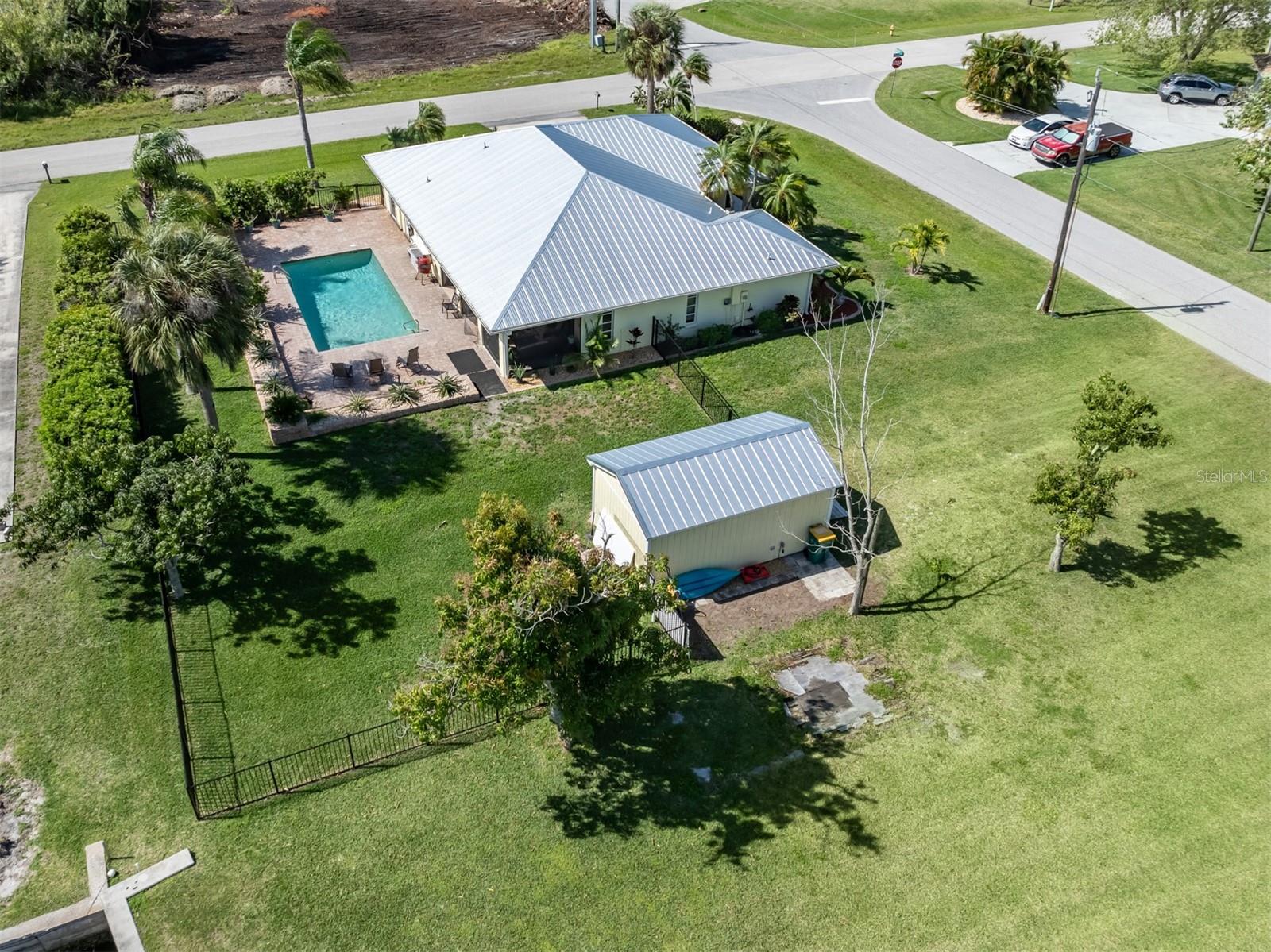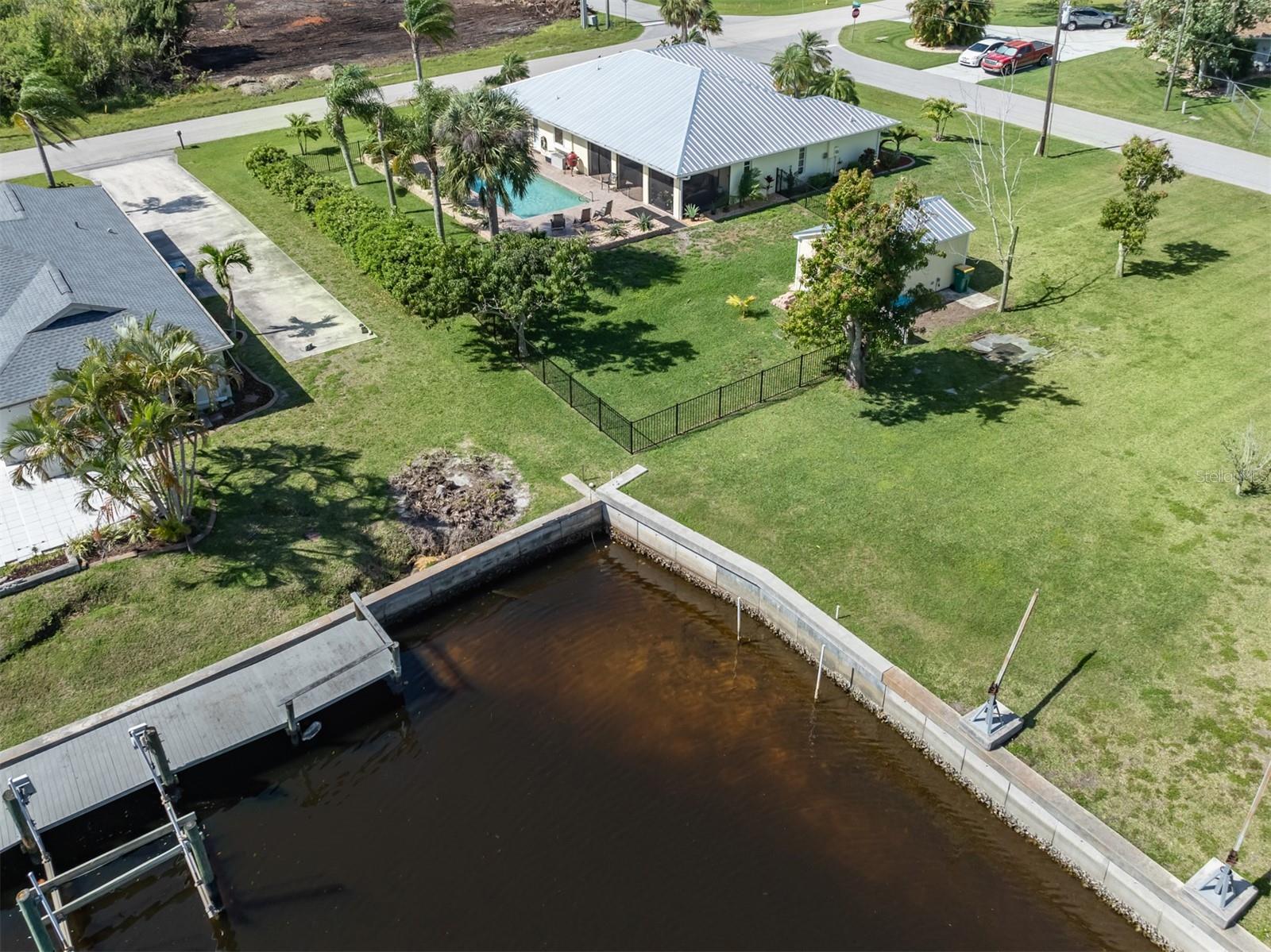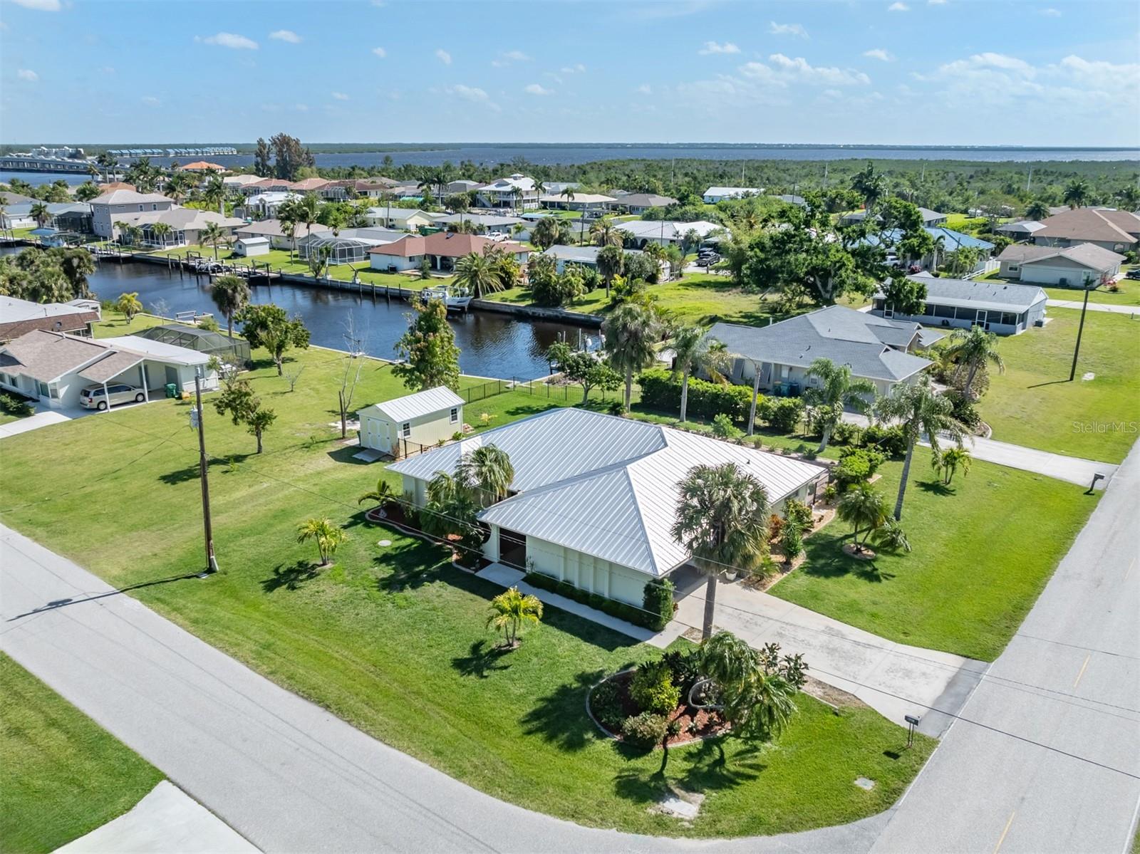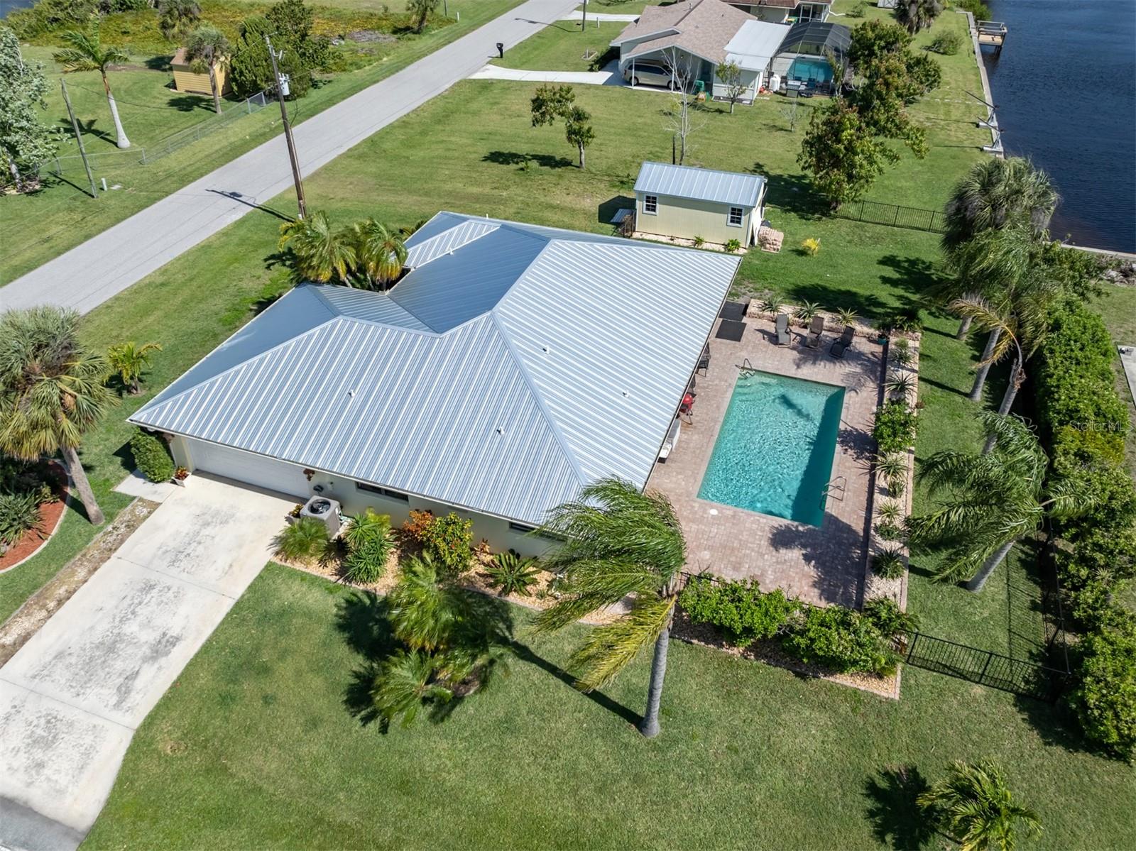 Welcome to your waterfront piece of Florida paradise! Located in the desirable boating community of Gulf Cove, this home is a water lover's dream. The canal-front property features an ideal split floor plan with three bedrooms, two and a half baths (including a pool bath), and vaulted ceilings throughout the open-concept living/dining area, ensuring the perfect space for entertaining. Situated on a large corner lot, the property also boasts an additional 40 feet of width on the left side, providing ample space for parking your boat, water toys, RV, or for adding onto the existing property. Currently, a large matching shed occupies this space, which can be utilized or converted according to your needs. Upon arrival, you'll notice fresh exterior paint, new landscaping, and a new metal roof (installed in 2022), along with a matching metal roof and paint on the workshop/shed. Recent upgrades include interior paint, landscaping and lighting around the pool area, a wrought iron-fenced backyard, a resurfaced pool, a brick-paver pool deck, an outdoor electrical hookup for an RV, luxury waterproof laminate flooring, newer stainless steel appliances, and removal of popcorn ceilings from the primary bedroom and main living areas. New owners can take advantage of the Gulf Cove private community boat ramp located just a couple of streets over, as well as the waterfront community park, playground, and pavilion. The Homeowners Association (HOA) is optional, with an annual fee of $75 for use of the boat ramp or other Gulf Cove amenities. This home is truly a peaceful tropical oasis that would make for a fantastic full-time or part-time residence.