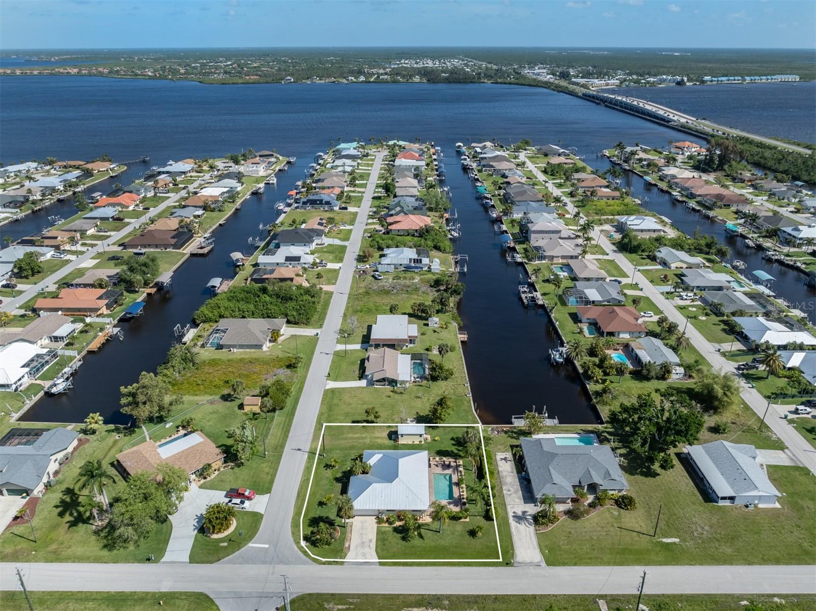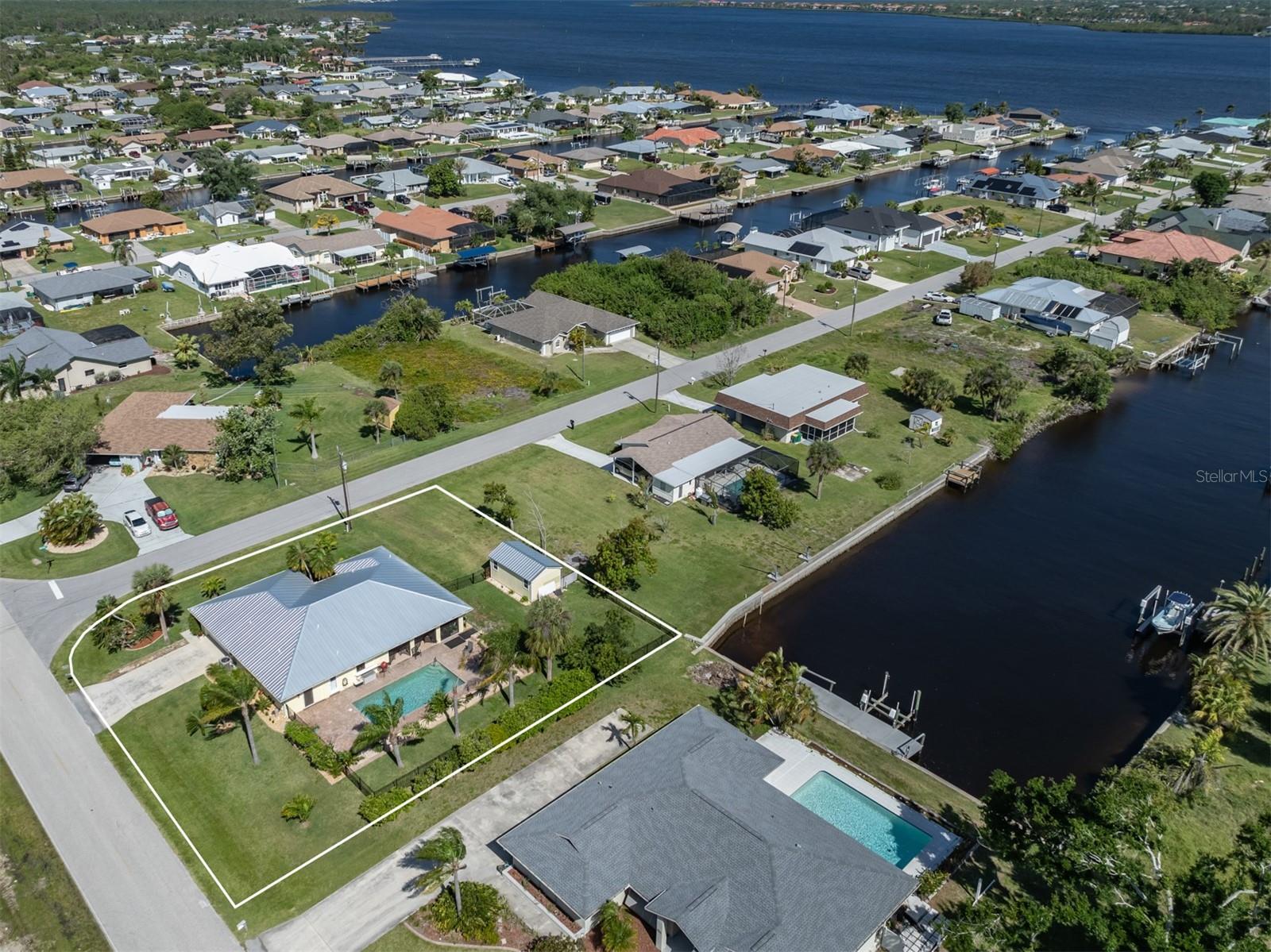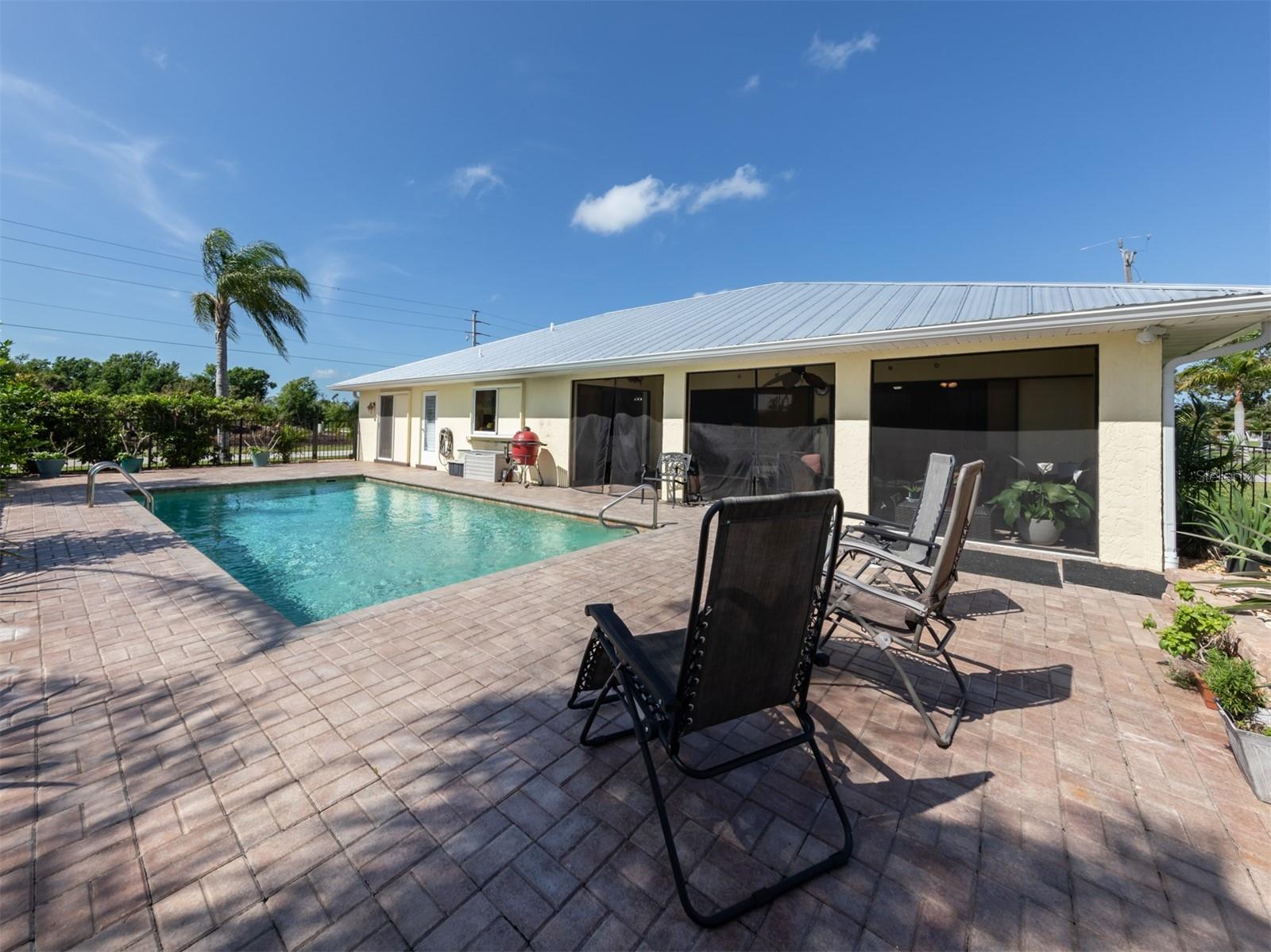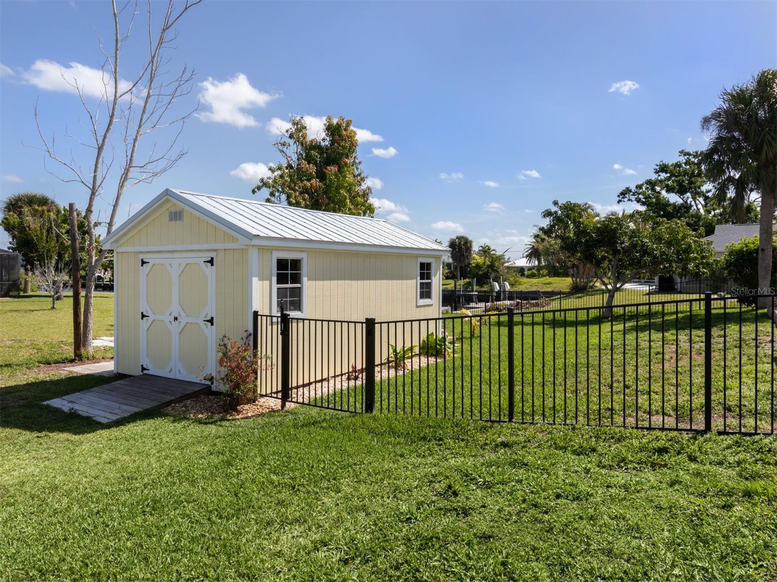 Welcome to your waterfront piece of Florida paradise! Located in the desirable boating community of Gulf Cove, this home is a water lover's dream. The canal-front property features an ideal split floor plan with three bedrooms, two and a half baths (including a pool bath), and vaulted ceilings throughout the open-concept living/dining area, ensuring the perfect space for entertaining. Situated on a large corner lot, the property also boasts an additional 40 feet of width on the left side, providing ample space for parking your boat, water toys, RV, or for adding onto the existing property. Currently, a large matching shed occupies this space, which can be utilized or converted according to your needs. Upon arrival, you'll notice fresh exterior paint, new landscaping, and a new metal roof (installed in 2022), along with a matching metal roof and paint on the workshop/shed. Recent upgrades include interior paint, landscaping and lighting around the pool area, a wrought iron-fenced backyard, a resurfaced pool, a brick-paver pool deck, an outdoor electrical hookup for an RV, luxury waterproof laminate flooring, newer stainless steel appliances, and removal of popcorn ceilings from the primary bedroom and main living areas. New owners can take advantage of the Gulf Cove private community boat ramp located just a couple of streets over, as well as the waterfront community park, playground, and pavilion. The Homeowners Association (HOA) is optional, with an annual fee of $75 for use of the boat ramp or other Gulf Cove amenities. This home is truly a peaceful tropical oasis that would make for a fantastic full-time or part-time residence.