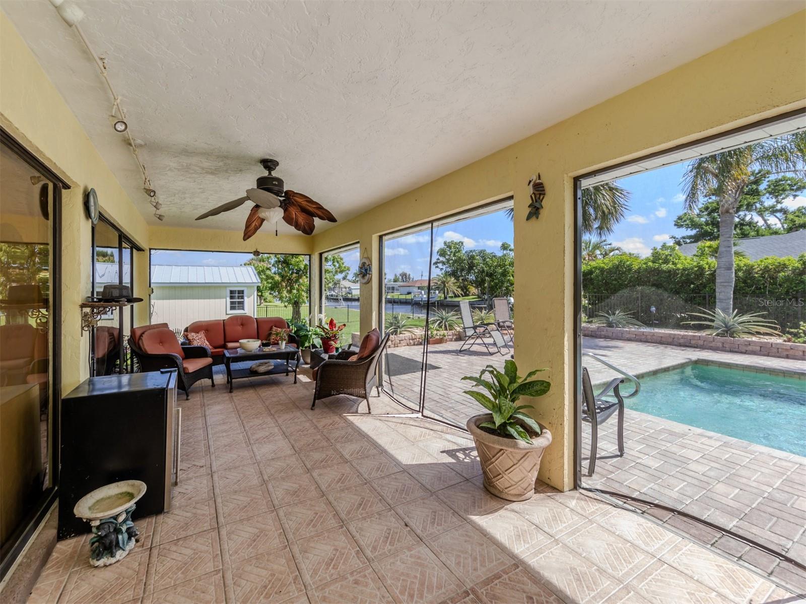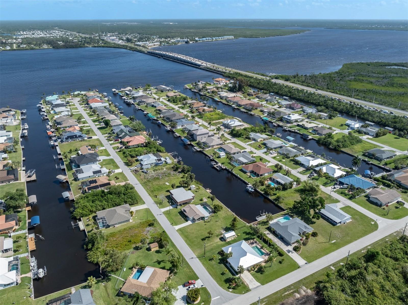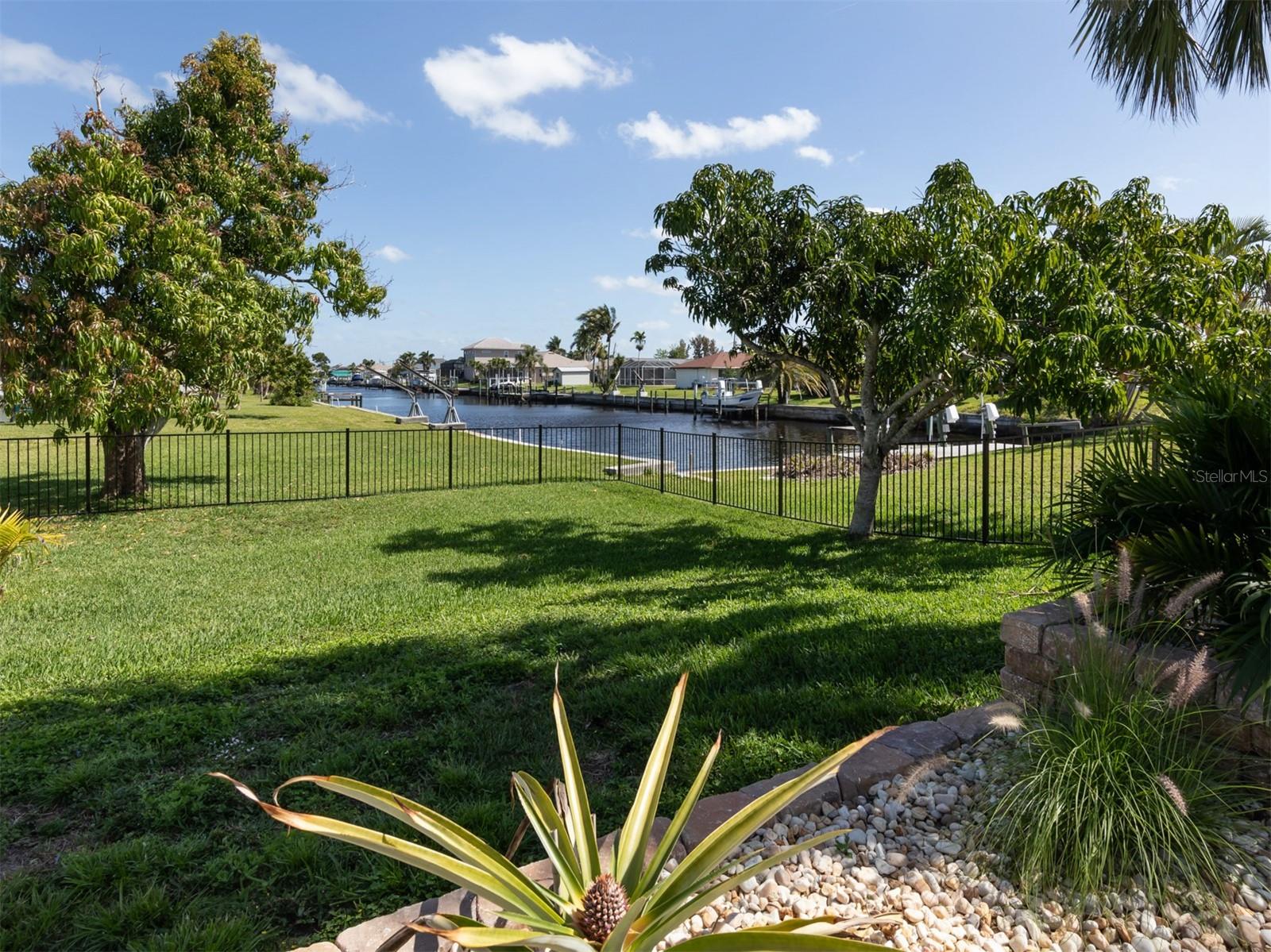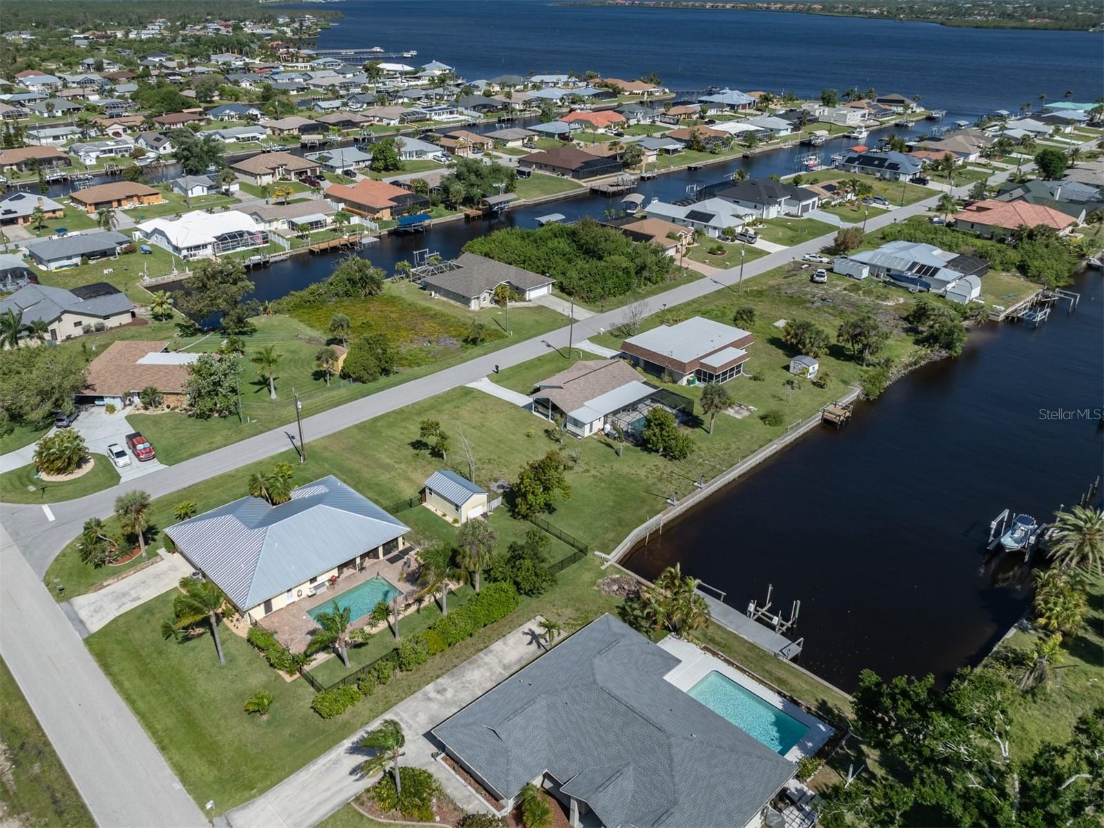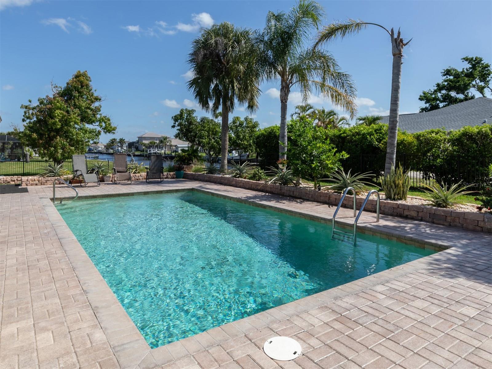 Welcome to your waterfront piece of Florida paradise! Located in the desirable boating community of Gulf Cove, this home is a water lover's dream. The canal-front property features an ideal split floor plan with three bedrooms, two and a half baths (including a pool bath), and vaulted ceilings throughout the open-concept living/dining area, ensuring the perfect space for entertaining. Situated on a large corner lot, the property also boasts an additional 40 feet of width on the left side, providing ample space for parking your boat, water toys, RV, or for adding onto the existing property. Currently, a large matching shed occupies this space, which can be utilized or converted according to your needs. Upon arrival, you'll notice fresh exterior paint, new landscaping, and a new metal roof (installed in 2022), along with a matching metal roof and paint on the workshop/shed. Recent upgrades include interior paint, landscaping and lighting around the pool area, a wrought iron-fenced backyard, a resurfaced pool, a brick-paver pool deck, an outdoor electrical hookup for an RV, luxury waterproof laminate flooring, newer stainless steel appliances, and removal of popcorn ceilings from the primary bedroom and main living areas. New owners can take advantage of the Gulf Cove private community boat ramp located just a couple of streets over, as well as the waterfront community park, playground, and pavilion. The Homeowners Association (HOA) is optional, with an annual fee of $75 for use of the boat ramp or other Gulf Cove amenities. This home is truly a peaceful tropical oasis that would make for a fantastic full-time or part-time residence.