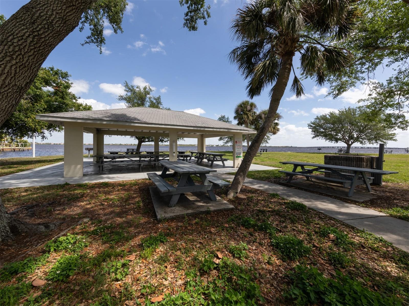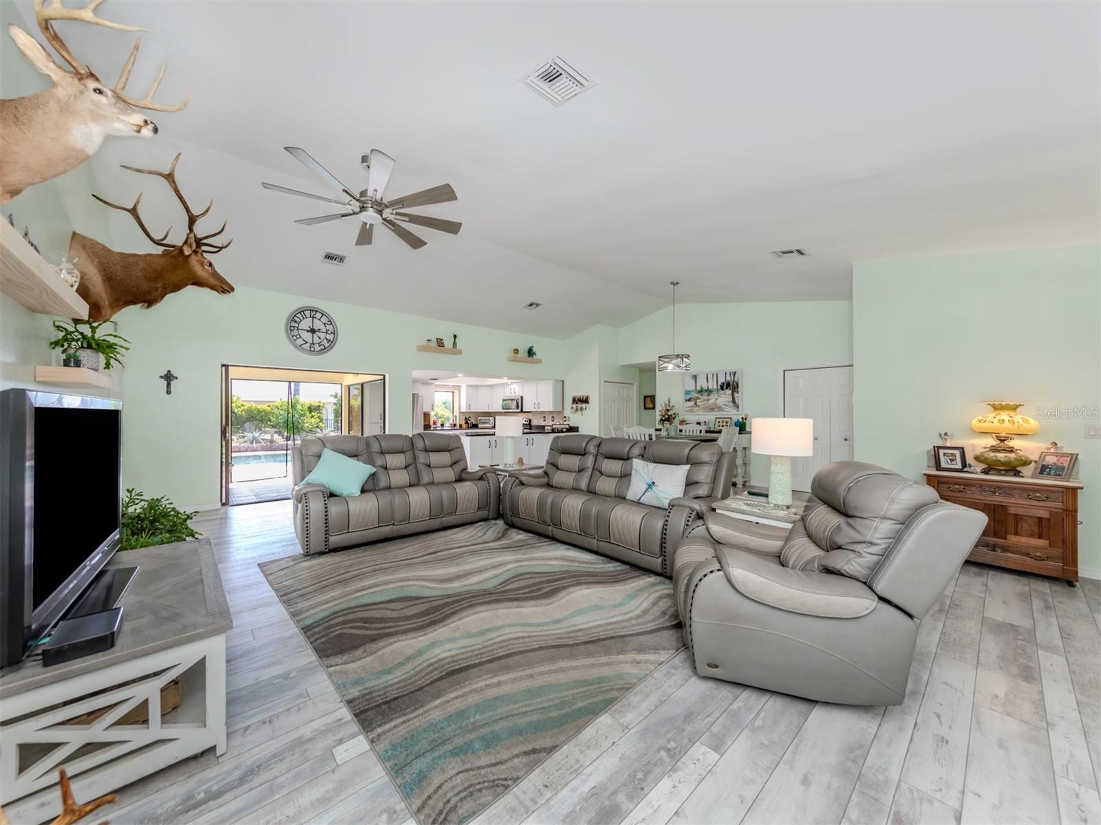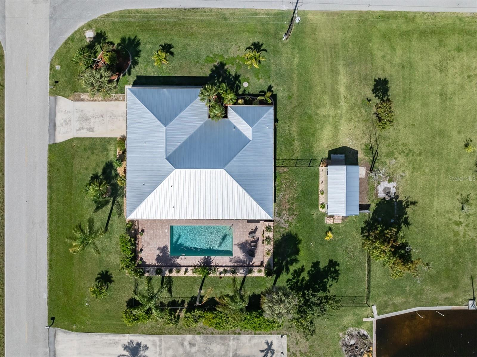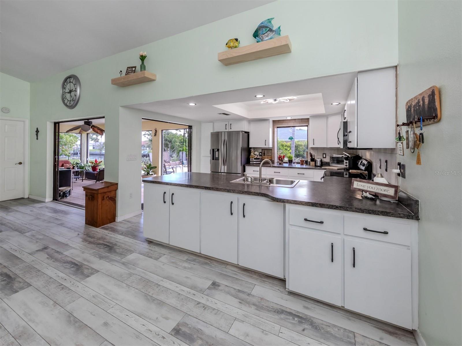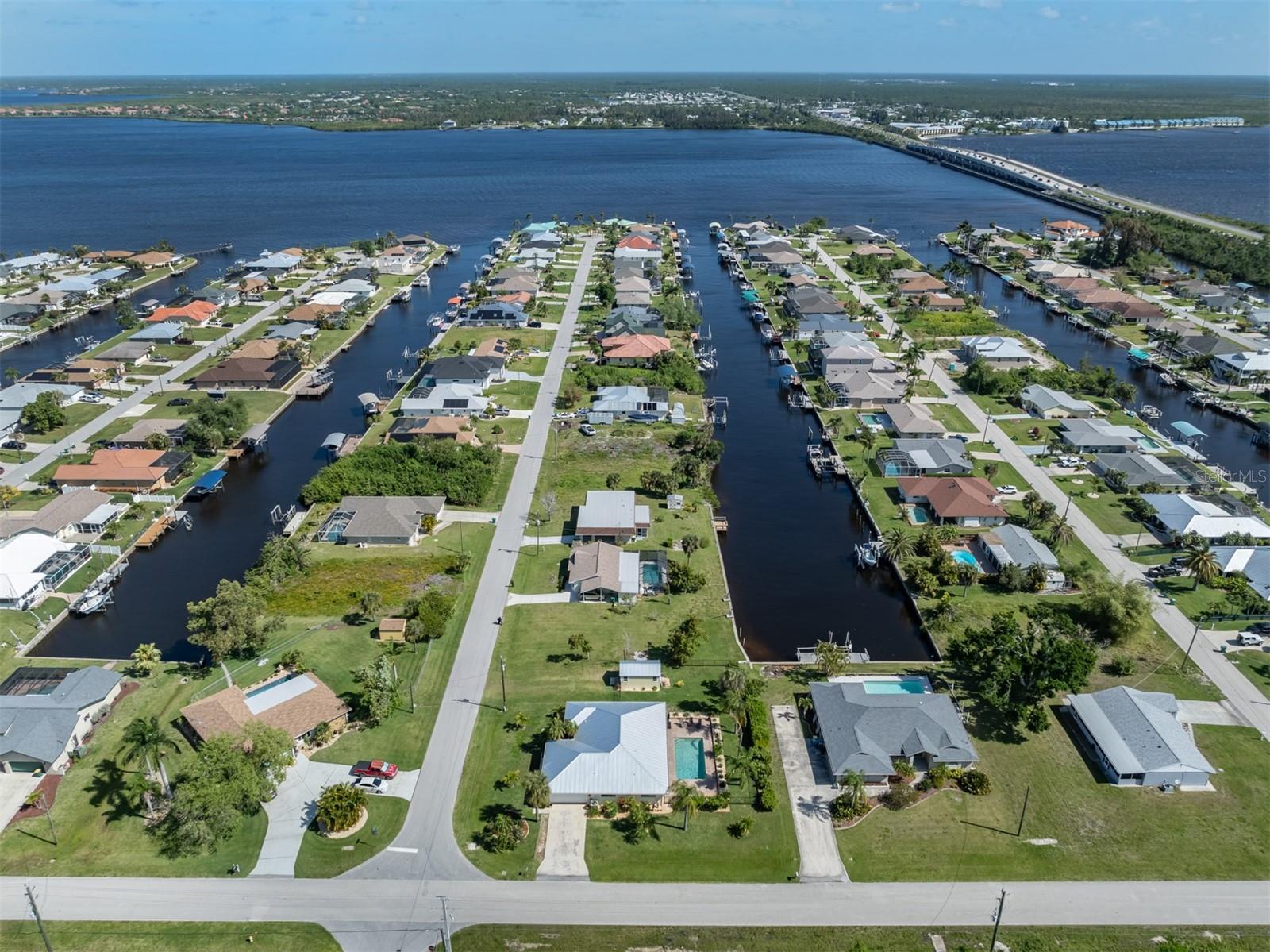 Welcome to your waterfront piece of Florida paradise! Located in the desirable boating community of Gulf Cove, this home is a water lover's dream. The canal-front property features an ideal split floor plan with three bedrooms, two and a half baths (including a pool bath), and vaulted ceilings throughout the open-concept living/dining area, ensuring the perfect space for entertaining. Situated on a large corner lot, the property also boasts an additional 40 feet of width on the left side, providing ample space for parking your boat, water toys, RV, or for adding onto the existing property. Currently, a large matching shed occupies this space, which can be utilized or converted according to your needs. Upon arrival, you'll notice fresh exterior paint, new landscaping, and a new metal roof (installed in 2022), along with a matching metal roof and paint on the workshop/shed. Recent upgrades include interior paint, landscaping and lighting around the pool area, a wrought iron-fenced backyard, a resurfaced pool, a brick-paver pool deck, an outdoor electrical hookup for an RV, luxury waterproof laminate flooring, newer stainless steel appliances, and removal of popcorn ceilings from the primary bedroom and main living areas. New owners can take advantage of the Gulf Cove private community boat ramp located just a couple of streets over, as well as the waterfront community park, playground, and pavilion. The Homeowners Association (HOA) is optional, with an annual fee of $75 for use of the boat ramp or other Gulf Cove amenities. This home is truly a peaceful tropical oasis that would make for a fantastic full-time or part-time residence.