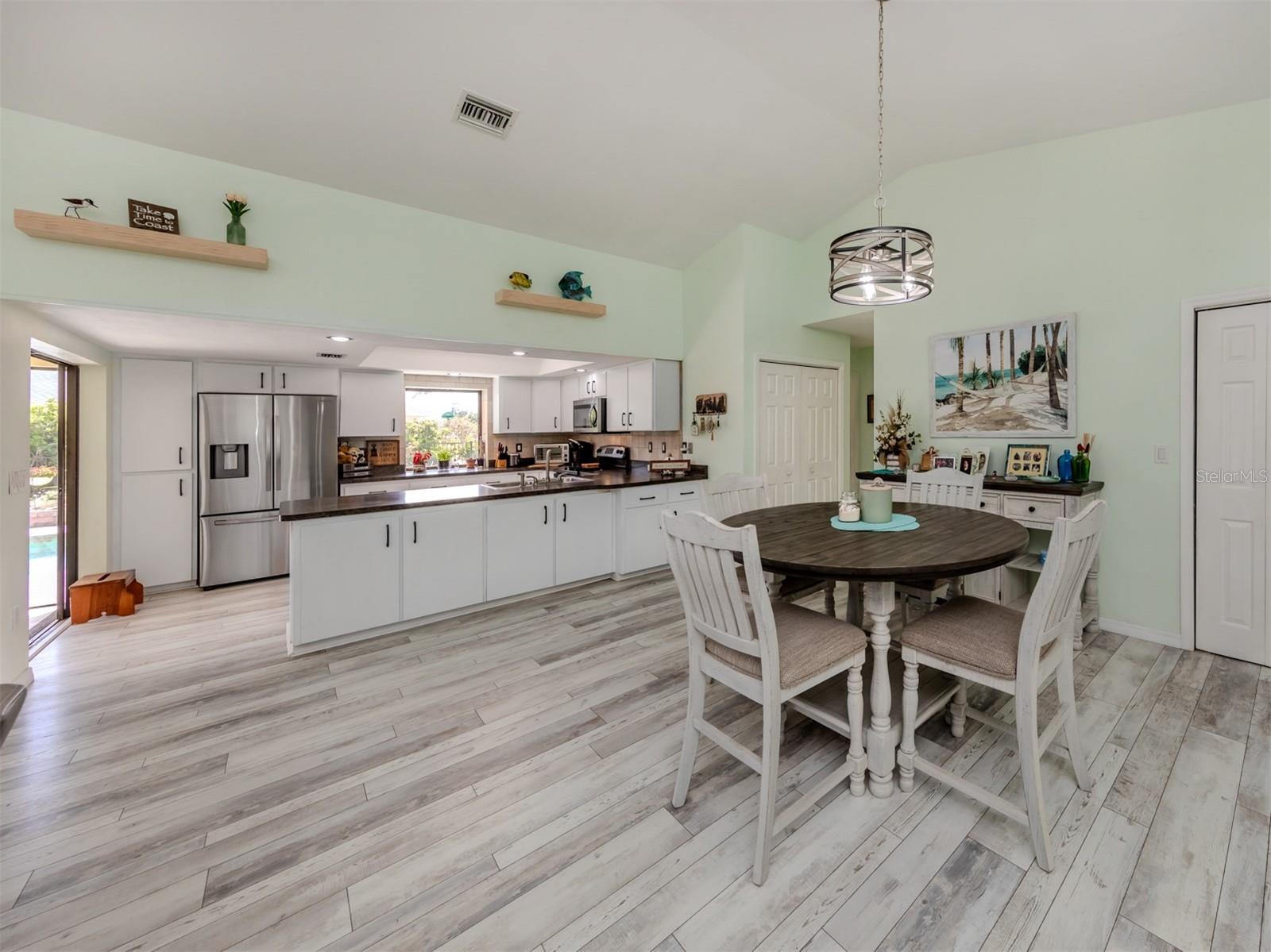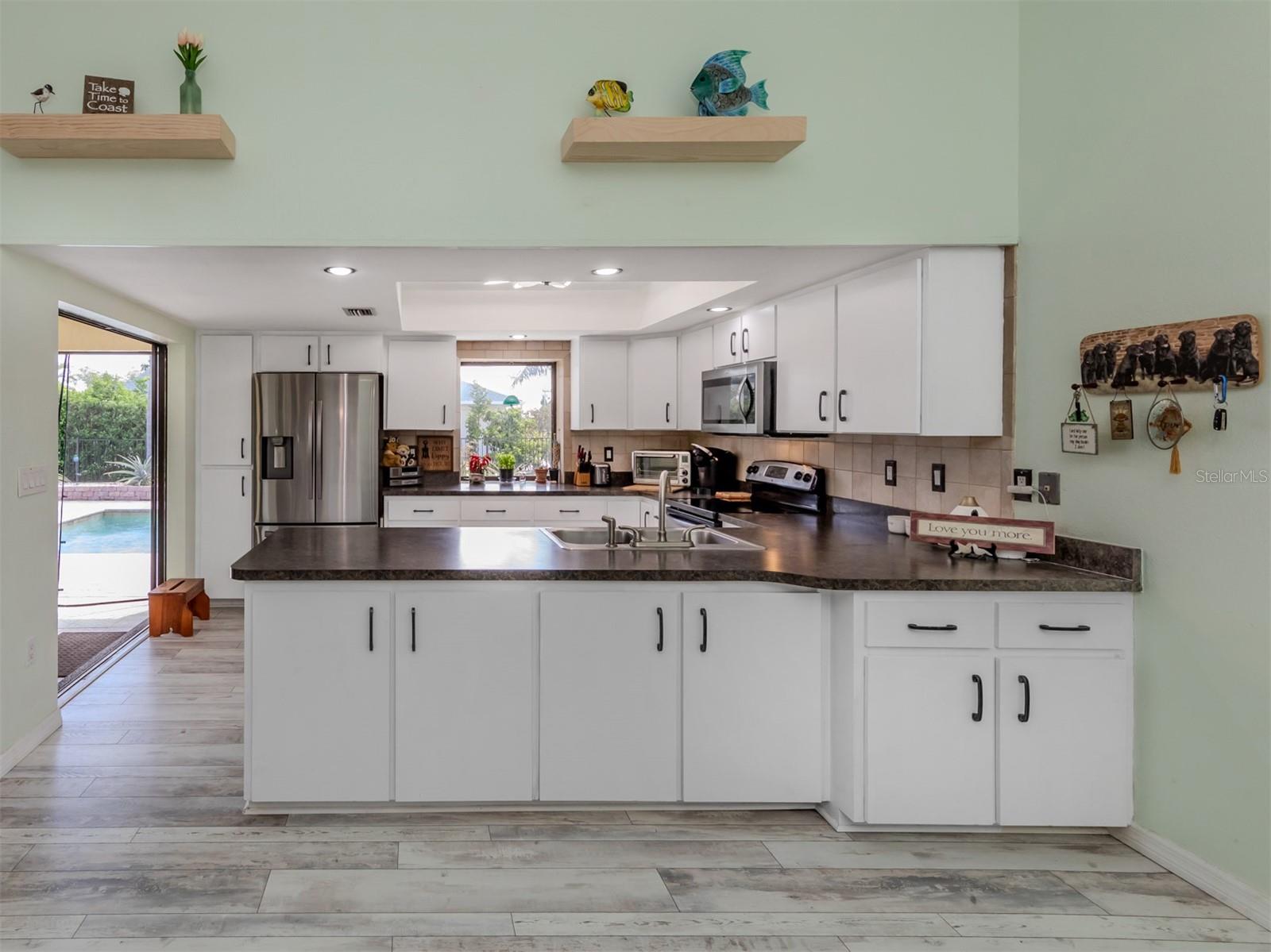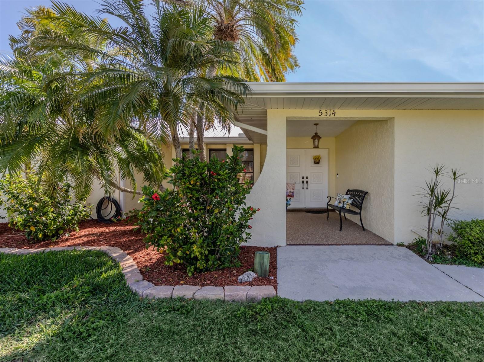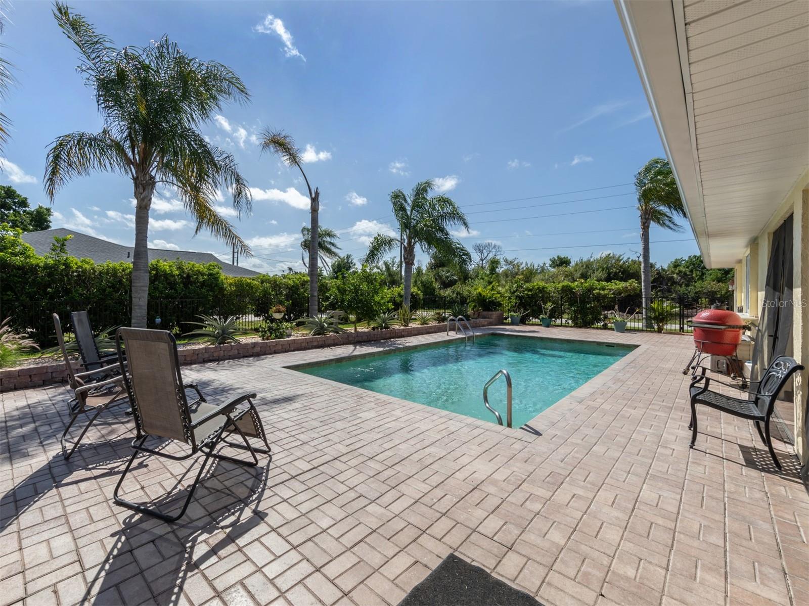 Welcome to your waterfront piece of Florida paradise! Located in the desirable boating community of Gulf Cove, this home is a water lover's dream. The canal-front property features an ideal split floor plan with three bedrooms, two and a half baths (including a pool bath), and vaulted ceilings throughout the open-concept living/dining area, ensuring the perfect space for entertaining. Situated on a large corner lot, the property also boasts an additional 40 feet of width on the left side, providing ample space for parking your boat, water toys, RV, or for adding onto the existing property. Currently, a large matching shed occupies this space, which can be utilized or converted according to your needs. Upon arrival, you'll notice fresh exterior paint, new landscaping, and a new metal roof (installed in 2022), along with a matching metal roof and paint on the workshop/shed. Recent upgrades include interior paint, landscaping and lighting around the pool area, a wrought iron-fenced backyard, a resurfaced pool, a brick-paver pool deck, an outdoor electrical hookup for an RV, luxury waterproof laminate flooring, newer stainless steel appliances, and removal of popcorn ceilings from the primary bedroom and main living areas. New owners can take advantage of the Gulf Cove private community boat ramp located just a couple of streets over, as well as the waterfront community park, playground, and pavilion. The Homeowners Association (HOA) is optional, with an annual fee of $75 for use of the boat ramp or other Gulf Cove amenities. This home is truly a peaceful tropical oasis that would make for a fantastic full-time or part-time residence.