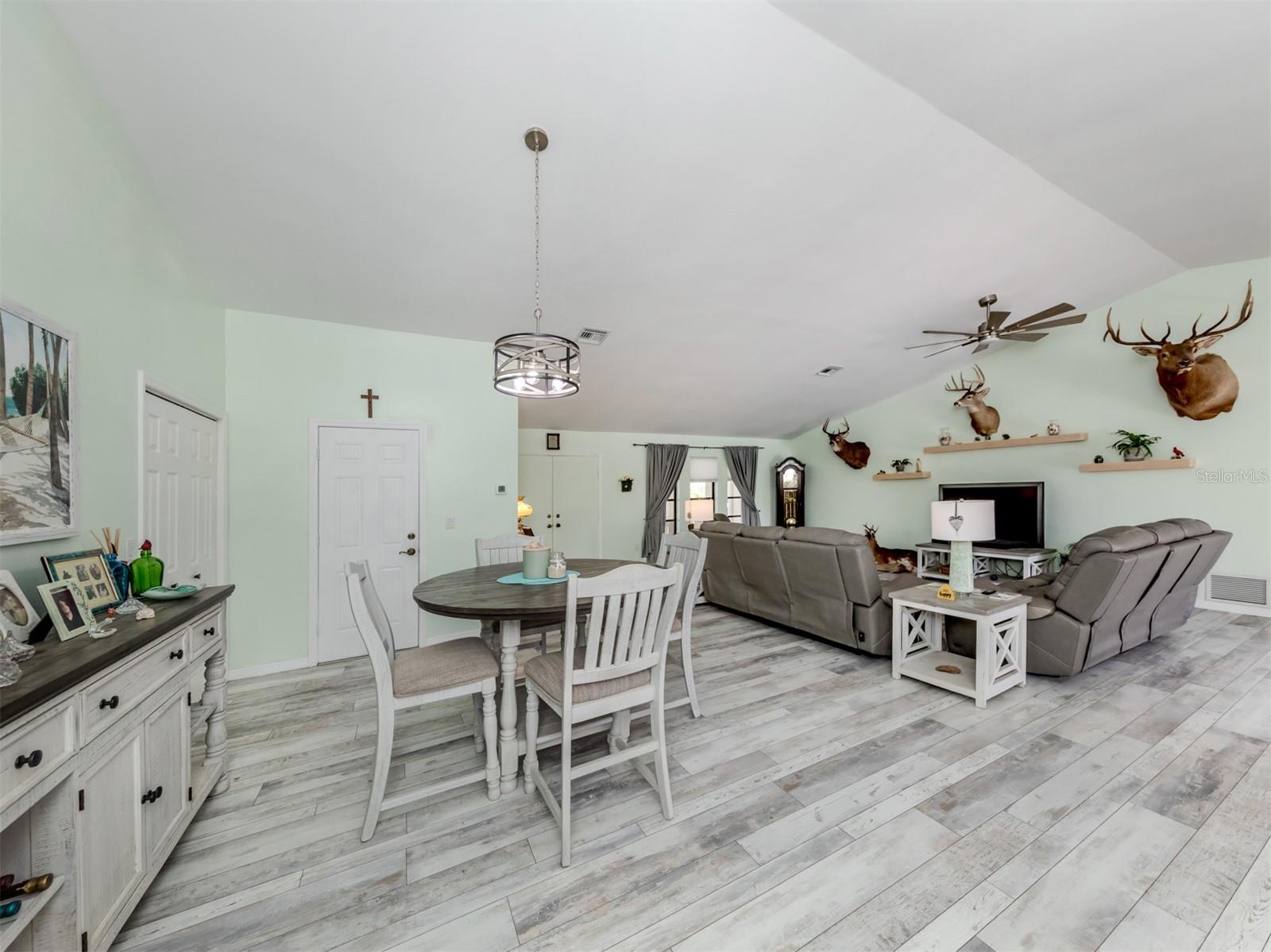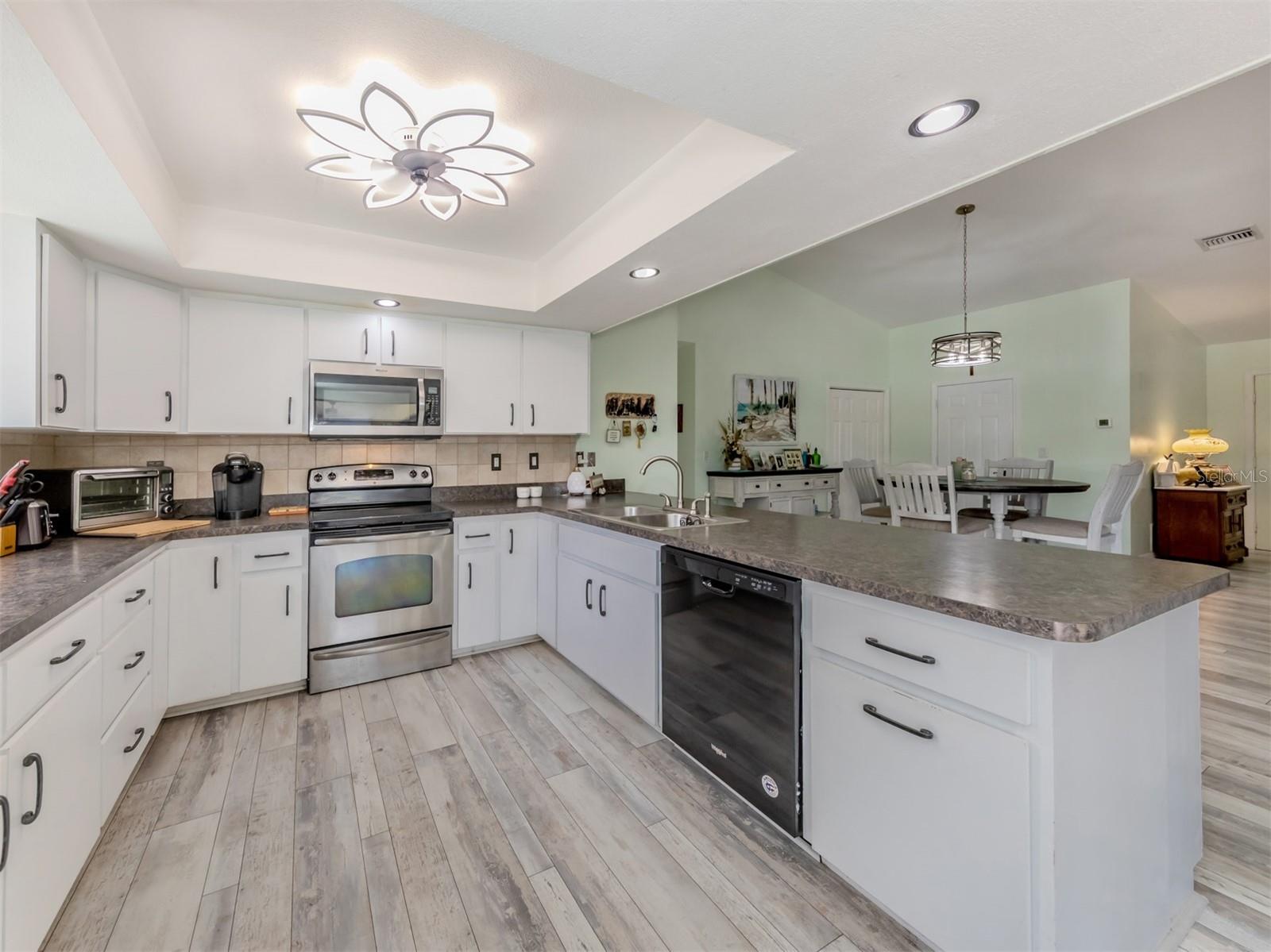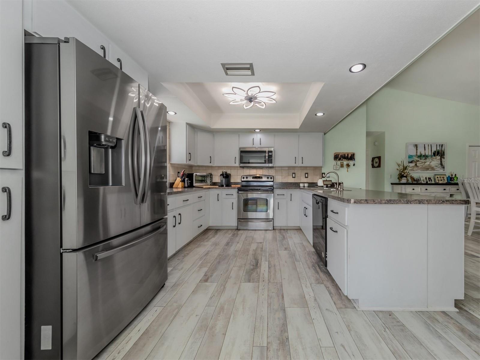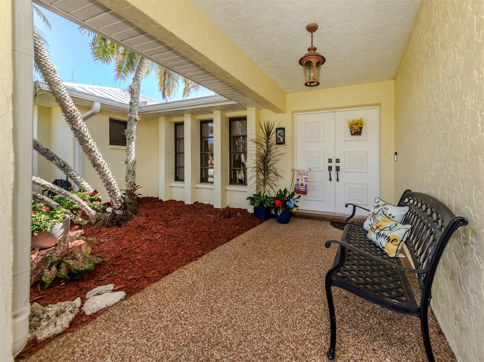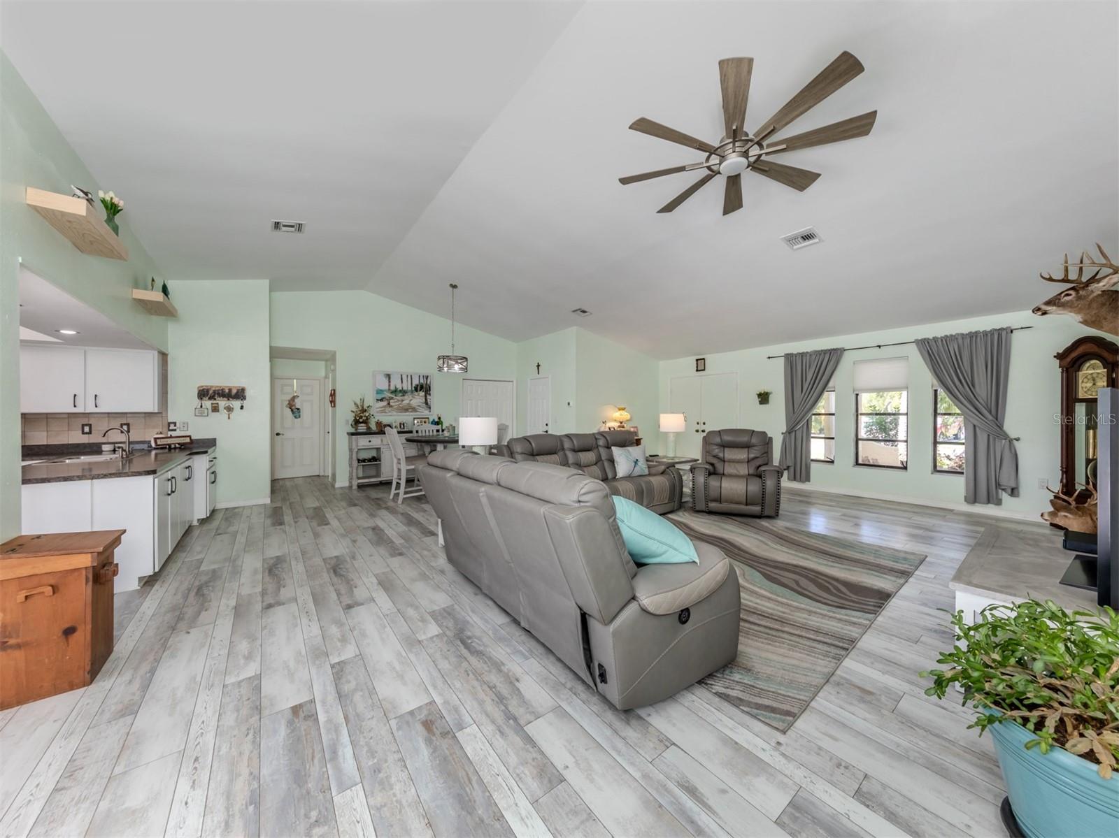 Welcome to your waterfront piece of Florida paradise! Located in the desirable boating community of Gulf Cove, this home is a water lover's dream. The canal-front property features an ideal split floor plan with three bedrooms, two and a half baths (including a pool bath), and vaulted ceilings throughout the open-concept living/dining area, ensuring the perfect space for entertaining. Situated on a large corner lot, the property also boasts an additional 40 feet of width on the left side, providing ample space for parking your boat, water toys, RV, or for adding onto the existing property. Currently, a large matching shed occupies this space, which can be utilized or converted according to your needs. Upon arrival, you'll notice fresh exterior paint, new landscaping, and a new metal roof (installed in 2022), along with a matching metal roof and paint on the workshop/shed. Recent upgrades include interior paint, landscaping and lighting around the pool area, a wrought iron-fenced backyard, a resurfaced pool, a brick-paver pool deck, an outdoor electrical hookup for an RV, luxury waterproof laminate flooring, newer stainless steel appliances, and removal of popcorn ceilings from the primary bedroom and main living areas. New owners can take advantage of the Gulf Cove private community boat ramp located just a couple of streets over, as well as the waterfront community park, playground, and pavilion. The Homeowners Association (HOA) is optional, with an annual fee of $75 for use of the boat ramp or other Gulf Cove amenities. This home is truly a peaceful tropical oasis that would make for a fantastic full-time or part-time residence.