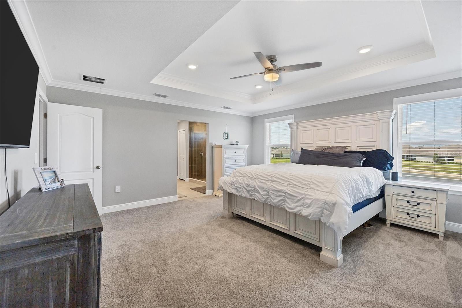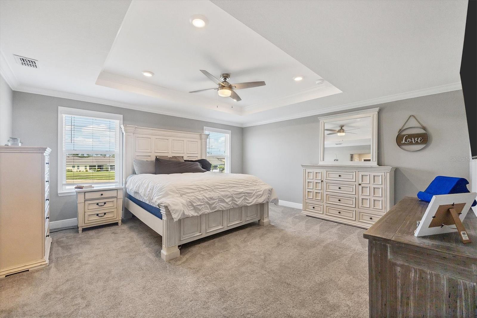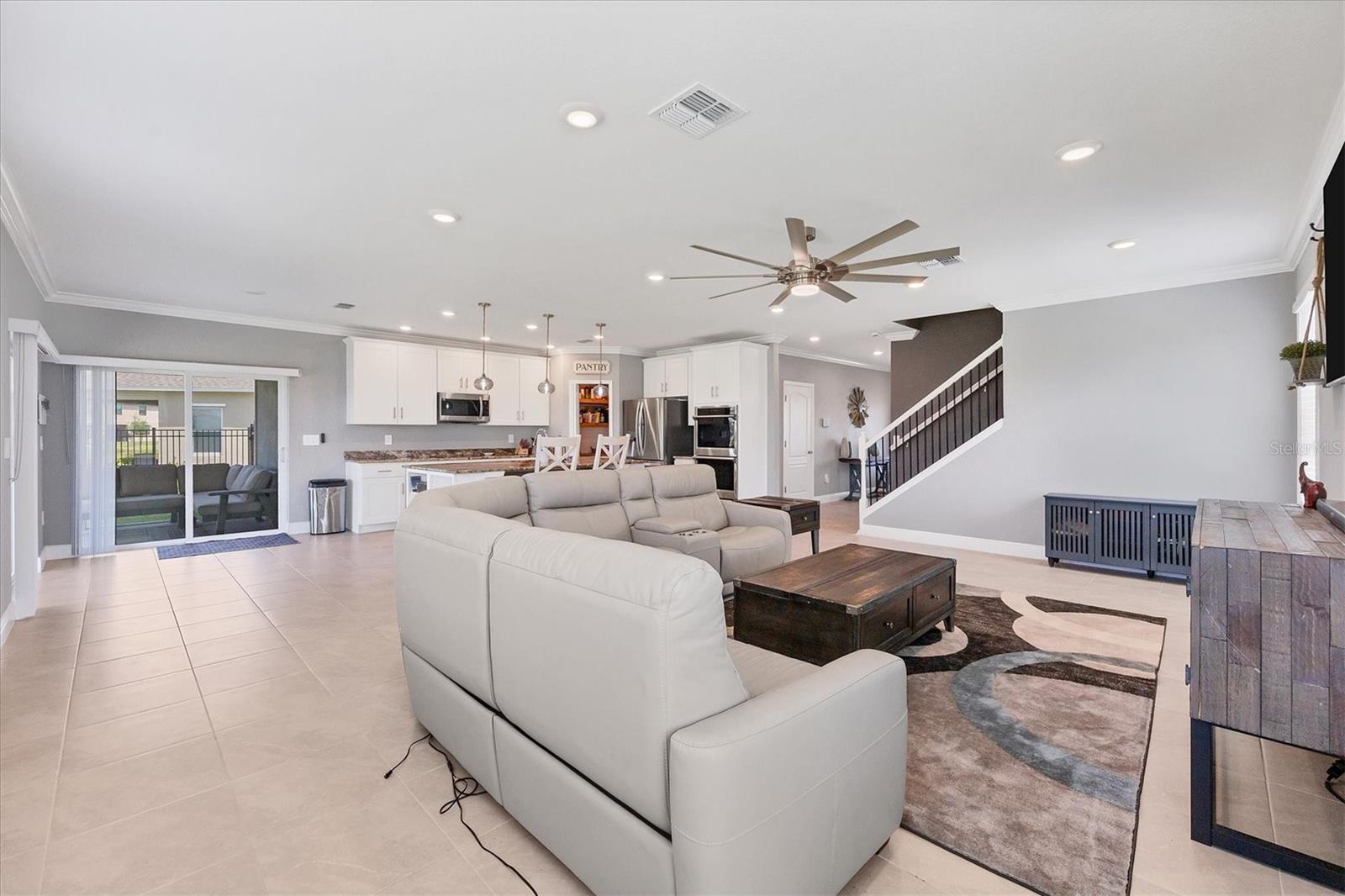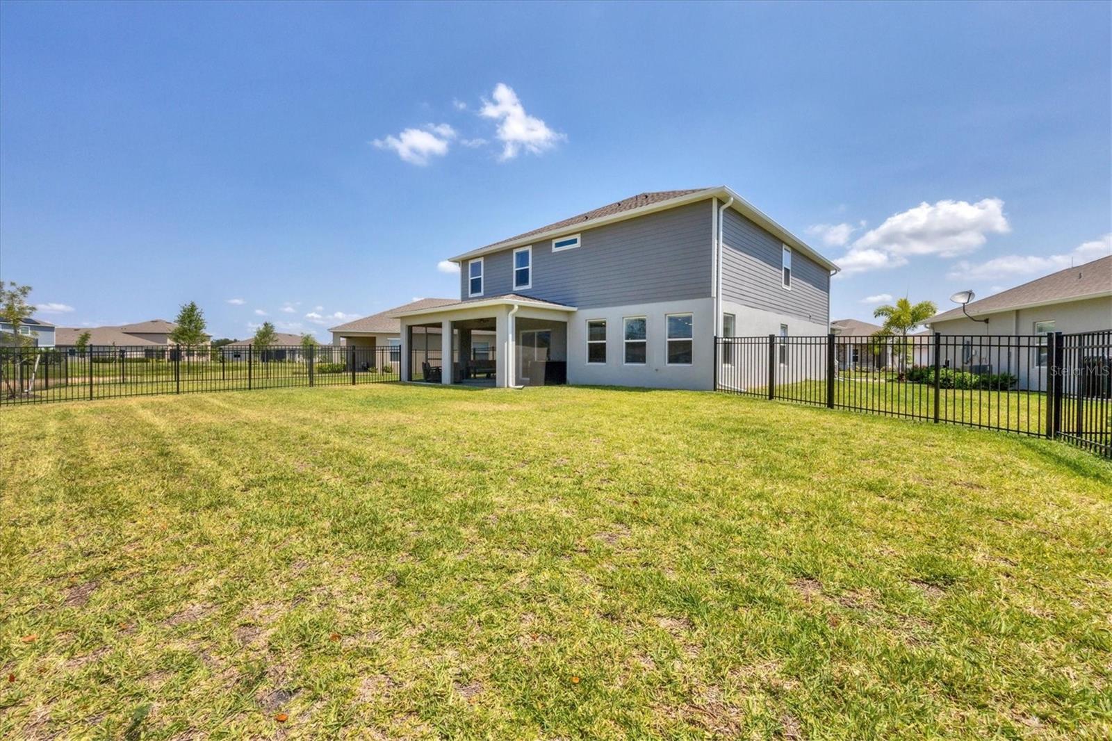 Welcome to your MAINTENANCE FREE dream lakefront retreat! This stunning two-story home boasts unparalleled views of the serene lake from its ample-sized lot, enclosed by elegant black iron fencing. Step out back to the extended wrap-around lanai, where you can enjoy panoramic views of the lake and lush surroundings. Gutters are installed for added convenience. The front door makes a grand entrance with its glass insert, inviting natural light to flood the foyer. Next step inside to discover a spacious layout featuring 4 bedrooms, 3 and a half bathrooms, and a 3 car tandem garage, ensuring ample space for vehicles and storage. Luxurious touches throughout enhance the home's appeal. Crown molding graces the living area downstairs, while the gourmet kitchen is a chef's delight with 42-inch cabinets, perfect for storing all your culinary essentials. The pantry is thoughtfully designed with wood shelves, adding both functionality and charm. The primary bedroom boasts a tray ceiling for added elegance. Prepare to indulge in the spa-like primary bathroom, featuring an extended shower with three heads for the ultimate relaxation experience. The open floor plan seamlessly connects the kitchen to the living area, creating an ideal space for entertaining guests or relaxing with family. Ascend the staircase with treads and a painted handrail, leading to the upper level where a laundry room with a new sink awaits for added convenience. Upstairs, you'll find a versatile bonus room and loft, providing additional living space for whatever your heart desires. Trim around the windows adds a touch of sophistication, complemented by LED lights in the ceiling for energy-efficient illumination, while double sinks in every full bathroom cater to convenience on those busy mornings. This exquisite home offers luxury living at its finest, combining style, comfort, and breathtaking views in one unbeatable package. Don't miss your chance to make this your own slice of paradise!
