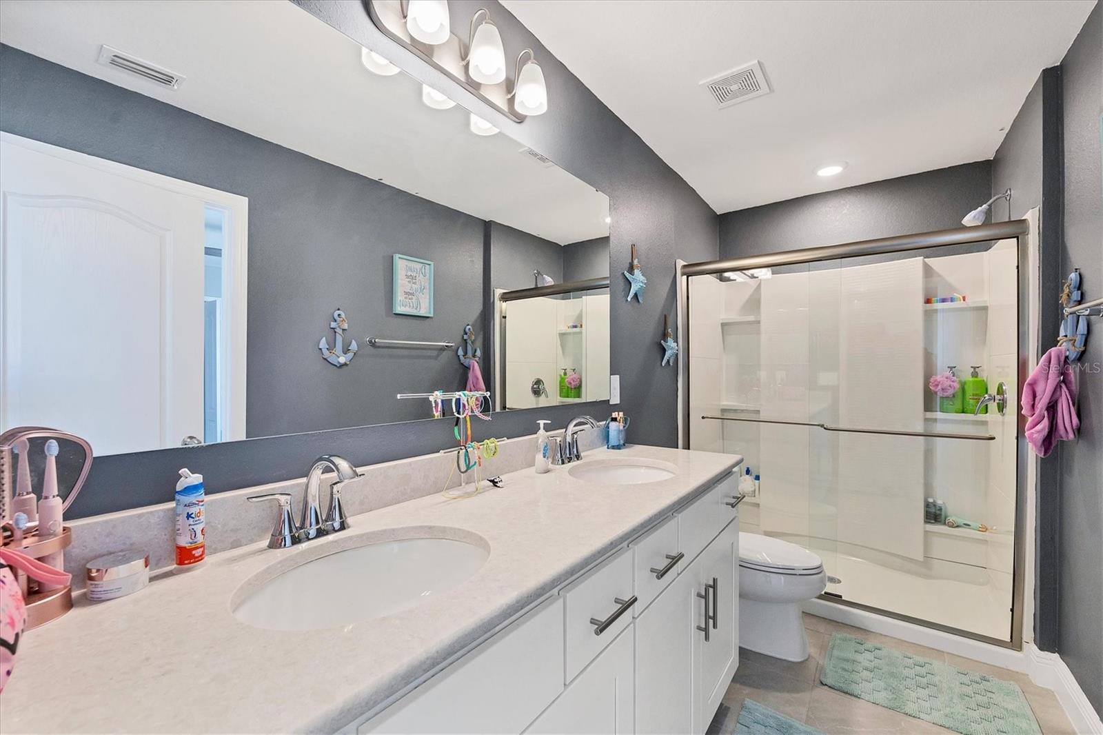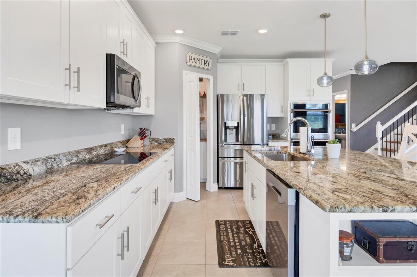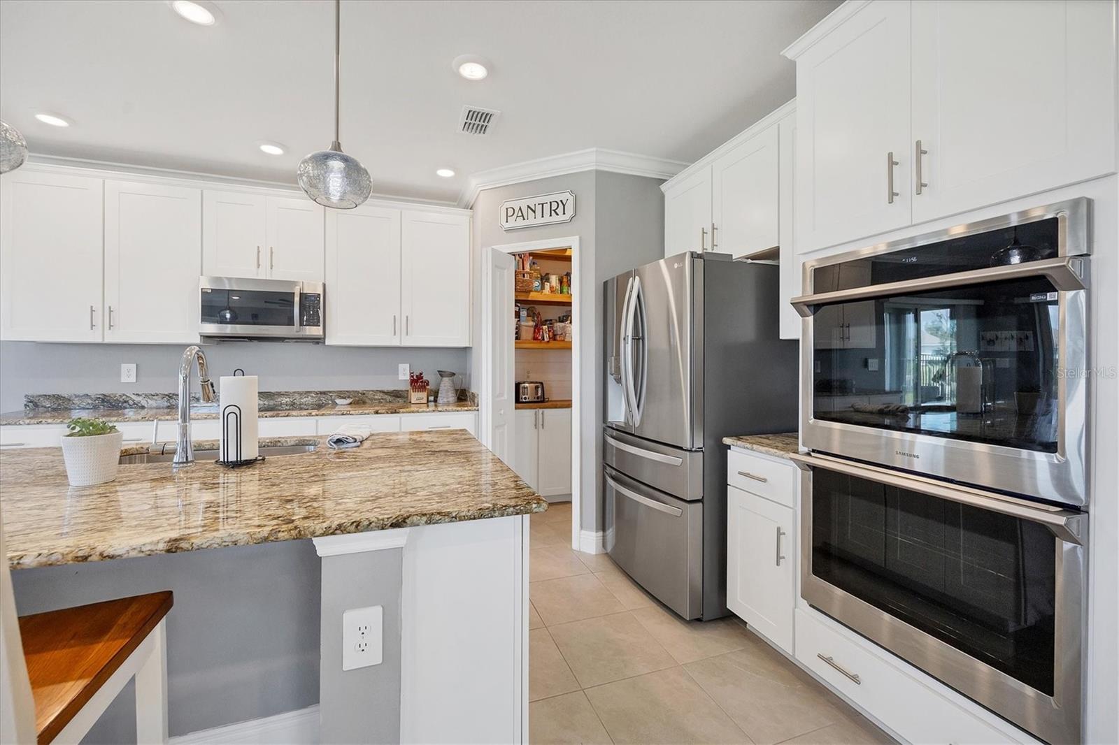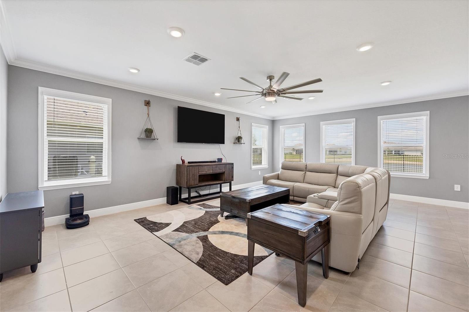 Welcome to your MAINTENANCE FREE dream lakefront retreat! This stunning two-story home boasts unparalleled views of the serene lake from its ample-sized lot, enclosed by elegant black iron fencing. Step out back to the extended wrap-around lanai, where you can enjoy panoramic views of the lake and lush surroundings. Gutters are installed for added convenience. The front door makes a grand entrance with its glass insert, inviting natural light to flood the foyer. Next step inside to discover a spacious layout featuring 4 bedrooms, 3 and a half bathrooms, and a 3 car tandem garage, ensuring ample space for vehicles and storage. Luxurious touches throughout enhance the home's appeal. Crown molding graces the living area downstairs, while the gourmet kitchen is a chef's delight with 42-inch cabinets, perfect for storing all your culinary essentials. The pantry is thoughtfully designed with wood shelves, adding both functionality and charm. The primary bedroom boasts a tray ceiling for added elegance. Prepare to indulge in the spa-like primary bathroom, featuring an extended shower with three heads for the ultimate relaxation experience. The open floor plan seamlessly connects the kitchen to the living area, creating an ideal space for entertaining guests or relaxing with family. Ascend the staircase with treads and a painted handrail, leading to the upper level where a laundry room with a new sink awaits for added convenience. Upstairs, you'll find a versatile bonus room and loft, providing additional living space for whatever your heart desires. Trim around the windows adds a touch of sophistication, complemented by LED lights in the ceiling for energy-efficient illumination, while double sinks in every full bathroom cater to convenience on those busy mornings. This exquisite home offers luxury living at its finest, combining style, comfort, and breathtaking views in one unbeatable package. Don't miss your chance to make this your own slice of paradise!