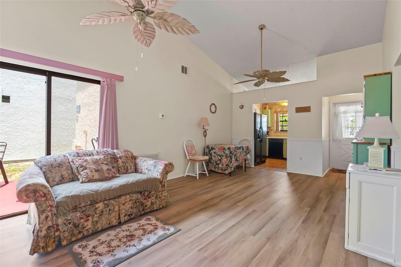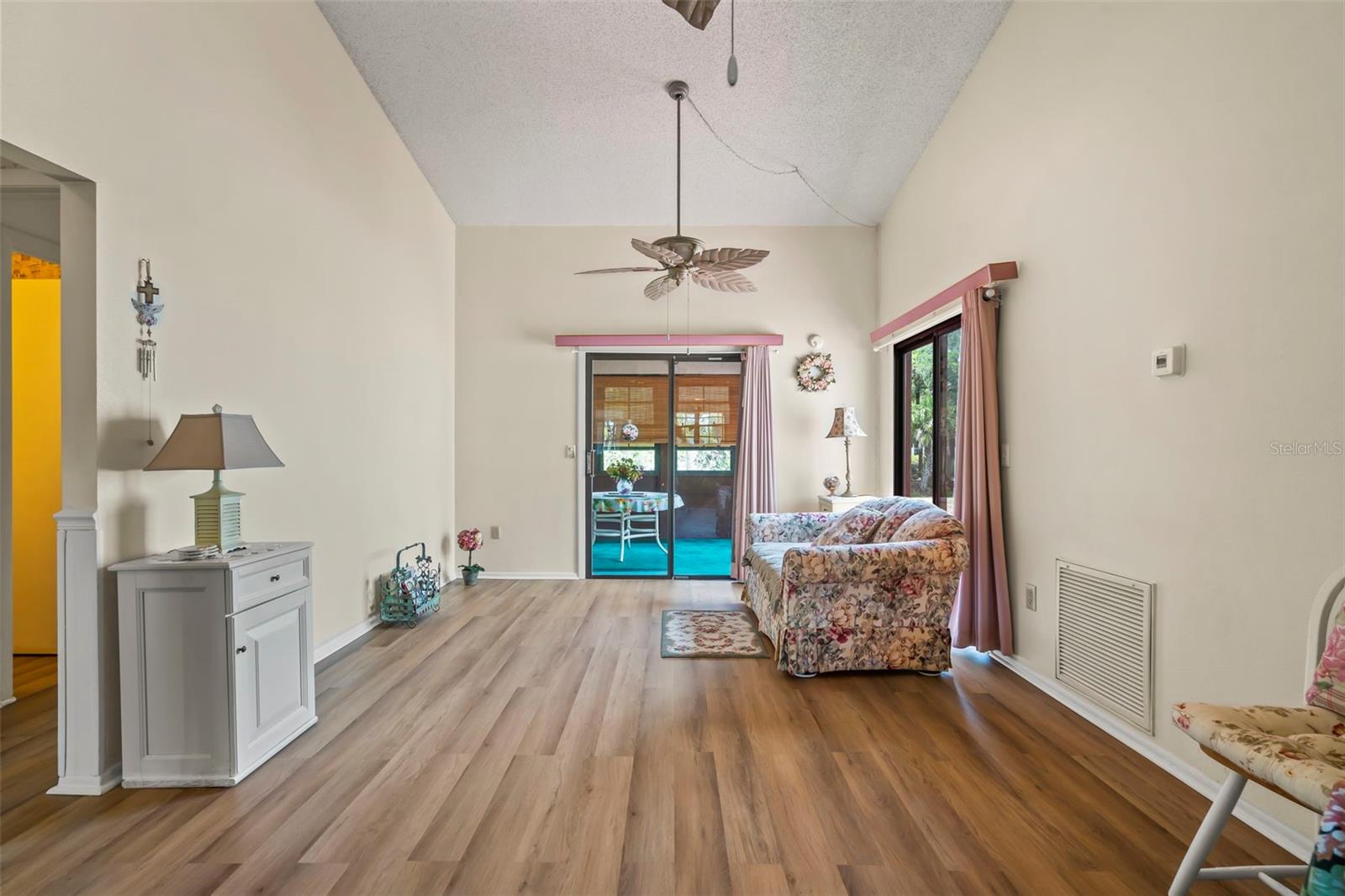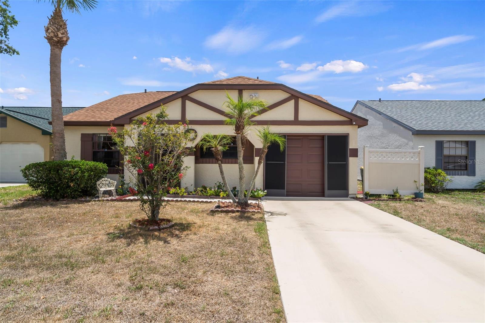 Welcome to your charming Florida retreat! This delightful 2-bedroom, 2-bathroom home boasts 825 square feet of comfort and convenience, complete with a 1-car attached garage. Step inside to discover newer waterproof laminate flooring gracing the main living areas, offering both style and durability, while carpeting in the bedrooms provides cozy comfort underfoot. The kitchen is a chef’s delight, featuring ample cabinets to accommodate all your culinary essentials. The primary bedroom offers a serene retreat with its own ensuite bathroom and convenient access to the screened-in lanai, where you can unwind and soak in the breathtaking Florida sunsets. Situated on a freshwater canal, this home presents an opportunity to add your own private dock, allowing you to fully enjoy waterfront living at its finest. Plus, there is an oversized stone patio for you to enjoy. With a new roof, newer AC, and water heater, peace of mind comes standard in this meticulously maintained abode. Nestled within the Oak Hollow community, you'll relish in the low HOA fees, which grant access to an array of top-notch amenities. Spend your days lounging by the heated pool, perfecting your serve on the tennis or pickleball courts, or enjoying friendly competition in the horseshoe area. The clubhouse offers a wealth of entertainment options, including pool tables, a gym, and event space for community gatherings. Embrace the vibrant community spirit with plentiful neighborhood events and easy access to nearby restaurants and shops. Don't miss out on the opportunity to make this serene haven your own—schedule your showing today and start living the Florida lifestyle you've always dreamed of!