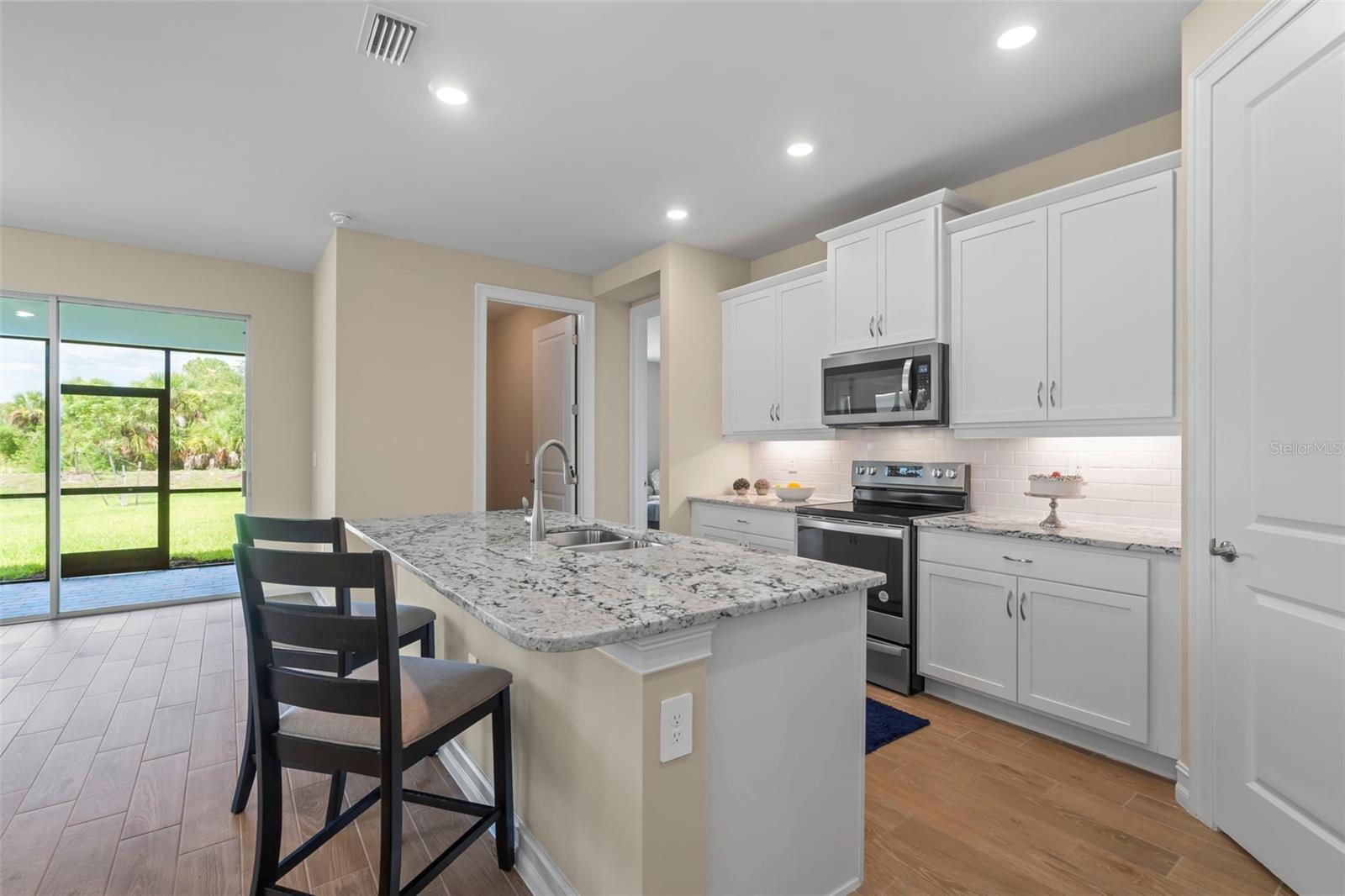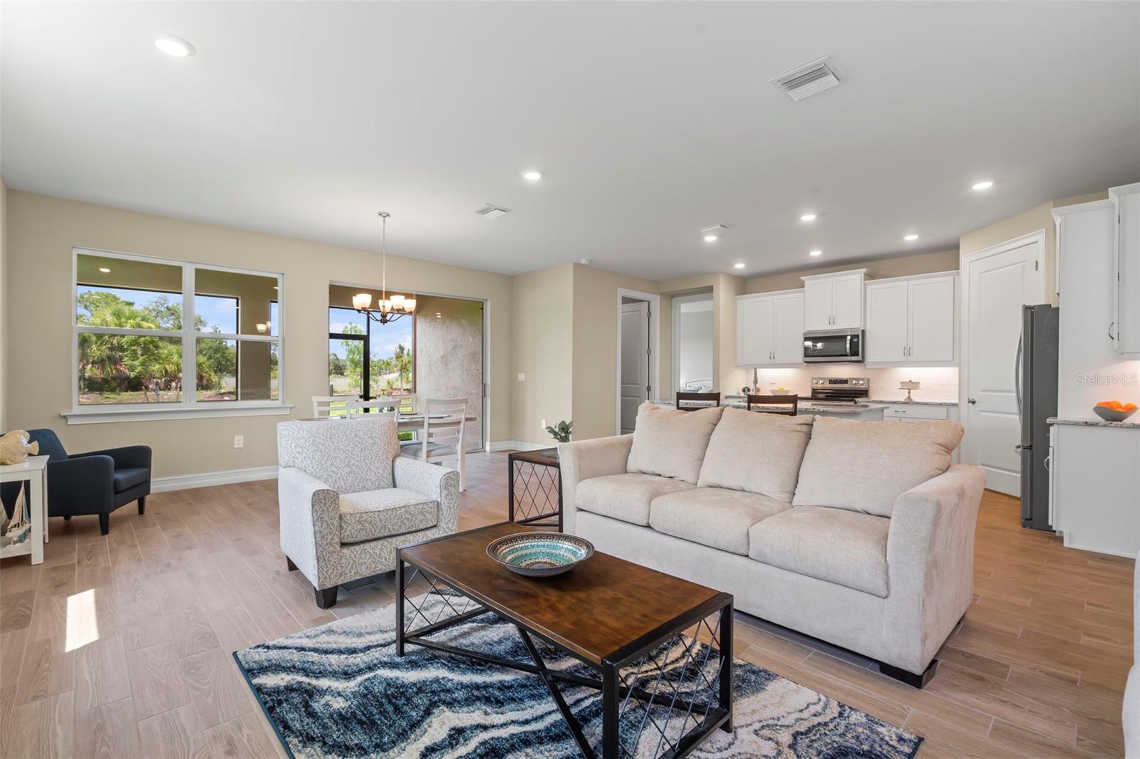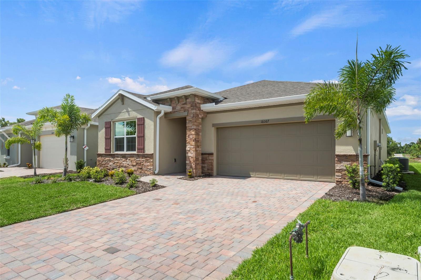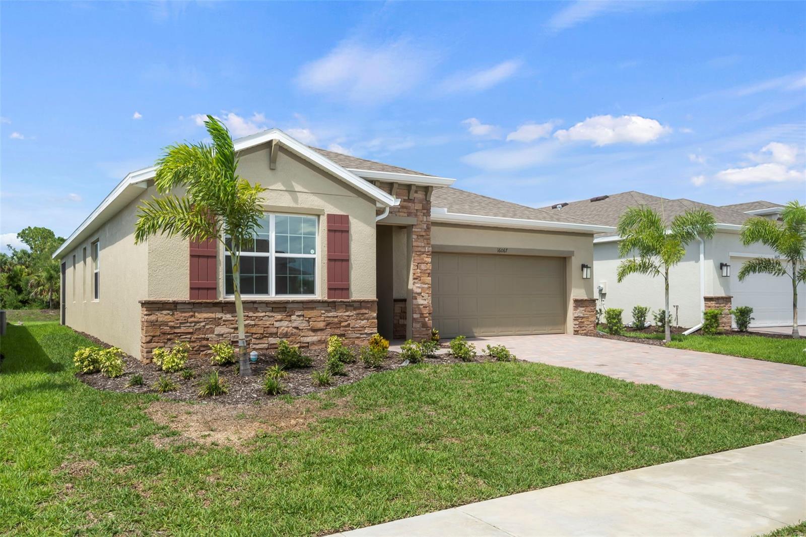 Agent on site 7 days a week 10am -4pm. If agent not available please call number on sign. Discover the charm of our highly sought-after Clifton one-story home design. This thoughtfully crafted layout maximizes living space with an open-concept kitchen overlooking a spacious great room and dining area. This home has been upgraded with wood-look plank tiles through out. Sliding glass doors flood the living area with natural light and lead to a paved, covered lanai, perfect for enjoying beautiful sunrises over the lake. The well-appointed kitchen boasts stunning stone countertops, a central island with stool seating, 48" cabinets with under-cabinet lighting, and modern stainless steel appliances, including a fridge, stove, microwave, dishwasher, and sink disposal. The convenient walk-in corner pantry offers ample storage. The primary bedroom, situated at the back of the house for added privacy, features an en suite bathroom with a double vanity and two large walk-in closets, providing substantial storage space. Two guest bedrooms are located at the front of the home, sharing a full-size bath, making it ideal for families or visitors. The laundry room comes equipped with washer and dryer and the home networking hub is centrally located for exceptional range. The additional closets throughout the home ensure plenty of storage space. Whether you're snowbirds, starting a new family, or downsizing, this excellent floorplan suits various lifestyles. Experience the perfect blend of style and functionality in this exceptional property. The Cove in West Port is a gated community featuring a heated resort style pool, club house with social room, game room, fitness center and activity room. Outside of the clubhouse you will find 4 pickleball courts with lights and 2 dog parks. The Cove is the only community in West Port that is truly gates with private clubhouse and pool! Decorated model and furniture/cosmetics inclusions will not come with the purchase of this listing.