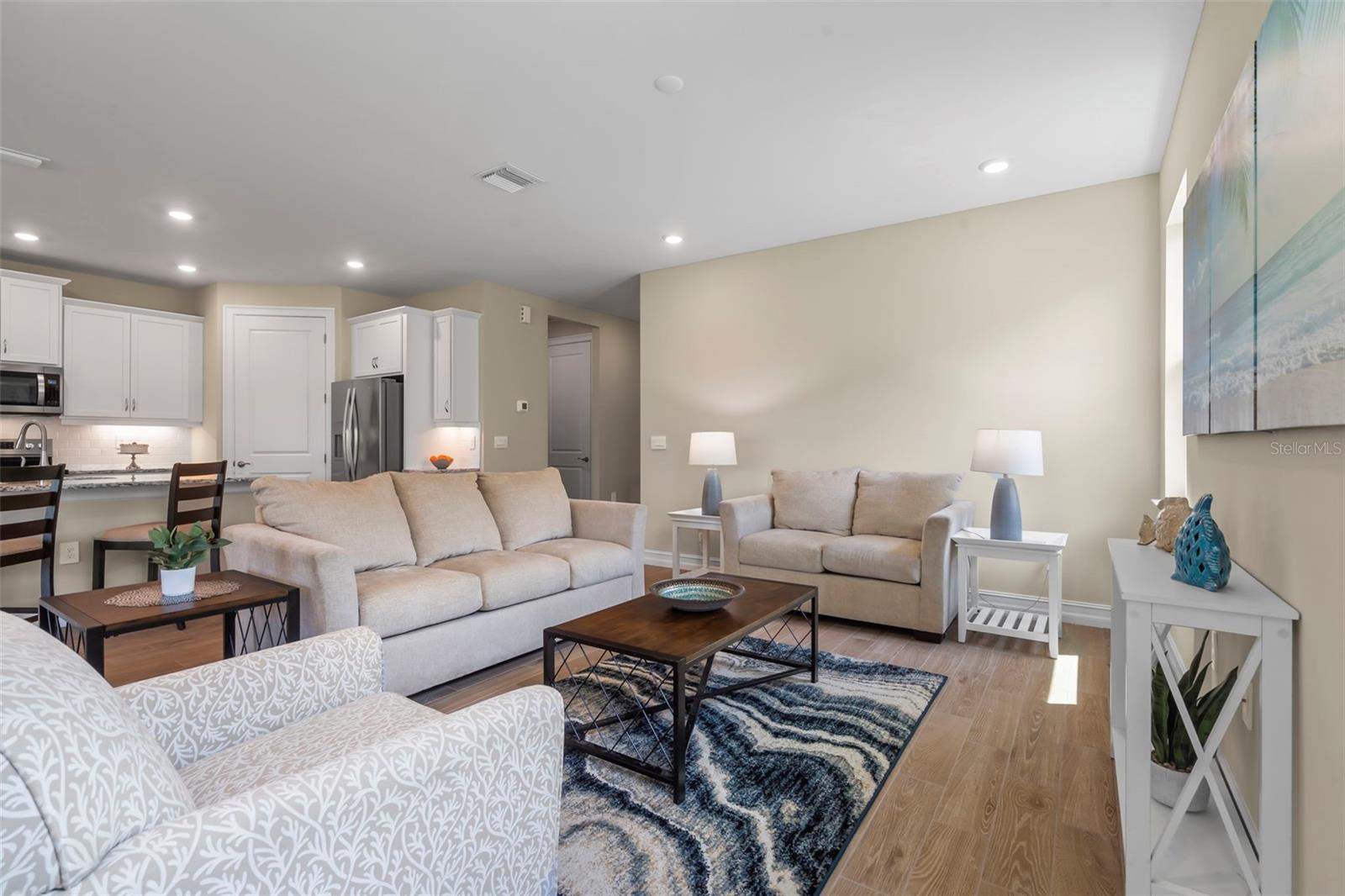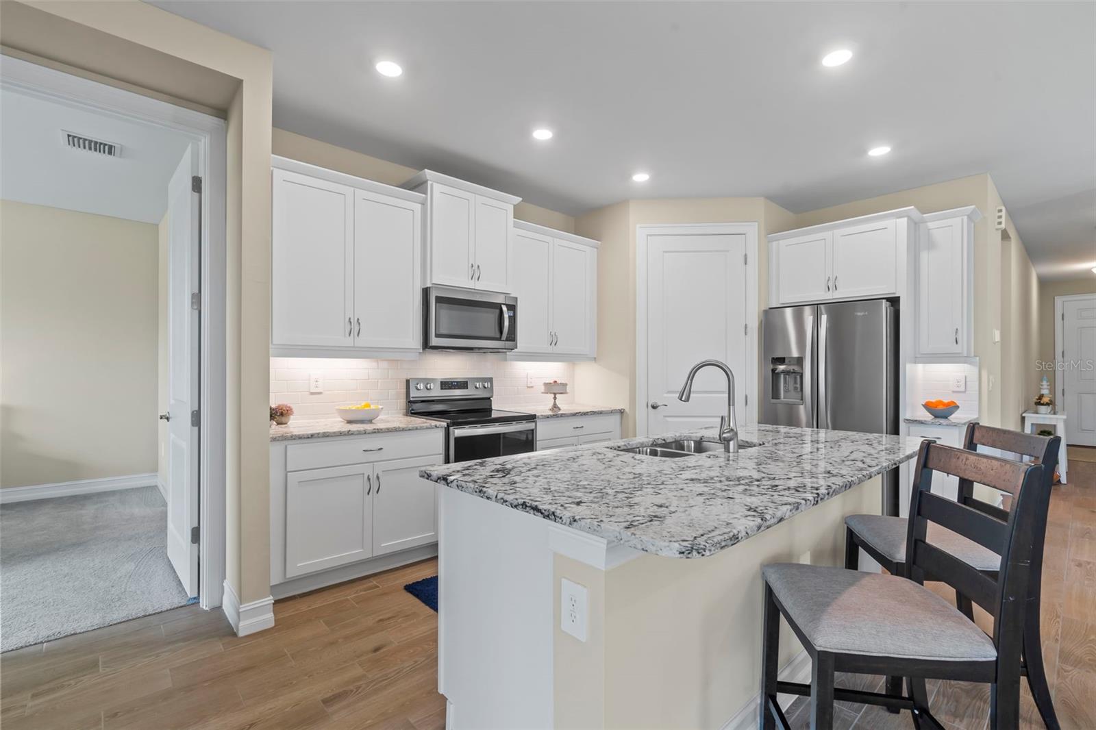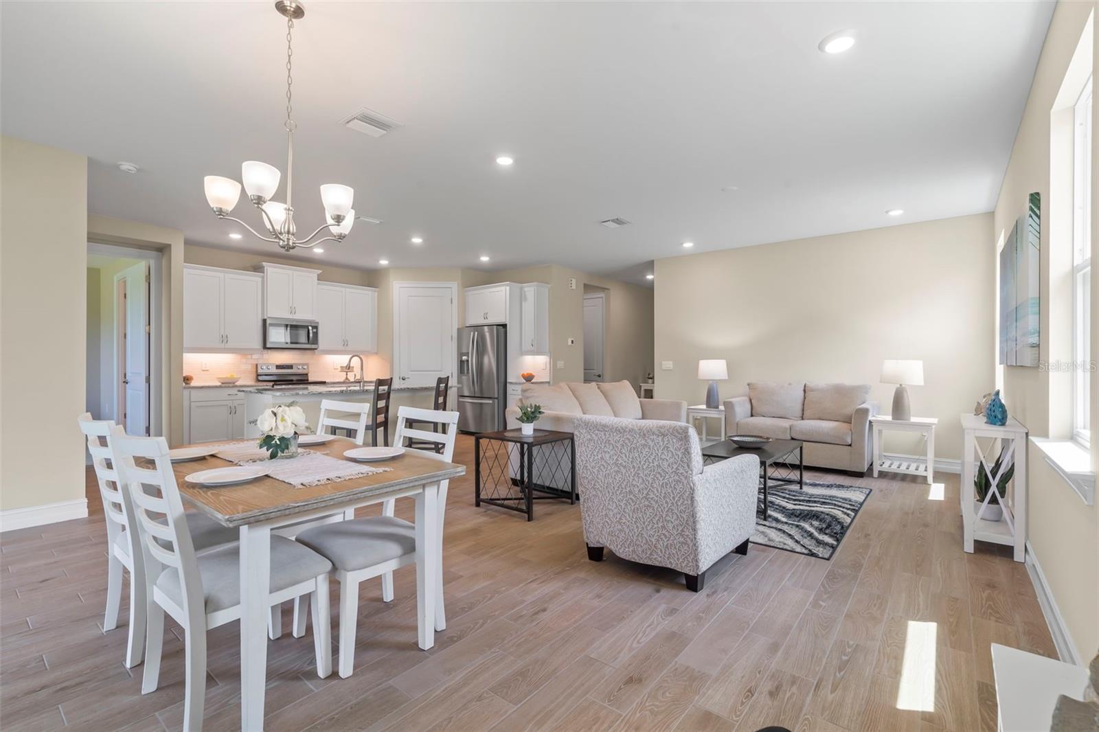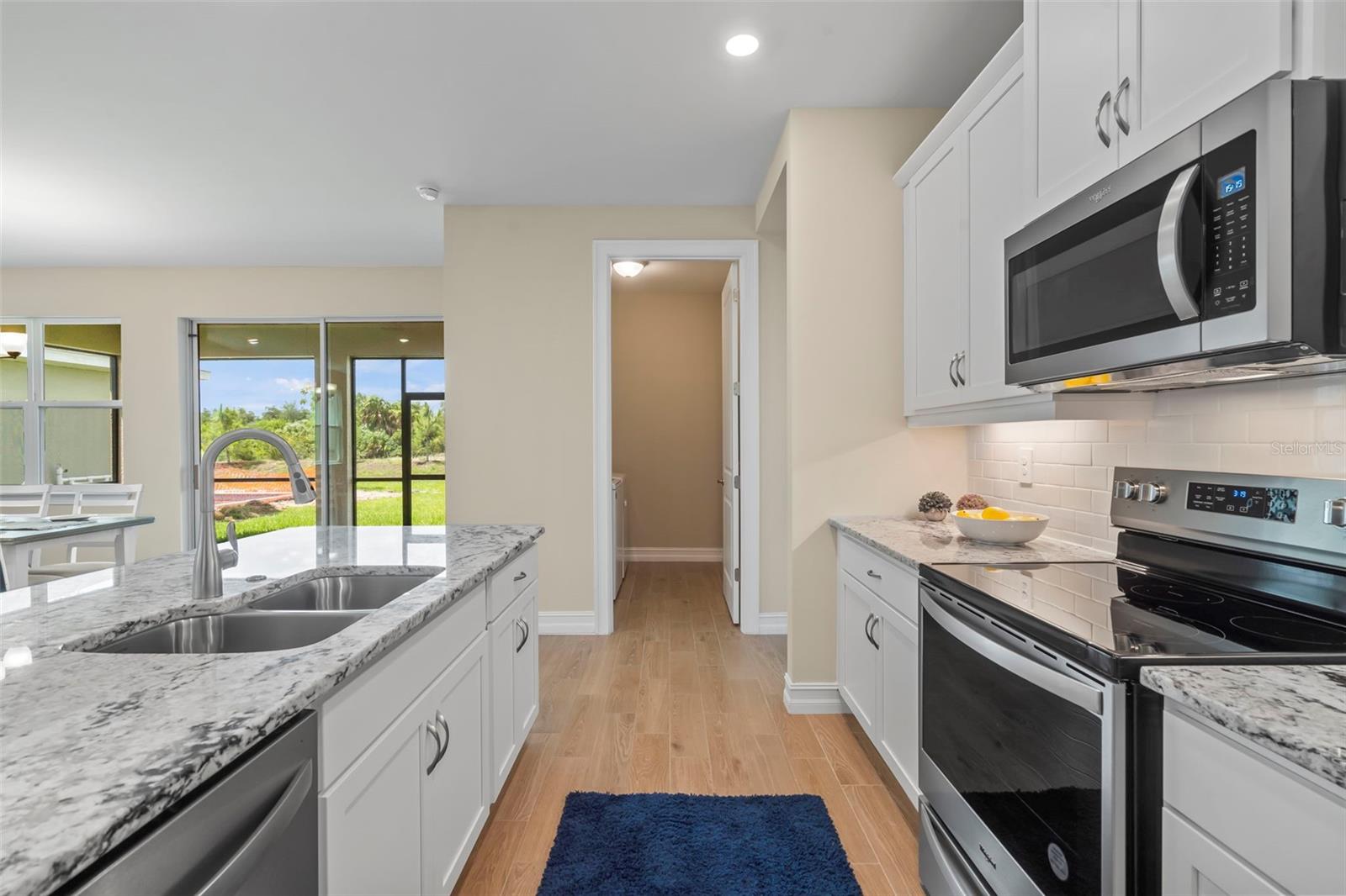 Agent on site 7 days a week 10am -4pm. If agent not available please call number on sign. Discover the charm of our highly sought-after Clifton one-story home design. This thoughtfully crafted layout maximizes living space with an open-concept kitchen overlooking a spacious great room and dining area. This home has been upgraded with wood-look plank tiles through out. Sliding glass doors flood the living area with natural light and lead to a paved, covered lanai, perfect for enjoying beautiful sunrises over the lake. The well-appointed kitchen boasts stunning stone countertops, a central island with stool seating, 48" cabinets with under-cabinet lighting, and modern stainless steel appliances, including a fridge, stove, microwave, dishwasher, and sink disposal. The convenient walk-in corner pantry offers ample storage. The primary bedroom, situated at the back of the house for added privacy, features an en suite bathroom with a double vanity and two large walk-in closets, providing substantial storage space. Two guest bedrooms are located at the front of the home, sharing a full-size bath, making it ideal for families or visitors. The laundry room comes equipped with washer and dryer and the home networking hub is centrally located for exceptional range. The additional closets throughout the home ensure plenty of storage space. Whether you're snowbirds, starting a new family, or downsizing, this excellent floorplan suits various lifestyles. Experience the perfect blend of style and functionality in this exceptional property. The Cove in West Port is a gated community featuring a heated resort style pool, club house with social room, game room, fitness center and activity room. Outside of the clubhouse you will find 4 pickleball courts with lights and 2 dog parks. The Cove is the only community in West Port that is truly gates with private clubhouse and pool! Decorated model and furniture/cosmetics inclusions will not come with the purchase of this listing.