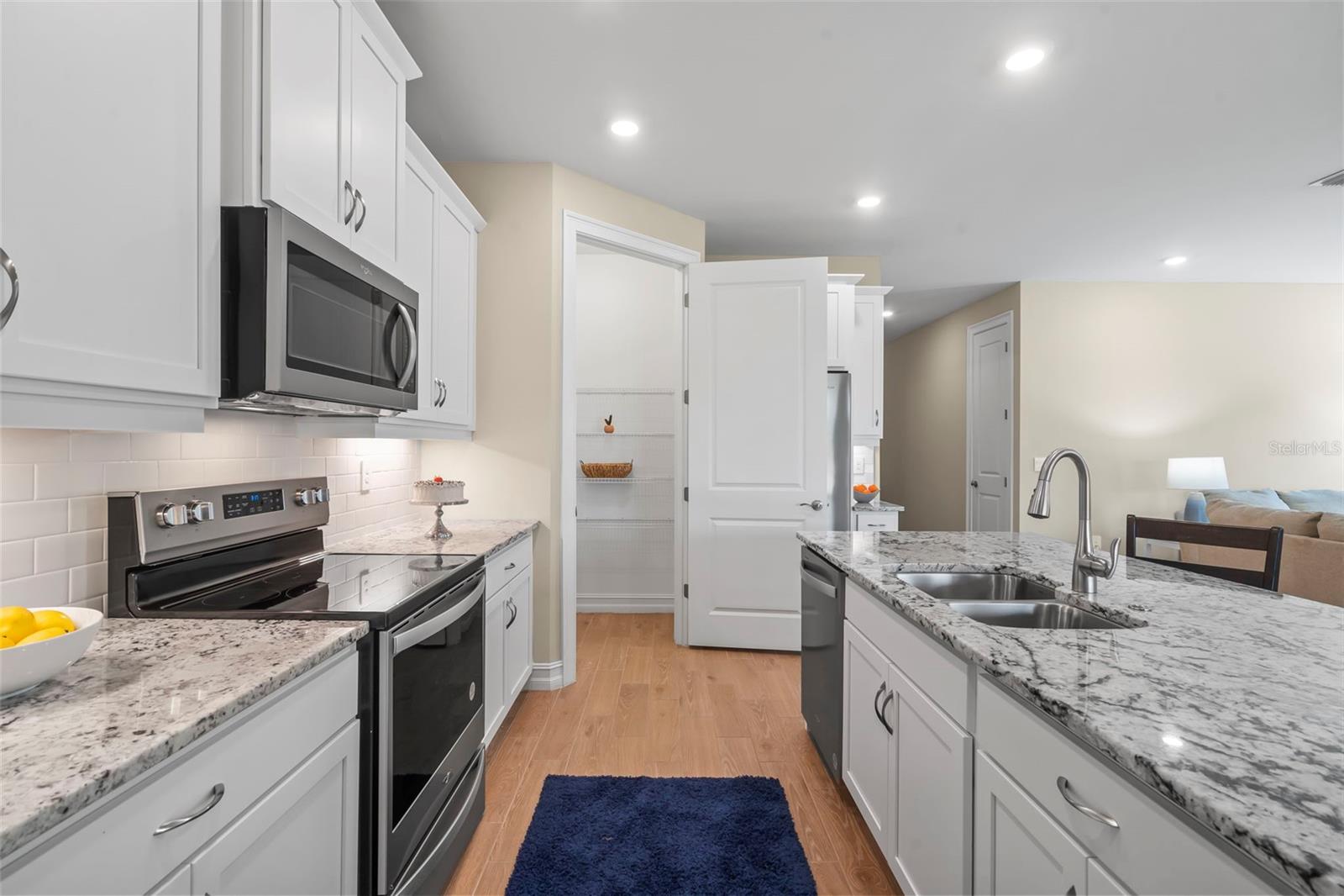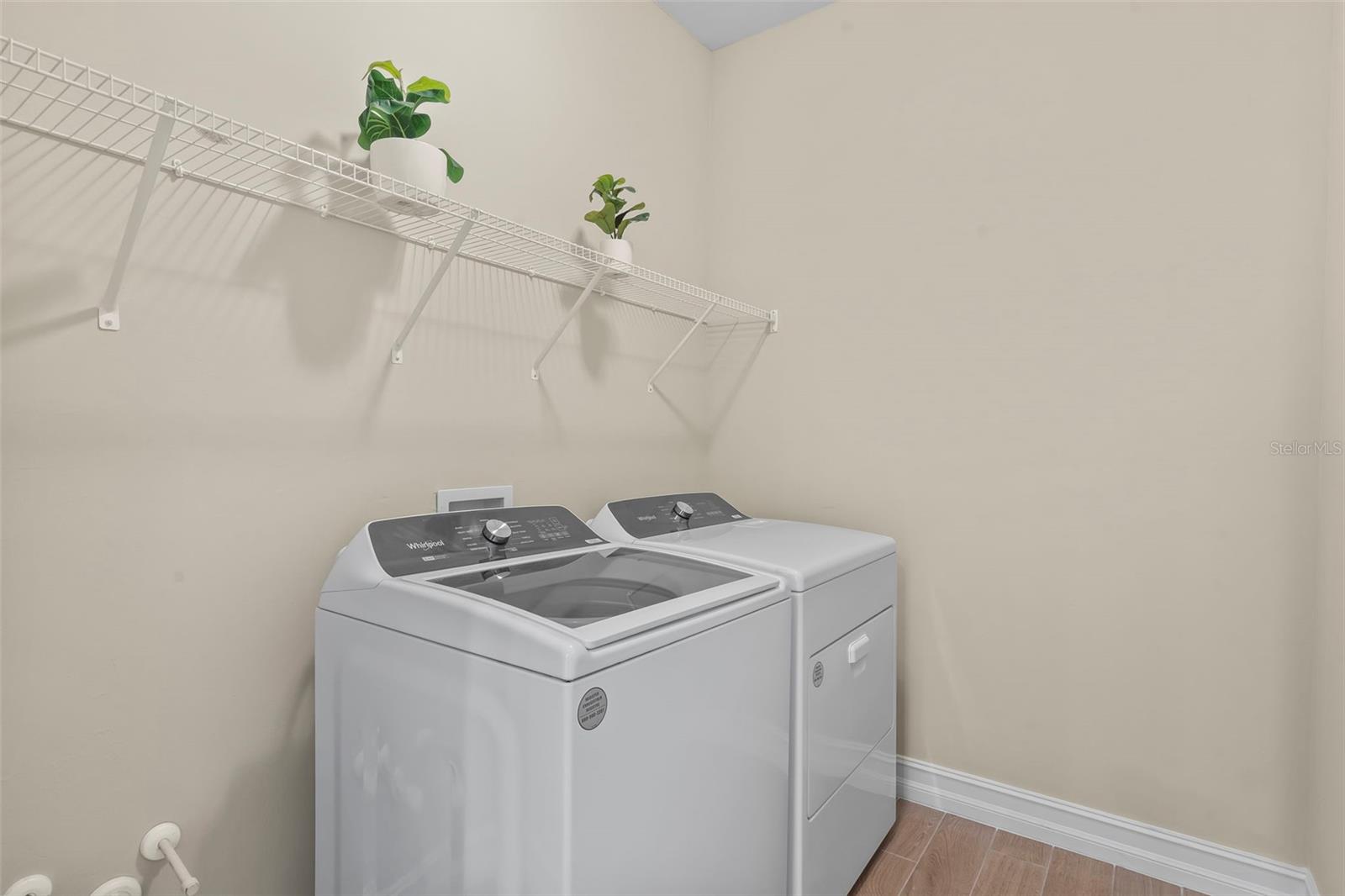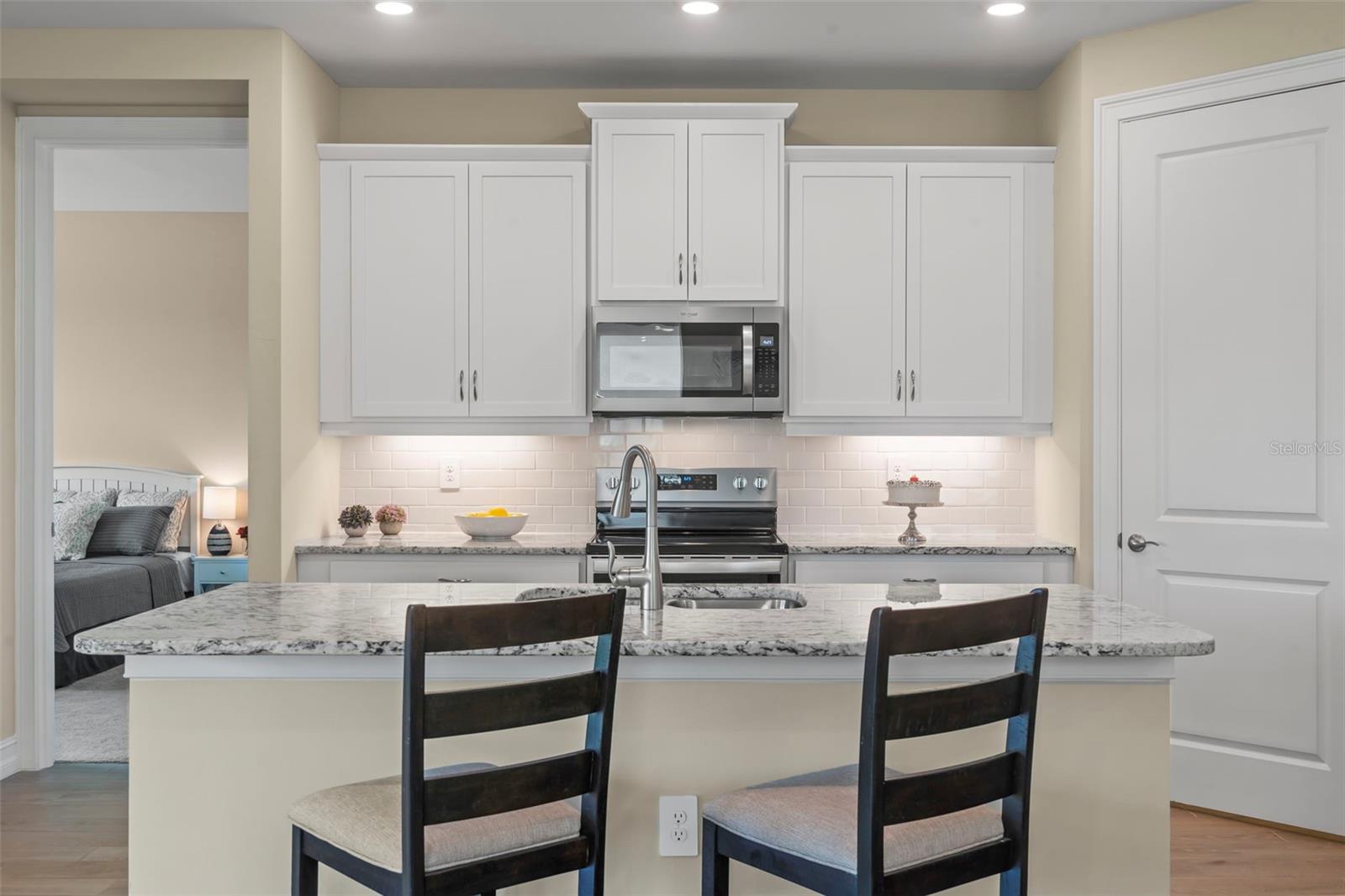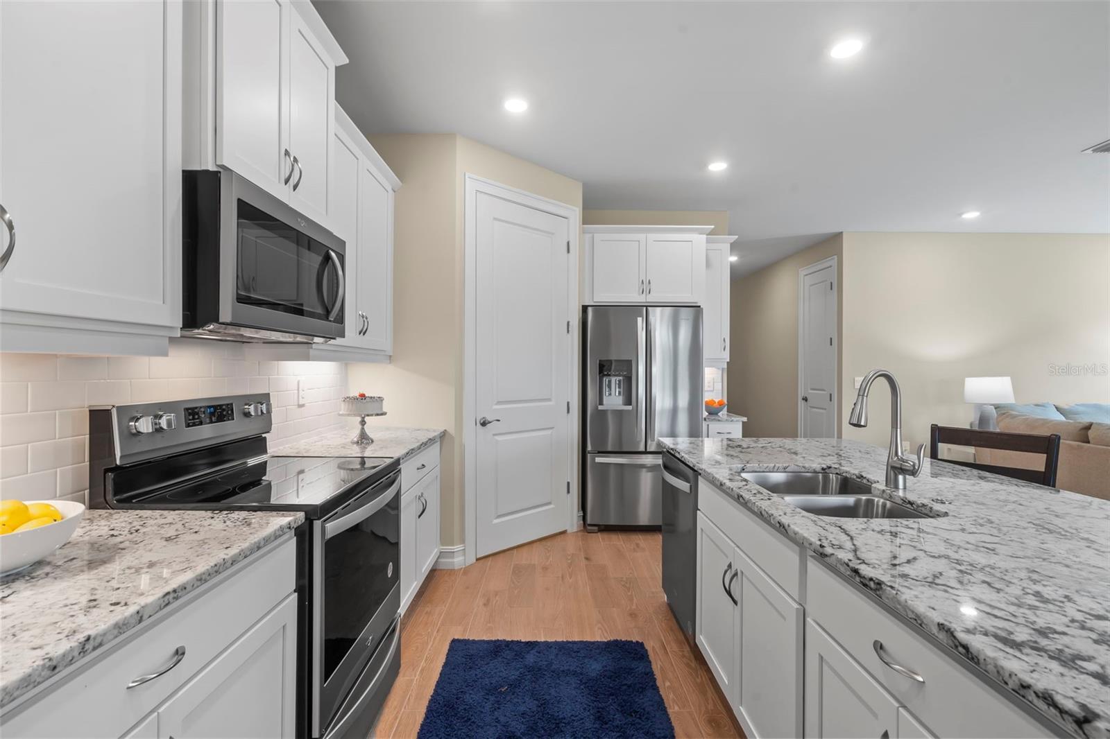 Agent on site 7 days a week 10am -4pm. If agent not available please call number on sign. Discover the charm of our highly sought-after Clifton one-story home design. This thoughtfully crafted layout maximizes living space with an open-concept kitchen overlooking a spacious great room and dining area. This home has been upgraded with wood-look plank tiles through out. Sliding glass doors flood the living area with natural light and lead to a paved, covered lanai, perfect for enjoying beautiful sunrises over the lake. The well-appointed kitchen boasts stunning stone countertops, a central island with stool seating, 48" cabinets with under-cabinet lighting, and modern stainless steel appliances, including a fridge, stove, microwave, dishwasher, and sink disposal. The convenient walk-in corner pantry offers ample storage. The primary bedroom, situated at the back of the house for added privacy, features an en suite bathroom with a double vanity and two large walk-in closets, providing substantial storage space. Two guest bedrooms are located at the front of the home, sharing a full-size bath, making it ideal for families or visitors. The laundry room comes equipped with washer and dryer and the home networking hub is centrally located for exceptional range. The additional closets throughout the home ensure plenty of storage space. Whether you're snowbirds, starting a new family, or downsizing, this excellent floorplan suits various lifestyles. Experience the perfect blend of style and functionality in this exceptional property. The Cove in West Port is a gated community featuring a heated resort style pool, club house with social room, game room, fitness center and activity room. Outside of the clubhouse you will find 4 pickleball courts with lights and 2 dog parks. The Cove is the only community in West Port that is truly gates with private clubhouse and pool! Decorated model and furniture/cosmetics inclusions will not come with the purchase of this listing.