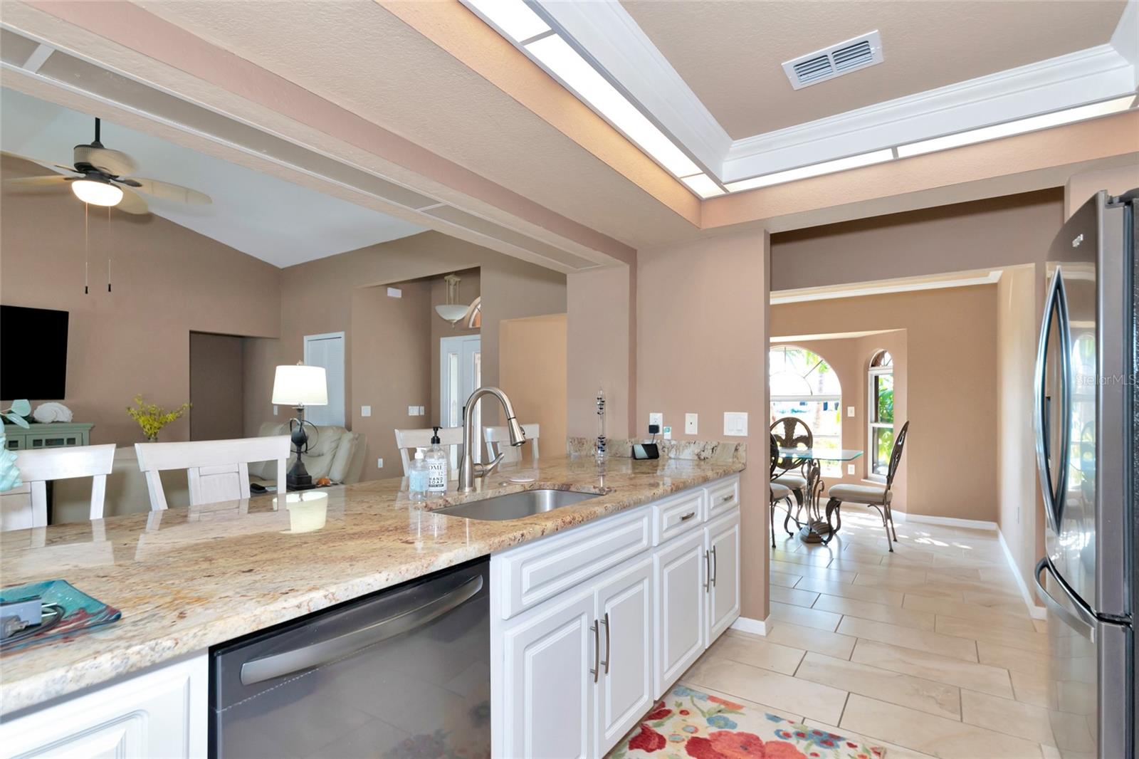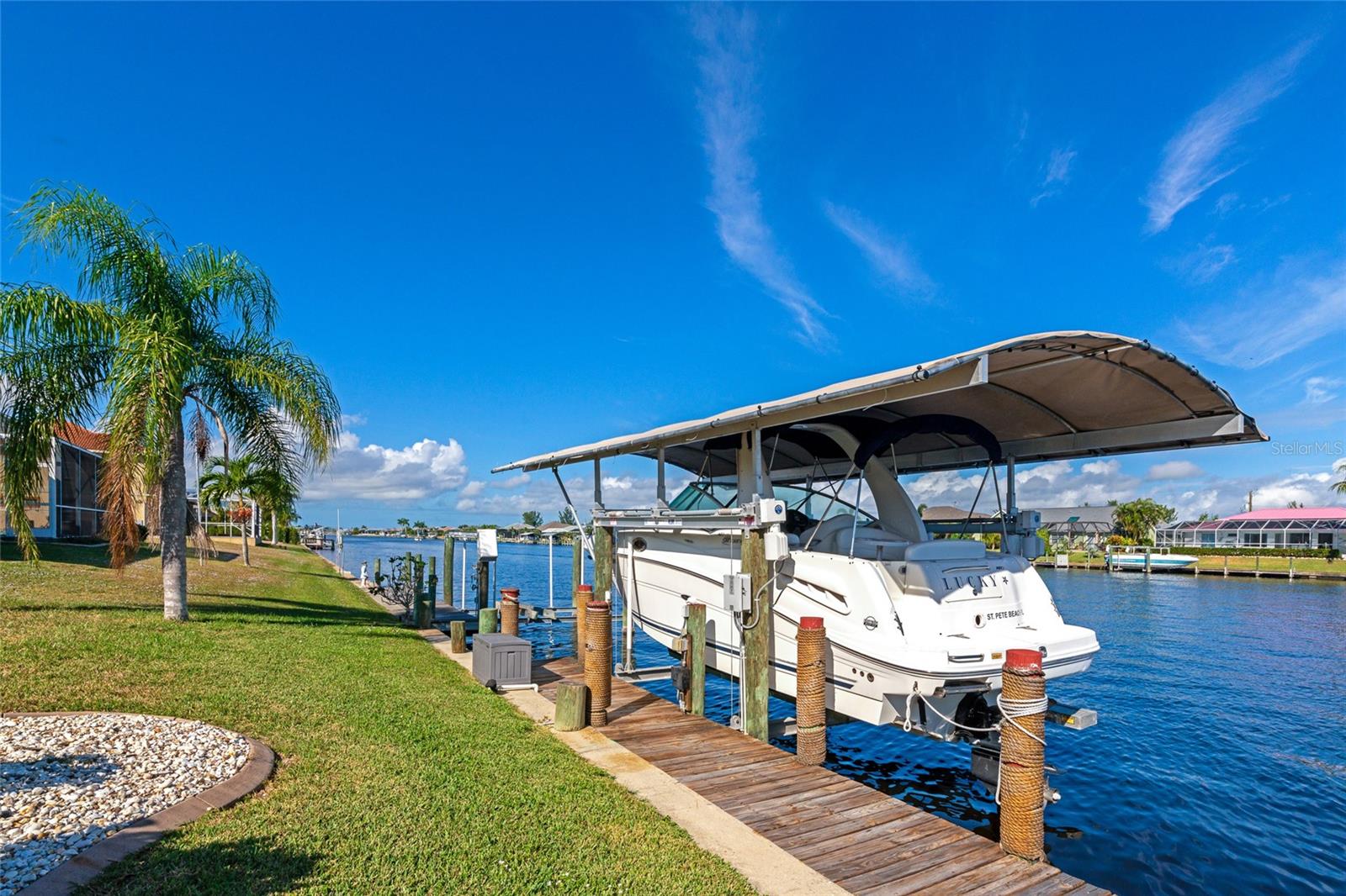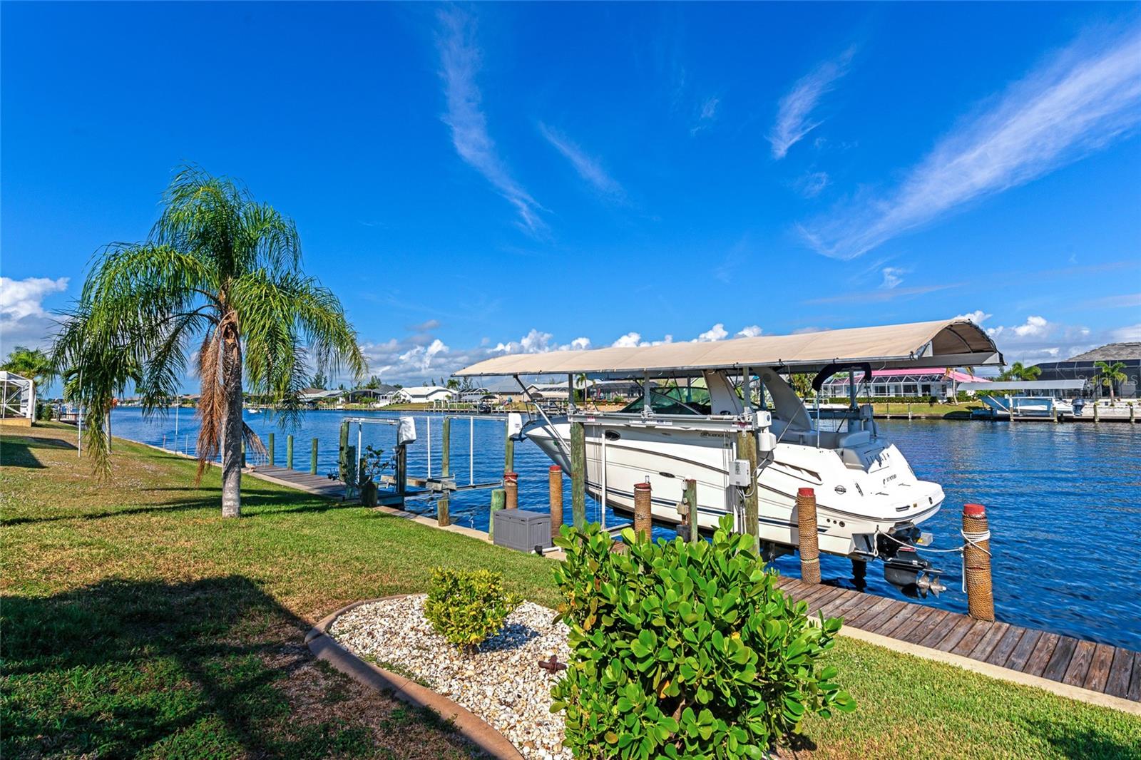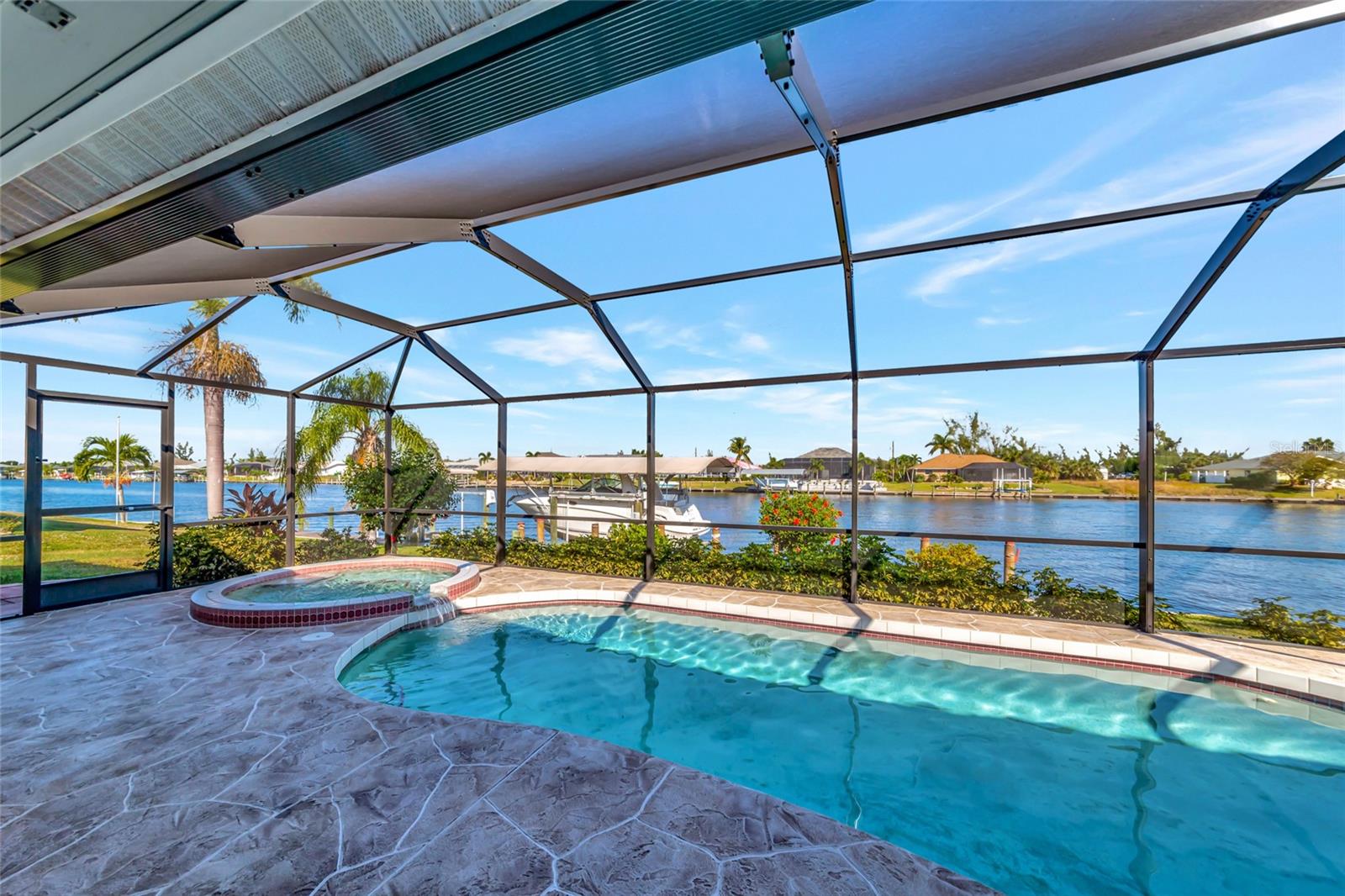 Welcome to 15564 Ruston Circle in Port Charlotte, Florida! Boasting a new HVAC. This exquisite waterfront home is a boater's dream, offering Gulf access to open waters within minutes. Situated on the wide Zephyr waterway canal in the highly sought-after community of South Gulf Cove, this property boasts an enviable location for avid boaters. Recent upgrades include a brand-new tile roof, ensuring lasting quality and value. As you step inside this furnished abode, you'll be greeted by large pocket sliders that lead to a heated saltwater pool with stunning water views—a perfect setting for morning coffees and evening swims while enjoying breathtaking sunsets. The interior features ceramic tile throughout and luxury vinyl in all bedrooms. The master bedroom offers water views, a walk-in closet, and a separate slider to the lanai. The kitchen is equipped with stainless steel appliances, granite countertops, and direct access to all living spaces for easy entertaining. For boating enthusiasts, there's a covered boat lift (10,000 lb) for hassle-free access to the Gulf of Mexico's fishing opportunities. Additional features include hurricane protection for most windows and city water and sewer services. Beyond your doorstep, enjoy the pristine beaches of Boca Grande and Englewood, golfing, dining, shopping, and outdoor activities. Conveniently located near Punta Gorda, Fort Myers, and Sarasota airports, this home offers a chance to live in paradise on the widest canal in South Gulf Cove, with only one bridge out to the lagoon. Don't miss the opportunity to make this your dream waterfront retreat! Check INTERACTIVE 3D MATTERPORT tour: https://my.matterport.com/show/?m=dLqWki3bskc