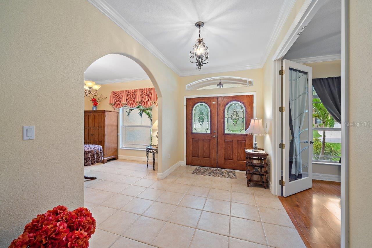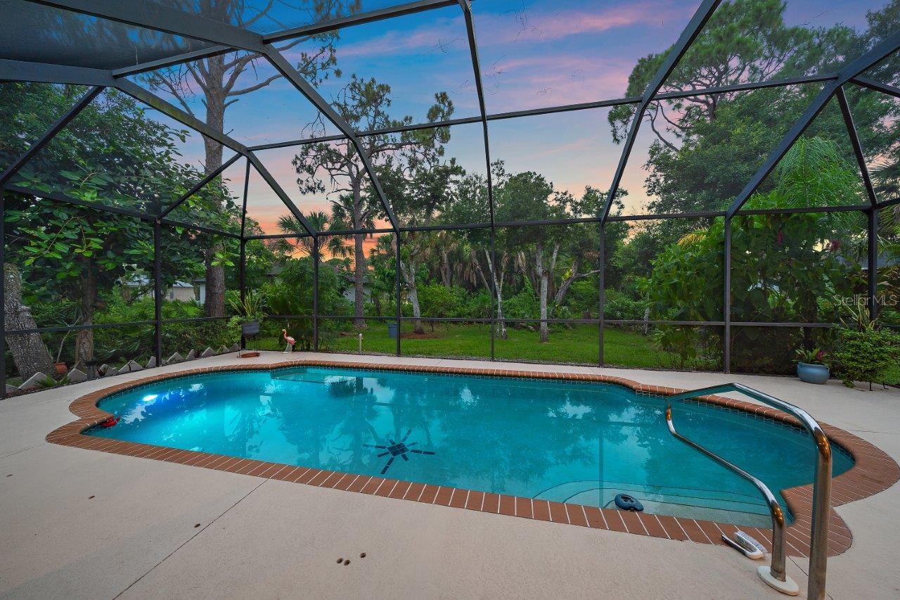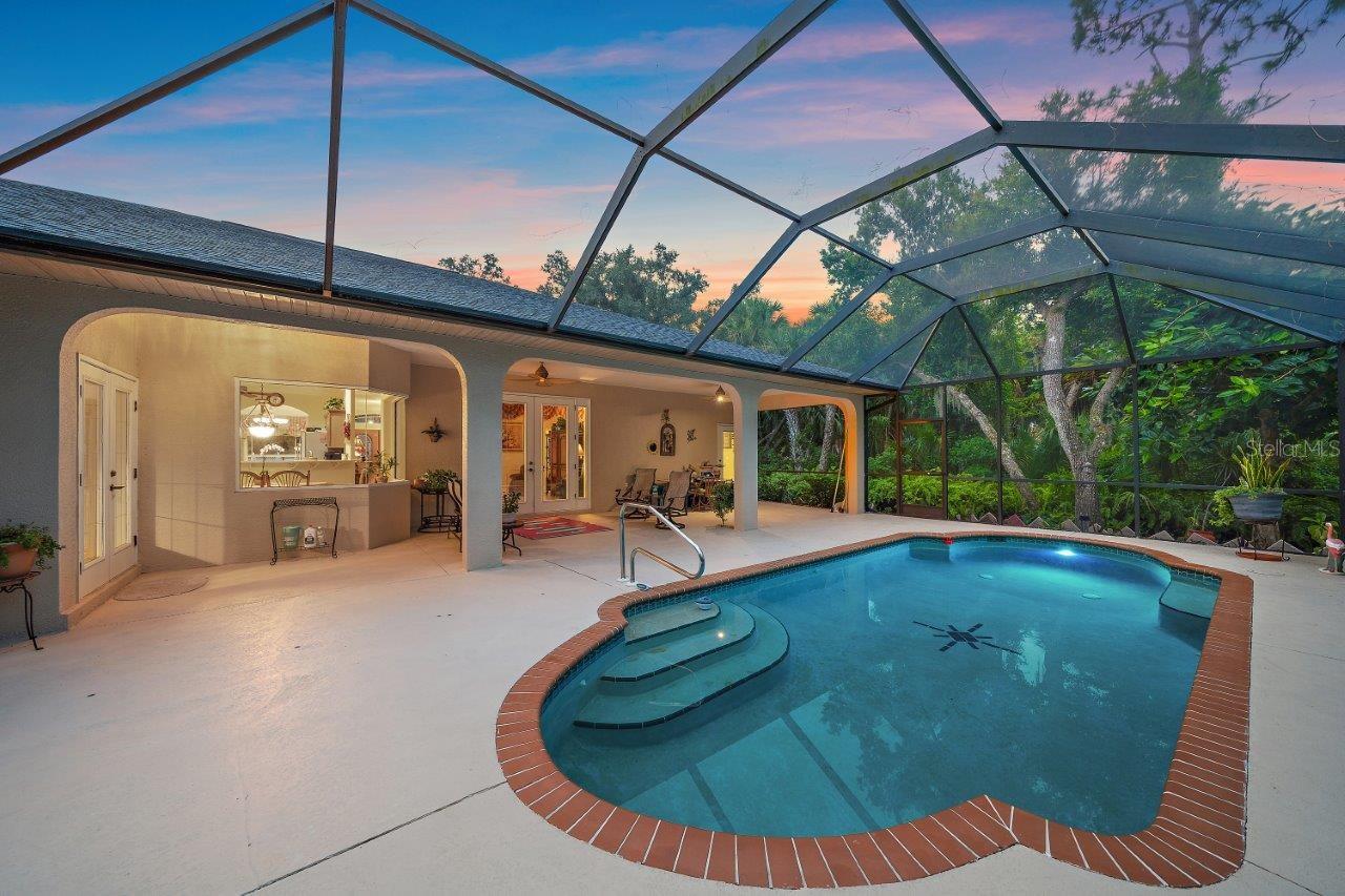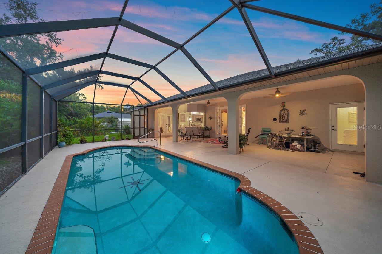 Escape to your own private oasis nestled on .45 acres of lush Florida landscape. As you arrive, you’ll notice the stunning elevation accents, and landscaping that give this home top-grade curb appeal. Once you step foot through the front French doors, the interior maintains that same first-class feel! Crown molding, high ceilings, and 16” tile flooring throughout all the main living areas. The kitchen boasts a breakfast bar, granite counters, solid wood cabinetry, stainless steel appliances, and a pantry. The living room features tray ceilings and opens to the screened-in lanai with views of the heated pool and surrounding landscape. The home is expertly designed with a split floorplan, providing privacy for your guests. The owner’s suite has direct access to the lanai through French doors. A large walk-in closet, ensuite bathroom with makeup vanity, walk-in shower, and jacuzzi tub to round out the owners suite. The second bedroom features a walk-in closet, a full bathroom with walk-in shower and access to the lanai. The lanai is perfectly set up for entertainment with a covered patio, heated pool, and views of the back yard. Additional bonuses this home includes are a storage shed, NEW Roof 2023, and NEW pool pump (2023)! No HOA or Deed Restrictions. Port Charlotte and the surrounding community offers a variety of activities, including parks, restaurants, beaches, and entertainment venues, making it easy to stay active and engaged. Is this home your perfect match? Schedule a showing today!