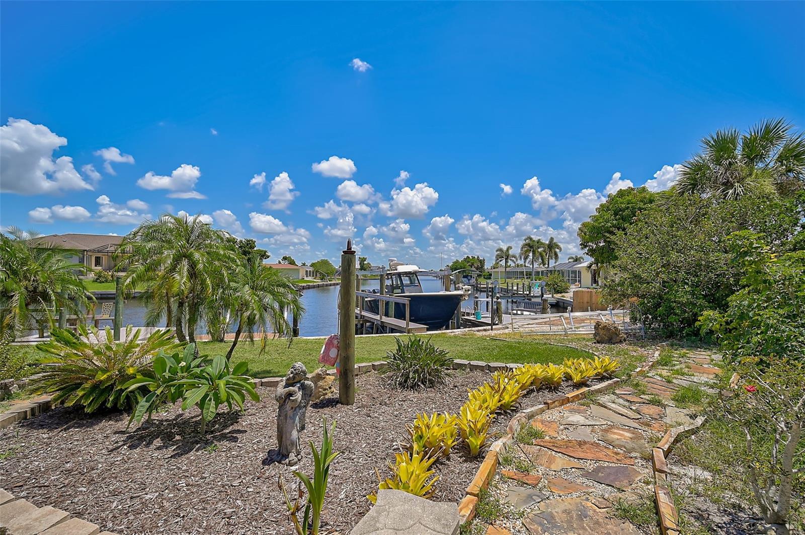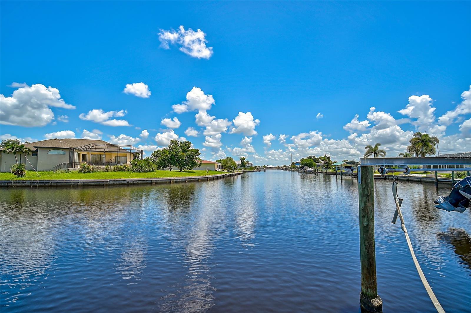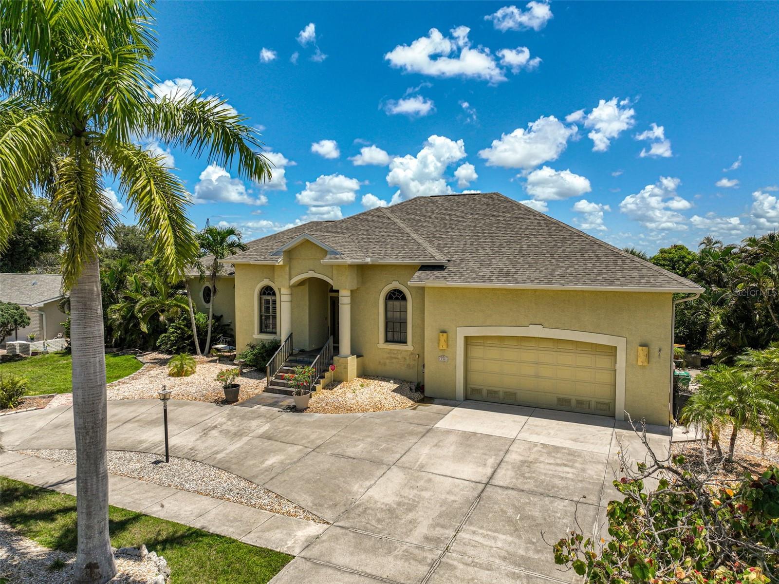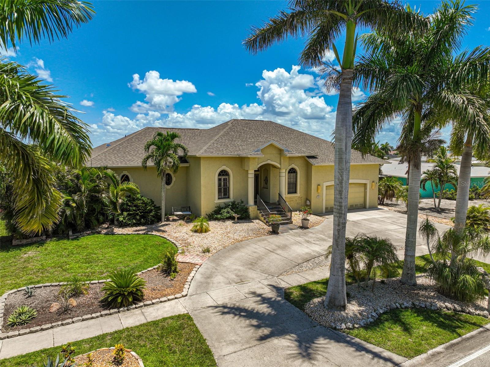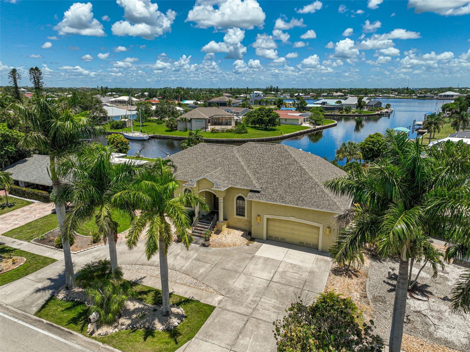 Welcome home to this beautiful, custom-built home by Fero Construction in Port Charlotte! Home offers a luxurious waterfront lifestyle. With 2 bedrooms, 2 bathrooms, and a den, this home boasts fantastic canal views and quick, sailboat access to Charlotte Harbor. Upon entering, you'll find a spacious great room that seamlessly flows into the gourmet kitchen and large dining area. Architectural features include zero-corner sliding glass doors, tile floors throughout the main living areas, a double tray ceiling, and a central vacuum system with floor sweeps. The gourmet kitchen is a chef's delight, featuring granite countertops, wood cabinetry, under-cabinet lighting, and a closet pantry. The split bedroom floor plan offers two master suites, each with his and her walk-in closets and private baths. The main master suite even has walk-out access to the patio and backyard, creating a serene retreat. The great room opens to the lanai, offering stunning canal views. The backyard is beautifully landscaped, creating a private oasis that includes an in-ground pool, patio, and a tiki hut with a tin roof. Whether you want to lounge by the pool or relax at the tiki bar, this backyard is perfect for entertaining. A wooden dock with an 8,000 lb boat lift is just steps from the back door, making it easy to enjoy boating on the water. Water and electric hook-ups are available dockside for added convenience. The home also features an oversized 2-car garage with 14ft ceilings, a workshop, and plenty of additional storage space, including attic access with attic storage. Meticulously maintained and in move-in condition, this home is ready to become your Florida dream home.