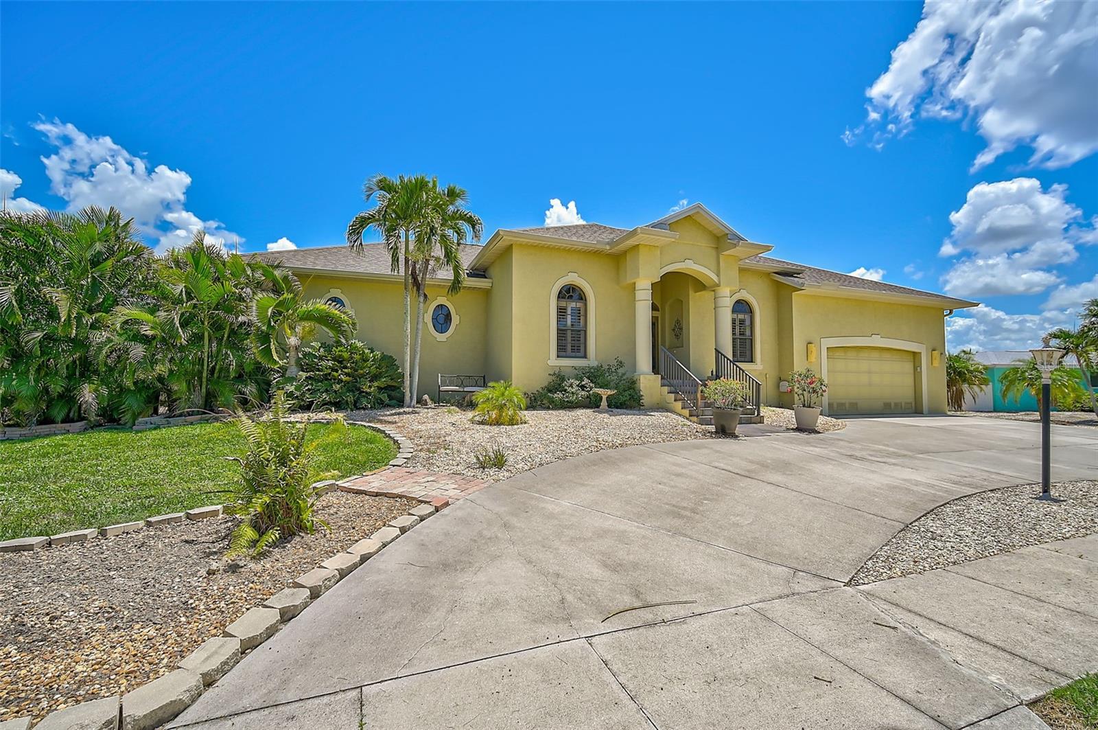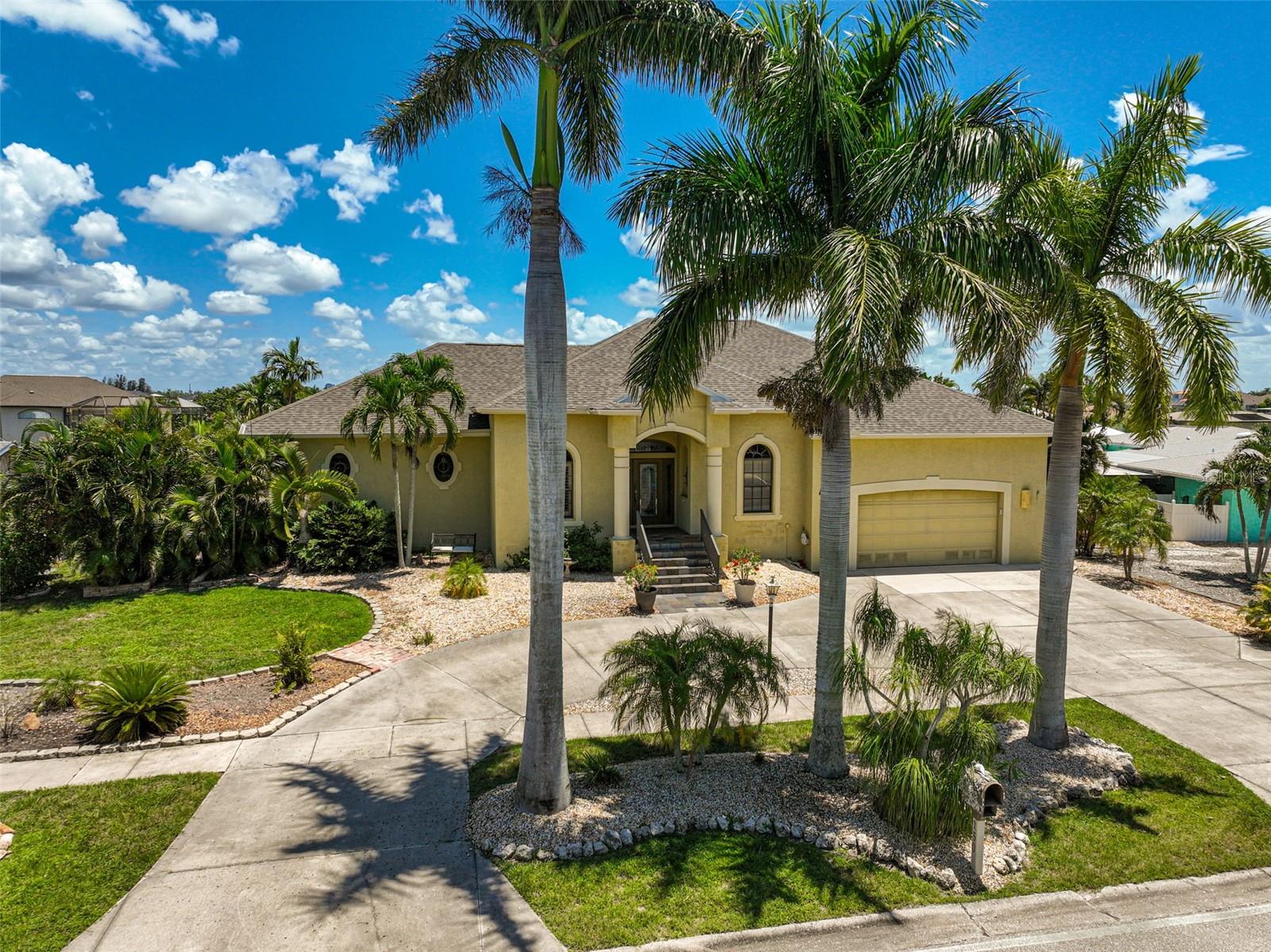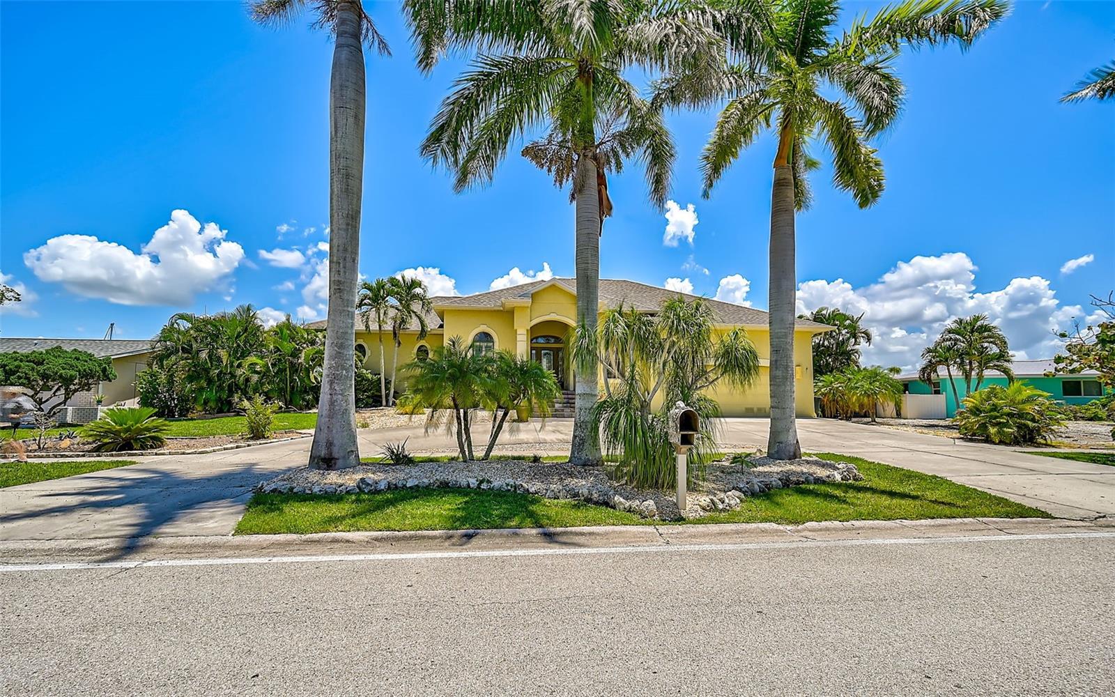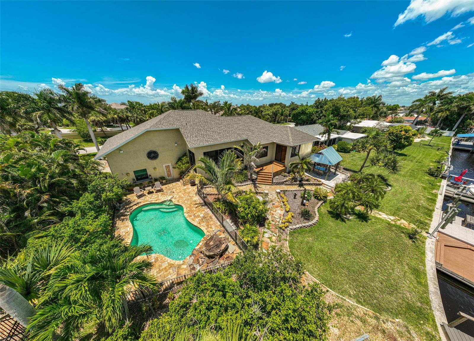 Welcome home to this beautiful, custom-built home by Fero Construction in Port Charlotte! Home offers a luxurious waterfront lifestyle. With 2 bedrooms, 2 bathrooms, and a den, this home boasts fantastic canal views and quick, sailboat access to Charlotte Harbor. Upon entering, you'll find a spacious great room that seamlessly flows into the gourmet kitchen and large dining area. Architectural features include zero-corner sliding glass doors, tile floors throughout the main living areas, a double tray ceiling, and a central vacuum system with floor sweeps. The gourmet kitchen is a chef's delight, featuring granite countertops, wood cabinetry, under-cabinet lighting, and a closet pantry. The split bedroom floor plan offers two master suites, each with his and her walk-in closets and private baths. The main master suite even has walk-out access to the patio and backyard, creating a serene retreat. The great room opens to the lanai, offering stunning canal views. The backyard is beautifully landscaped, creating a private oasis that includes an in-ground pool, patio, and a tiki hut with a tin roof. Whether you want to lounge by the pool or relax at the tiki bar, this backyard is perfect for entertaining. A wooden dock with an 8,000 lb boat lift is just steps from the back door, making it easy to enjoy boating on the water. Water and electric hook-ups are available dockside for added convenience. The home also features an oversized 2-car garage with 14ft ceilings, a workshop, and plenty of additional storage space, including attic access with attic storage. Meticulously maintained and in move-in condition, this home is ready to become your Florida dream home.