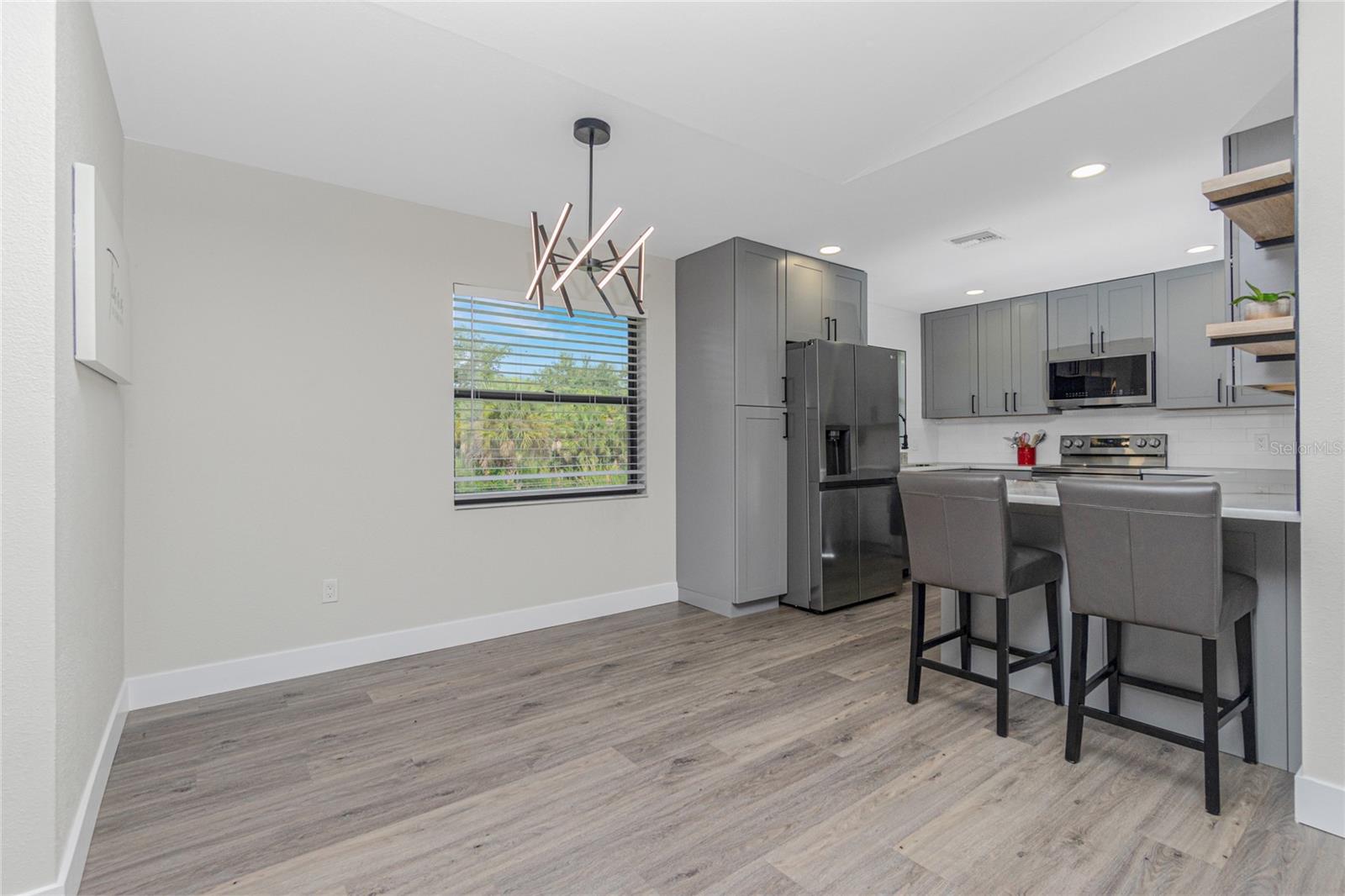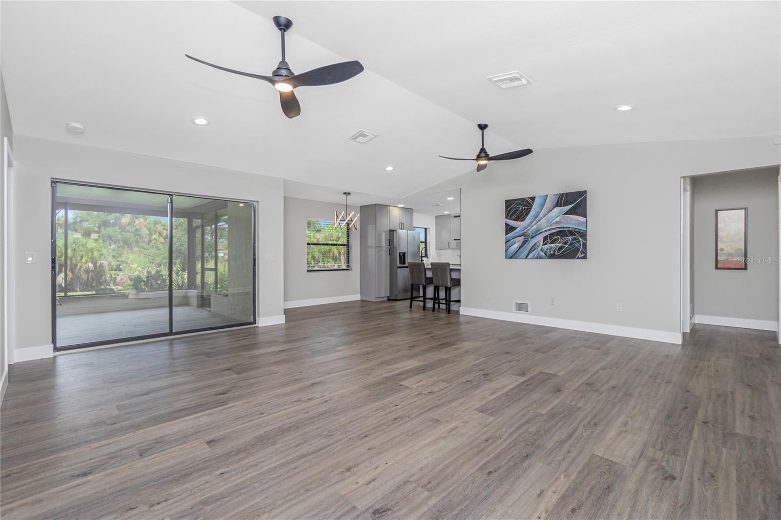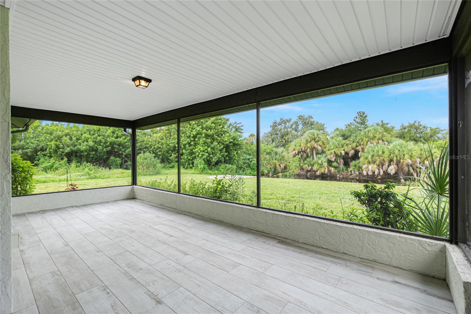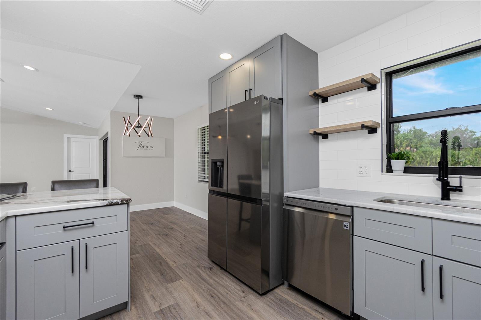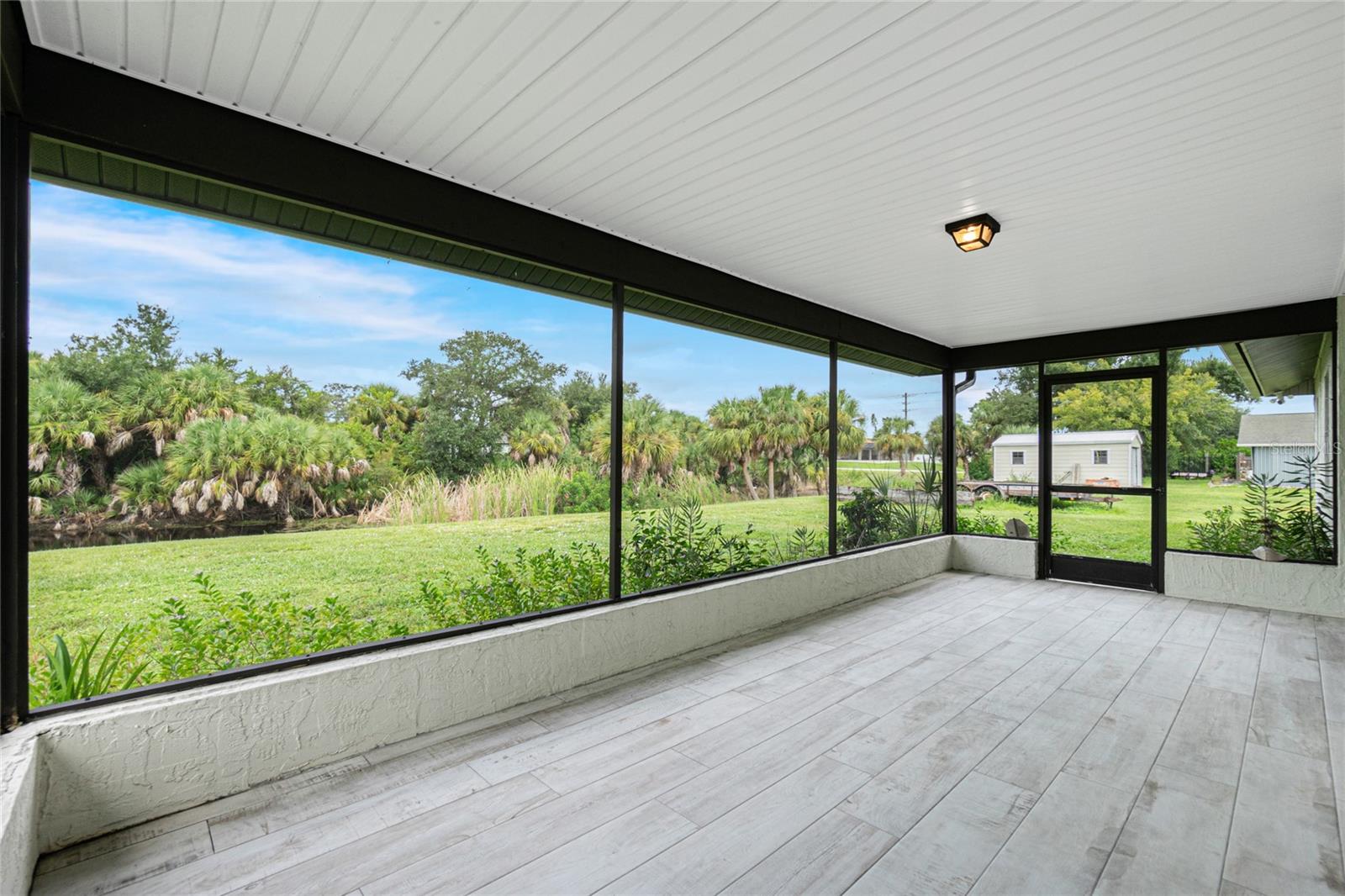 Nestled on a serene fresh water canal that leads into Lake Blueberry, this home offers the perfect blend of modern luxury and natural beauty. As you step inside, you will immediately notice the tasteful upgrades that make this house stand out. Contemporary remote controlled light fixtures, new interior doors and moldings, and modern hardware add a touch of elegance to the look and feel of the home. The luxury vinyl plank flooring throughout not only enhances the aesthetic appeal but also provides durability and easy maintenance. The kitchen has been updated with a functional design featuring recessed adjustable ceiling lights, soft-close solid wood shaker cabinets, sparkling quartzite countertops, and top-of-the-line stainless steel LG appliances. It's a chef's delight with plenty of counter space to work with, an abundance of cabinet storage including a full-size pantry, and best of all - counter height seating for casual meals and a place to gather. From the kitchen we can see where this open floor plan allows for full view of the living area and backyard. The large living area is the focal point in the home featuring cathedral ceilings with plenty of natural light shining through all the windows of the backyard water view. The spacious main bedroom offers a picturesque view of the water in addition to its spacious walk-in closet and en-suite bathroom. The bathroom entrance has been updated with a modern barn door with soft close feature to maximize the space. The walk-in shower was upgraded with porcelain tile, a built-in shower bench and a glass enclosure. An oversized vanity allows for comfortable usable space and plenty of storage for all the essentials. Sliding glass doors open to the oversized screened-in lanai where we can experience peace and quiet overlooking the canal to Blueberry Lake. There is a concrete pad already poured in the backyard to build a future storage shed and also potential for adding a dock on the water. With a new roof (2022) and a newer HVAC system (2020), you can enjoy peace of mind knowing that the essential components of the house are in excellent condition, ensuring years of stress-free living. There are no deed restrictions so you may enjoy the freedom of customizing this house tailored to your own vision as well as be able to seize the opportunity of leasing for short or long-term rentals as you prefer. The lot is situated in an X Flood Zone so there is no mandated flood insurance! Schedule a showing today and experience the perfect blend of modern comfort and natural beauty in person.