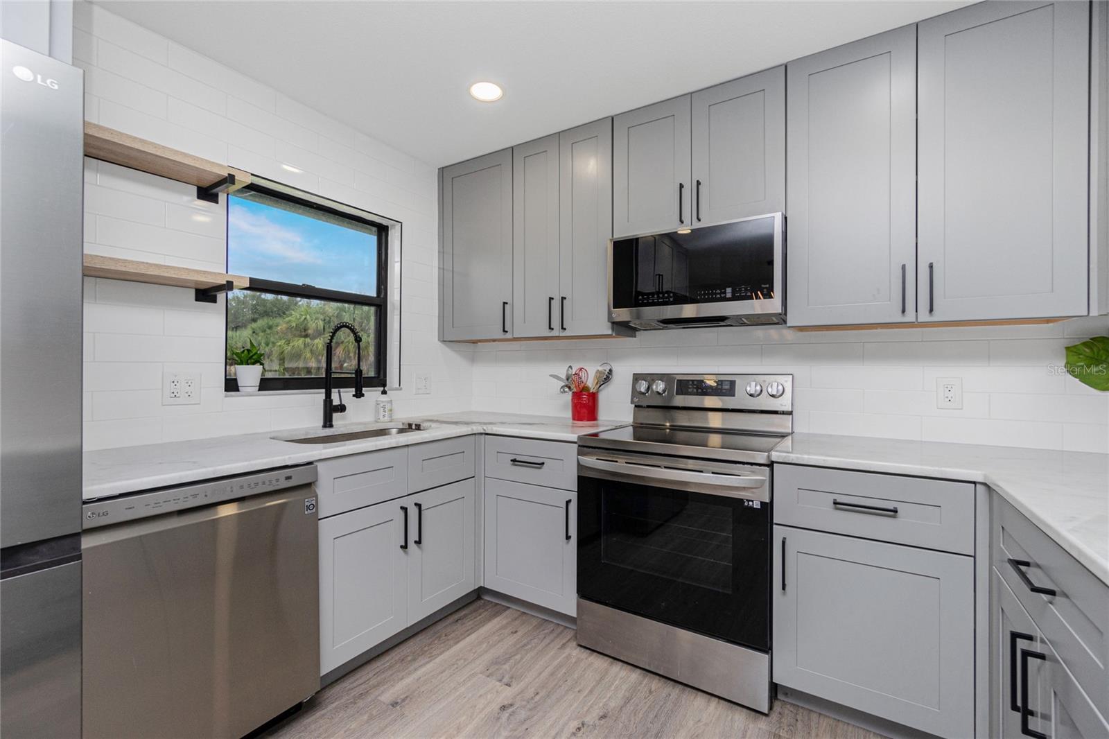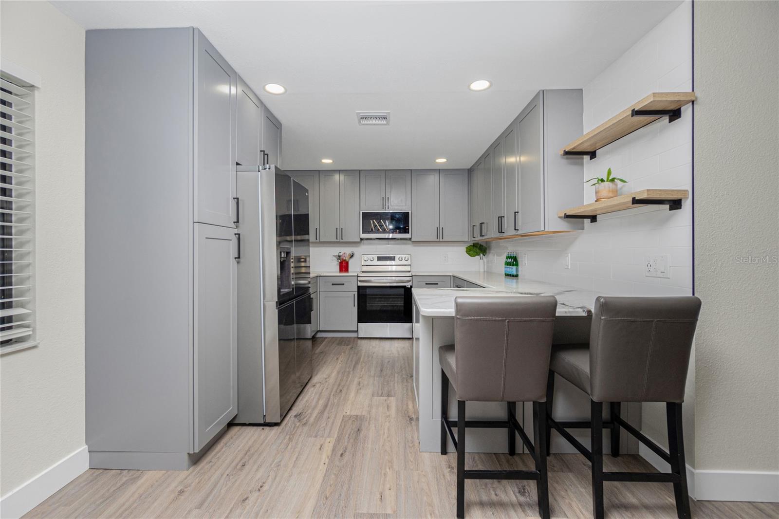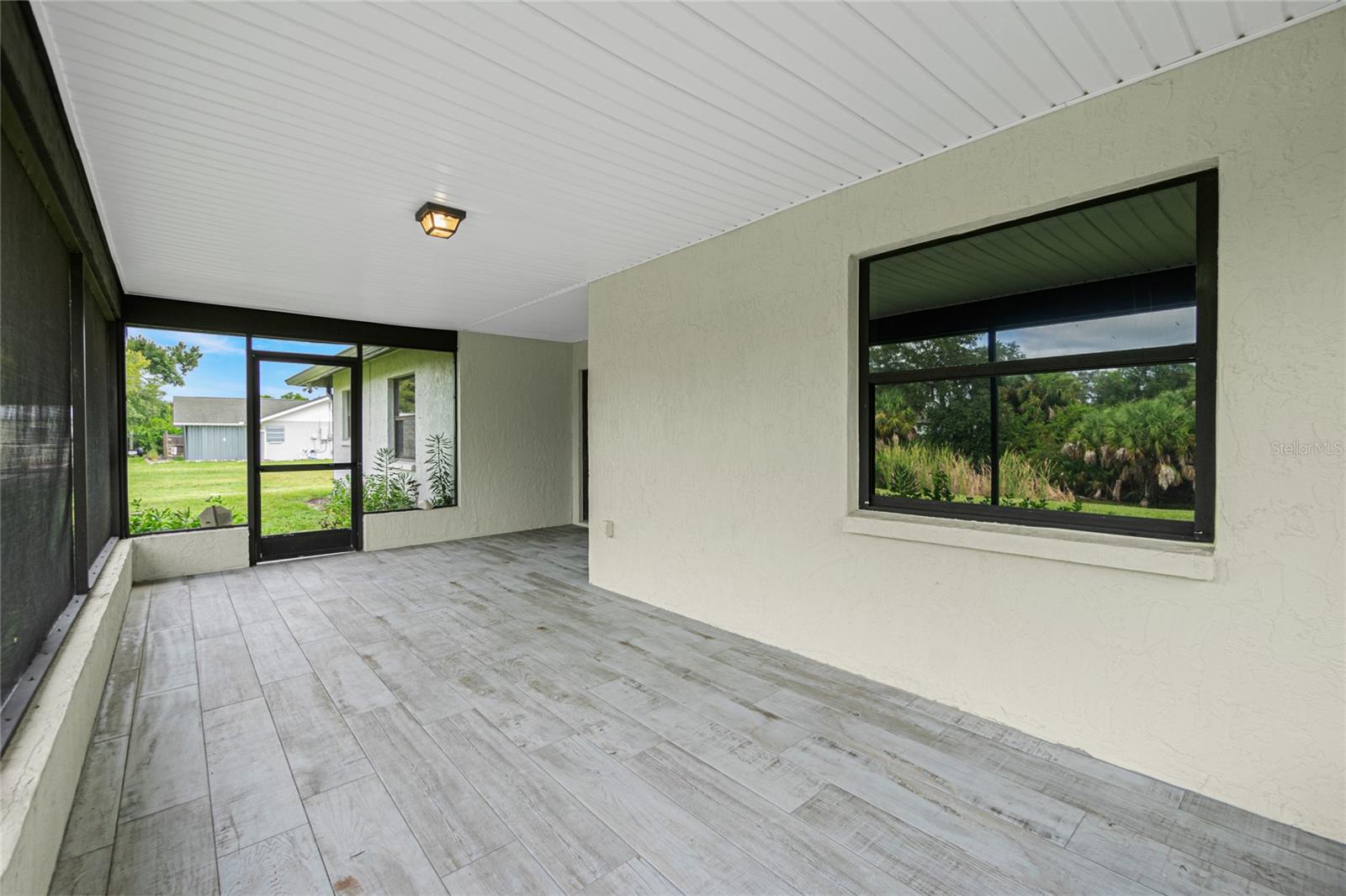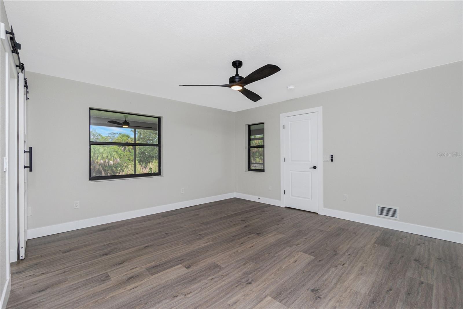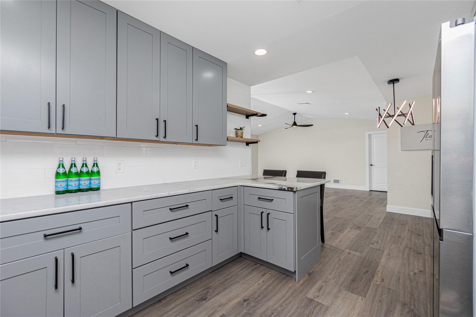 Nestled on a serene fresh water canal that leads into Lake Blueberry, this home offers the perfect blend of modern luxury and natural beauty. As you step inside, you will immediately notice the tasteful upgrades that make this house stand out. Contemporary remote controlled light fixtures, new interior doors and moldings, and modern hardware add a touch of elegance to the look and feel of the home. The luxury vinyl plank flooring throughout not only enhances the aesthetic appeal but also provides durability and easy maintenance. The kitchen has been updated with a functional design featuring recessed adjustable ceiling lights, soft-close solid wood shaker cabinets, sparkling quartzite countertops, and top-of-the-line stainless steel LG appliances. It's a chef's delight with plenty of counter space to work with, an abundance of cabinet storage including a full-size pantry, and best of all - counter height seating for casual meals and a place to gather. From the kitchen we can see where this open floor plan allows for full view of the living area and backyard. The large living area is the focal point in the home featuring cathedral ceilings with plenty of natural light shining through all the windows of the backyard water view. The spacious main bedroom offers a picturesque view of the water in addition to its spacious walk-in closet and en-suite bathroom. The bathroom entrance has been updated with a modern barn door with soft close feature to maximize the space. The walk-in shower was upgraded with porcelain tile, a built-in shower bench and a glass enclosure. An oversized vanity allows for comfortable usable space and plenty of storage for all the essentials. Sliding glass doors open to the oversized screened-in lanai where we can experience peace and quiet overlooking the canal to Blueberry Lake. There is a concrete pad already poured in the backyard to build a future storage shed and also potential for adding a dock on the water. With a new roof (2022) and a newer HVAC system (2020), you can enjoy peace of mind knowing that the essential components of the house are in excellent condition, ensuring years of stress-free living. There are no deed restrictions so you may enjoy the freedom of customizing this house tailored to your own vision as well as be able to seize the opportunity of leasing for short or long-term rentals as you prefer. The lot is situated in an X Flood Zone so there is no mandated flood insurance! Schedule a showing today and experience the perfect blend of modern comfort and natural beauty in person.