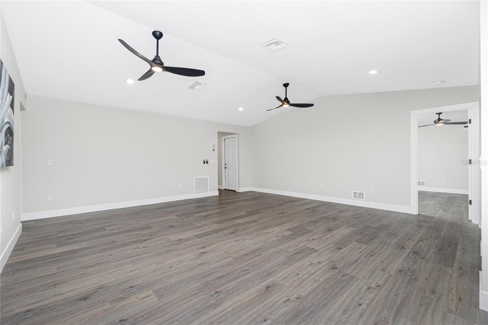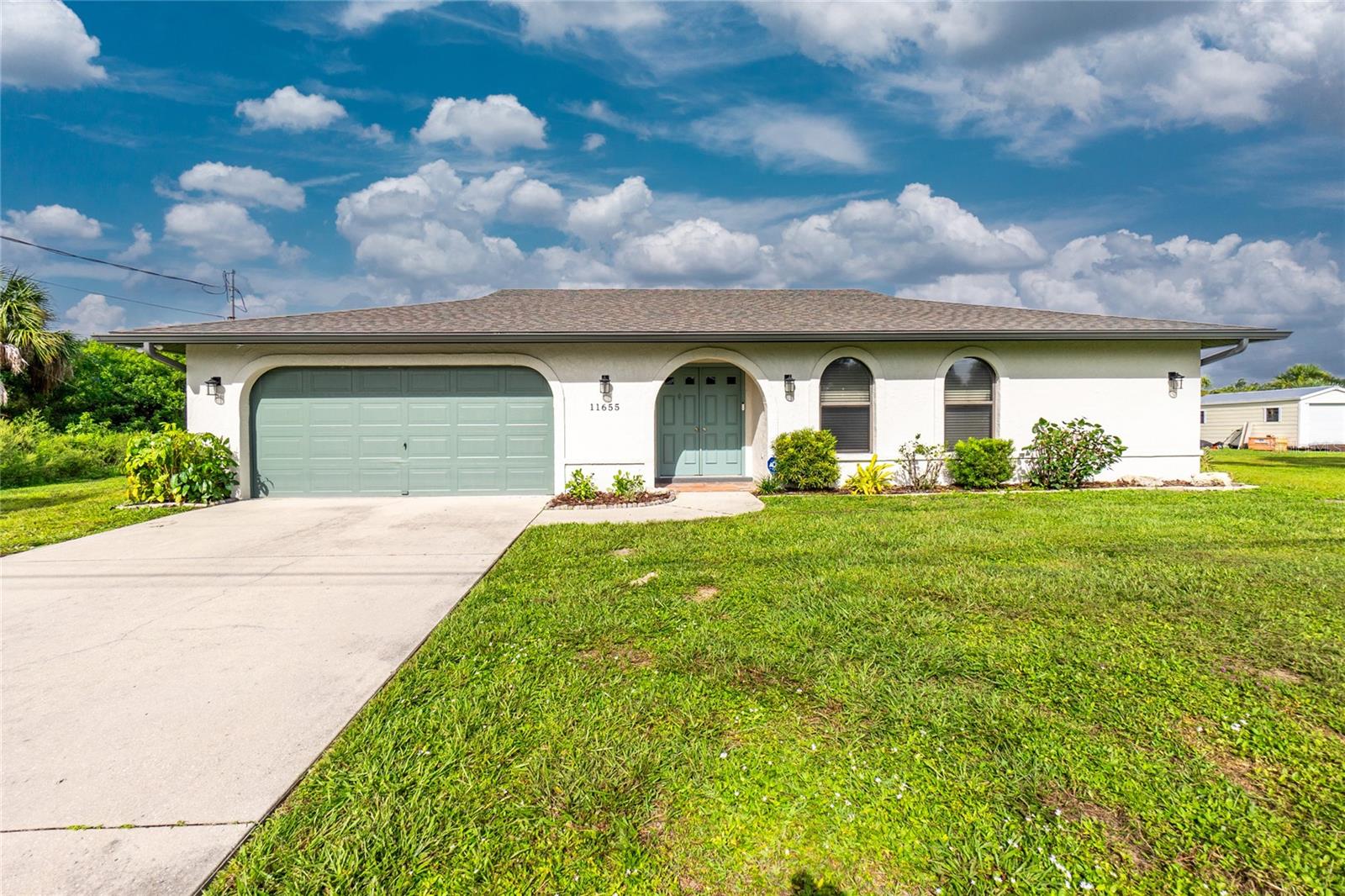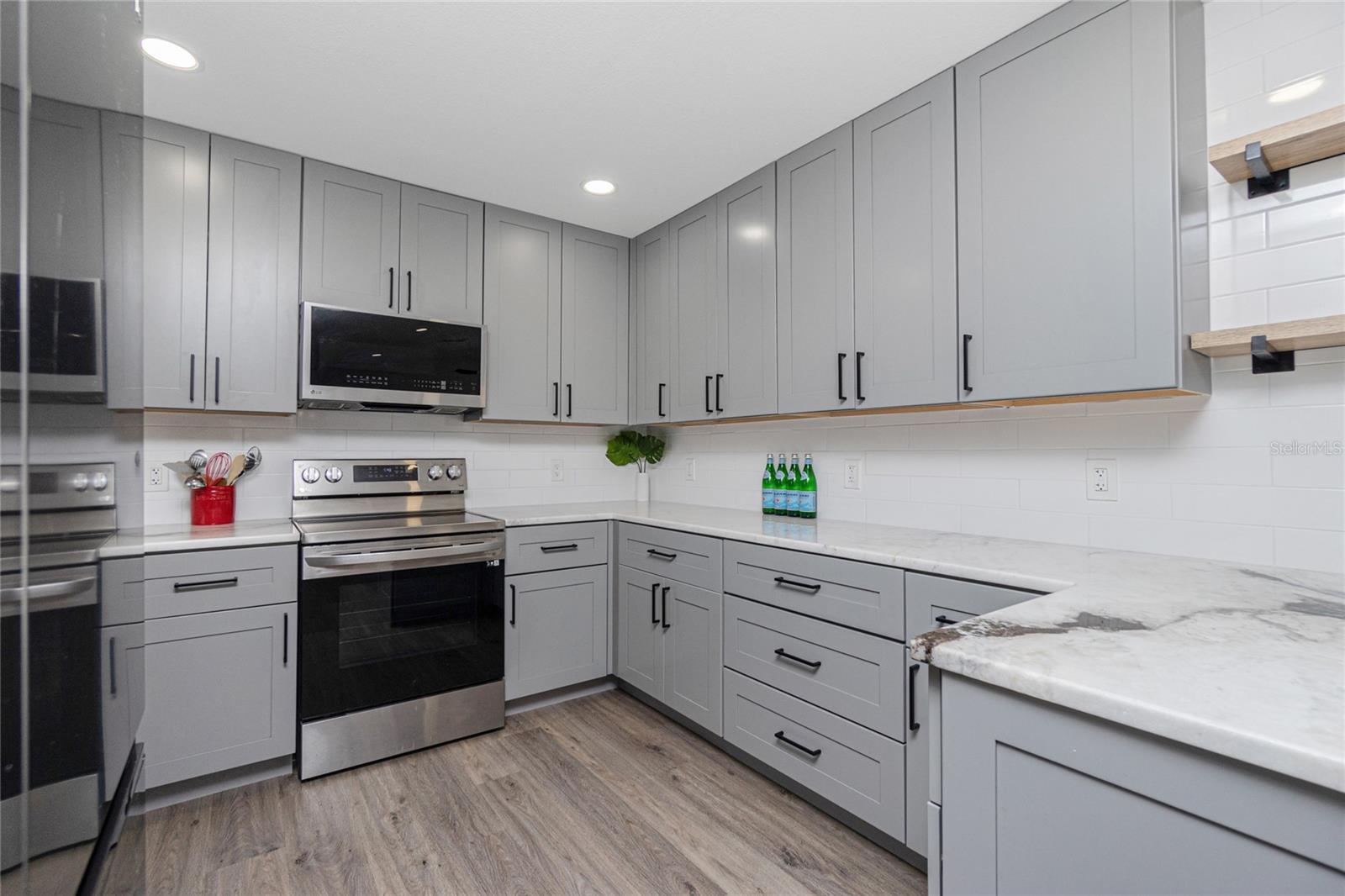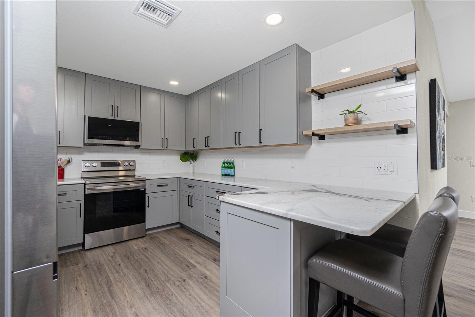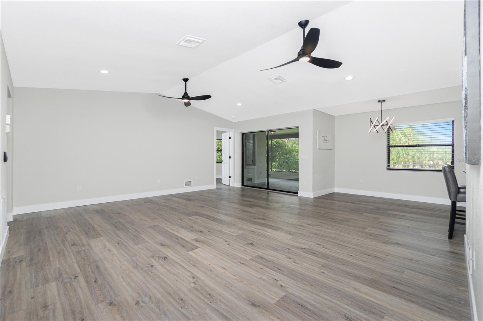 Nestled on a serene fresh water canal that leads into Lake Blueberry, this home offers the perfect blend of modern luxury and natural beauty. As you step inside, you will immediately notice the tasteful upgrades that make this house stand out. Contemporary remote controlled light fixtures, new interior doors and moldings, and modern hardware add a touch of elegance to the look and feel of the home. The luxury vinyl plank flooring throughout not only enhances the aesthetic appeal but also provides durability and easy maintenance. The kitchen has been updated with a functional design featuring recessed adjustable ceiling lights, soft-close solid wood shaker cabinets, sparkling quartzite countertops, and top-of-the-line stainless steel LG appliances. It's a chef's delight with plenty of counter space to work with, an abundance of cabinet storage including a full-size pantry, and best of all - counter height seating for casual meals and a place to gather. From the kitchen we can see where this open floor plan allows for full view of the living area and backyard. The large living area is the focal point in the home featuring cathedral ceilings with plenty of natural light shining through all the windows of the backyard water view. The spacious main bedroom offers a picturesque view of the water in addition to its spacious walk-in closet and en-suite bathroom. The bathroom entrance has been updated with a modern barn door with soft close feature to maximize the space. The walk-in shower was upgraded with porcelain tile, a built-in shower bench and a glass enclosure. An oversized vanity allows for comfortable usable space and plenty of storage for all the essentials. Sliding glass doors open to the oversized screened-in lanai where we can experience peace and quiet overlooking the canal to Blueberry Lake. There is a concrete pad already poured in the backyard to build a future storage shed and also potential for adding a dock on the water. With a new roof (2022) and a newer HVAC system (2020), you can enjoy peace of mind knowing that the essential components of the house are in excellent condition, ensuring years of stress-free living. There are no deed restrictions so you may enjoy the freedom of customizing this house tailored to your own vision as well as be able to seize the opportunity of leasing for short or long-term rentals as you prefer. The lot is situated in an X Flood Zone so there is no mandated flood insurance! Schedule a showing today and experience the perfect blend of modern comfort and natural beauty in person.
