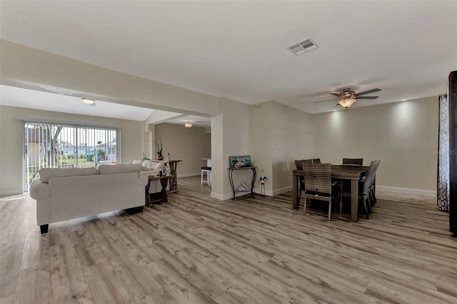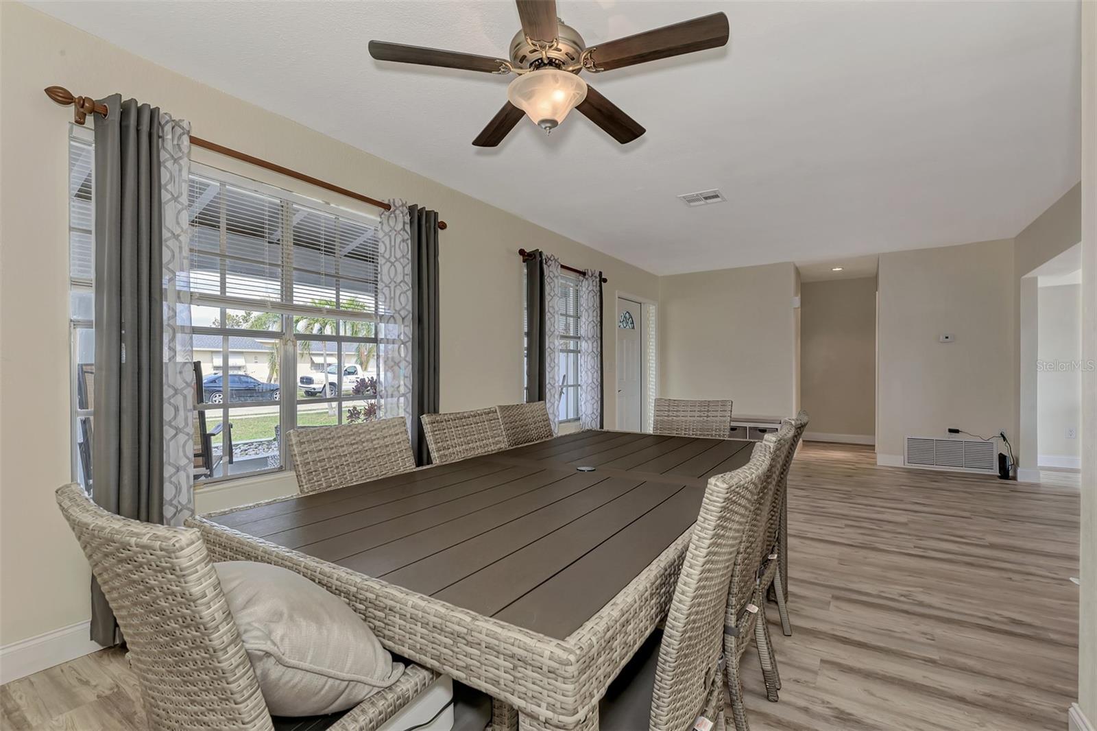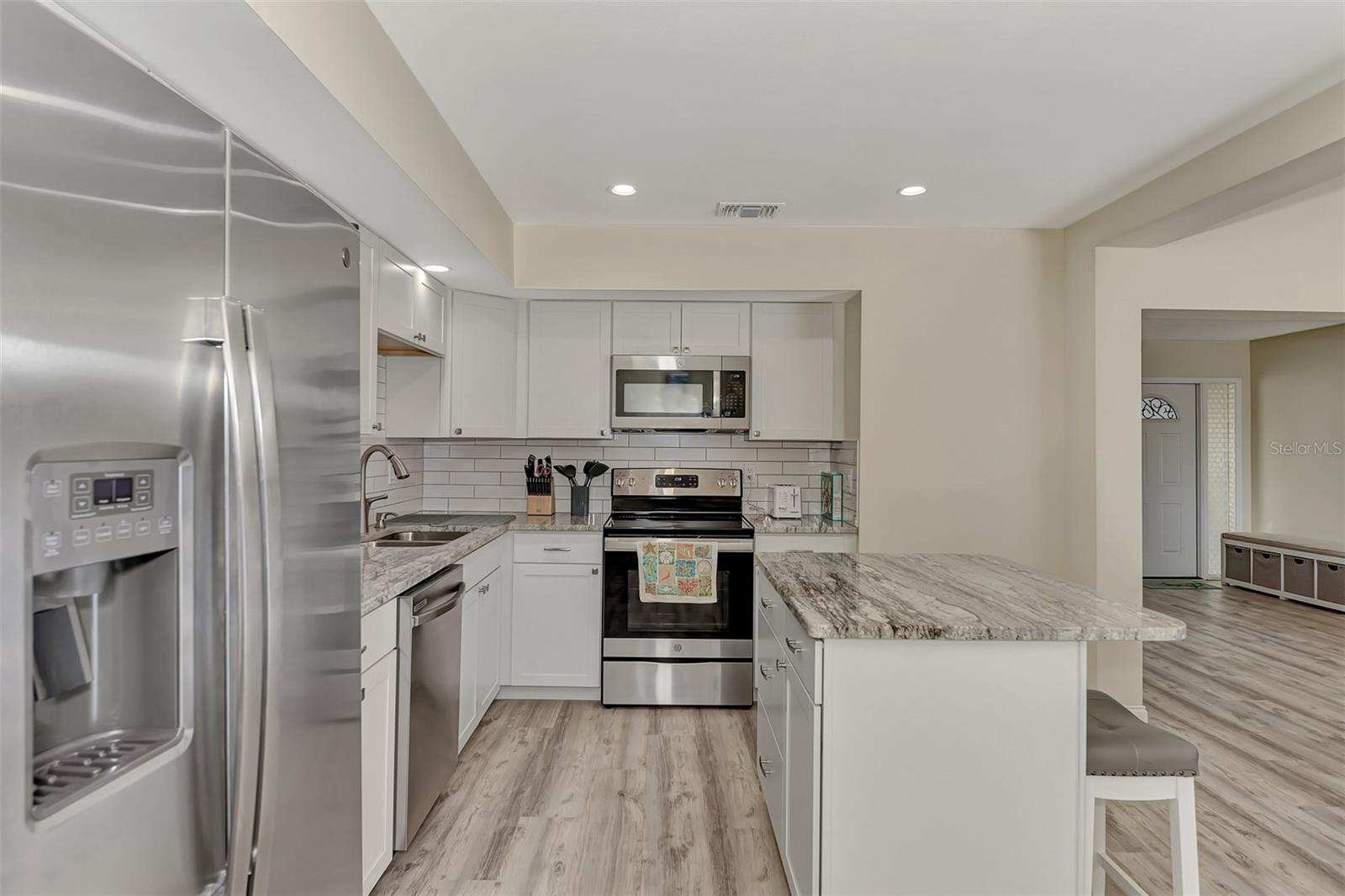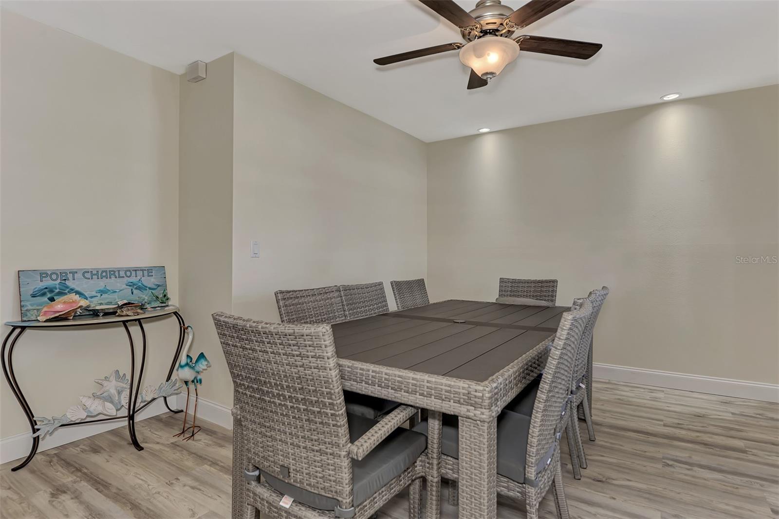 LOCATION. LOCATION. LOCATION. Discover the perfect move-in-ready home in a fantastic amenity rich community of GARDENS OF GULF COVE near several Gulf beaches! NO FLOOD ZONE! Property stayed high and dry through the last few storms and has never flooded. The community boasts 4 lakes, underground utilities, sidewalks, street lights, county water and sewer, and a full-time manager. For an affordable yearly fee of $420.00, residents enjoy access to TWO COMMUNITY POOLS (one heated), tennis courts/PICKLEBALL, shuffleboard, bocce play, a basketball court, rec. center, exercise equipment, pool tables, and a friendly atmosphere. Convenient TO GULF BEACHES, fishing, shopping, dining, and entertainment just minutes away, this property in paradise awaits your visit. This 2-bedroom, 2-bathroom gem has received fresh paint inside and out, creating a welcoming atmosphere. BRAND NEW ROOF. NEW A/C. Recently installed luxury vinyl waterproof flooring enhances most rooms, while the eat-in kitchen boasts a brand-new stainless steel appliance package, including a dishwasher, side-by-side refrigerator with water and ice dispenser, microwave, self-cleaning smooth-top stove/oven, a new garbage disposal, new cabinets, granite countertops, and recessed lighting. The center island doubles as a breakfast bar, contributing to the kitchen's functionality. A dining room with cathedral ceiling, which can also serve as a family room, opens up to a 10x14 rear patio through sliding glass doors. The spacious 12x24 living room provides an open and inviting ambiance. Upgrades extend to the bathrooms, featuring new vanities, toilets, and tile flooring. The home includes a new garage door opener with 2 remotes, and the hot water heater has been replaced. Most rooms are adorned with new ceiling fans, and hurricane shutters add an extra layer of security. The front of the home features a large 9x38 porch surrounded by newly added palm trees. Situated in the sought-after Gardens of Gulf Cove in Port Charlotte, Florida, near the Englewood border, this residence offers desirable amenities. Schedule your appointment today!