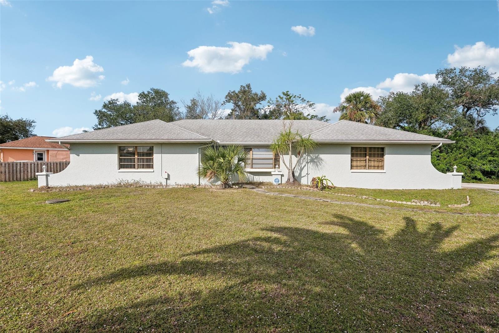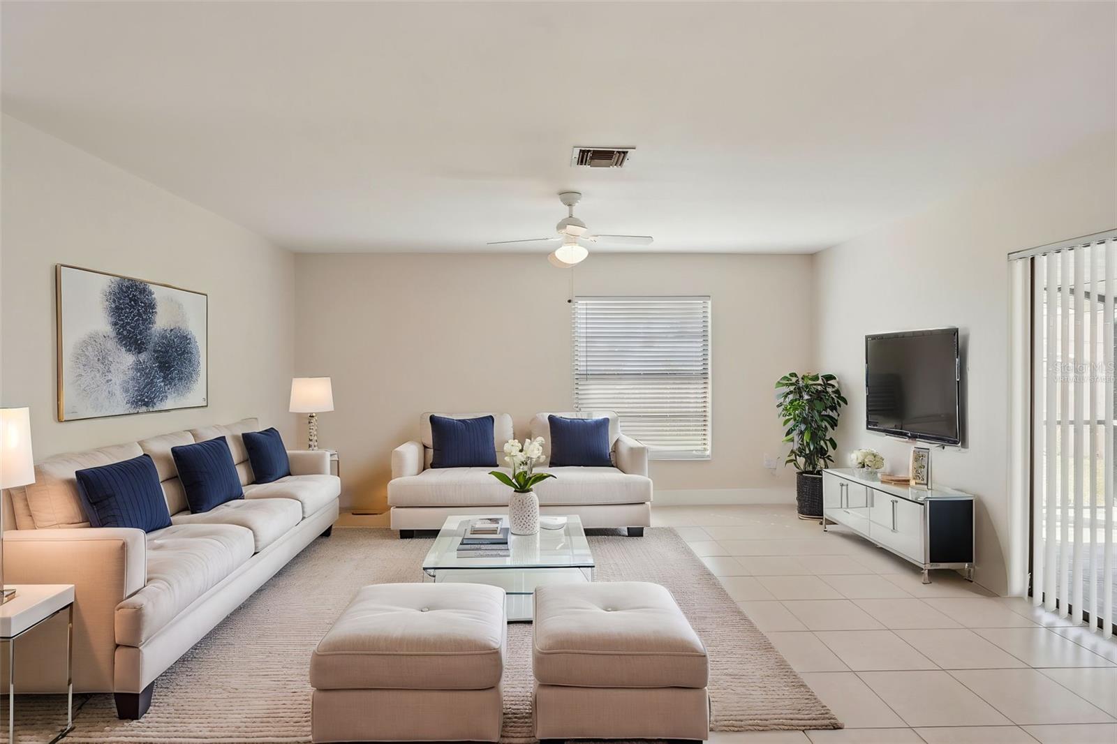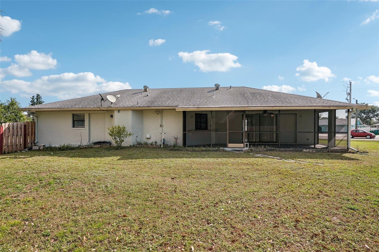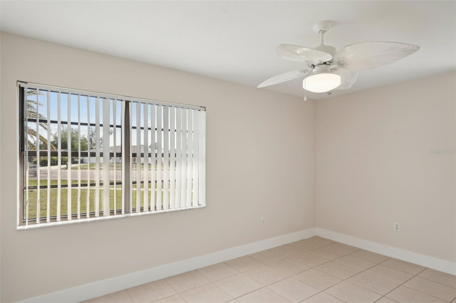 One or more photo(s) has been virtually staged. One or more photo(s) has been virtually staged. This immaculate and well-maintained 3-bedroom, 2-bath home sits on a spacious corner lot, offering both comfort and convenience. The heart of the home is the beautifully designed kitchen, seamlessly opening to the dining and family room—perfect for entertaining. A versatile bedroom with double doors at the entry can serve as a home office or flex space. Both bathrooms have been updated with elegant new tile and quartz countertops. The primary suite features a generous walk-in closet with built-ins and a private en-suite bath. Step outside to enjoy the inviting, large screened lanai—ideal for relaxing or hosting guests. Best of all, this home is in a NO FLOOD ZONE, meaning NO FLOOD INSURANCE REQUIRED! Don’t miss this incredible opportunity!