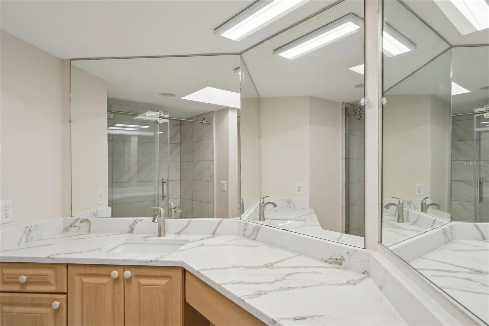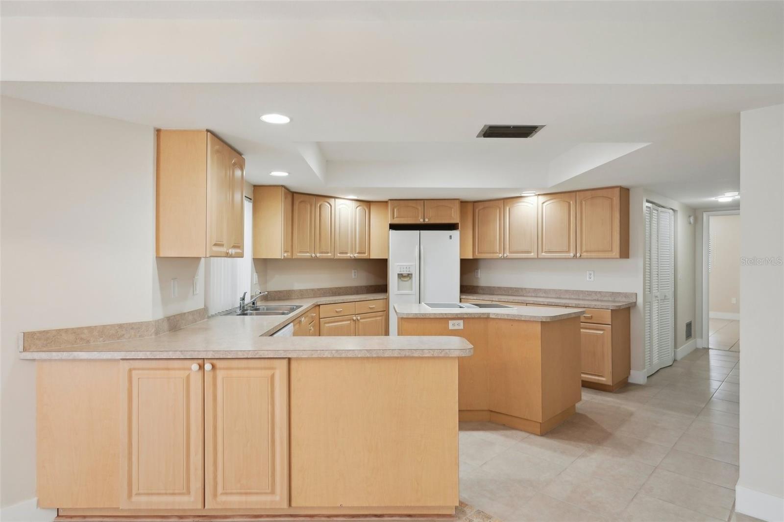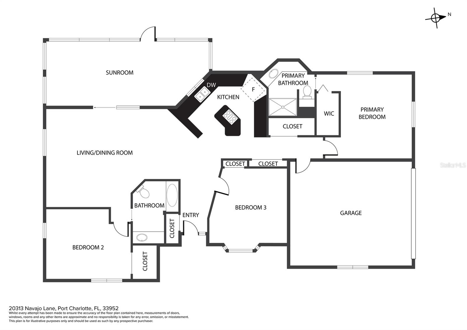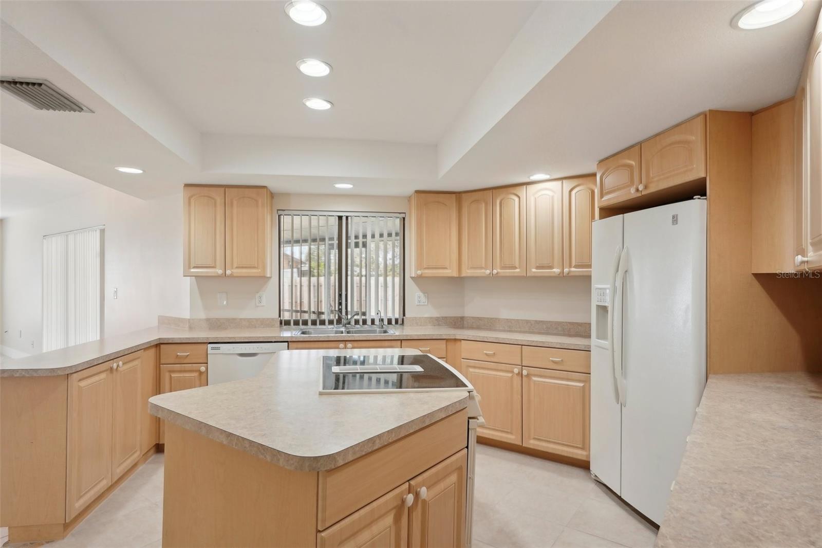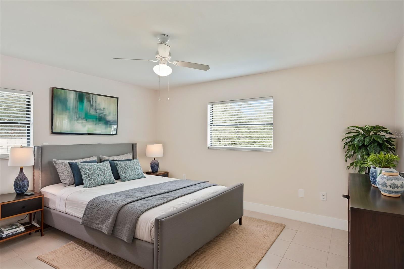 One or more photo(s) has been virtually staged. One or more photo(s) has been virtually staged. This immaculate and well-maintained 3-bedroom, 2-bath home sits on a spacious corner lot, offering both comfort and convenience. The heart of the home is the beautifully designed kitchen, seamlessly opening to the dining and family room—perfect for entertaining. A versatile bedroom with double doors at the entry can serve as a home office or flex space. Both bathrooms have been updated with elegant new tile and quartz countertops. The primary suite features a generous walk-in closet with built-ins and a private en-suite bath. Step outside to enjoy the inviting, large screened lanai—ideal for relaxing or hosting guests. Best of all, this home is in a NO FLOOD ZONE, meaning NO FLOOD INSURANCE REQUIRED! Don’t miss this incredible opportunity!
