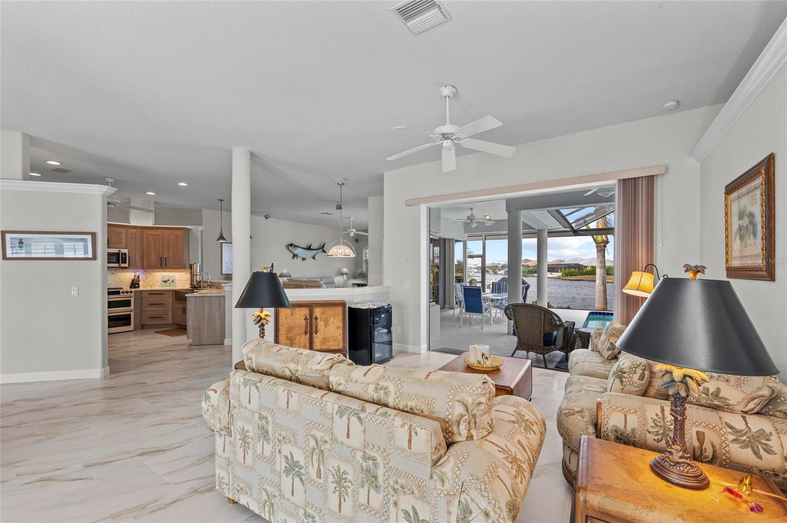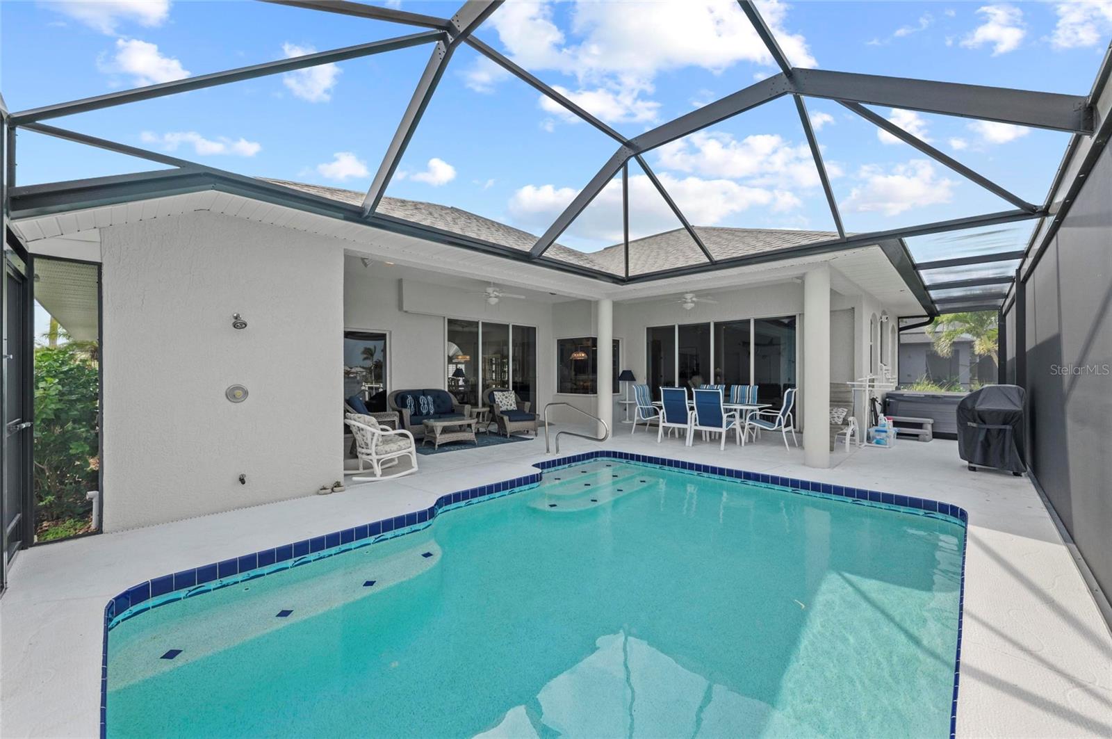 Look at these views! You get 83.9' of water frontage! This amazing waterfront home, originally built in 2002 and completely renovated in 2022, seamlessly blends modern luxury with coastal charm. Perfectly designed for waterfront living, this 3-bedroom, 2.5-bathroom retreat offers direct access to the water and boasts a brand-new dock (2024) equipped with water, electricity, and a 9,000 pound capacity boat lift—making boating effortless. The waters are perfect for reeling in tarpon, large snooks and redfish for the kites... you will find two under water snook lights on the dock. Enjoy stunning sunset views from the west-facing lanai, where a screen-enclosed, resurfaced salt pool (2020) with a heater and a child safety fence, and a brand-new salt water hot tub (2024), create the ultimate private oasis. The lanai was rescreened in 2025 ensuring uninterrupted relaxation, and allowing you to fully embrace the serene waterfront setting as the beautiful breeze brushes by. Step through the stained-glass French doors into a formal dining area illuminated by a stylish chandelier. Beyond the entryway, an open-concept main living space impresses with soaring ceilings, crown molding, and tile flooring. Thoughtfully designed for comfort and entertaining, this area seamlessly connects the living room, kitchen, and dining spaces. Expansive sliding glass doors blur the lines between indoor and outdoor living, providing breathtaking views of the pool and water from nearly every angle. At the heart of the home, the completely remodeled gourmet kitchen is a chef’s dream. It showcases custom Welbourne cabinetry, quartz countertops, a decorative tile backsplash, and striking pendant lighting over the breakfast bar. Top-of-the-line GE Café Series appliances—including a double oven, induction cooktop, dishwasher, and microwave—pair with under-cabinet lighting to enhance both functionality and ambiance. The bedrooms are accented with vinyl plank flooring with the primary suite serving as a perfect retreat, offering direct patio and pool access, a stylish tray ceiling, and an en suite bathroom designed for ultimate relaxation and is handicapped accessible. This spa-like space features a modern dual-sink vanity, a deep soaking tub, and a separate walk-in shower. A reverse osmosis water softener system (2022) ensures top-quality water throughout the home, while a security system adds peace of mind. Meticulously maintained, the home’s exterior was freshly painted in 2023 and features a well-fed irrigation system that keeps the lush landscaping vibrant year-round. Designed for effortless indoor-outdoor living, the expansive lanai is partially covered and features two ceiling fans, ample seating space, and a poolside half-bath. Whether you're savoring the tropical ambiance, soaking in the panoramic water views, or setting sail from your private dock, this is Florida waterfront living at its finest. Don’t miss this rare opportunity to own a slice of paradise! Come see, come sigh and make this waterfront home your own!