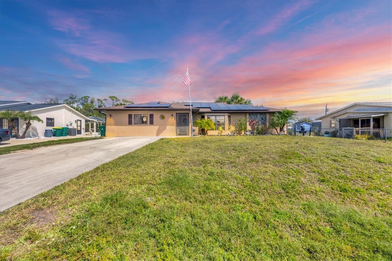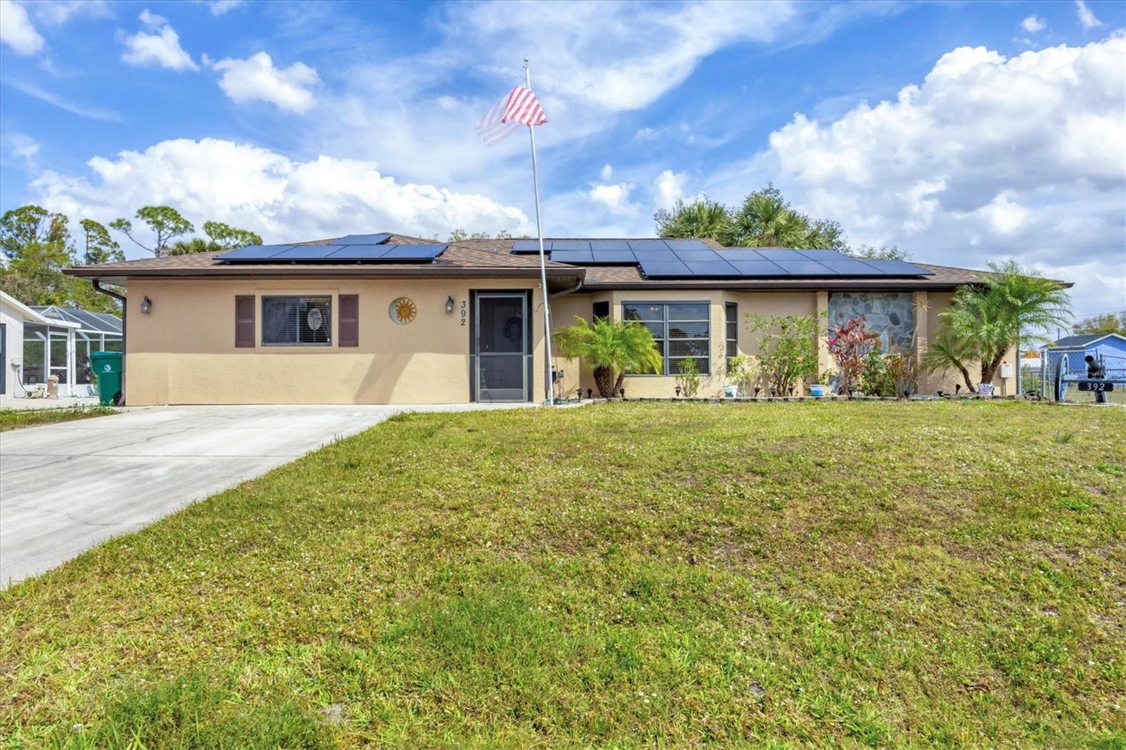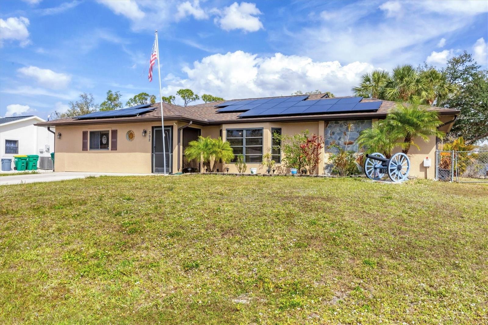 Now offered at just $360,000, 392 Yeager Street presents one of the best values in Port Charlotte for a three-bedroom, two-and-a-half-bath pool home with nearly 2,000 square feet of living space, extensive upgrades, and exceptional energy efficiency. Priced at just $187.98 per square foot, this home stands out among its competition—not just in price, but in long-term savings and lifestyle features. The seller will pay off the entire $70,400 solar loan at closing, transferring full ownership of a 17.1 KW solar system installed in 2021. This results in dramatically reduced utility costs, with the current owners paying only $74 per month in total fixed charges, compared to $350 to $450 per month for similarly sized homes without solar. These savings begin on day one. Inside, the home offers 1,915 square feet of living space plus 259 square feet of covered outdoor living. A vaulted ceiling design and split-bedroom floorplan create an open and functional layout. The living room features bright bow-framed windows, and the professionally converted garage adds a spacious sunken family room complete with a jet tub and half bath, perfect for guests, in-laws, or a home office. While the home no longer has a traditional garage, the added living area and abundant outdoor storage more than compensate. The kitchen was renovated in 2022 with earthstone countertops, a tiled backsplash, recessed lighting, and a walk-in pantry. Luxury vinyl plank flooring extends through the kitchen, living room, and family room, creating continuity and ease of maintenance. Key recent updates include a new roof in 2022, an HVAC system in 2020, an updated electrical panel, and a pool heat pump installed in 2019. Step outside to enjoy a true backyard oasis. The 338-square-foot heated Gunite pool with PebbleTec finish is enclosed in a 651-square-foot screened aluminum cage. The outdoor living space includes a shaded 209-square-foot lanai, a raised deck with swing, a tranquil fishpond, and a hot tub. Two outbuildings—a 12x24 Handi-House workshop and an additional shed, both with garage doors—offer ample space for hobbies, tools, and equipment. Situated on a quiet, low-traffic residential street, this home is not in a flood zone and has never sustained hurricane damage. It is just one block from Liberty Elementary School and within convenient distance of shopping, parks, and local attractions, including Port Charlotte Beach Park (5.7 miles), Fisherman’s Village in Punta Gorda (9.2 miles), Englewood Beach and Manasota Key (20 miles), and Boca Grande (26 miles). The seller is also offering to pay half of the owner's title policy at closing, adding extra value for buyers in today’s market. With its rare combination of energy efficiency, recent updates, generous outdoor living space, and strong price-per-square-foot value, this home stands out among the competition. Schedule your private showing today and experience all that 392 Yeager Street has to offer.