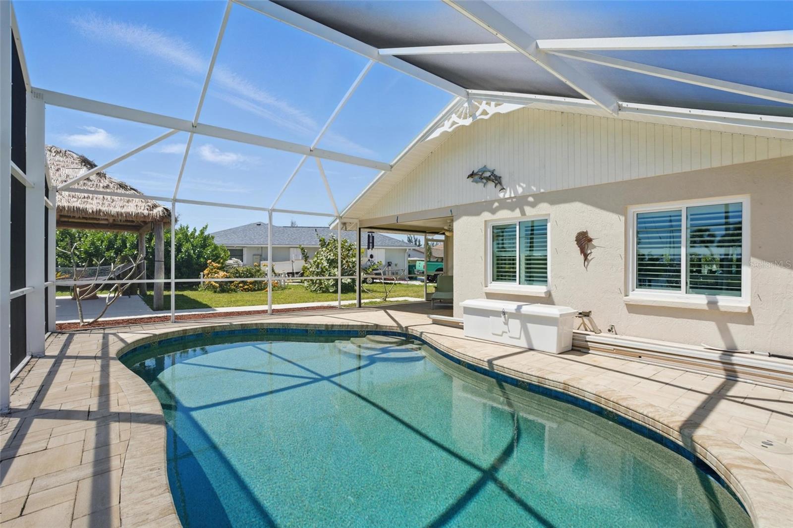 Welcome to your dream waterfront retreat in the sought-after South Gulf Cove community. This stunning 2-bedroom, 2-bath home offers the perfect blend of boating access, serene water views, and comfortable living, making it an ideal oasis for both year-round residents and seasonal visitors. Situated on an oversized lot, this property boasts two private docks and direct sailboat access, allowing you to cruise through the canal with ease. Whether you're an avid boater or love waterfront living, this home delivers the ultimate Florida lifestyle. Step inside to discover a bright, open split-floor plan with tile flooring throughout and nearly 1,400 square feet under air. Large impact-resistant windows and doors, paired with elegant plantation shutters, provide abundant natural light while ensuring security and energy efficiency. To your right, the dining area welcomes you with charming bay windows, creating a cozy space for meals with a view. The kitchen features granite countertops, solid wood cabinetry, a built-in desk, and ample storage for all your culinary needs. Flowing seamlessly into the spacious living room, this open-concept design is perfect for hosting family and friends. The primary suite is a true retreat, offering a headboard window for extra light, sliding glass doors with direct pool access, a vanity sink, a separate walk-in closet, and a private step-in shower. On the opposite side of the home, the guest bedroom, guest bath, and laundry room provide privacy and convenience. The guest bedroom boasts a large closet and plenty of natural light, while the indoor laundry room leads directly to the garage for easy access. As you step outside to the spacious salt pool, you're greeted by breathtaking views of the water, your two private boat docks, and the charming tiki hut—a perfect spot to unwind, sip your morning coffee, or enjoy the evening breeze while watching boats pass by. To the left of the pool area, a large storage shed provides ample space to store tools, fishing gear, and water toys, keeping your outdoor space organized and functional. With 153 feet of seawall and direct sailboat access, this home is truly a boater’s paradise. You’ll love the convenience of stepping right from your backyard onto your boat, ready to explore the beautiful waterways of South Gulf Cove and beyond. This move-in-ready home is an opportunity you don’t want to miss. At this price, it's time to move. Schedule your private tour today!