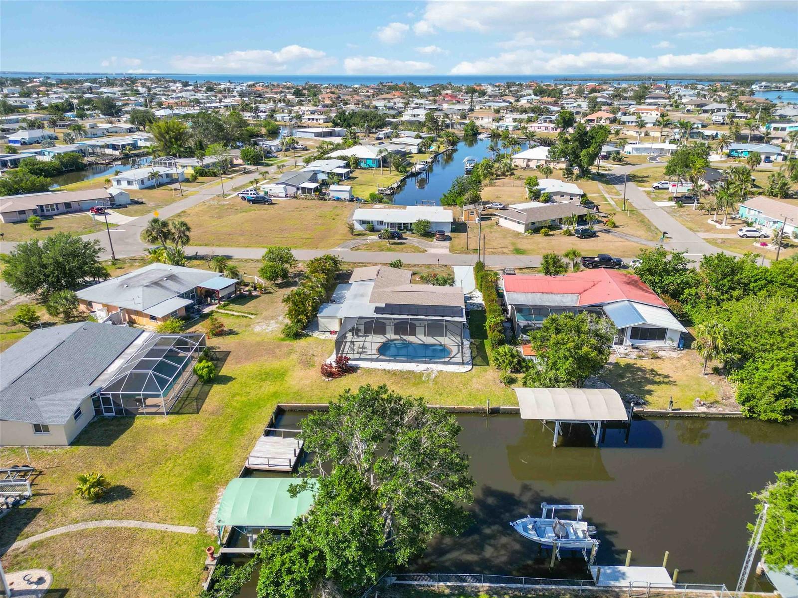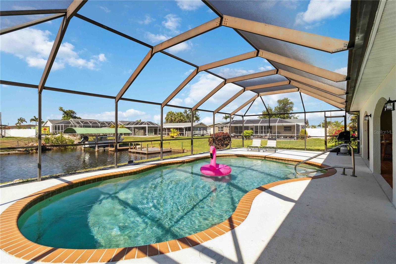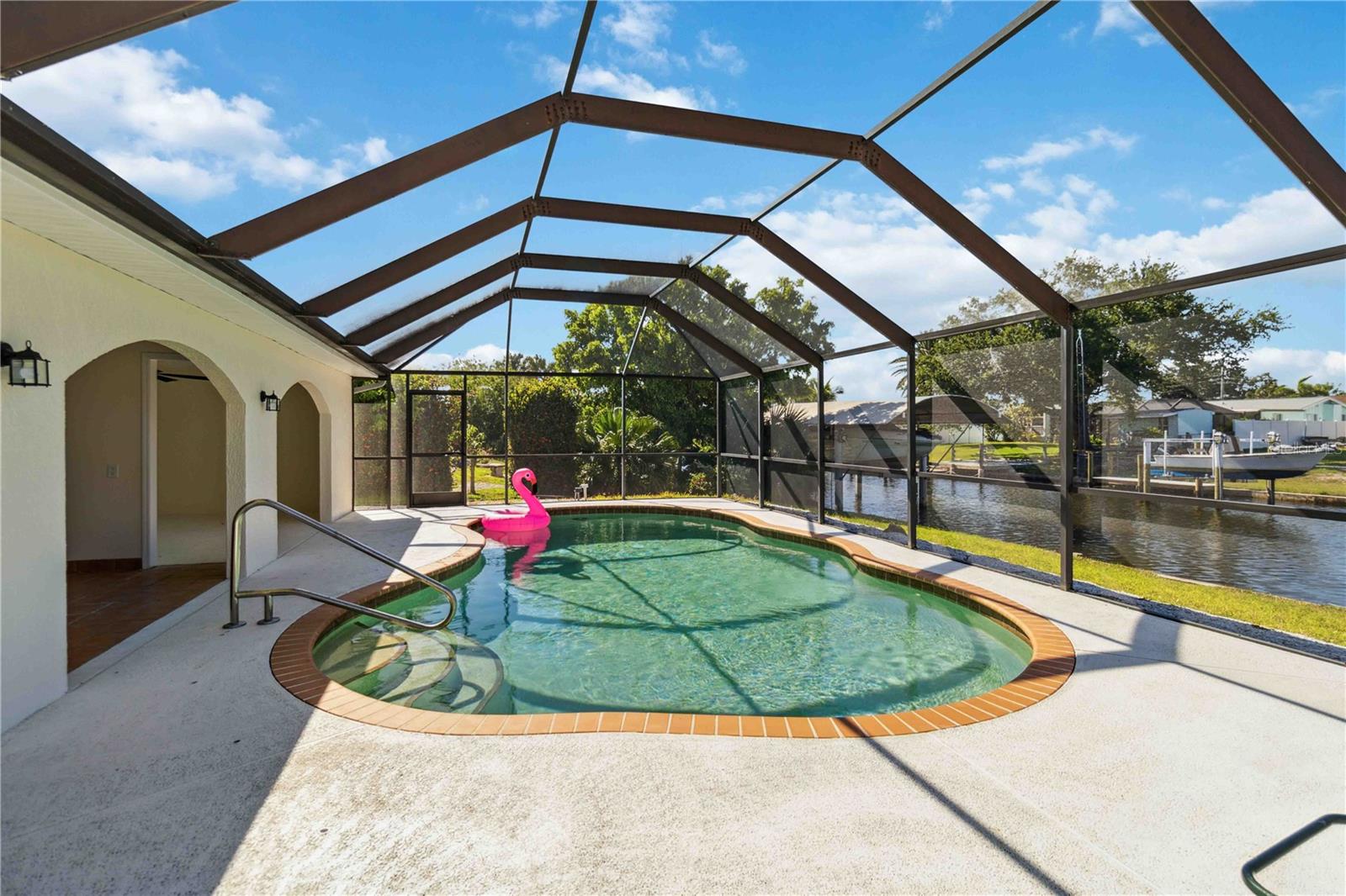 Owners are motivated! Bring all reasonable offers! Experience the ultimate in Florida waterfront living with this elegant 3-bedroom, 2-bathroom pool home nestled along the scenic Sunrise Waterway in beautiful Port Charlotte. Boasting 80 feet of pristine canal frontage with direct access to Charlotte Harbor and the Gulf of Mexico, this exquisite residence blends luxury, comfort, and convenience in a tranquil setting. Step inside to discover an expansive great room adorned with French doors that open onto a stunning lanai and saltwater pool, creating a seamless transition between indoor and outdoor living. A wall of sliders reveals a bright Florida room perfect for relaxed dining and entertaining. The beautifully updated galley kitchen features brand-new stainless steel appliances, granite countertops, and custom cabinetry, ideal for preparing meals while enjoying views of the water. The thoughtfully converted garage now serves as a luxurious primary suite, complete with built-in closets and a stylish, newly remodeled ensuite bath. On the opposite side of the home, two serene guest bedrooms share a modern bathroom with a walk-in shower. The outdoor oasis includes a covered lanai with brand-new screens, a screened-in saltwater pool, and a private 80-foot cement seawall, offering the perfect space to add a dock and boat lift for effortless days on the water. Additional highlights include a 12x8 storage shed, a newer roof with solar panels and A/C system from 2022, and a freshly painted exterior/interior. All windows are hurricane impact. A stackable washer and dryer add everyday convenience, discreetly tucked away in a closet off the primary suite. Located in a quiet, well-maintained neighborhood close to shops, dining, beaches, golf, and top-rated schools, this home is just minutes from Port Charlotte Beach Park with its public beach, playgrounds, tennis courts, boat ramp, and more. This is your chance to own a slice of waterfront paradise—where style, function, and location meet in perfect harmony.