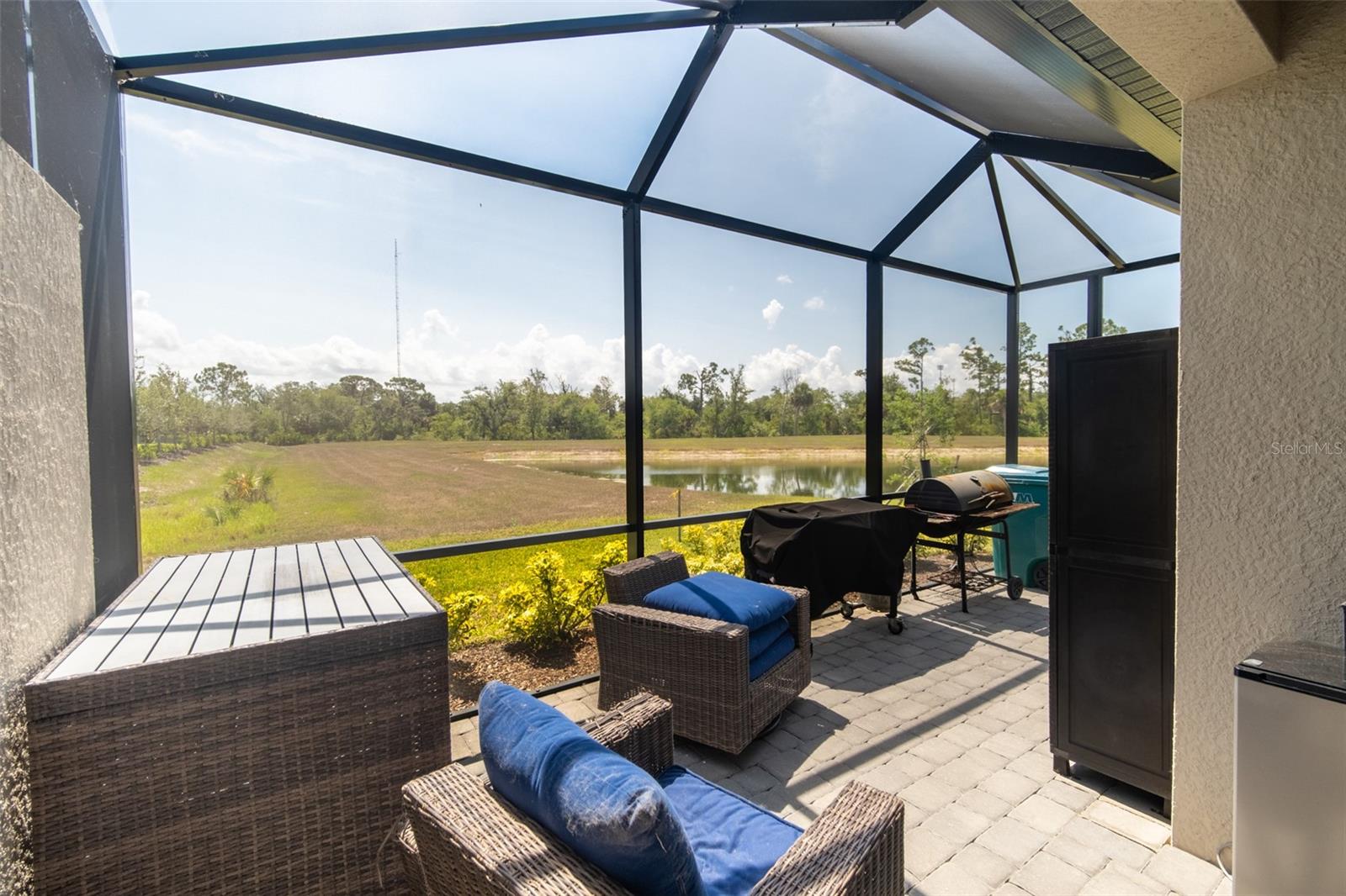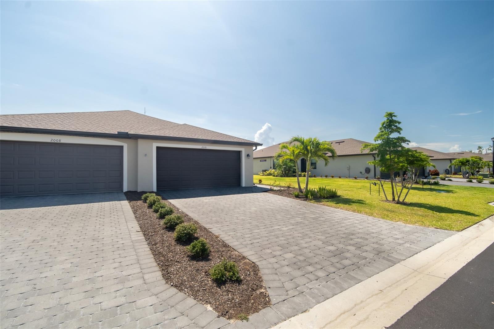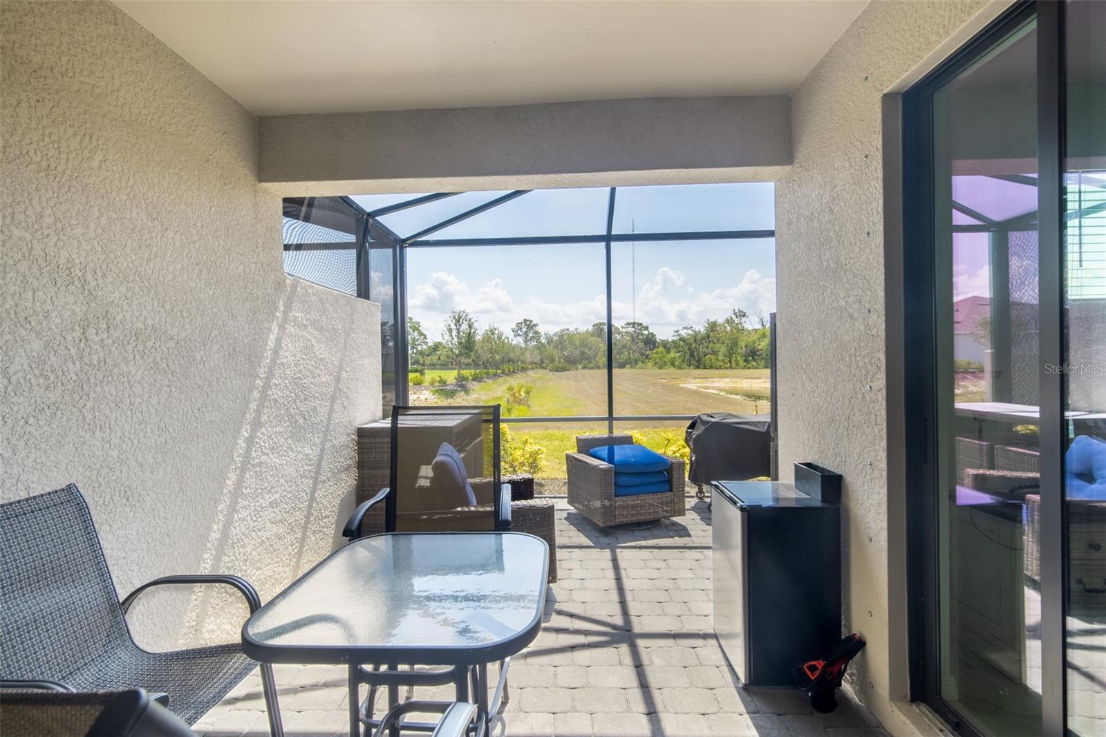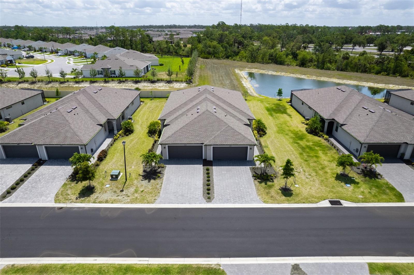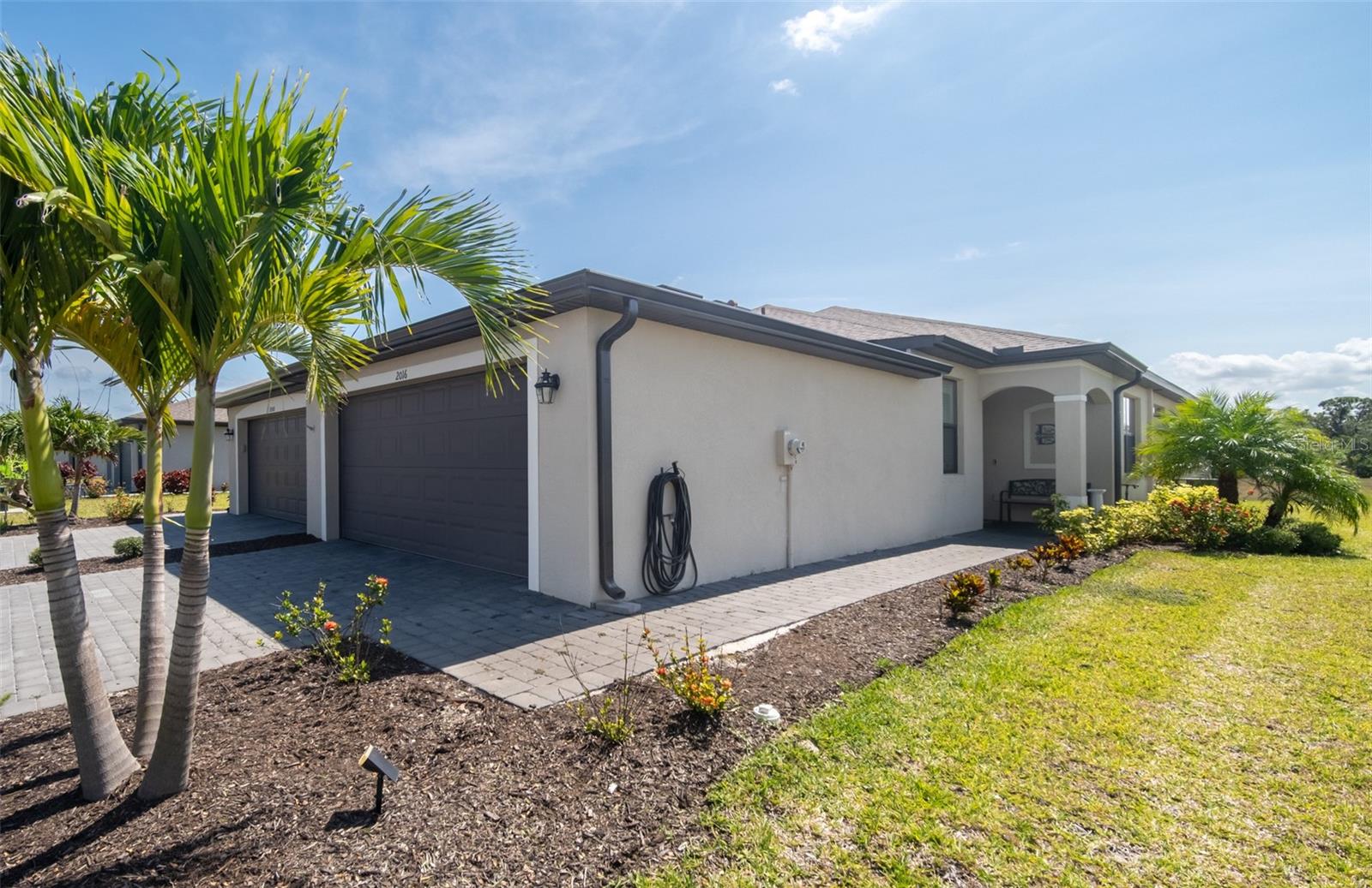 This almost new villa is located in the popular gated community of Biscayne Landing and offers 2 bedrooms, 2 bathrooms, and a versatile den/office that is currently being used as a third bedroom/guest room. The home features a split floor plan with high ceilings, ceramic tile throughout, and an open-concept layout ideal for both family living and entertaining. The kitchen is a standout with 42-inch cabinets, crown molding, stainless steel appliances, granite countertops, a large stainless sink, and a spacious pantry. The garage is 20'x20' and the paver driveway adds excellent curb appeal. The primary suite is generously sized with double windows, sliding doors to the lanai, a large walk-in closet, dual vanities, a large glass-enclosed walk-in shower, and a private water closet. The guest bedroom offers an oversized closet and fan. Second full bathroom with granite counters and a tiled tub/shower combo. French doors open to the den, adding flexibility for use as an office, third bedroom, or flex space. Enjoy a private, oversized lot with a covered lanai and extended screened patio finished in low-maintenance pavers, with peaceful nature and lake views. The HOA covers Wi-Fi, basic cable, lawn maintenance, community facilities, city water/sewer, reclaimed irrigation water, and more—with no CDD fees or flood insurance required. Located near top shopping, dining, beaches, golf, and entertainment. Come see how you can live like you're on vacation every day.