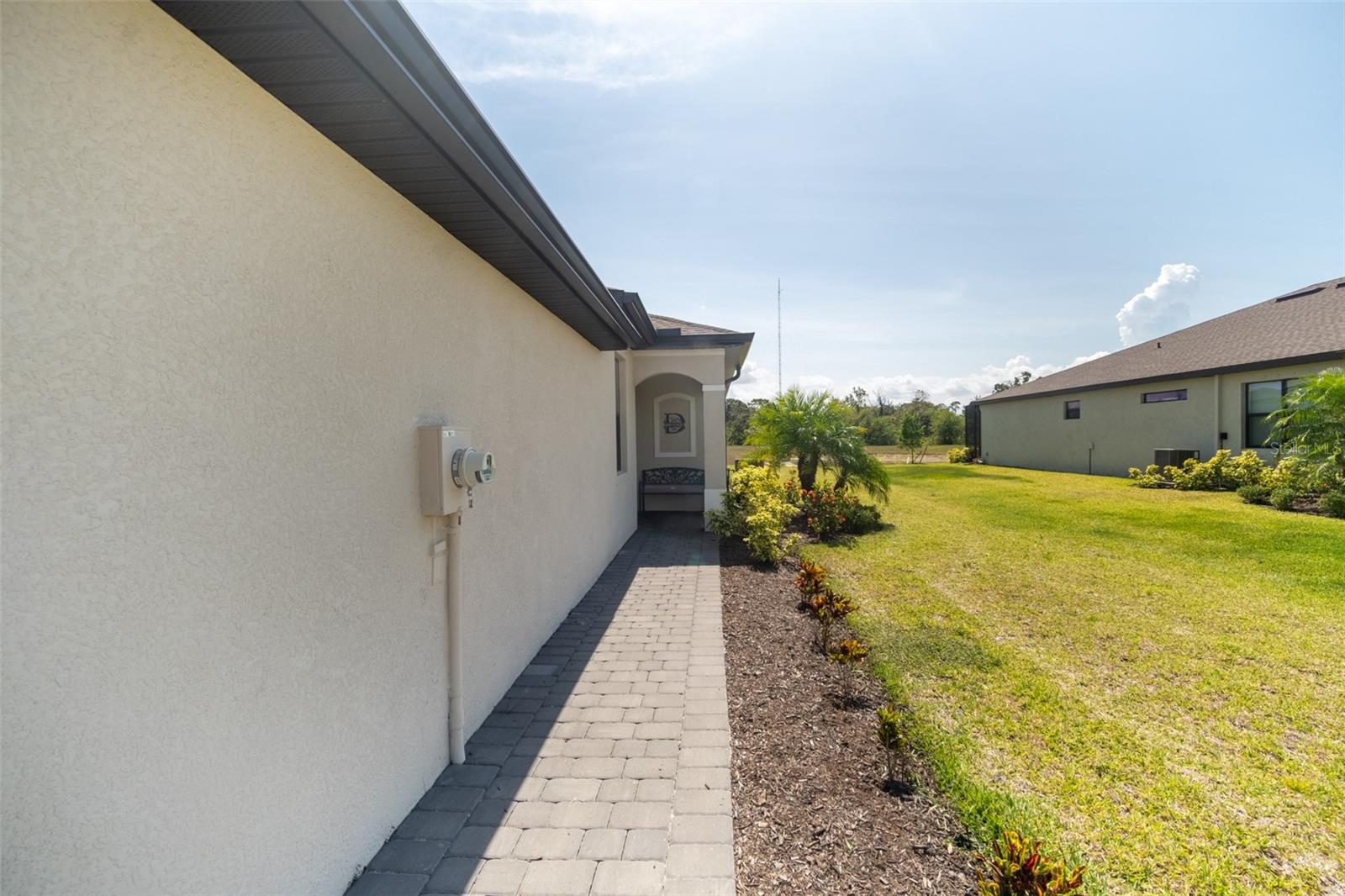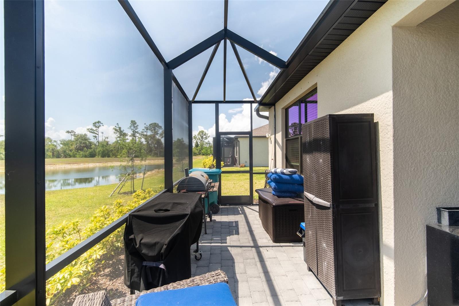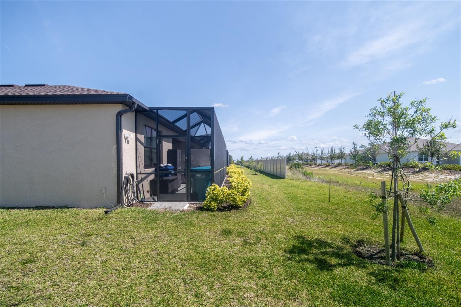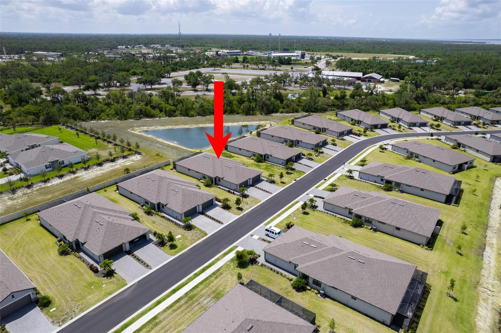This almost new villa is located in the popular gated community of Biscayne Landing and offers 2 bedrooms, 2 bathrooms, and a versatile den/office that is currently being used as a third bedroom/guest room. The home features a split floor plan with high ceilings, ceramic tile throughout, and an open-concept layout ideal for both family living and entertaining. The kitchen is a standout with 42-inch cabinets, crown molding, stainless steel appliances, granite countertops, a large stainless sink, and a spacious pantry. The garage is 20'x20' and the paver driveway adds excellent curb appeal. The primary suite is generously sized with double windows, sliding doors to the lanai, a large walk-in closet, dual vanities, a large glass-enclosed walk-in shower, and a private water closet. The guest bedroom offers an oversized closet and fan. Second full bathroom with granite counters and a tiled tub/shower combo. French doors open to the den, adding flexibility for use as an office, third bedroom, or flex space. Enjoy a private, oversized lot with a covered lanai and extended screened patio finished in low-maintenance pavers, with peaceful nature and lake views. The HOA covers Wi-Fi, basic cable, lawn maintenance, community facilities, city water/sewer, reclaimed irrigation water, and more—with no CDD fees or flood insurance required. Located near top shopping, dining, beaches, golf, and entertainment. Come see how you can live like you're on vacation every day.