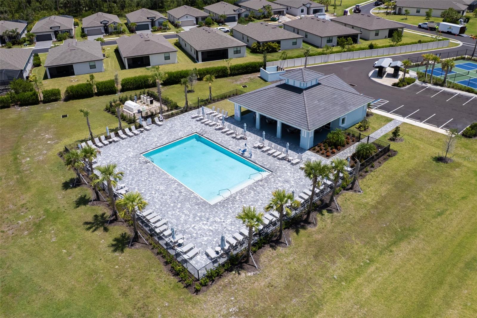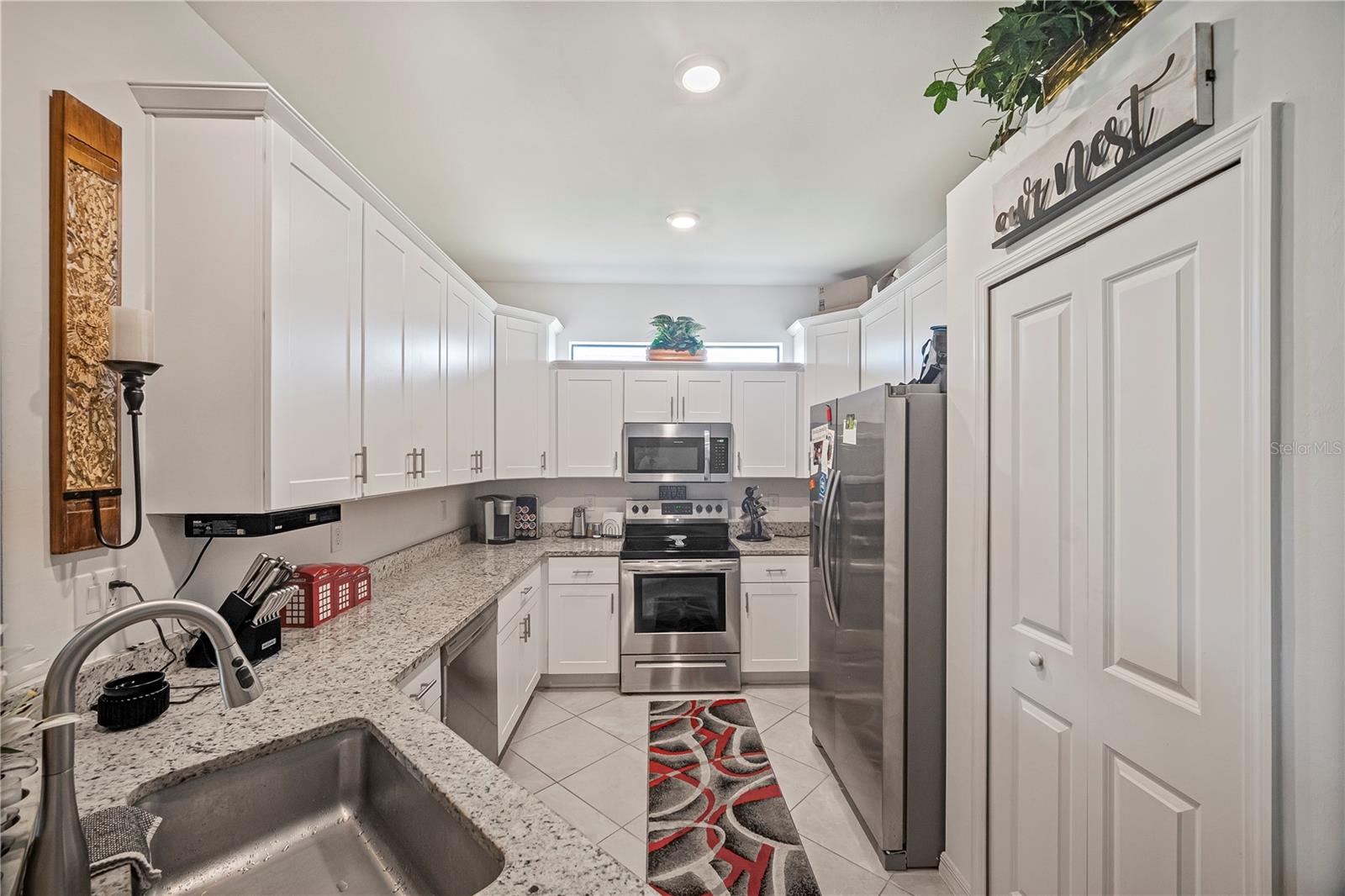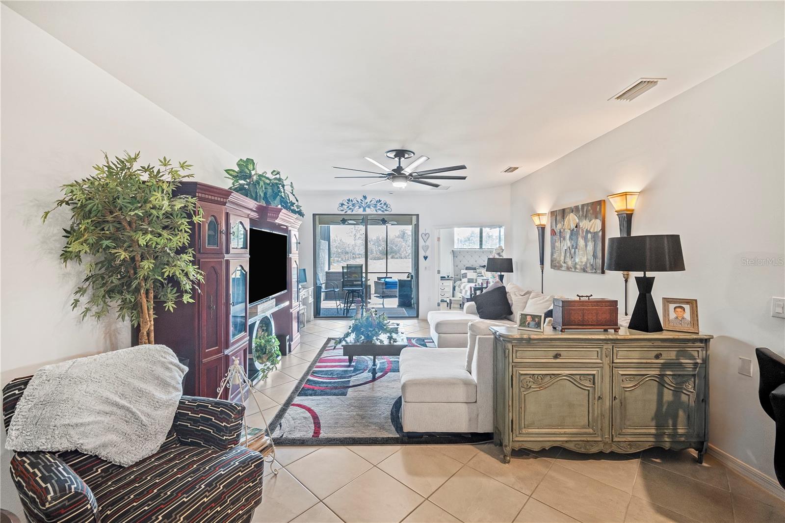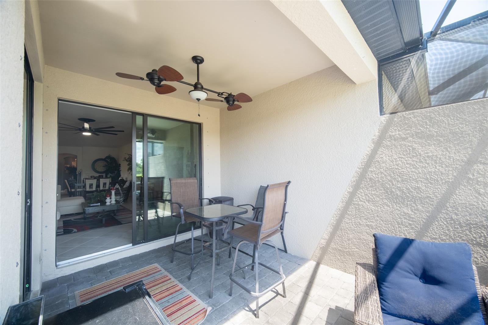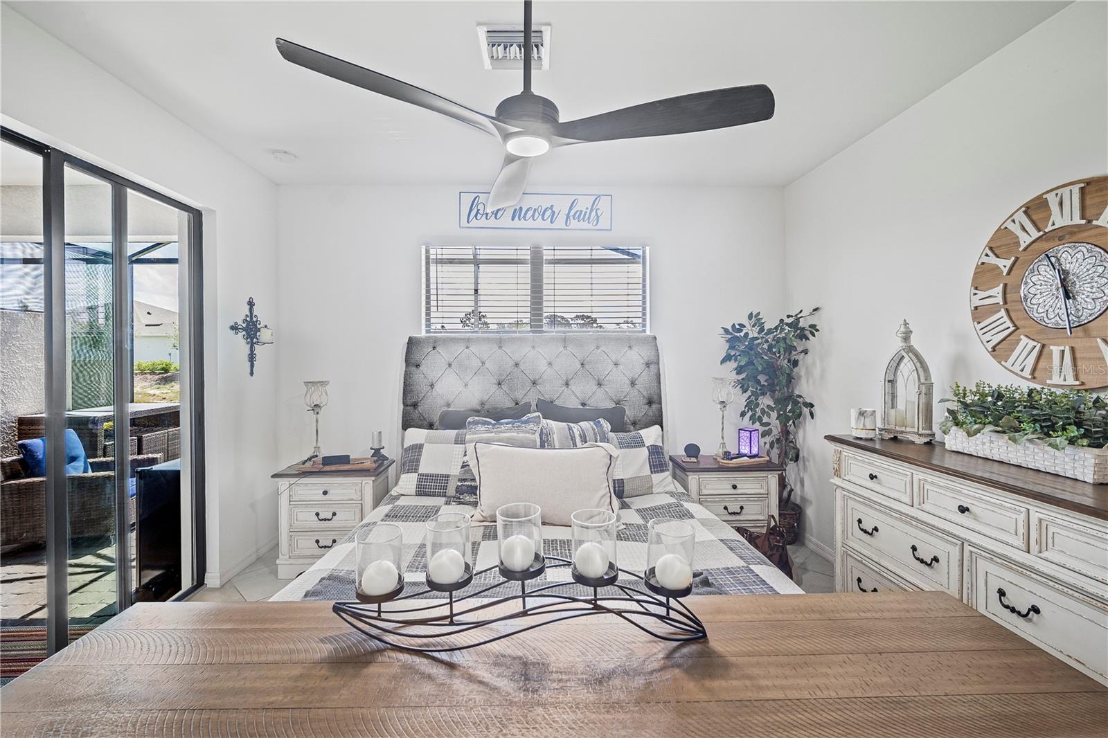 This almost new villa is located in the popular gated community of Biscayne Landing and offers 2 bedrooms, 2 bathrooms, and a versatile den/office that is currently being used as a third bedroom/guest room. The home features a split floor plan with high ceilings, ceramic tile throughout, and an open-concept layout ideal for both family living and entertaining. The kitchen is a standout with 42-inch cabinets, crown molding, stainless steel appliances, granite countertops, a large stainless sink, and a spacious pantry. The garage is 20'x20' and the paver driveway adds excellent curb appeal. The primary suite is generously sized with double windows, sliding doors to the lanai, a large walk-in closet, dual vanities, a large glass-enclosed walk-in shower, and a private water closet. The guest bedroom offers an oversized closet and fan. Second full bathroom with granite counters and a tiled tub/shower combo. French doors open to the den, adding flexibility for use as an office, third bedroom, or flex space. Enjoy a private, oversized lot with a covered lanai and extended screened patio finished in low-maintenance pavers, with peaceful nature and lake views. The HOA covers Wi-Fi, basic cable, lawn maintenance, community facilities, city water/sewer, reclaimed irrigation water, and more—with no CDD fees or flood insurance required. Located near top shopping, dining, beaches, golf, and entertainment. Come see how you can live like you're on vacation every day.