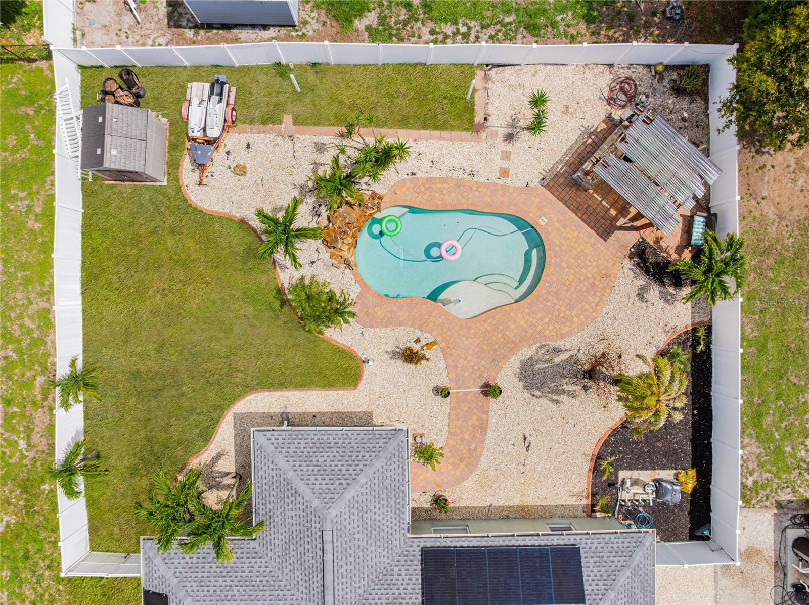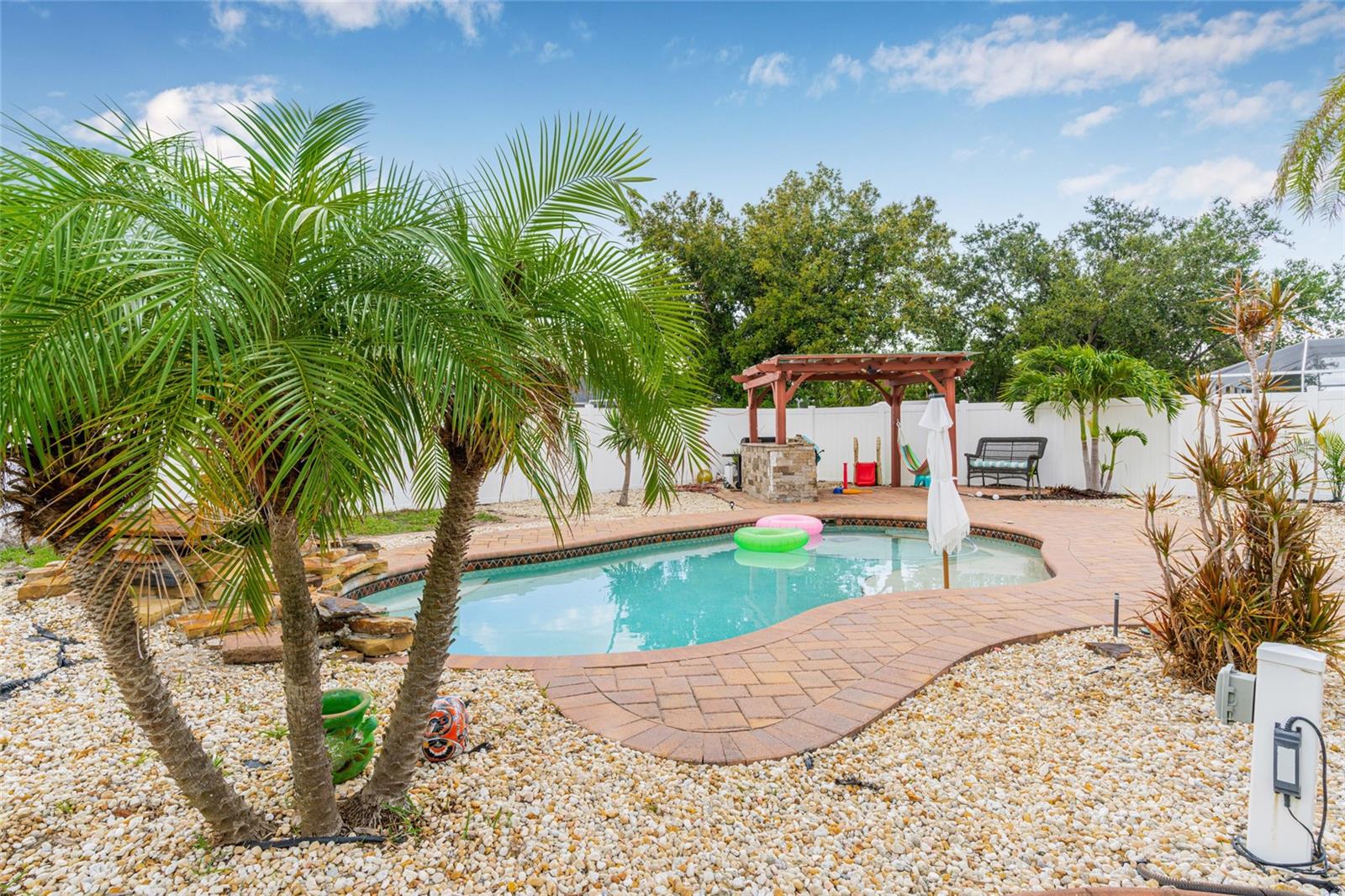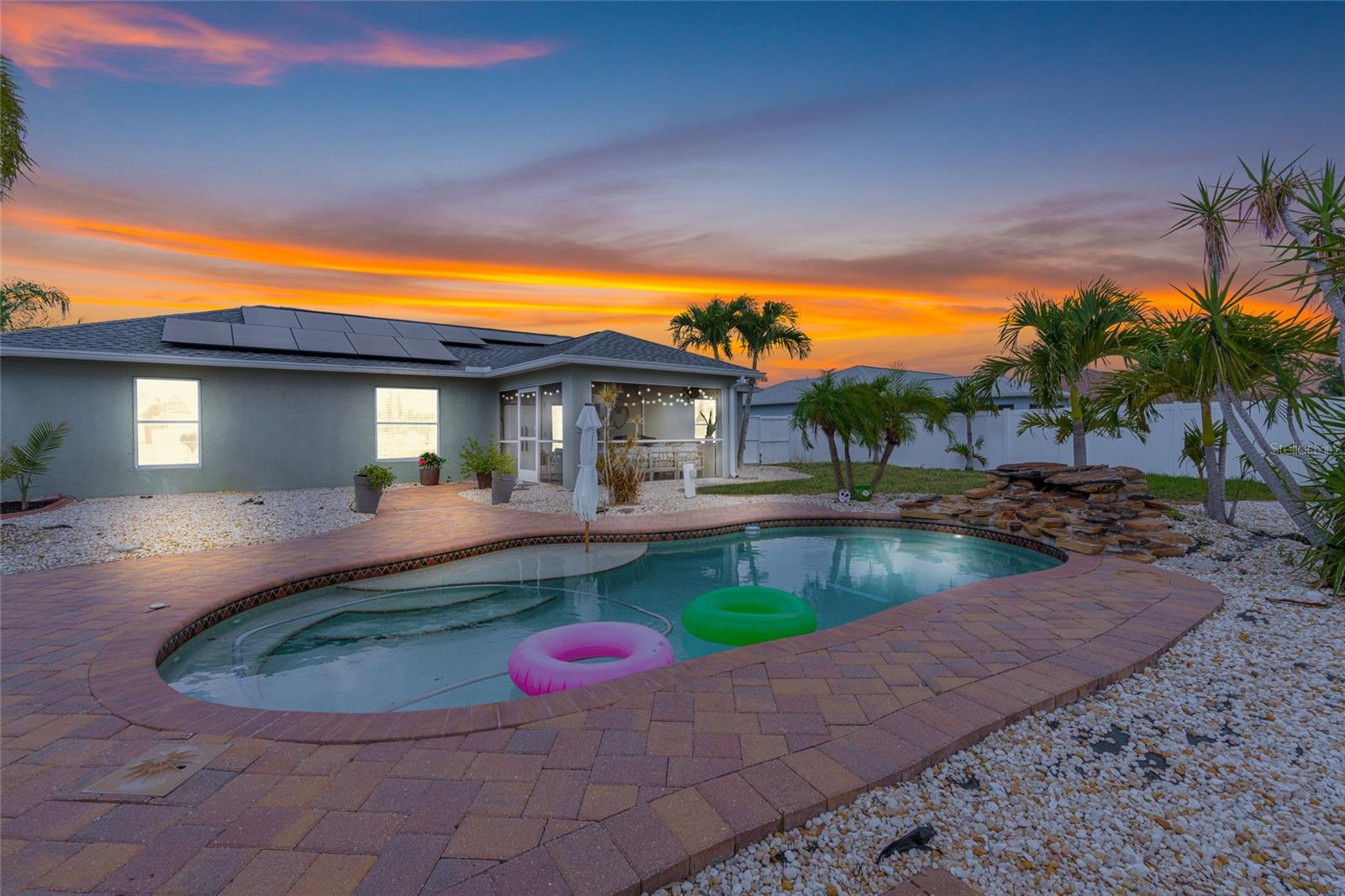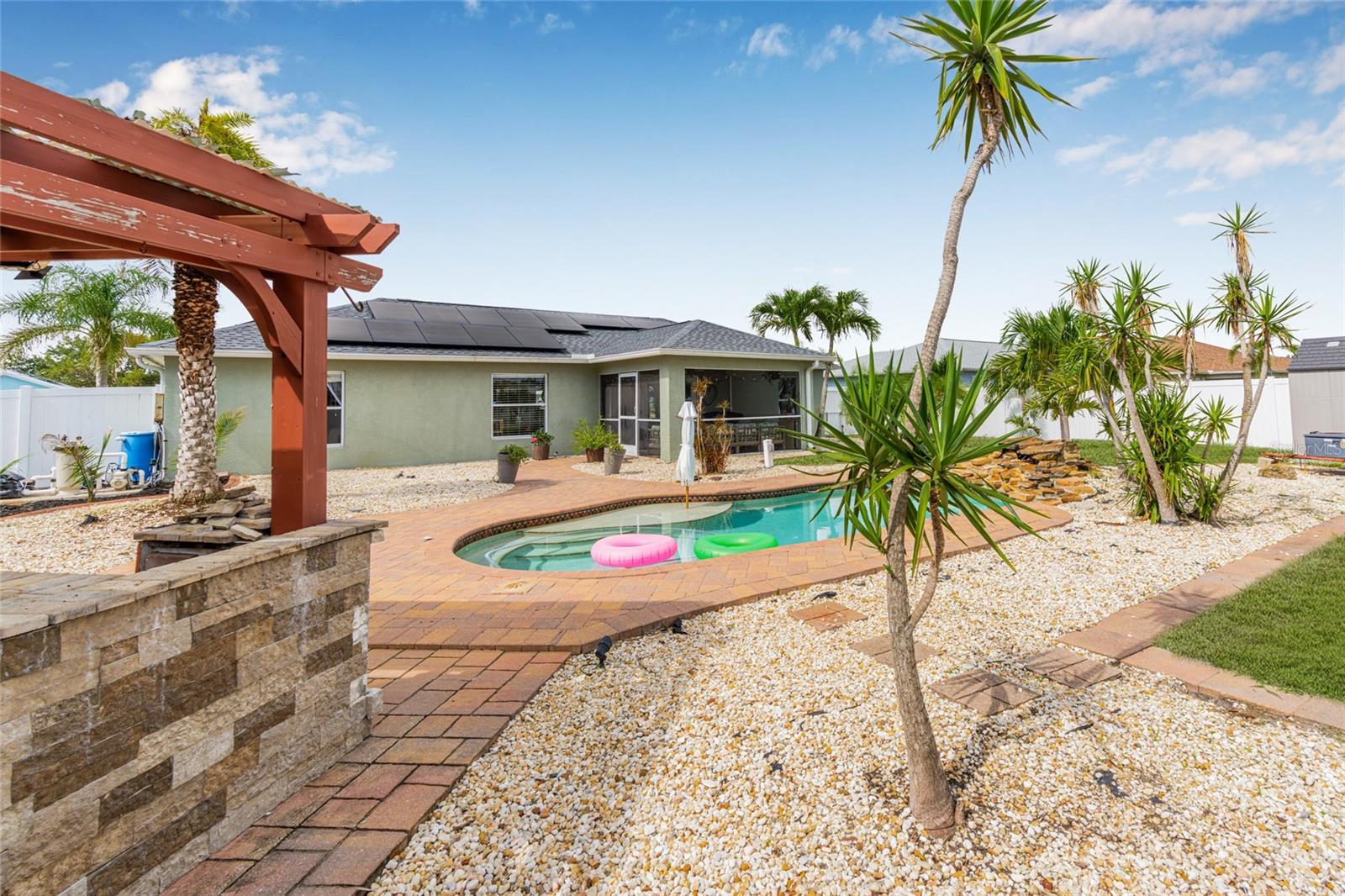 $50 POWER BILLS!!! SOLAR IS PAID OFF!! THIS is your Florida oasis! In the charming Gulf Cove, this perfect little fenced in pool home has received ALL THE LOVE over the last few years. Freshly (and tastefully) painted interior with wide trim and crown throughout, UNDERGROUND power lines, NEW Salt water pool system, NEW pool pump, NEW ROOF in 2023, NEW HVAC in 2023 and soon-to-be-paid off SOLAR SYSTEM (power bills well under $100), the sellers have spared no expense replacing BIG systems to get this home ready for the next 15+ years. There is room for anything and everything you could want and need. Three very adequately sized bedrooms, two full baths, an island kitchen with a breakfast bar, dining area and the perfect living room for cozying it up at the end of the day or the weekends. The screened in Florida porch is adorable and whimsical and the perfect segway from the comfort of the AC into the tropical paradise that is the back yard and pool area of 6178 Coliseum Blvd. Enjoy the tranquil sight and sounds of the waterfall feature and hang out in the poolside cabana for some shade! You may not want to go back inside. Do not snooze on this home and make it yours today!