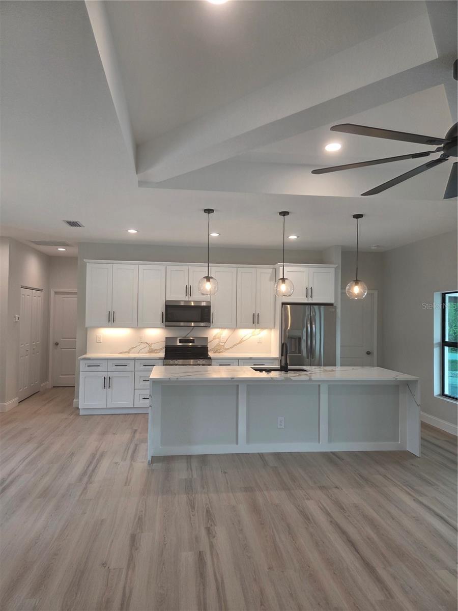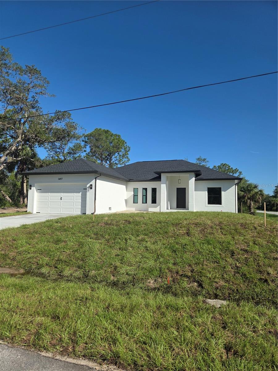 Pre-Construction. To be built. Pre-Construction. To be built. This brand-new block construction home offers the perfect blend of style, comfort, and convenience—just steps from the golf course and less than a mile to the public boat ramp! Situated on an oversized corner lot, this 3 bedroom / 2 bathroom / 2-car garage residence is thoughtfully designed with an open floor plan, soaring 9+ foot ceilings, and elegant coffered details. The spacious living and dining areas flow seamlessly into a modern kitchen featuring granite countertops, 36” cabinets, a 10-foot island with double sink, and stainless steel appliances. The luxurious primary suite boasts a spa-like bath with a freestanding tub, walk-in shower, private water closet, and dual vanities. Additional highlights include durable vinyl flooring throughout, beautifully tiled bathrooms, hurricane impact windows and glass doors, and a 3D shingle roof. Enjoy year-round indoor-outdoor living on the covered lanai. With beaches, parks, shopping, and dining nearby—plus no HOA, no CDD, and no construction loan required—this home offers true Florida living at its finest. Photos shown are of a similar model; finishes may vary.