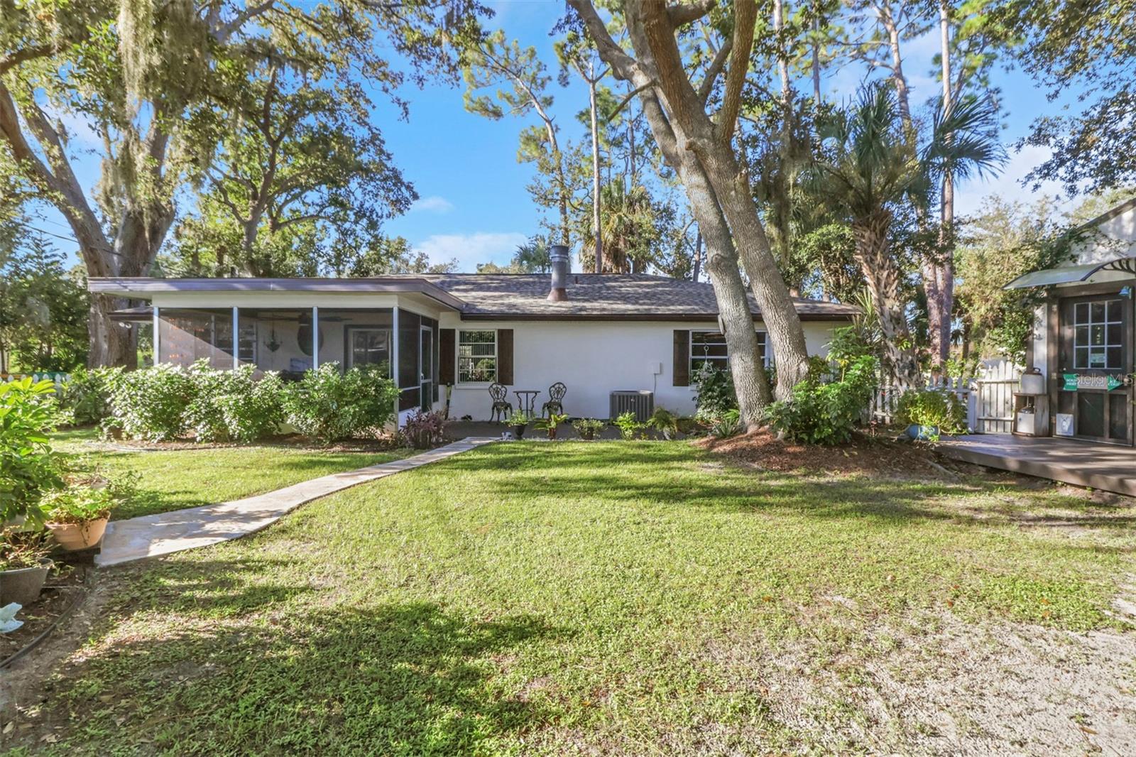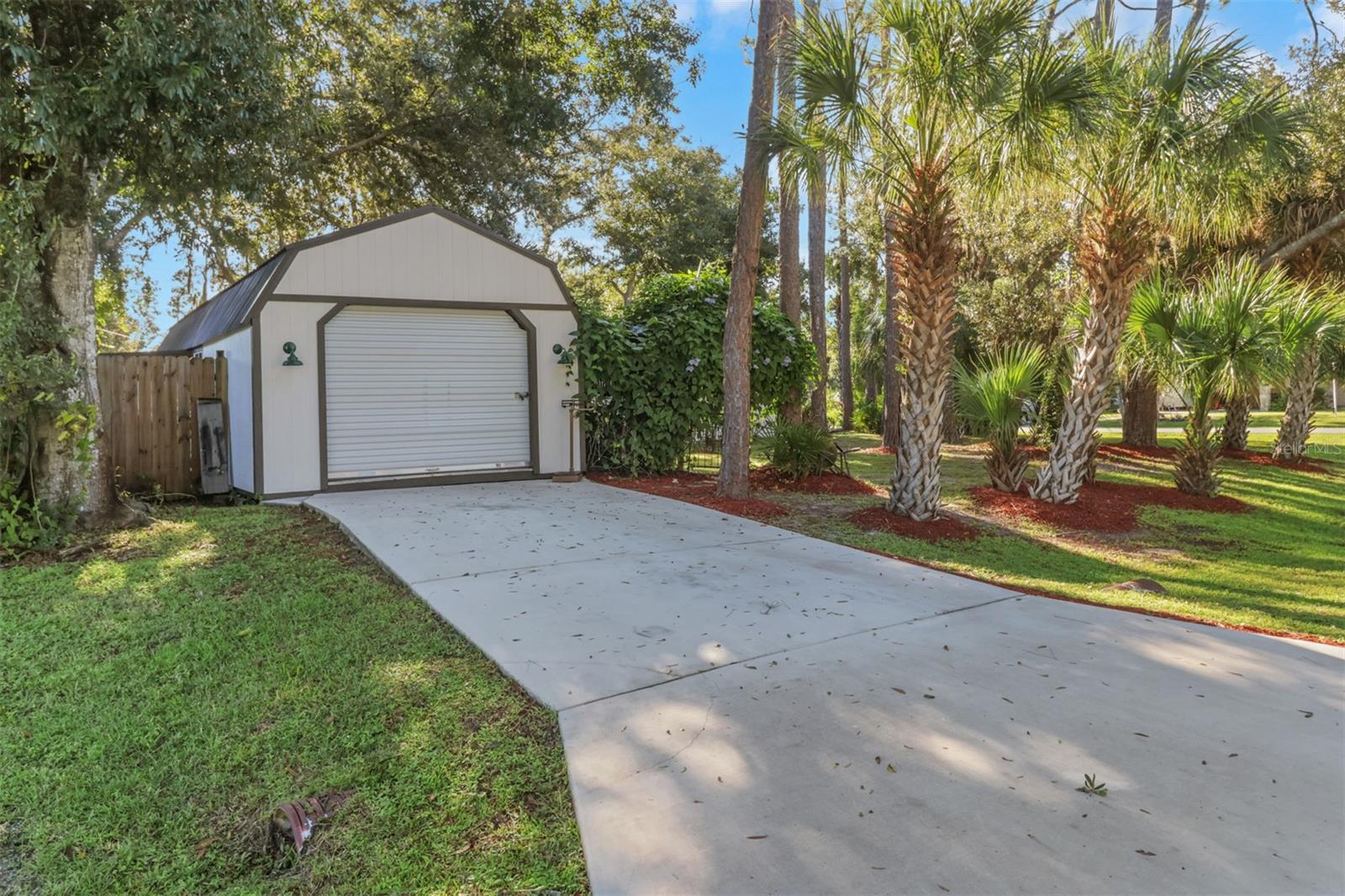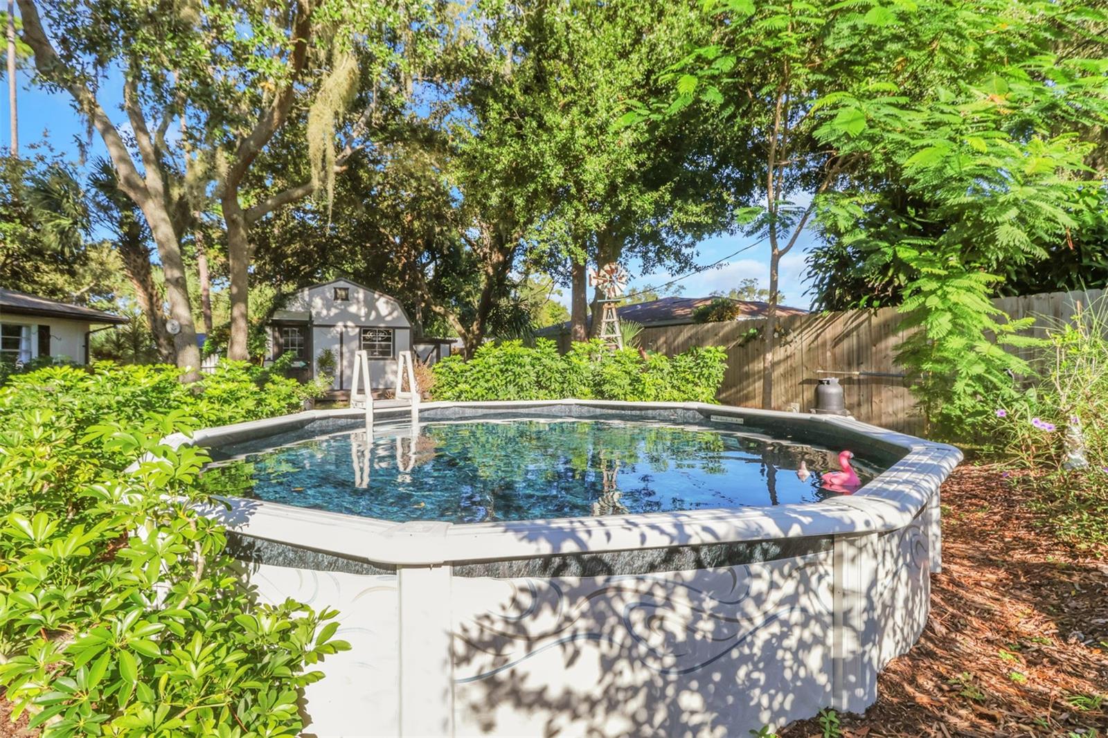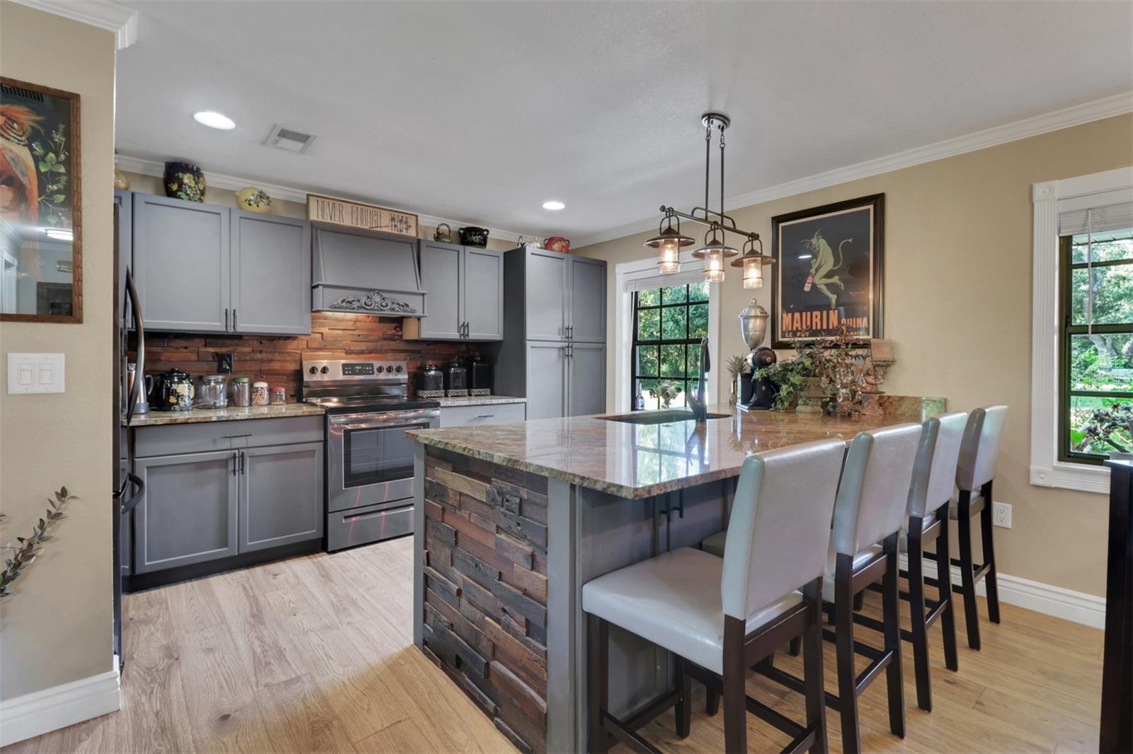 Beautifully updated Port Charlotte home sits on an oversized corner lot with two driveways, including a second entrance that guides you straight to the impressive 14’x40’ garage can be used as a workshop, man cave, or custom bar area.Roof replaced July 2022 and newer AC system. Home has been updated within the last 4 years and features laminate flooring, crown molding, tall baseboards, flutings/rosettes, and new interior doors. Kitchen offers granite countertops, updated cabinets, granite sink with disposal, and multiple refrigerators including one in the garage and a mini fridge in the bar. Stainless appliances plus washer and dryer included. Bathrooms are completely updated with new tubs/showers, sinks, cabinets, and fixtures. Lighted trey ceiling, new light fixtures, and ceiling fans throughout. Many beautiful trees and landscaping throughout the property. Backyard features a partially sunken 15’ pool with new liner, pump, and motor (2023), updated landscaping, fencing, and mature trees for added shade and privacy. Property is not in a flood zone. Conveniently located close to shopping, dining, and entertainment yet tucked away in a quiet neighborhood with great neighbors.