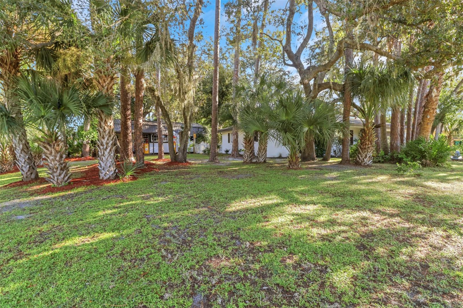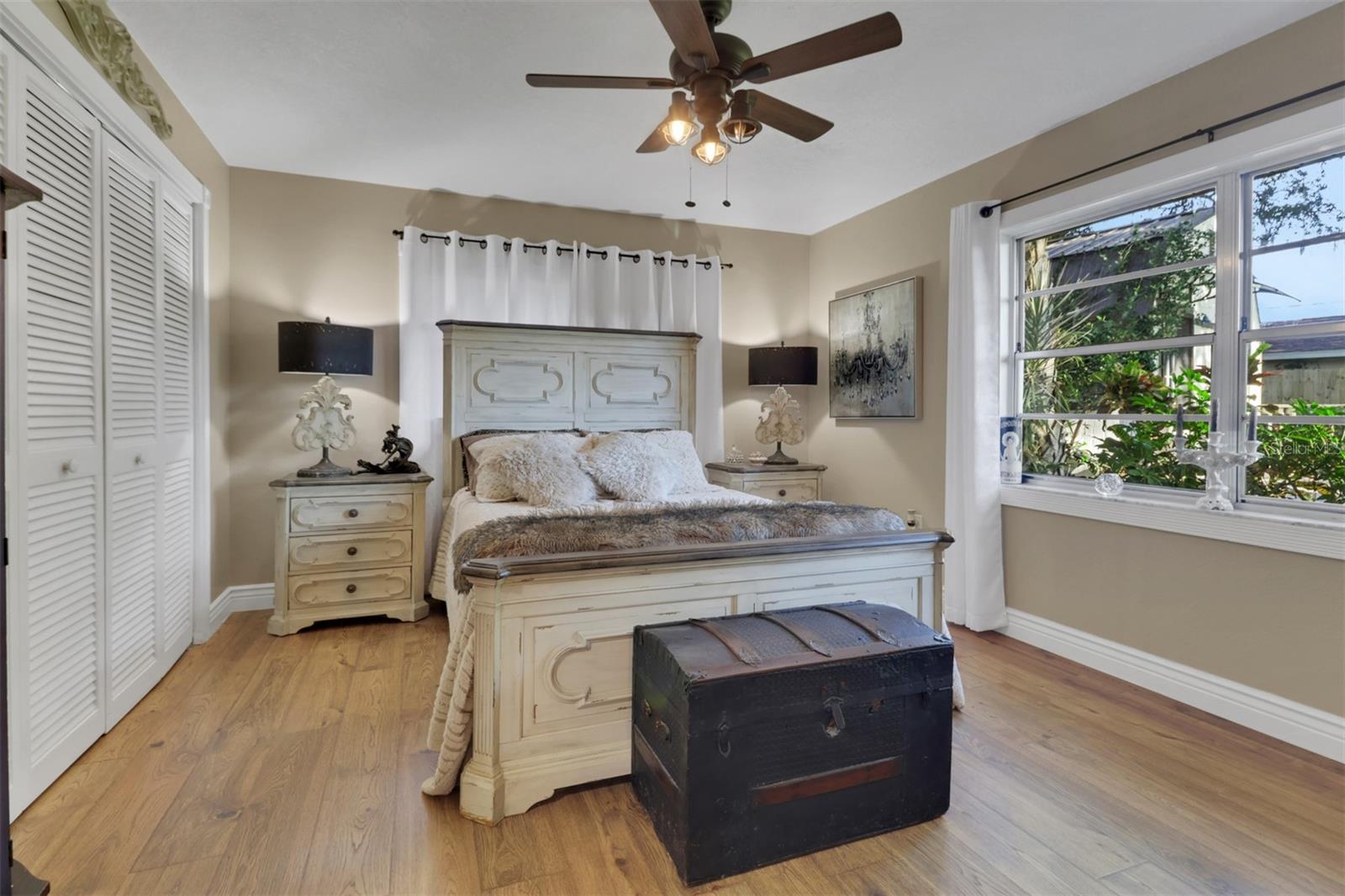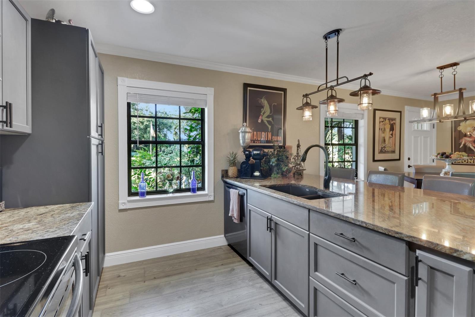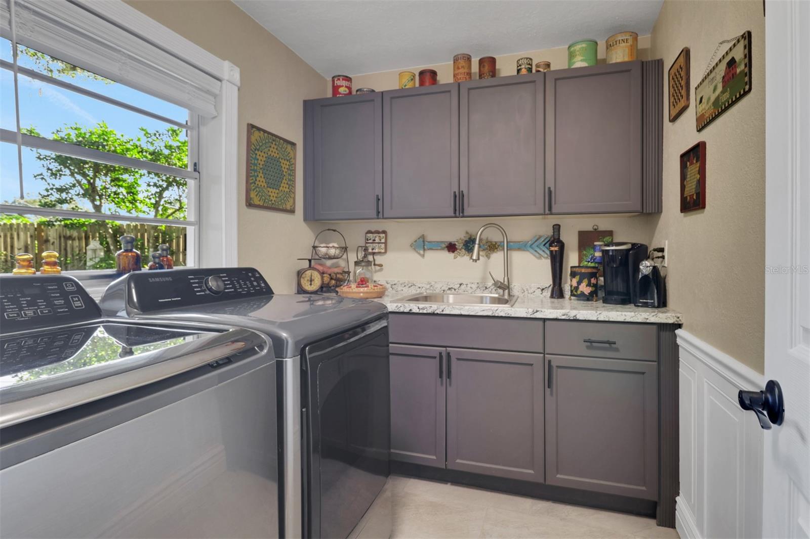 Beautifully updated Port Charlotte home sits on an oversized corner lot with two driveways, including a second entrance that guides you straight to the impressive 14’x40’ garage can be used as a workshop, man cave, or custom bar area.Roof replaced July 2022 and newer AC system. Home has been updated within the last 4 years and features laminate flooring, crown molding, tall baseboards, flutings/rosettes, and new interior doors. Kitchen offers granite countertops, updated cabinets, granite sink with disposal, and multiple refrigerators including one in the garage and a mini fridge in the bar. Stainless appliances plus washer and dryer included. Bathrooms are completely updated with new tubs/showers, sinks, cabinets, and fixtures. Lighted trey ceiling, new light fixtures, and ceiling fans throughout. Many beautiful trees and landscaping throughout the property. Backyard features a partially sunken 15’ pool with new liner, pump, and motor (2023), updated landscaping, fencing, and mature trees for added shade and privacy. Property is not in a flood zone. Conveniently located close to shopping, dining, and entertainment yet tucked away in a quiet neighborhood with great neighbors.