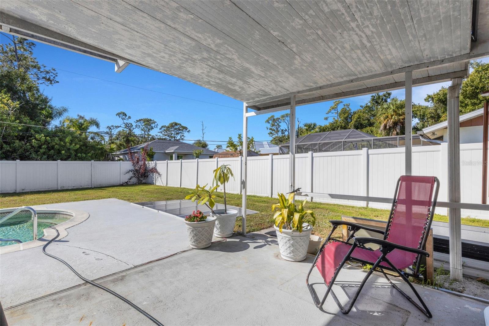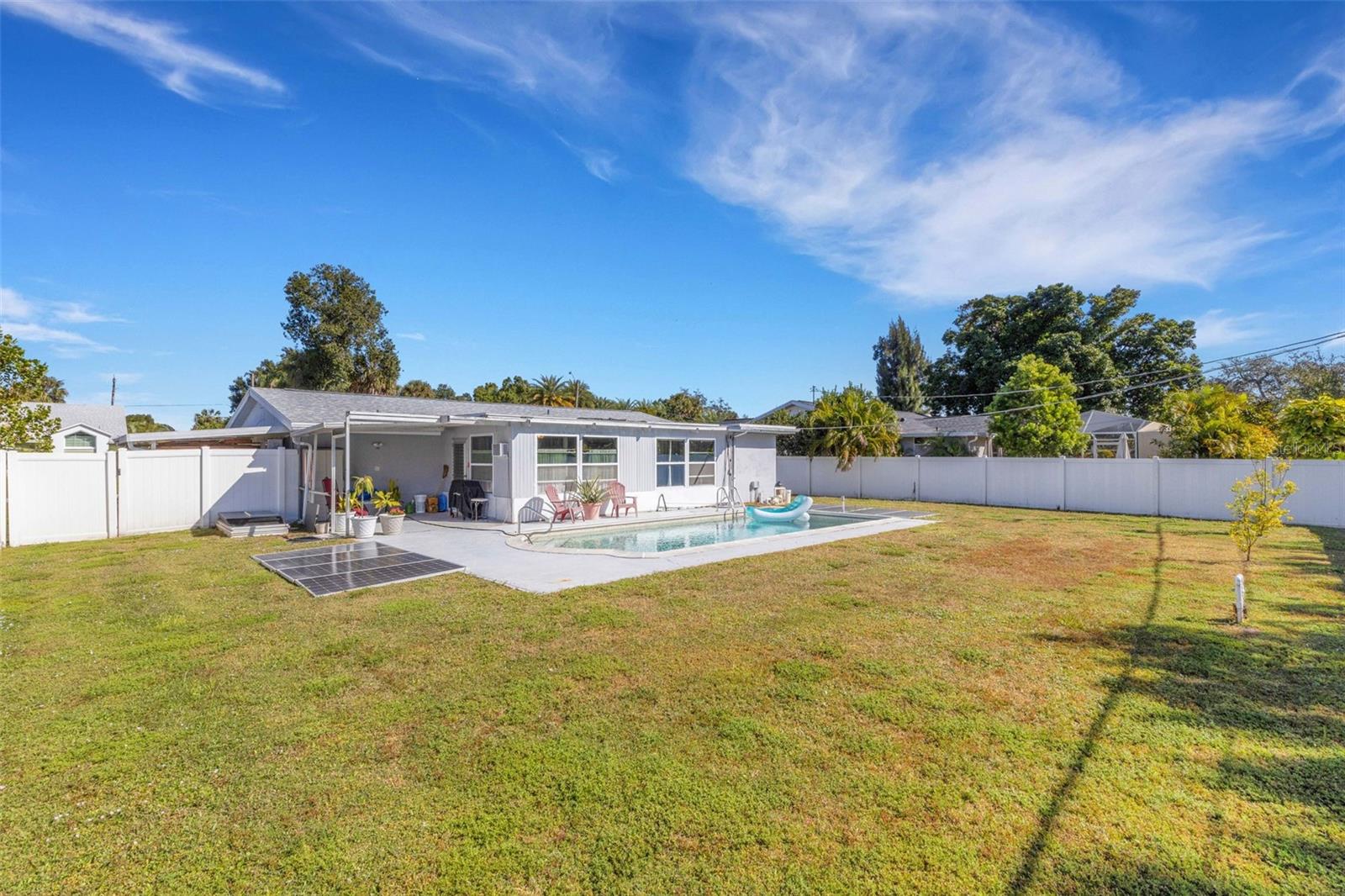 Come see this well cared for home. All renovations were done thoughtfully and properly. This home is equipped with many newer features: roof, hurricane windows and doors-except back lanai door (2021), Dishwasher, toilets, main electric panel, mini split air conditioning units in each bedroom and living room, and vinyl fence (2022), kitchen floor, cabinets, all undercounter plumbing along with their shut-off valves, convection and air frier range, and refrigerator (2023), water heater, main bathroom shower, carport, interior repainted (2024) flat roof and pool pump (2025). The home is also equipped with electric panels and a battery backup. The ceiling air ducts were closed and are scheduled to be completed with paint. The home has low insurance, has great water drainage, has not had water intrusion, and is located in an advantageous place. It is NOT located on a main road but is close to all the amenities one could need and want: shopping, restaurants, recreational activities, walking, and more. Many residents enjoy walking in the neighborhood. This home is a great deal prepared for it's next owner to enjoy worry free. You can view it through a virtual walk-through or by scheduling a personal visit. Come see for yourself and make an offer today.