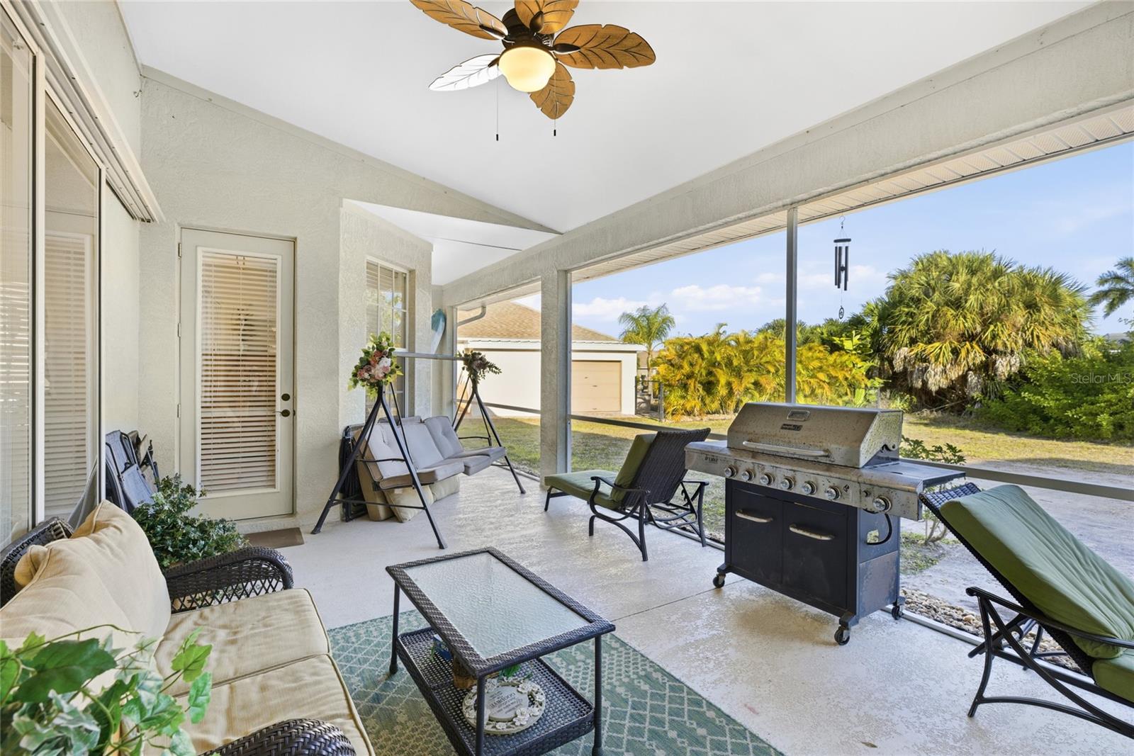 Situated on an oversized corner lot with a private wooded backdrop, this 3-bedroom plus den, 2-bath home offers space, flexibility, and peace of mind with no HOA. Inside, soaring ceilings and hard-surface flooring throughout create an open, light-filled environment that feels both spacious and easy to maintain. Large sliding doors connect the interior to a spacious covered and screened lanai, extending the living space outdoors while overlooking the backyard. The kitchen is thoughtfully designed with black stainless steel appliances, ample cabinetry, a pantry, and a wraparound breakfast bar that serves as a natural gathering space. A bright breakfast nook with large windows adds warmth and functionality. The split-bedroom floor plan enhances privacy, with the primary suite offering generous space, multiple windows, and a well-appointed en-suite bathroom featuring dual vanities, a soaking tub, and an expansive walk-in shower. Guest bedrooms are tucked behind a pocket-door close-off, ideal for visitors or multi-generational living. One rear guest bedroom includes impact windows and a sliding glass door. A dedicated den with glass-panel doors adds versatility, perfect for a home office, media room, or flex space. Major updates include a new roof in 2023 and an HVAC system approximately three years old, providing added confidence for the next owner. The backyard offers privacy and room to personalize, while maintaining a low-maintenance, natural setting. Conveniently located near waterways, parks, and Port Charlotte’s boating and outdoor amenities, this home combines space, privacy, and practical updates in a setting well suited for full-time living or seasonal use. **THIS PROPERTY QUALIFIES FOR A 1% LENDER INCENTIVE IF USING PREFERRED LENDER. INQUIRE FOR MORE DETAILS.**