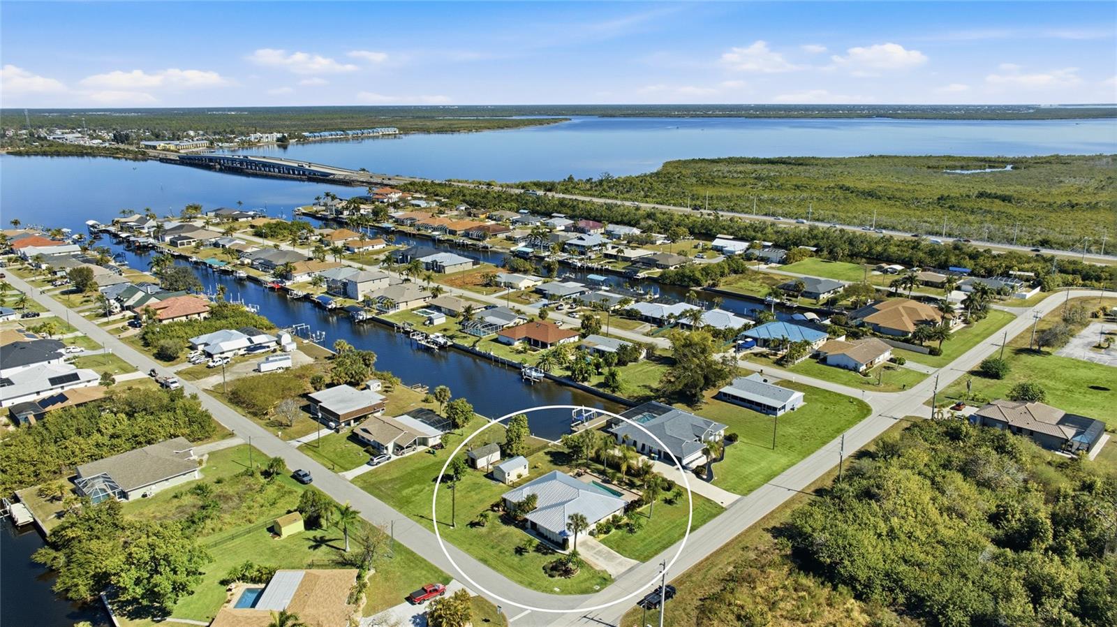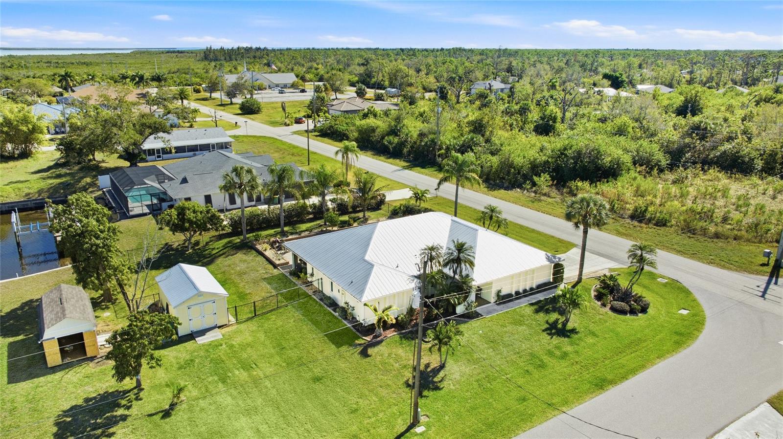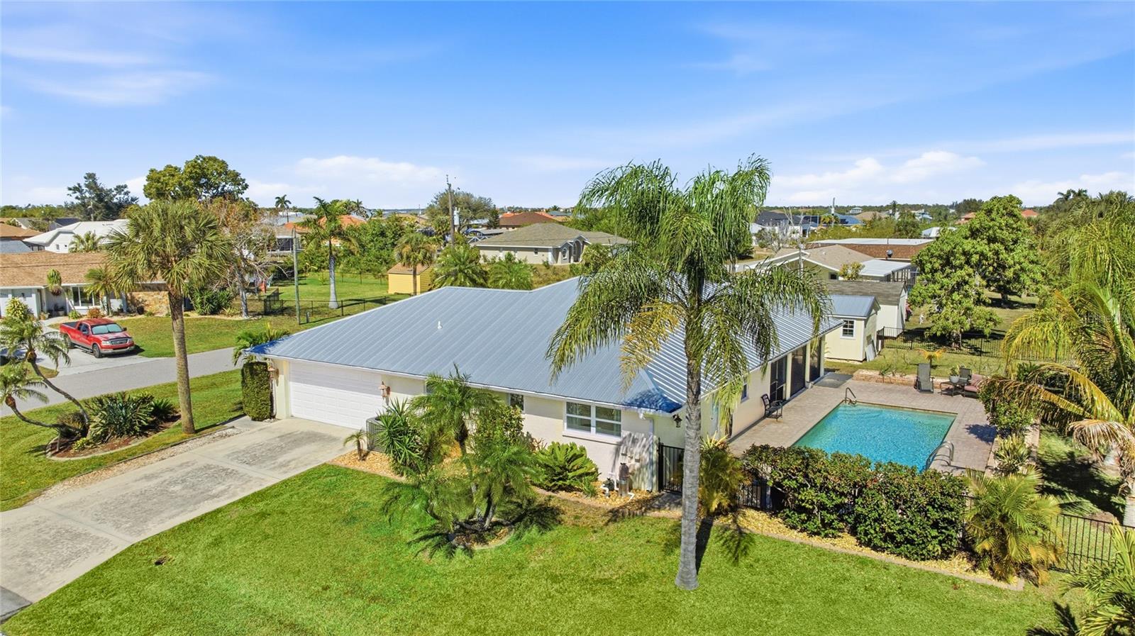 Located in the established community of Gulf Cove, this pool home is positioned on an oversized corner lot near the canal, offering a sense of openness, privacy, and flexibility with no mandatory HOA. Its unique setting provides wide spacing between neighboring homes and a peaceful backdrop without the responsibilities of a waterfront lot. Inside, vaulted ceilings and an open-concept layout create a bright, airy atmosphere. Wide-plank flooring extends throughout the main living areas, complementing the coastal color palette and natural light that fills the space. The living and dining areas flow seamlessly, making the home comfortable for daily living and well suited for entertaining. The kitchen sits at the heart of the home and features generous cabinetry, stone countertops, stainless steel appliances, and a breakfast bar that opens to the main living area. Sliding glass doors lead to the covered lanai, creating an easy transition to outdoor living. The primary suite offers a comfortable retreat with ample space and an ensuite bath with a walk-in shower. Guest bedrooms are arranged in a split floor plan, providing privacy and flexibility for visitors, family, or a home office. A convenient pool bath enhances functionality for outdoor entertaining. Outdoors, the backyard is designed for relaxed Florida living. The resurfaced pool is surrounded by a brick paver deck, mature palms, and tropical landscaping, while wrought-iron fencing adds privacy and definition. The expansive side yard is a standout feature, offering room for boat or RV storage, future expansion, or creative outdoor use. A matching shed provides additional storage or workshop potential. Residents of Gulf Cove have the option to join the voluntary homeowners association, which offers access to a community boat ramp, waterfront park, playground, and pavilion located nearby. This allows residents to enjoy boating and community amenities without a mandatory association or fees tied to the property. With a newer metal roof, impact windows, thoughtful updates, and a rare oversized corner-lot setting, this home offers a versatile option for full-time living, a seasonal retreat, or long-term ownership in a well-established Port Charlotte community. **THIS PROPERTY QUALIFIES FOR A 1% LENDER INCENTIVE IF USING PREFERRED LENDER. INQUIRE FOR MORE DETAILS.**