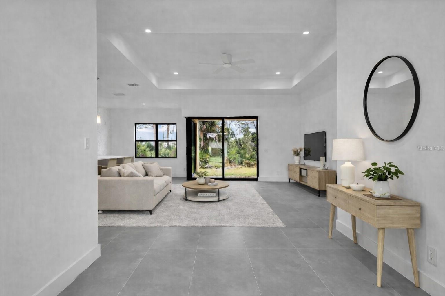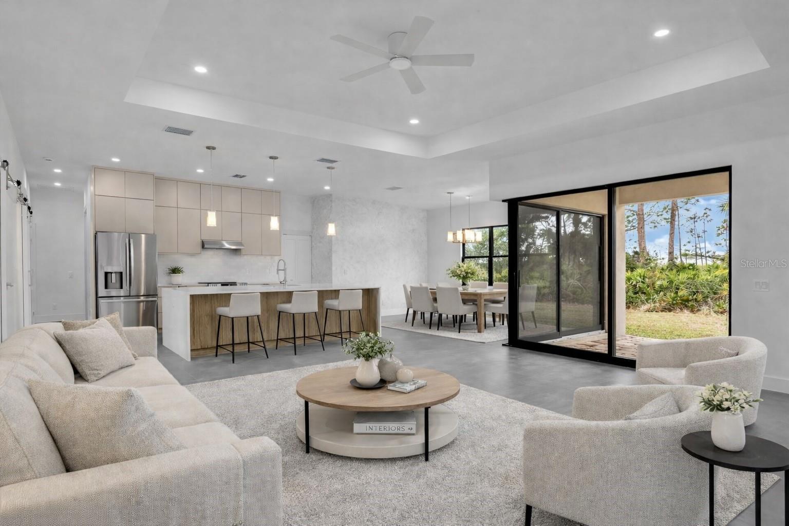 Brand-new 2026 construction offering 3 bedrooms plus a versatile den, blending modern architecture with elevated finishes and thoughtful craftsmanship throughout. Soaring ceilings and tile flooring throughout the entire home — with no carpet — create a bright, expansive atmosphere from the moment you step inside. The open-concept design flows effortlessly into a stunning chef-inspired kitchen featuring an oversized island with cabinetry on both sides, sleek push-open and soft-close cabinetry, and a spacious walk-in pantry — ideal for everyday living and entertaining. The living area is enhanced by expansive sliding glass doors that open fully to the covered patio, creating seamless indoor-outdoor flow and allowing natural light to pour in. Premium upgrades include high-end plumbing fixtures and shower heads, Toto toilets, a bathtub integrated within the shower for added versatility, USB-integrated outlets, modern interior doors and hardware, a Rheem Gladiator water heater for long-term reliability, and epoxy-coated garage flooring for a polished, finished look. The den offers flexible space perfect for a home office, media room, or additional living area. Step outside to a generous covered patio with ample room to personalize your outdoor space. Situated on its own well and septic system, offering efficiency and potential long-term savings. Seller is motivated — bring all offers. Identical floor plan available at additional addresses. English, Spanish, and Portuguese assistance available.